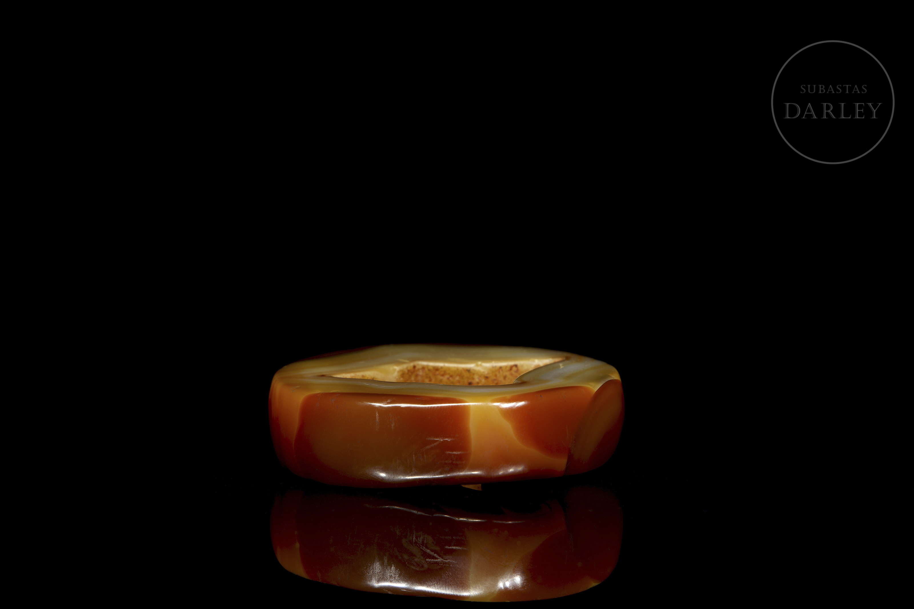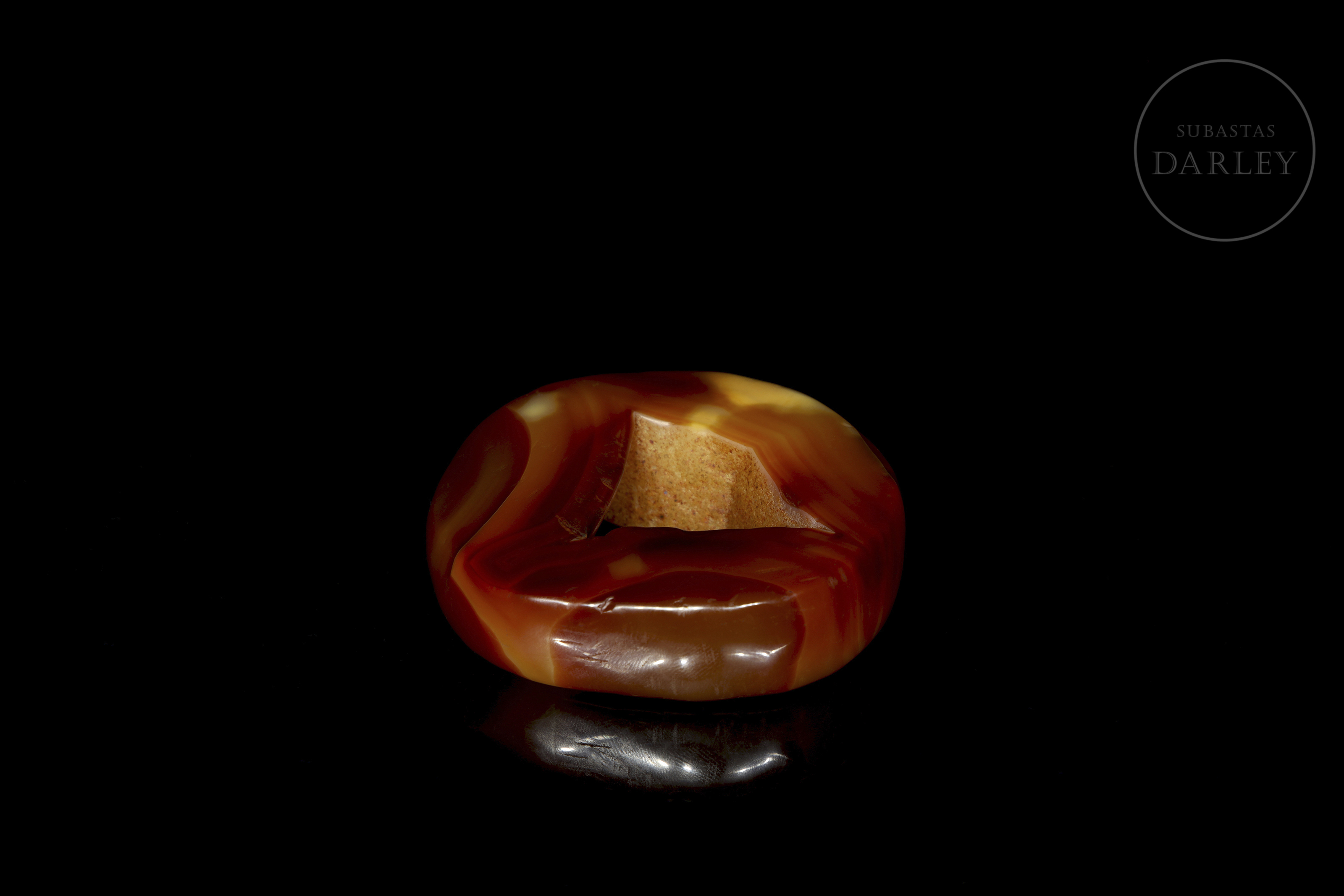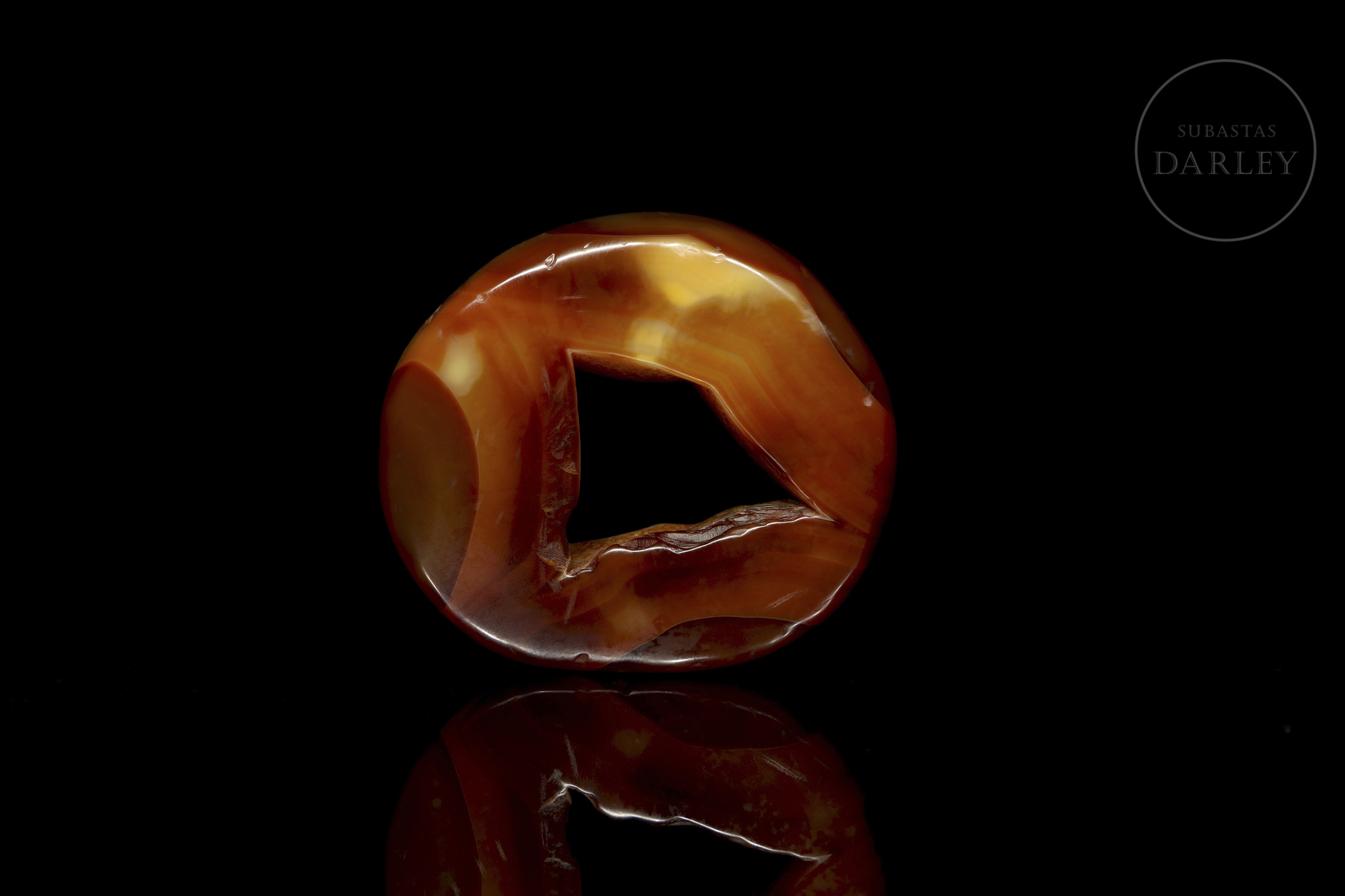 Colgante o adorno de forma anular, tallado en ágata roja. La piedra se caracteriza por sus bellas bandas naturales que alternan capas de color blanco lechoso, ocre y rojo intenso. La pieza ha sido trabajada puliendo el exterior pero respetando el núcleo de la piedra "玛瑙天然孔". Dinastía Zhou (c. 1046-256 a.C.) o posterior.