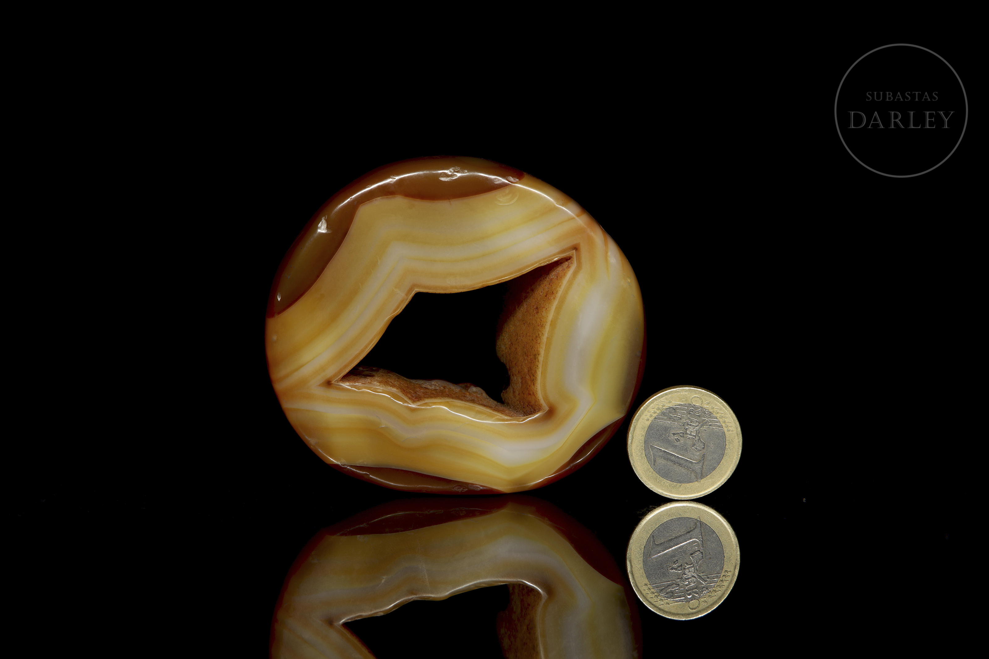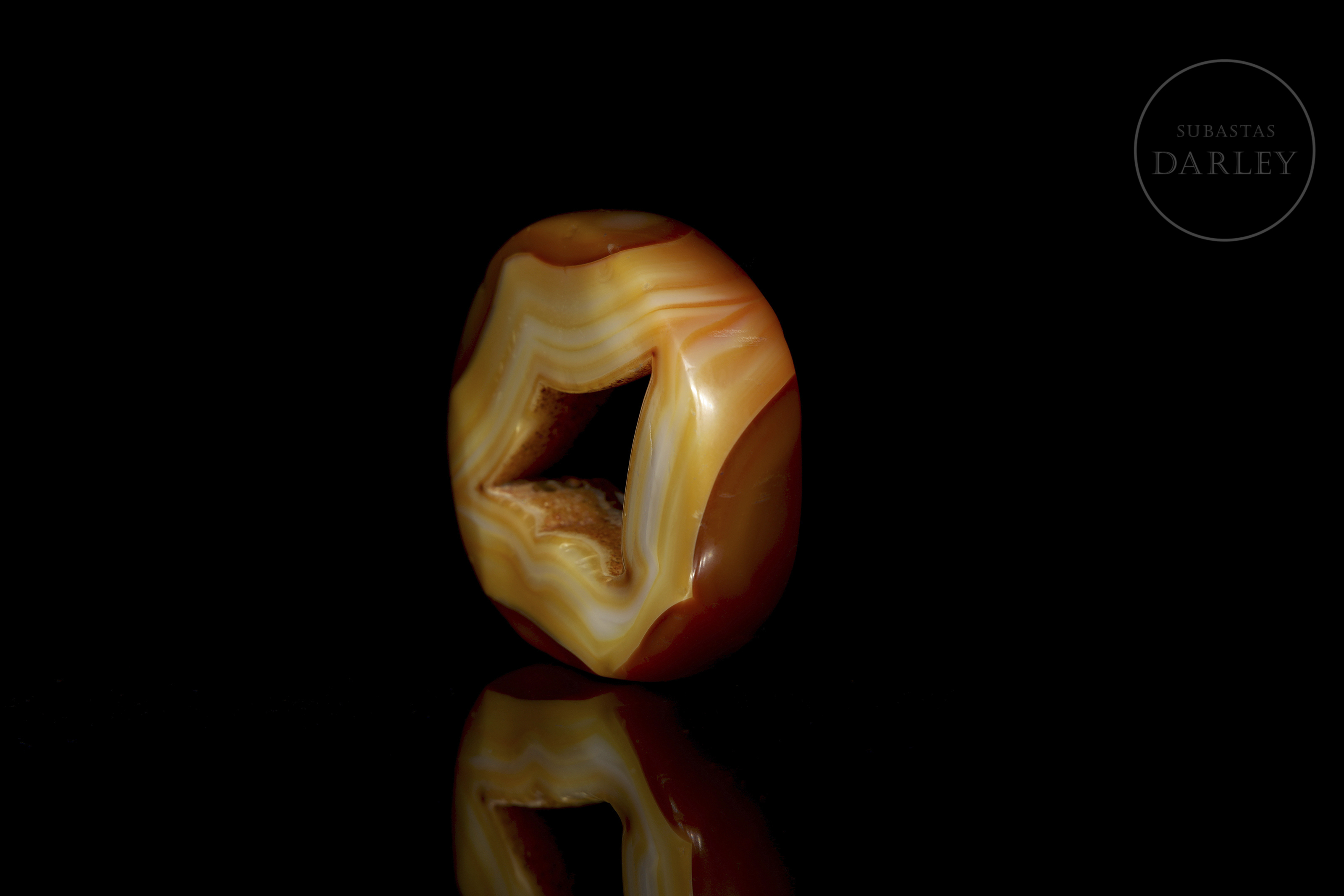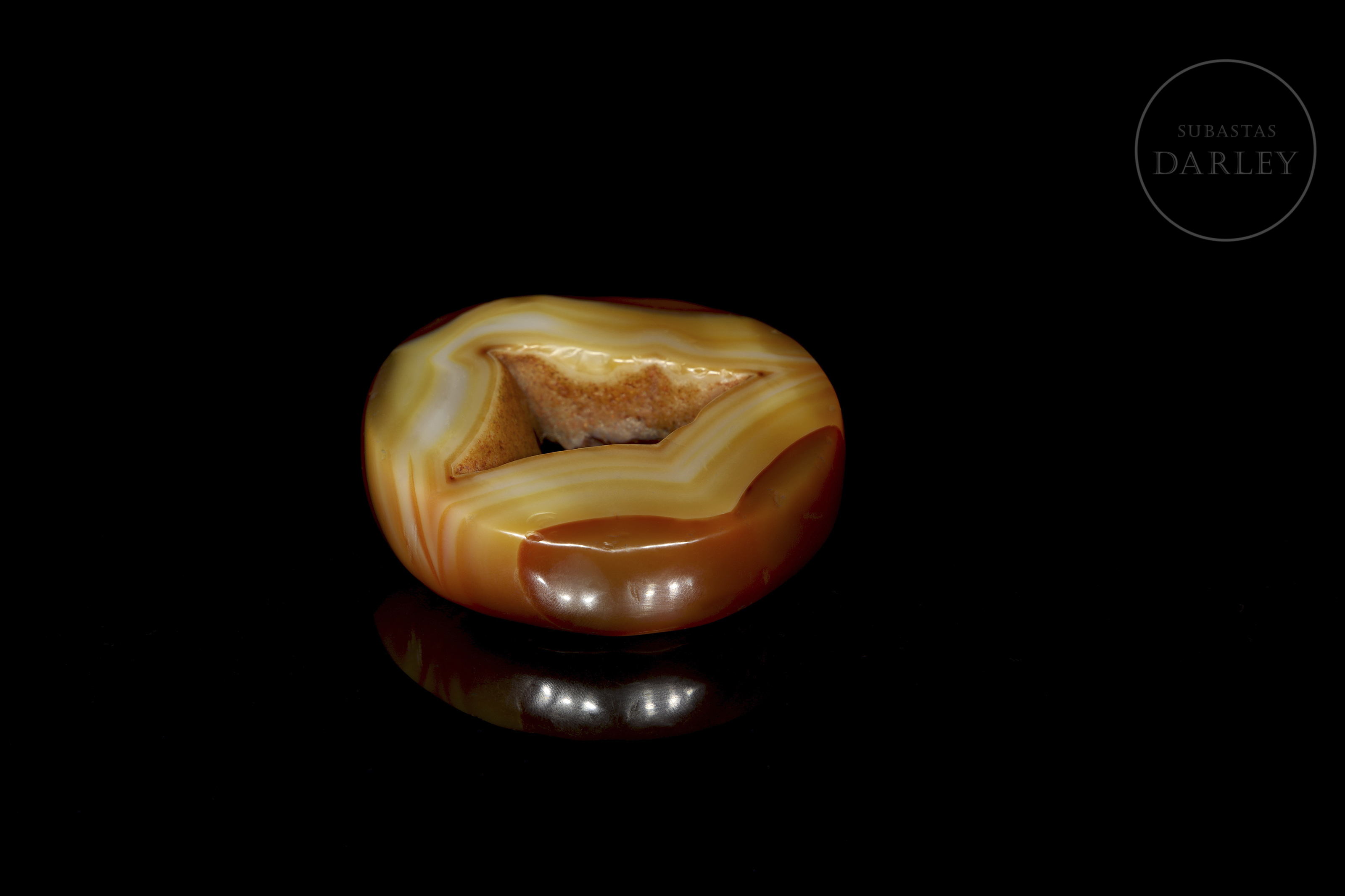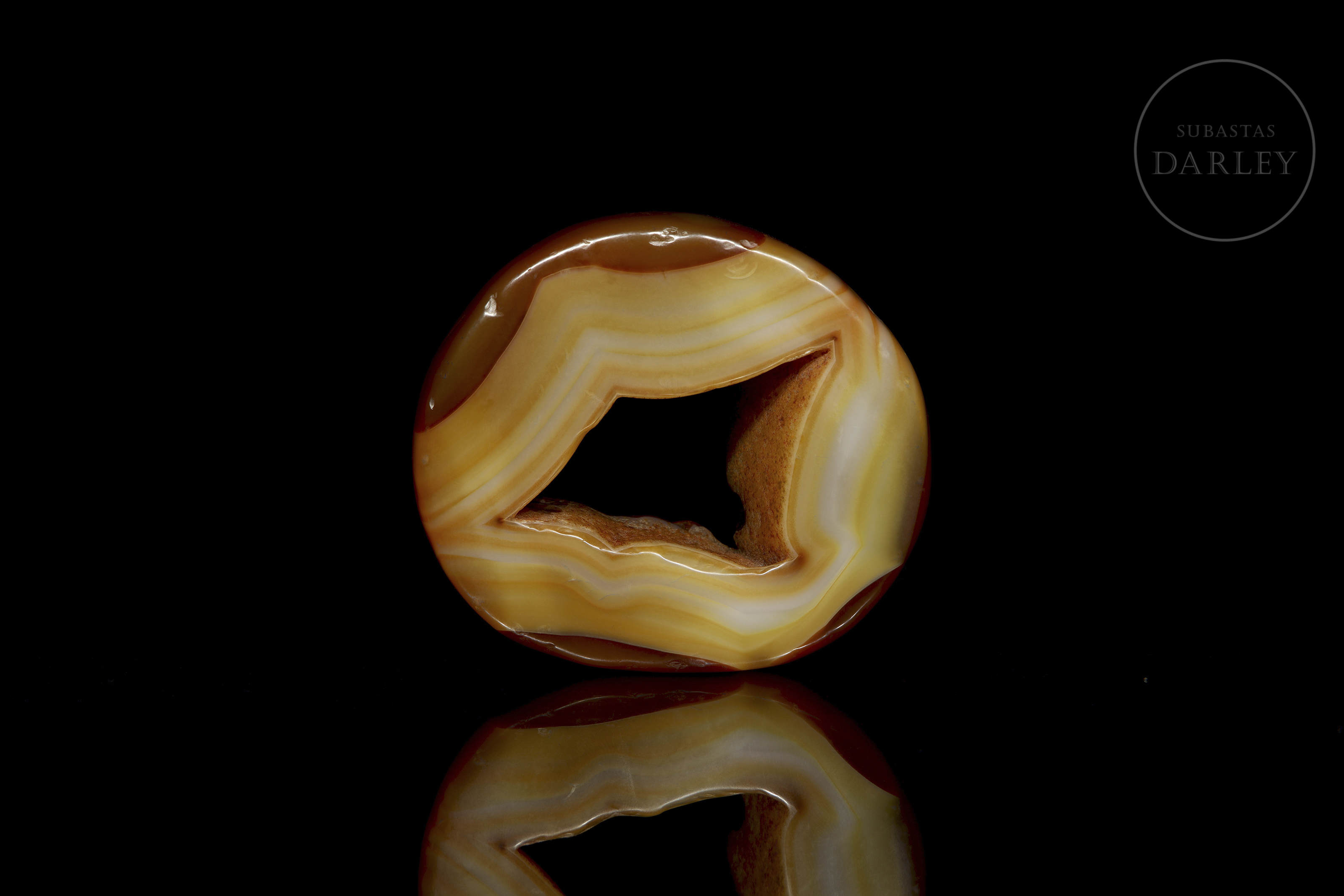 Colgante o adorno de forma anular, tallado en ágata roja. La piedra se caracteriza por sus bellas bandas naturales que alternan capas de color blanco lechoso, ocre y rojo intenso. La pieza ha sido trabajada puliendo el exterior pero respetando el núcleo de la piedra "玛瑙天然孔". Dinastía Zhou (c. 1046-256 a.C.) o posterior.