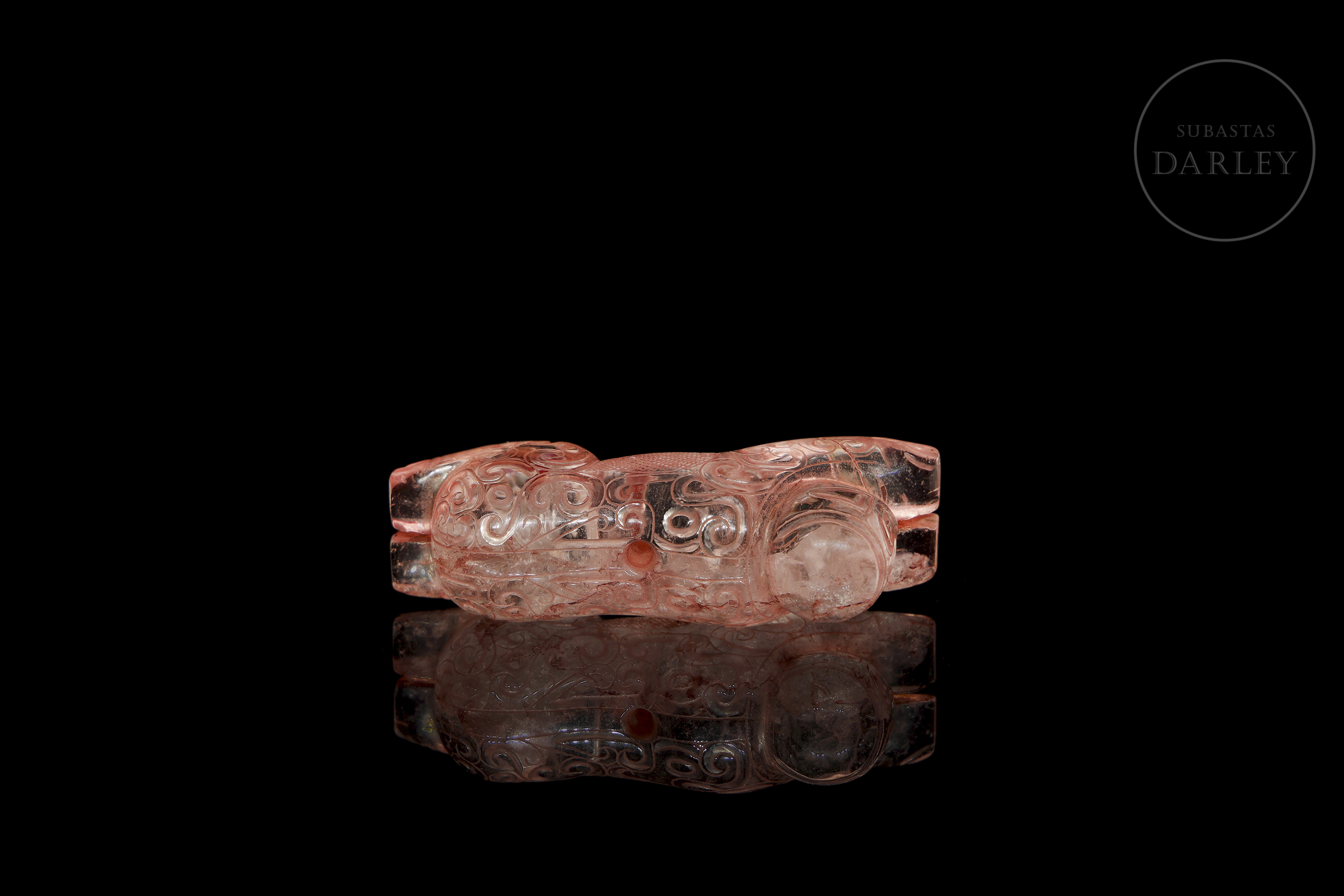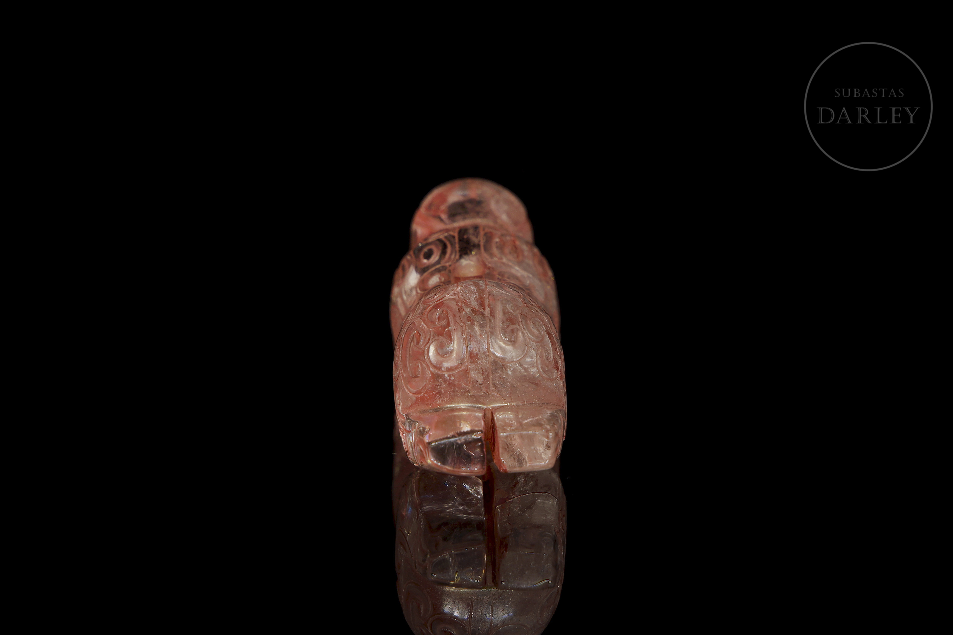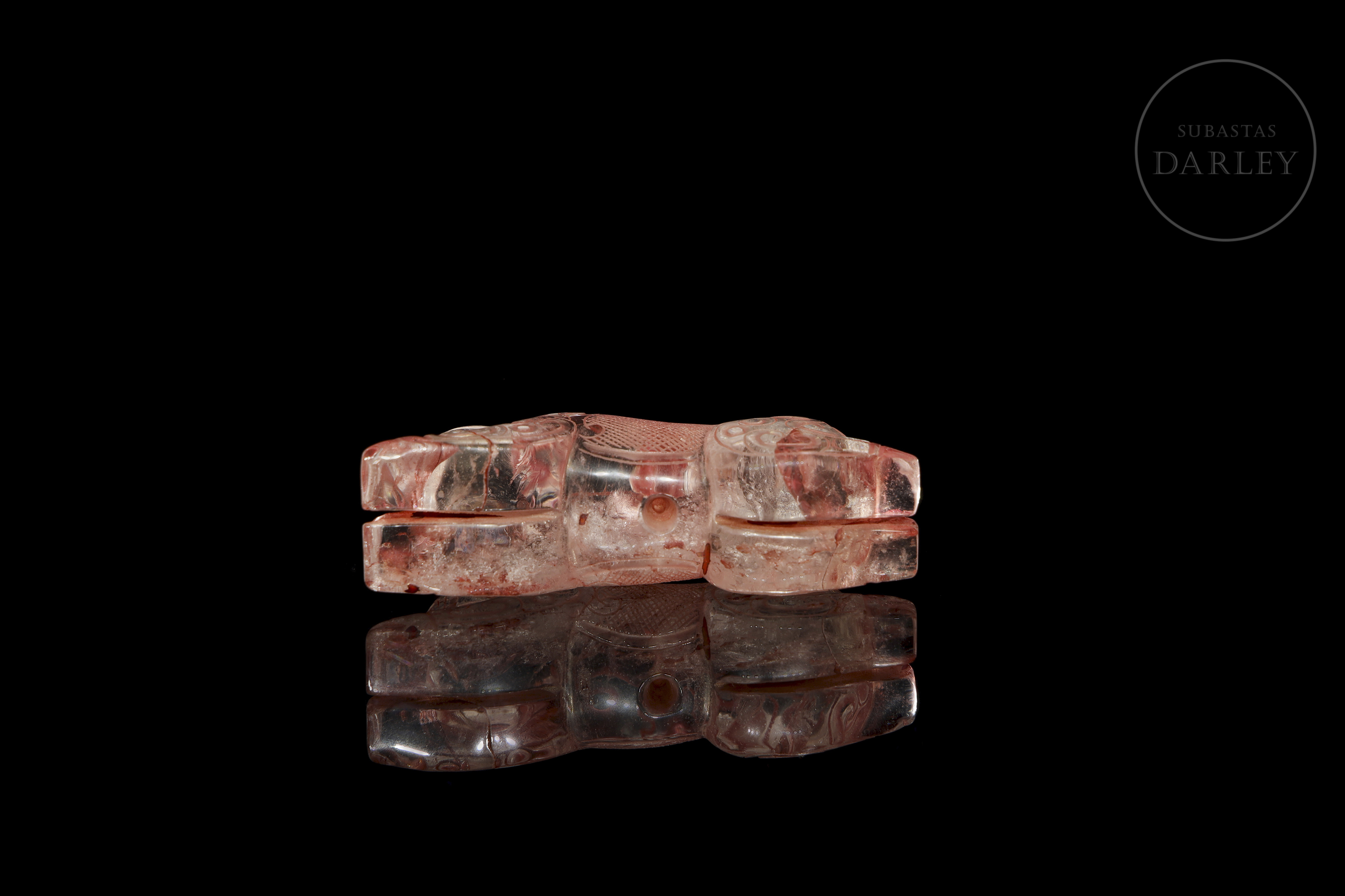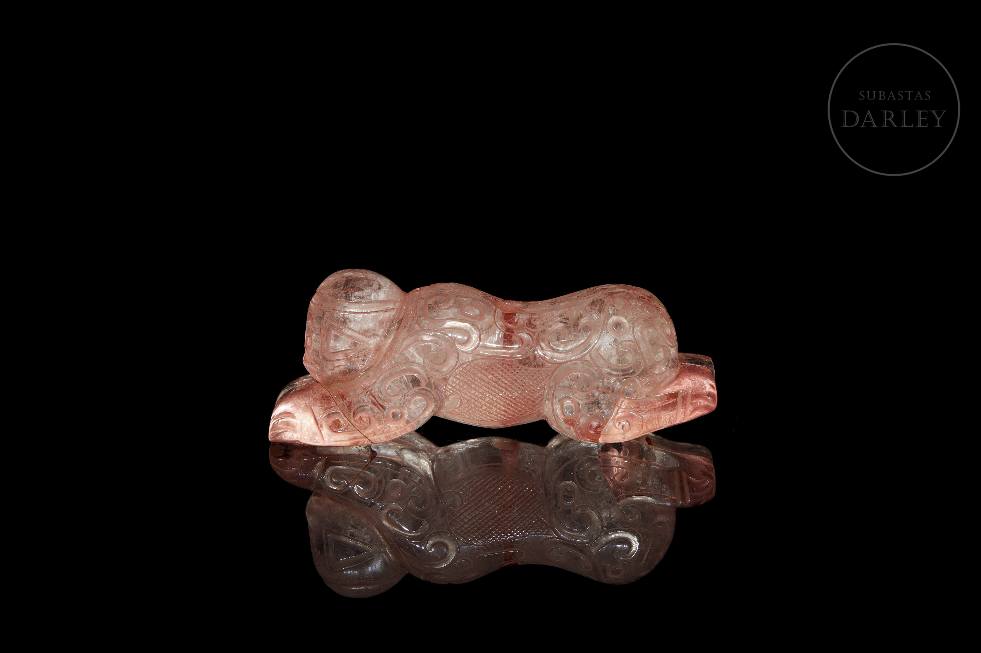 Cuarzo blanco de tonalidad translúcida, con una profusa infiltración rosácea de óxidos y restos de cinabrio ritual. La pieza muestra un personaje agazapado, con las manos extendidas y las piernas flexionadas. Destaca por su decoración en bajorrelieve de patrones geométricos de estilo arcaico. Muestra pátina por envejecimiento. Dinastía Zhou del Este (770–256 a.C.) o posterior.