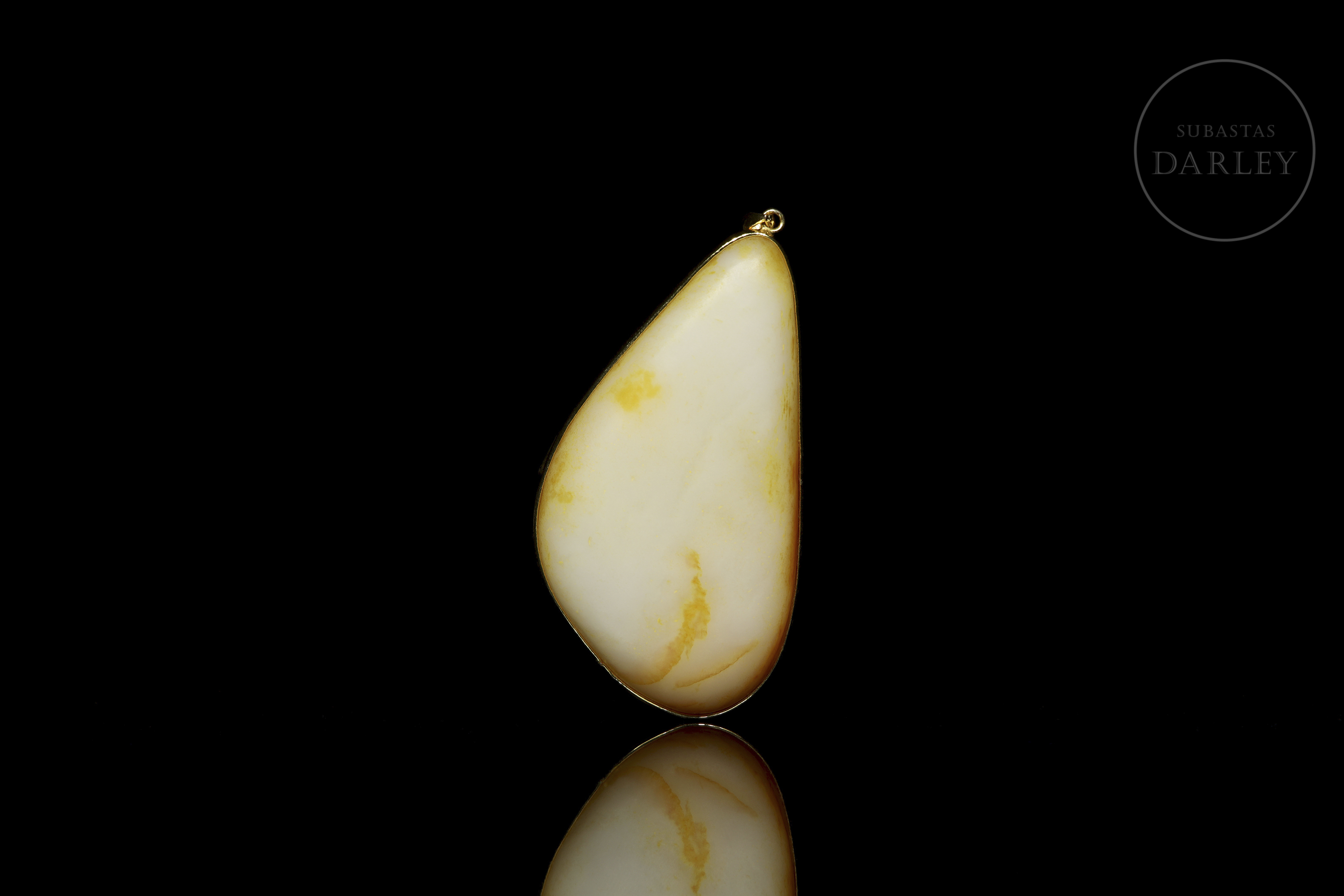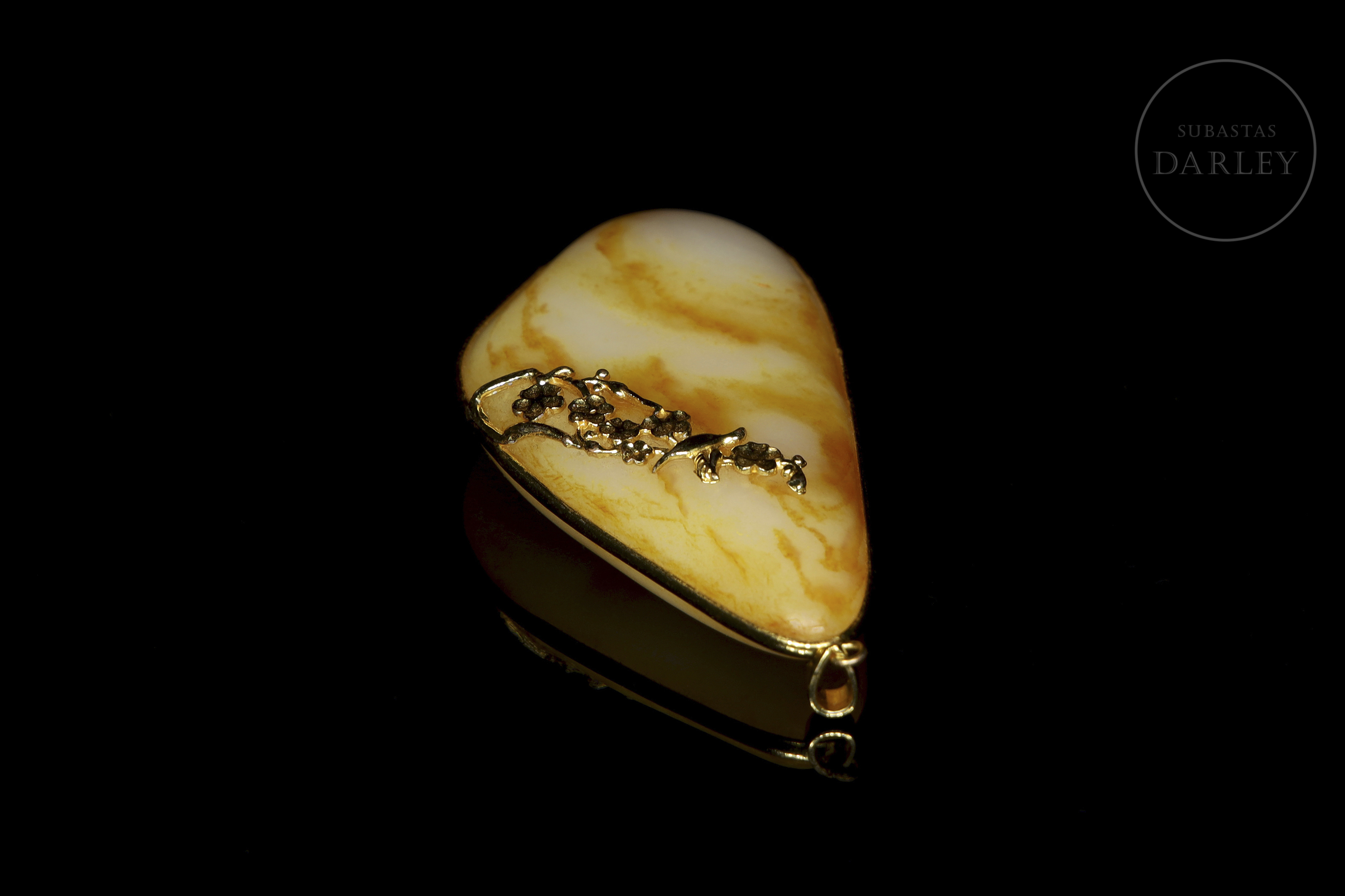 Colgante de jade de color blanco con vetas doradas, de forma irregular, con cantos redondeados, adornado con una delicada montura de metal dorado. La montura superpone la figura de un ave posada entre ramas y motivos florales.