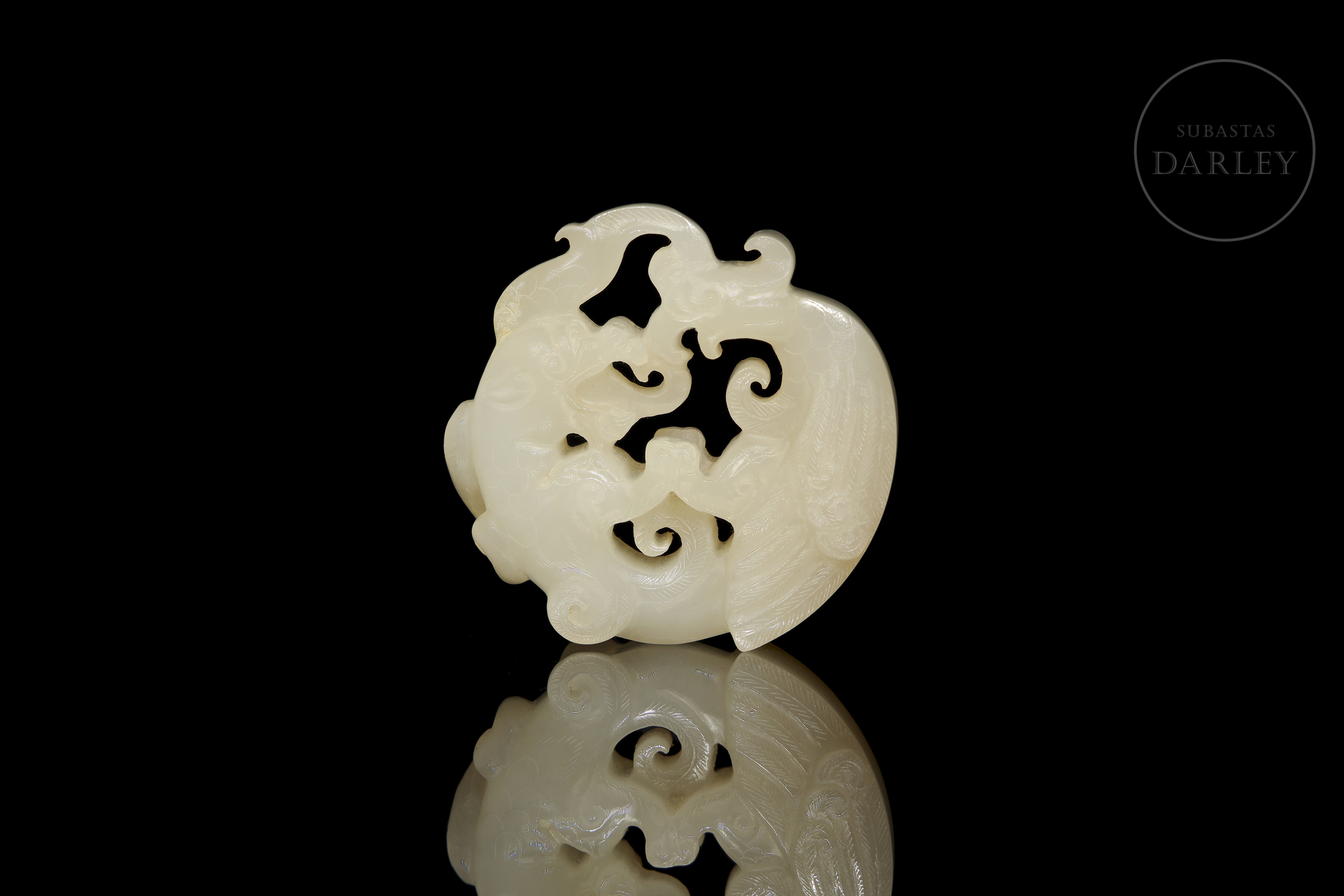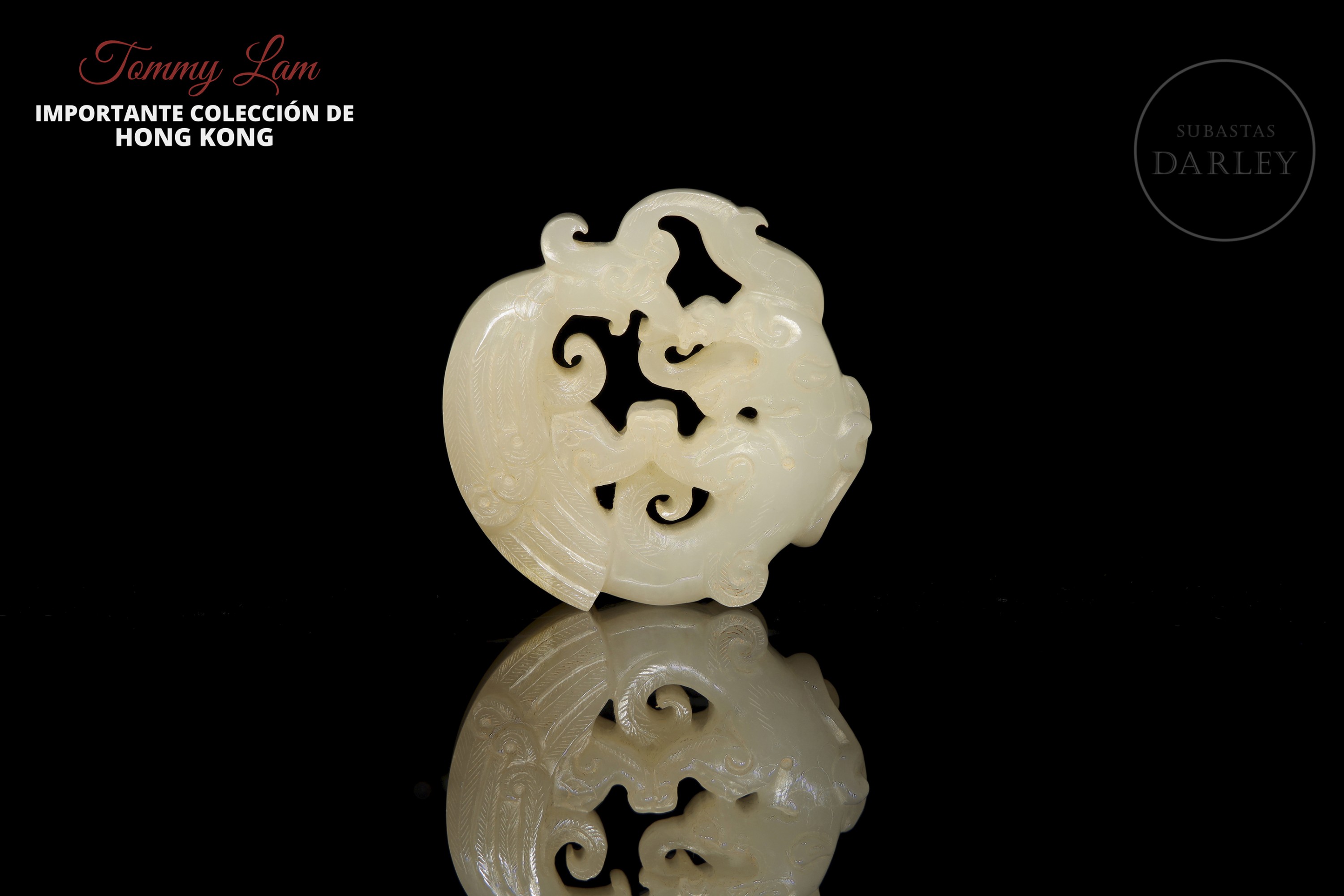 Colgante de jade blanco que muestra un pulido de acabado vítreo. La pieza presenta un formato circular calado con un diseño dinámico de dos criaturas mitológicas entrelazadas: un fénix y un dragón. Destaca la maestría de la talla calada y los finos bajorrelieves que detallan el plumaje, las escamas y las sinuosas colas de ambas figuras en un juego de formas orgánicas. Dinastía Han del Este (25–220 d.C.) o posterior.