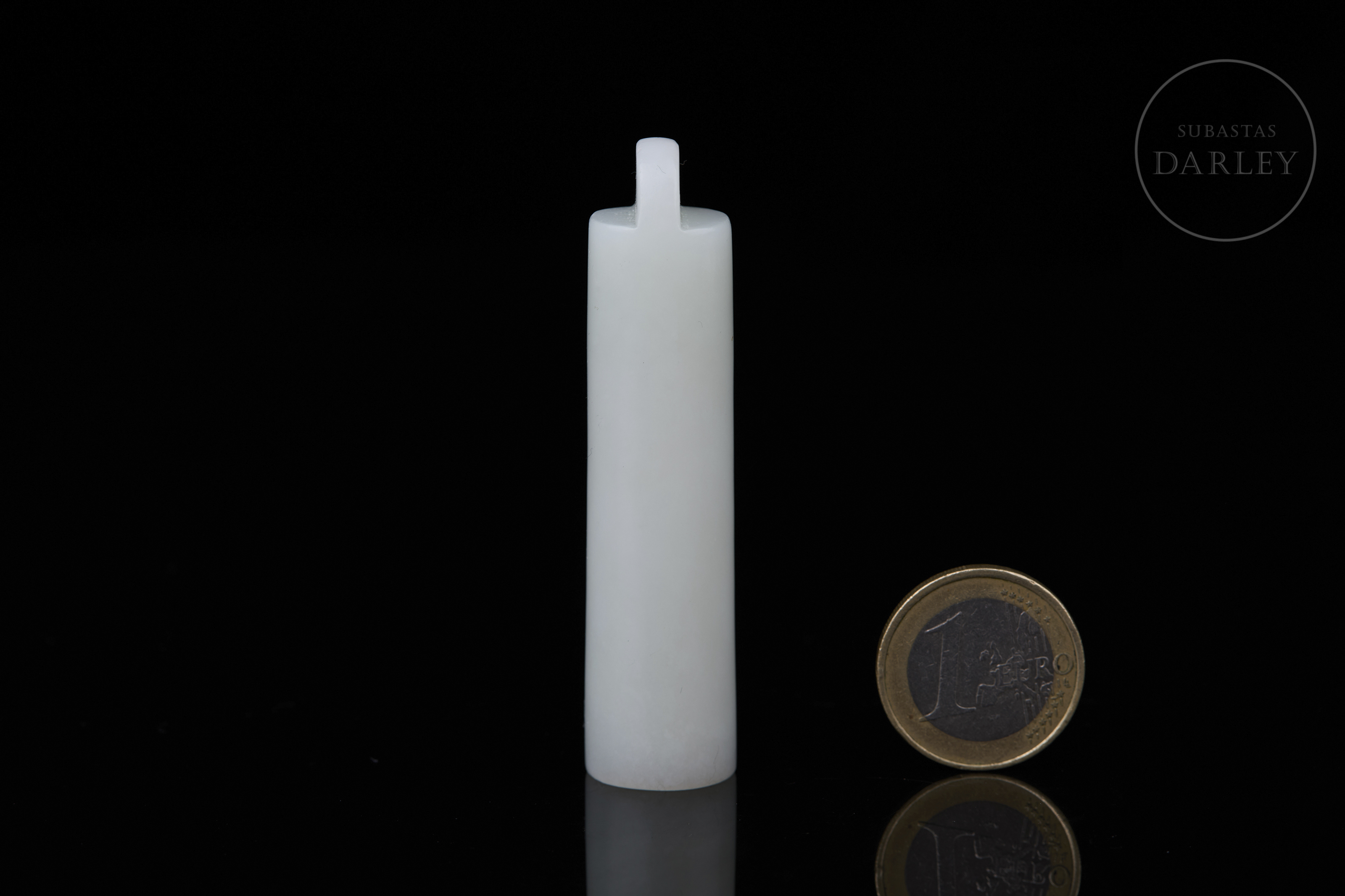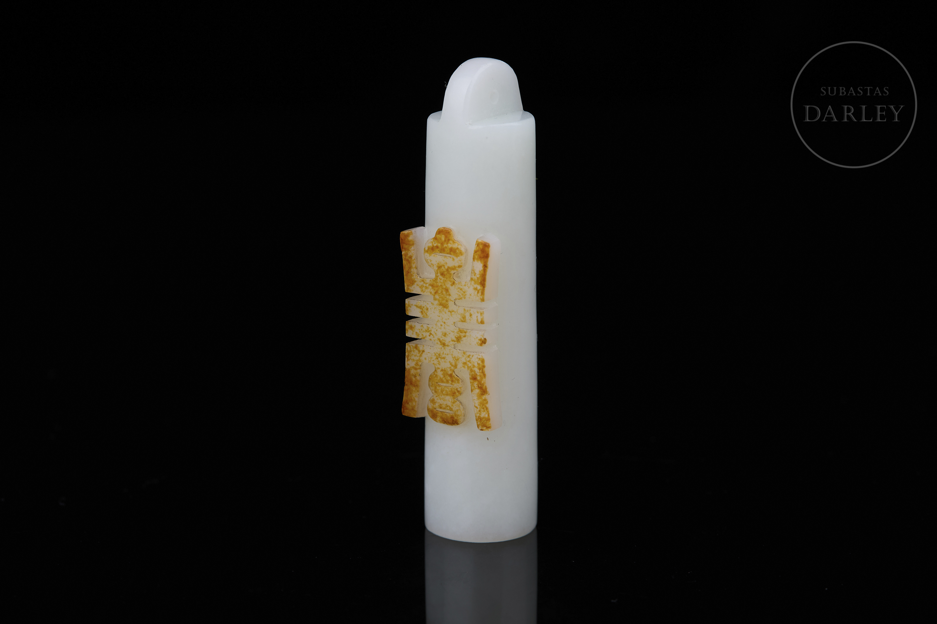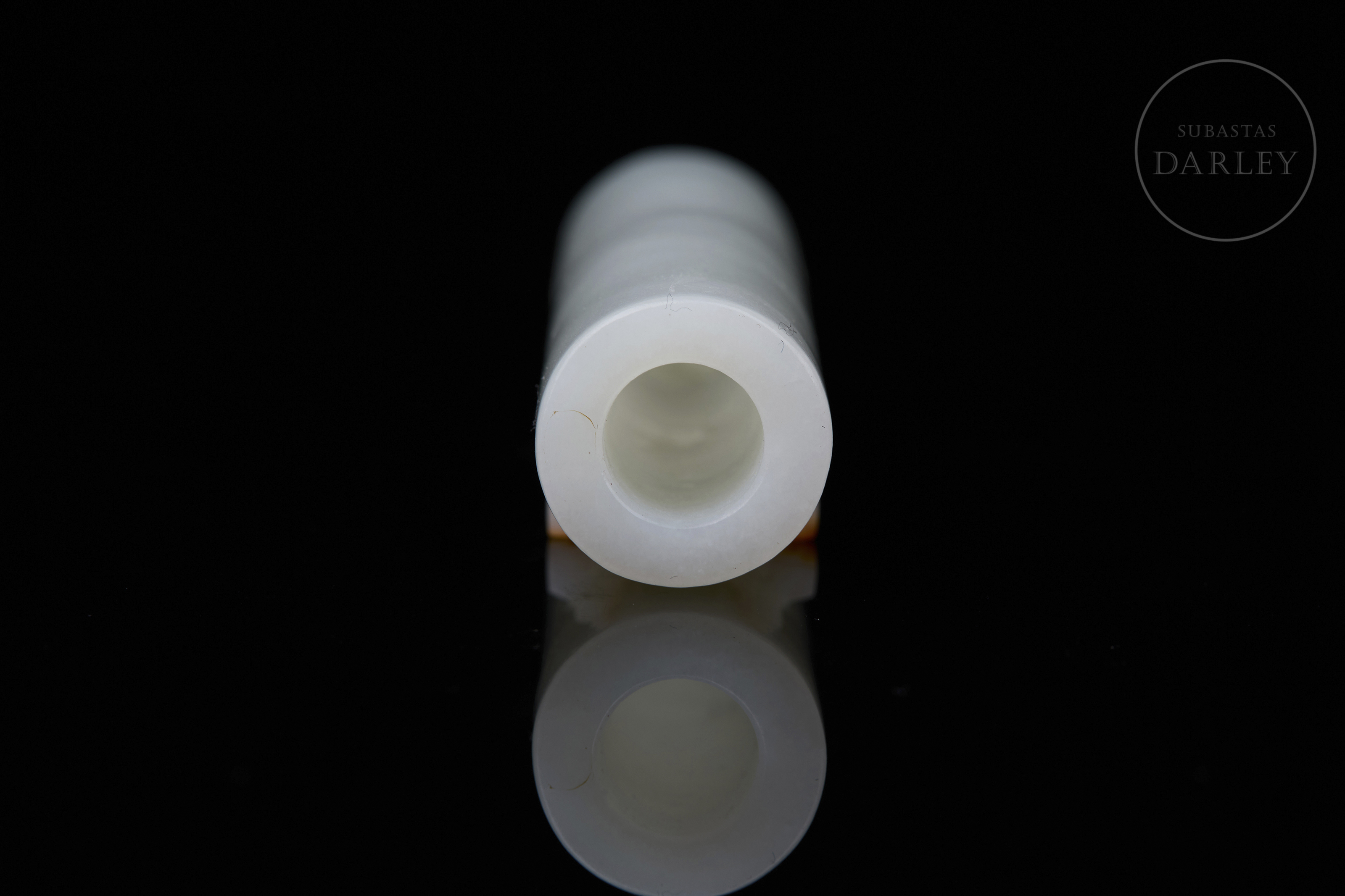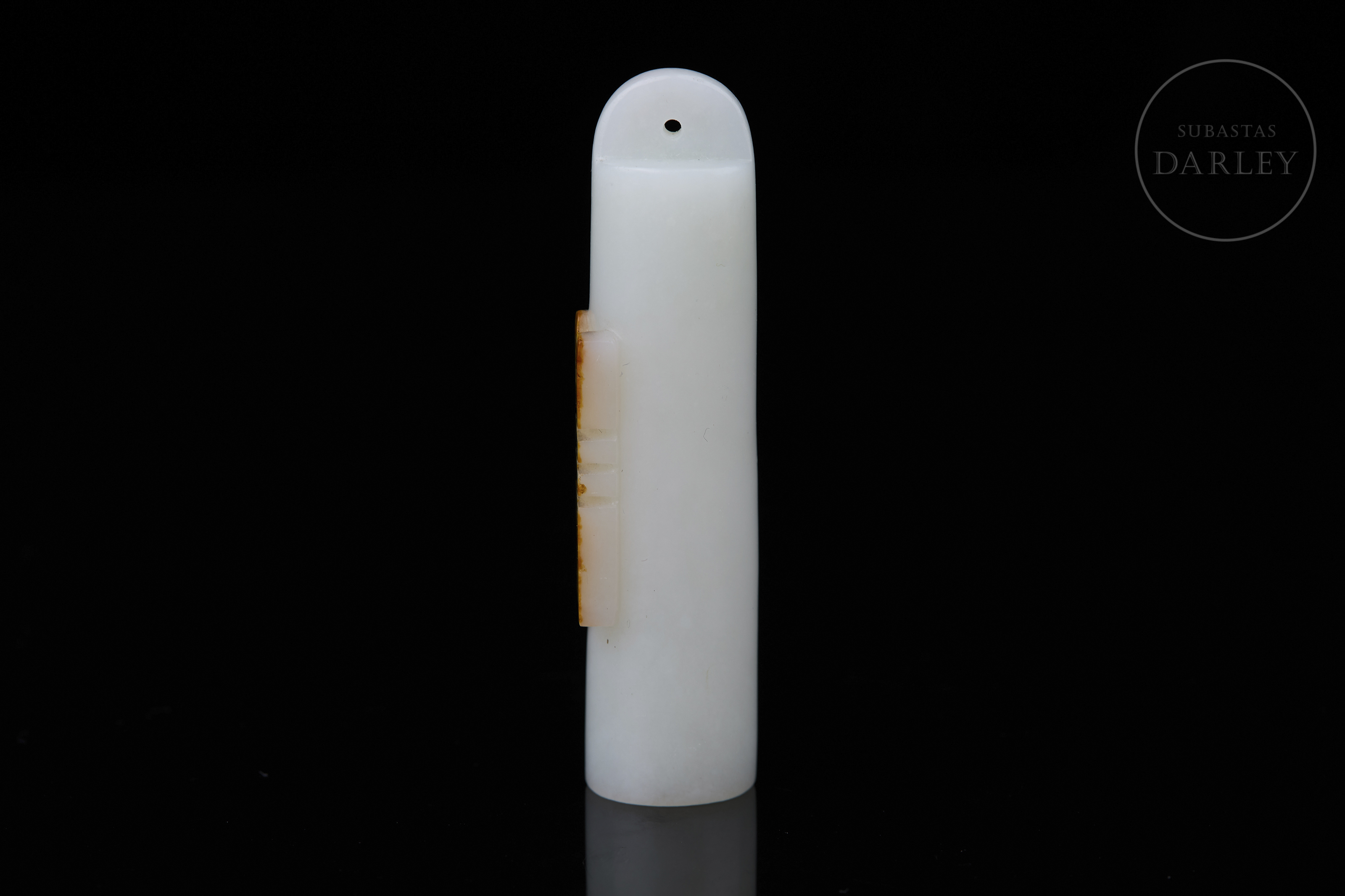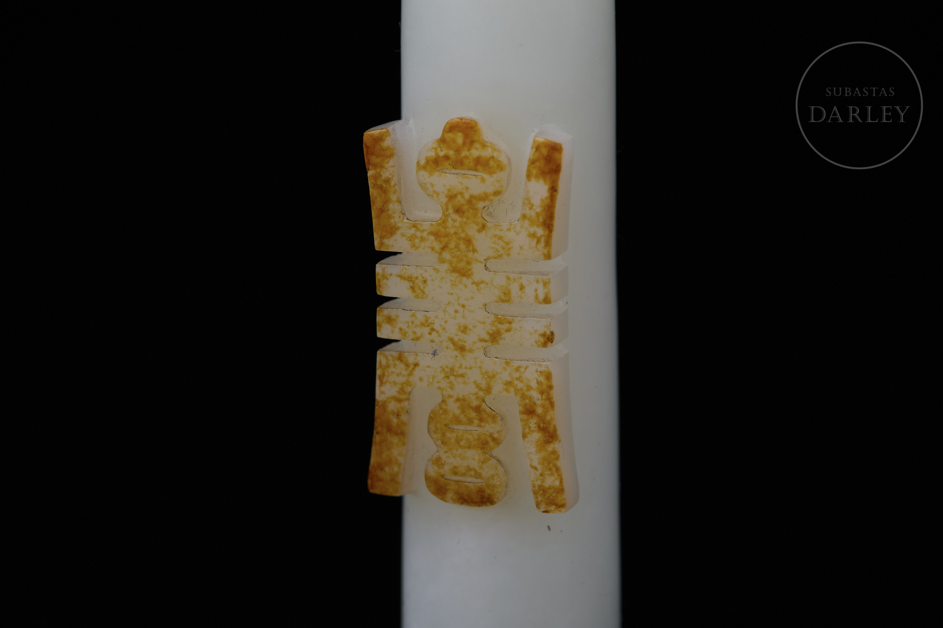 Jade nefrita de tonalidad blanca de gran pureza. La pieza presenta un formato tubular poco frecuente, con un cuerpo liso. En la parte frontal, destaca un relieve que aprovecha la pátina natural de tonalidad ocre y óxido para tallar el carácter "Shou" en una variante estilizada y geométrica. Dinastía Qing (1644–1912).