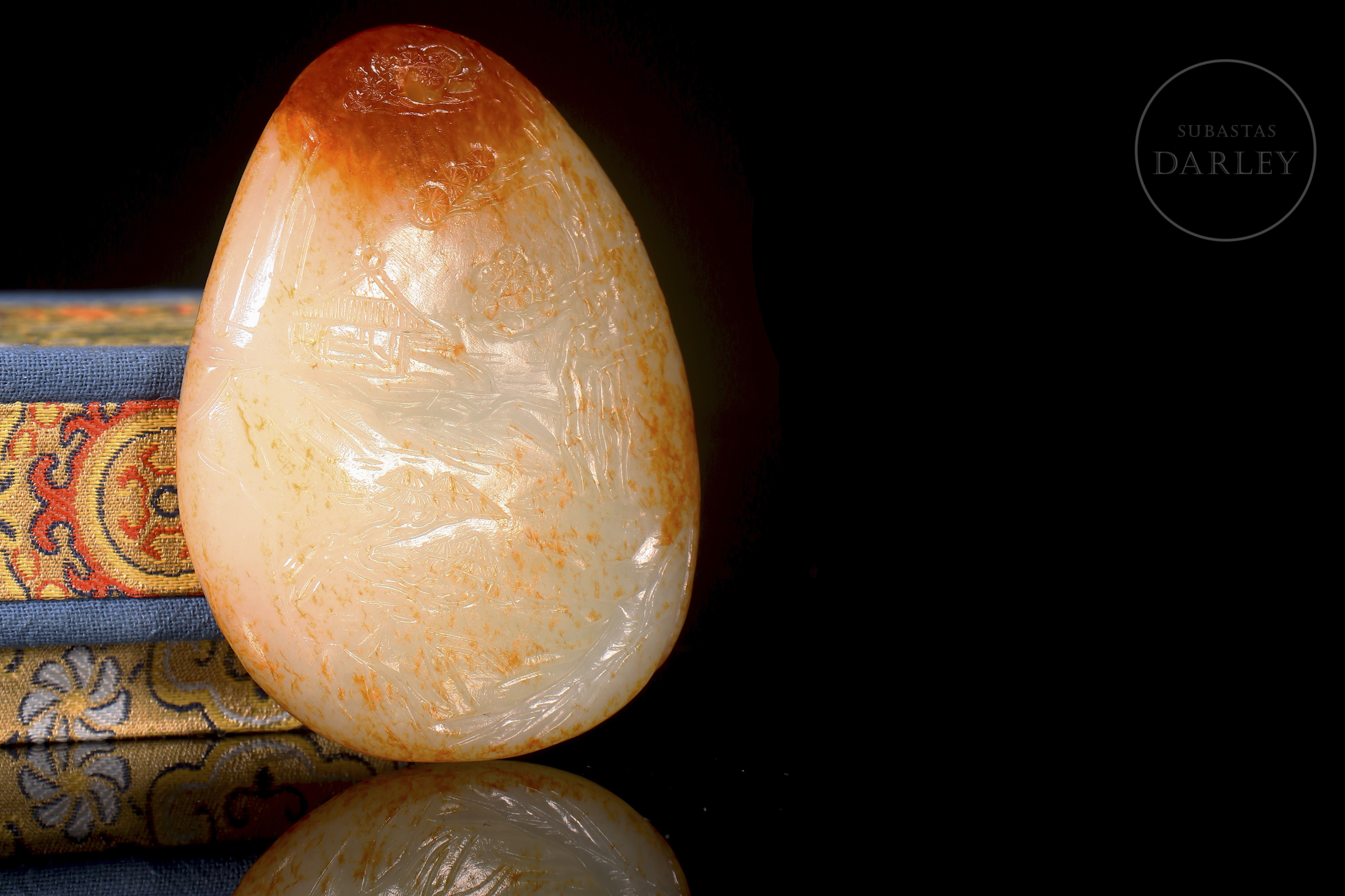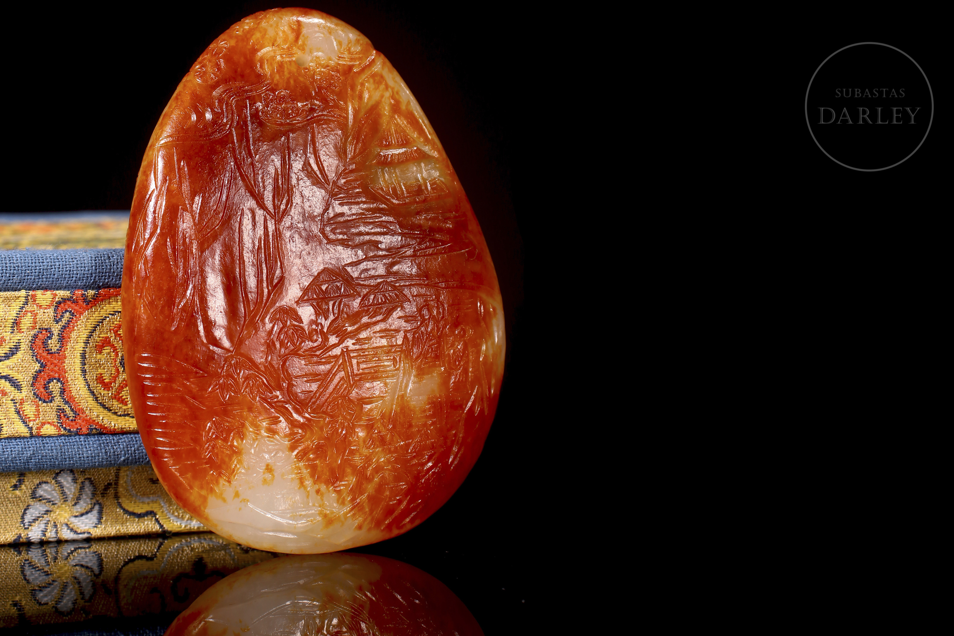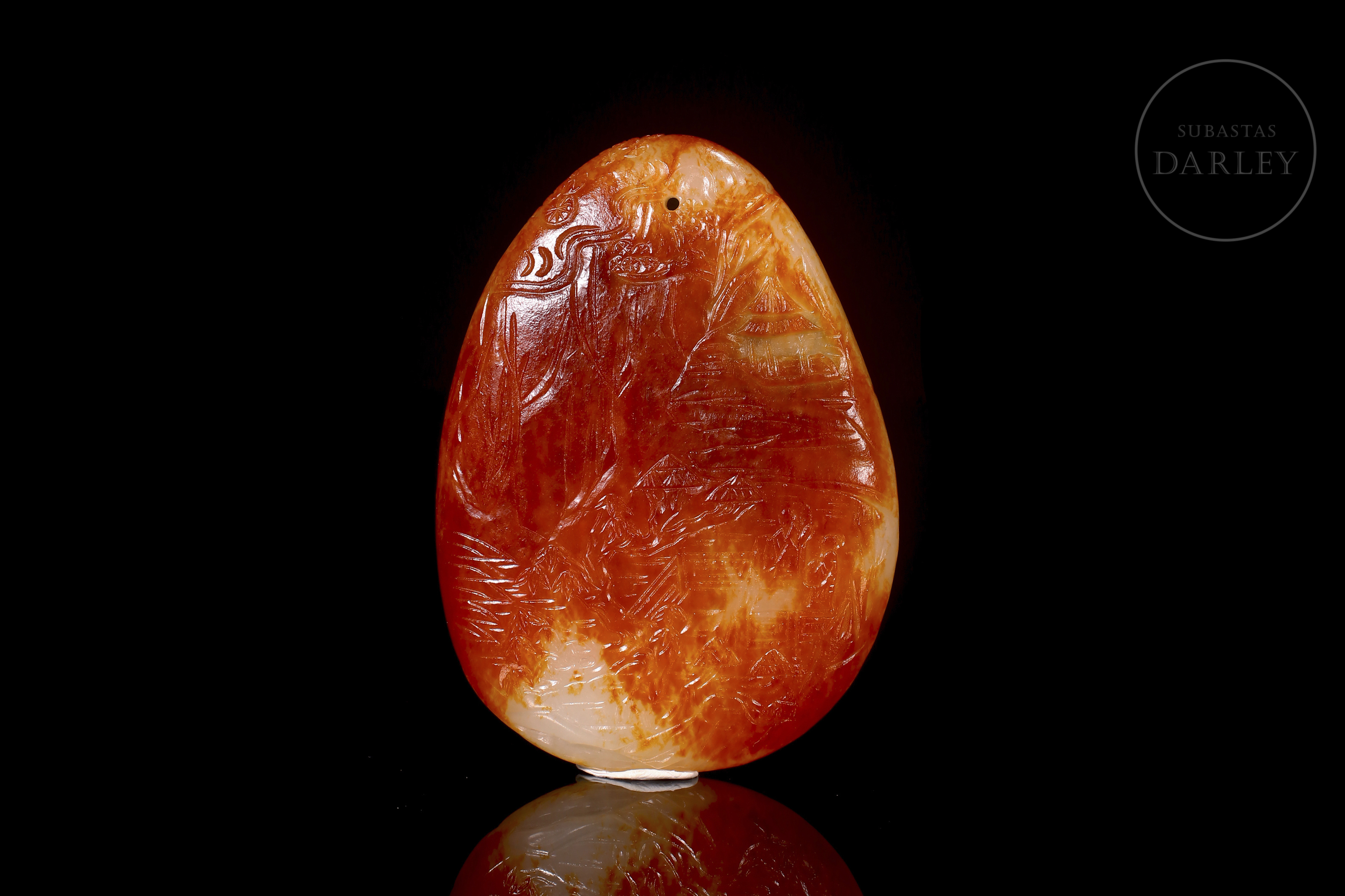 Colgante de jade blanco de Hetian, de cuerpo ovoide y plano, tallado por ambas caras. En un lado se distinguen montañas, árboles y pabellones, mientras que en el reverso aparecen construcciones tradicionales junto a un lago. El material presenta contraste entre la base blanca y las intensas tonalidades rojizas de la piel natural. Con caja a medida.