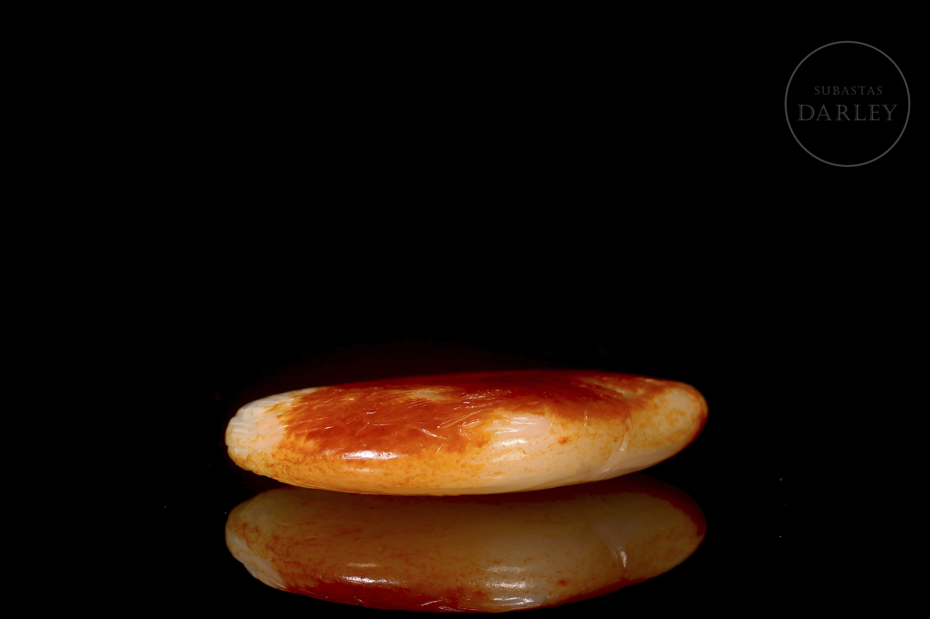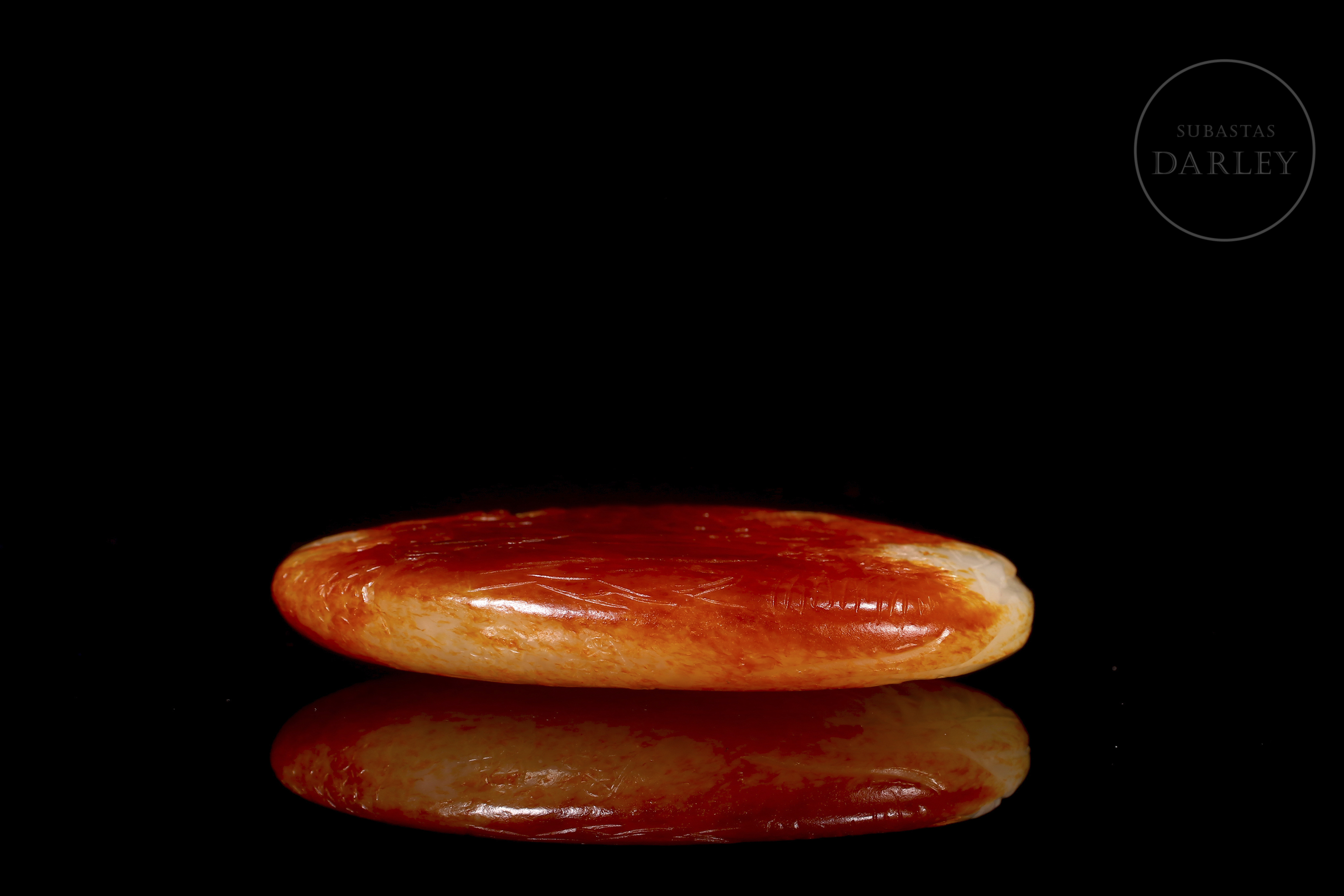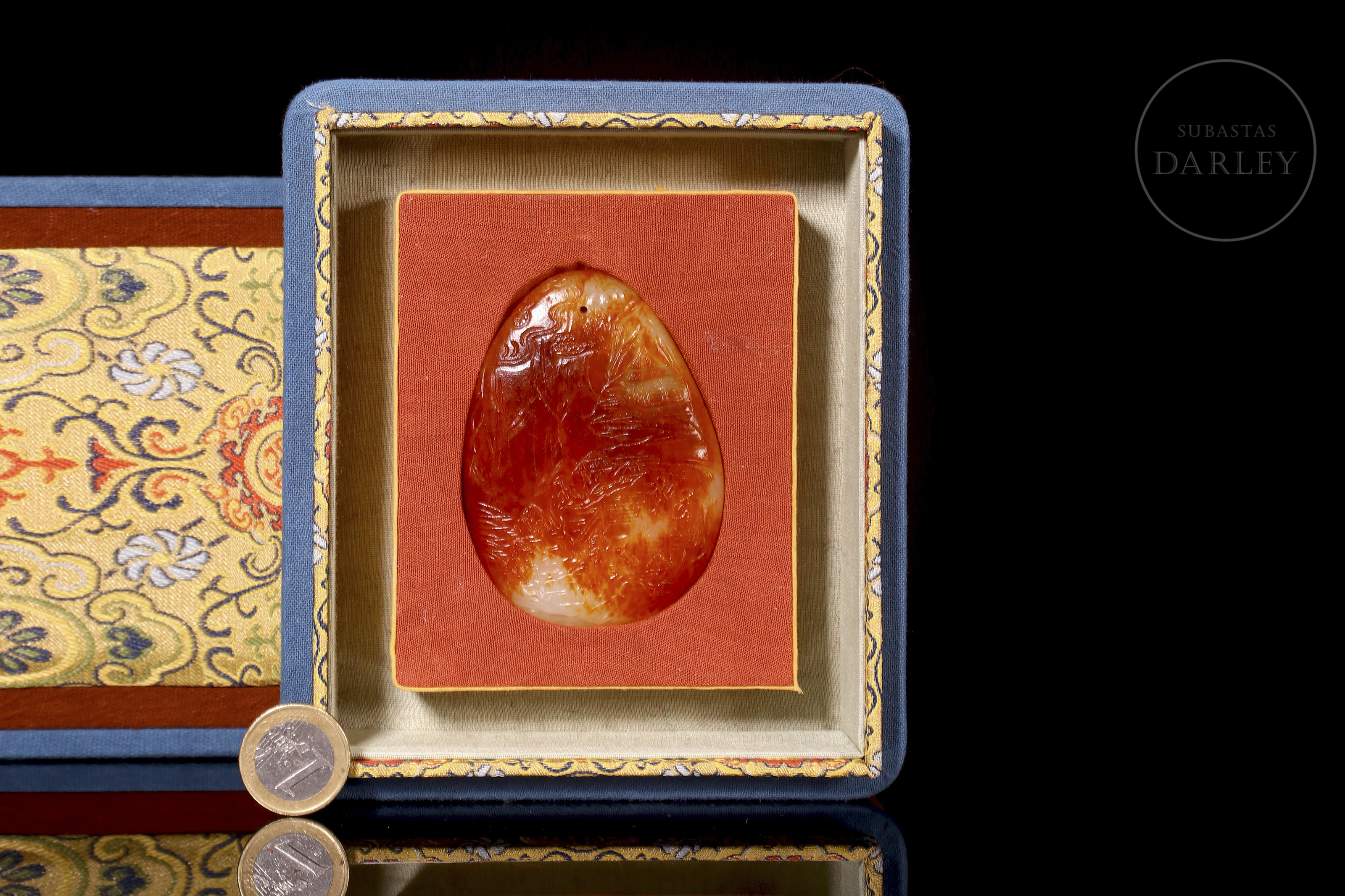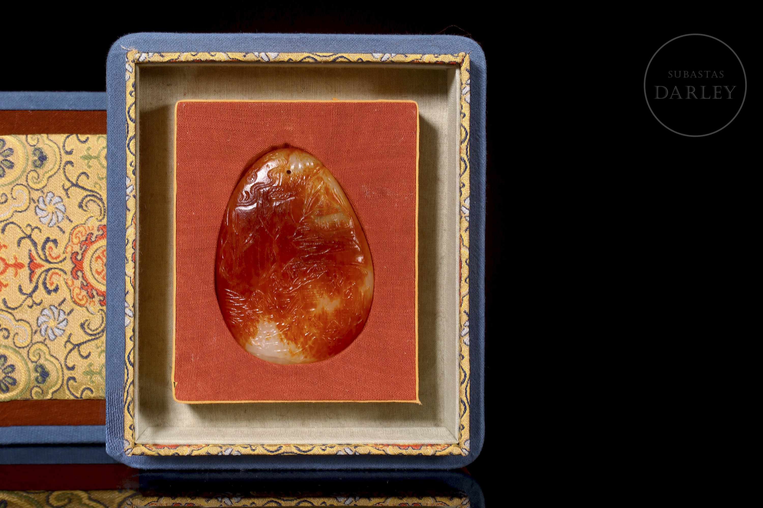 Colgante de jade blanco de Hetian, de cuerpo ovoide y plano, tallado por ambas caras. En un lado se distinguen montañas, árboles y pabellones, mientras que en el reverso aparecen construcciones tradicionales junto a un lago. El material presenta contraste entre la base blanca y las intensas tonalidades rojizas de la piel natural. Con caja a medida.