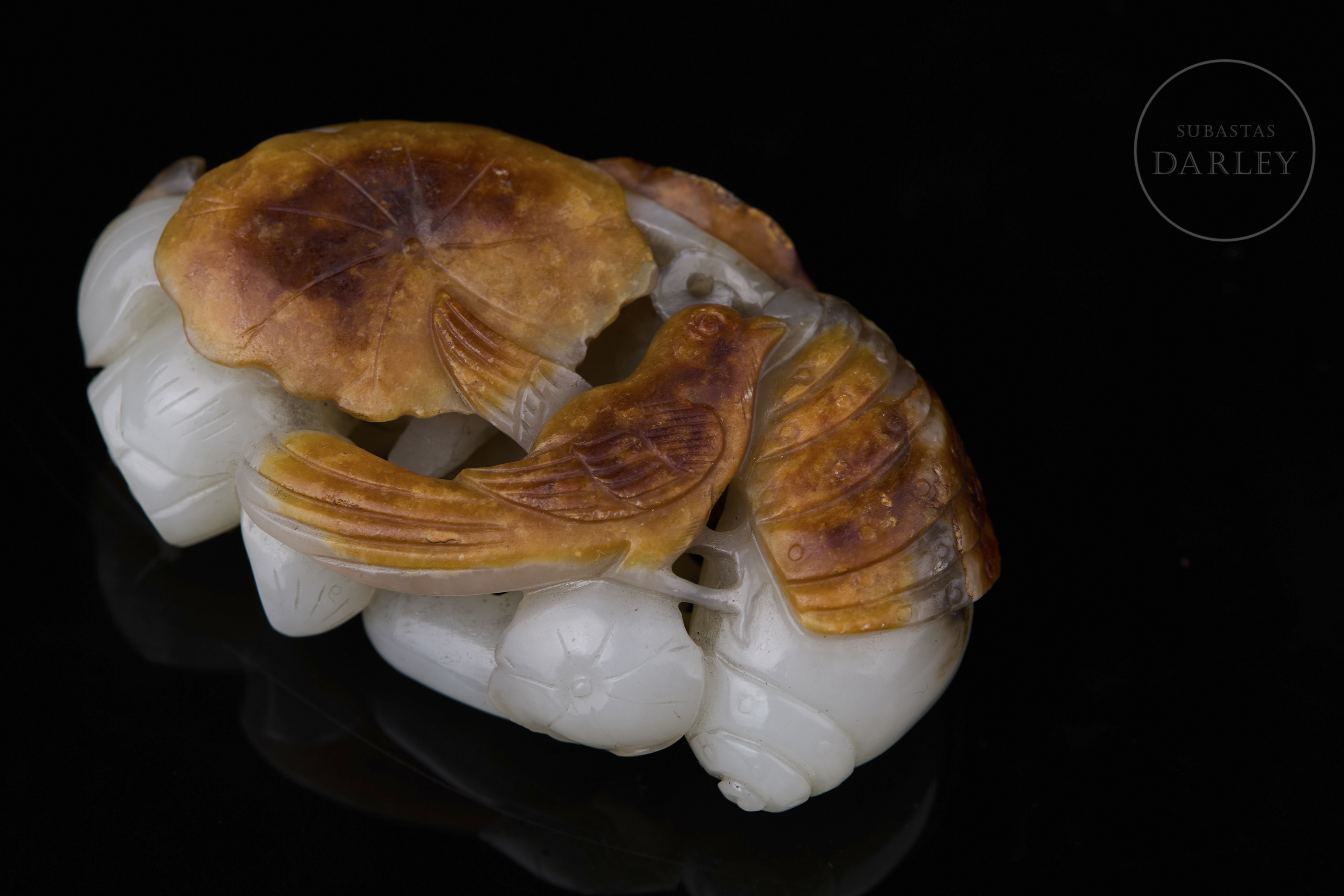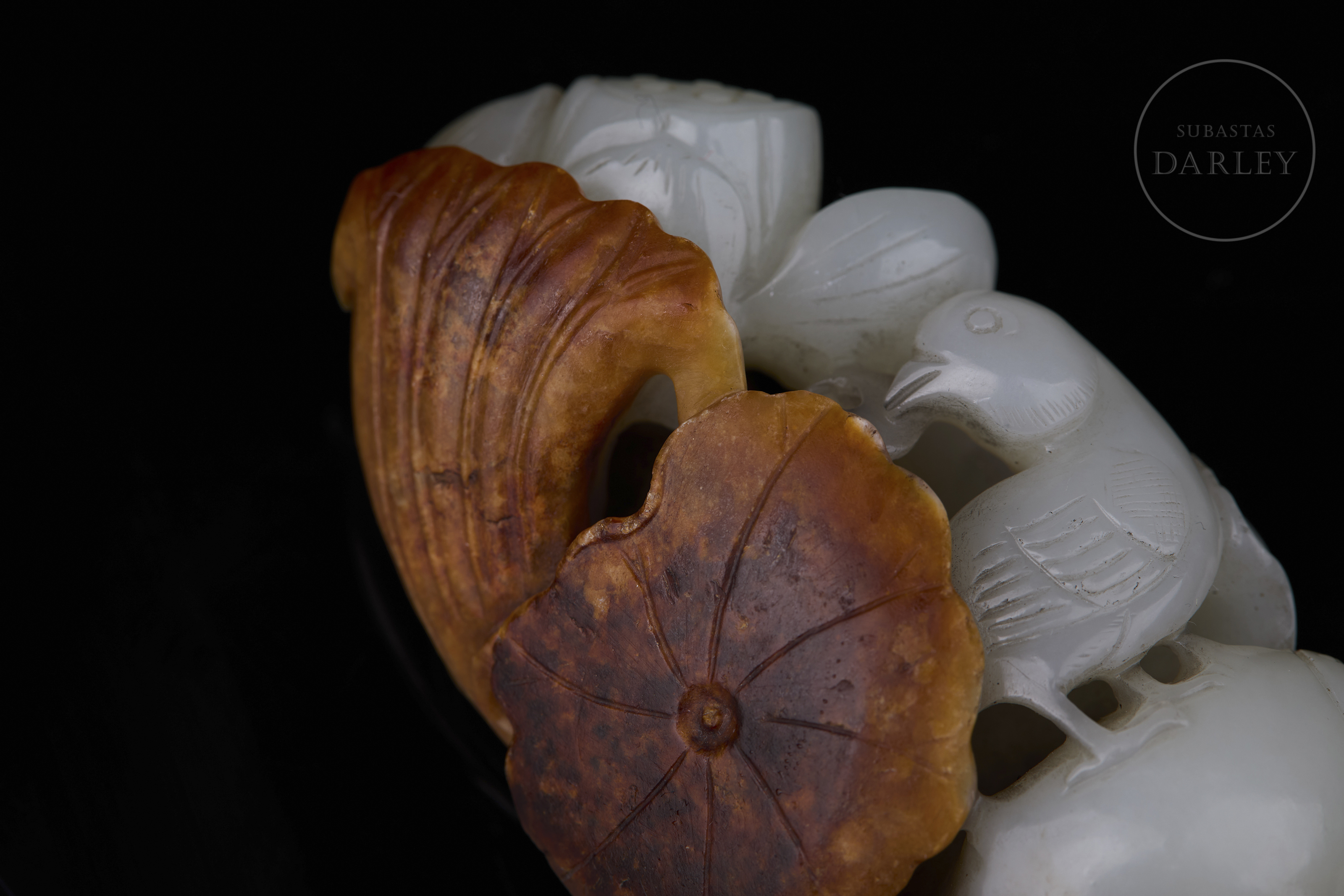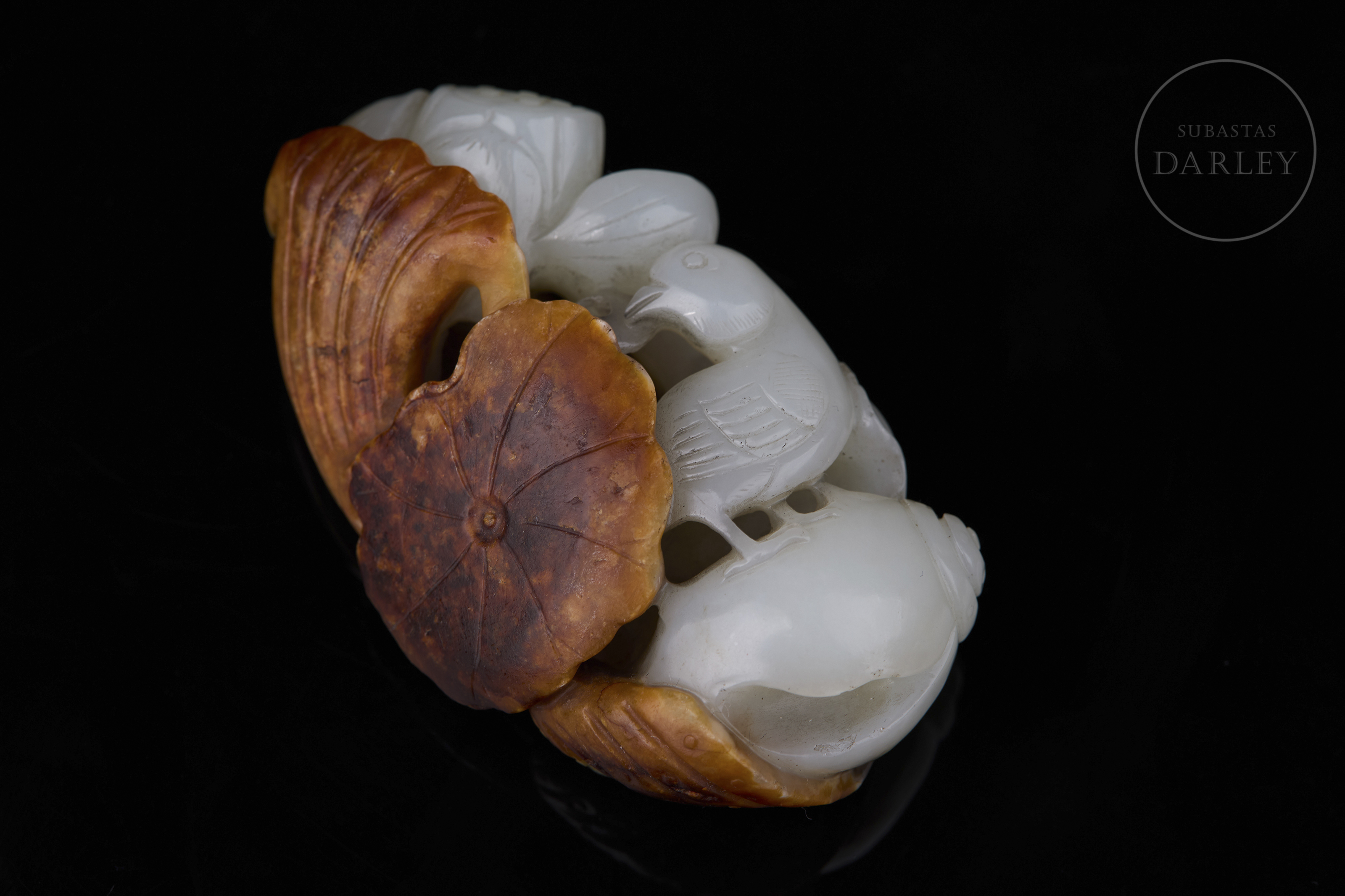 Jade de tonalidad blanca. Muestra una talla en bulto redondo y relieve que aprovecha una gruesa capa natural de tonalidad ocre y óxido. La composición integra hojas de loto de gran tamaño con nervaduras y bordes ondulados. Entre la vegetación y los capullos de loto, se distinguen aves detalladas con finas líneas incisas. La obra muestra una pátina por envejecimiento. Dinastía Qing (1644–1912).