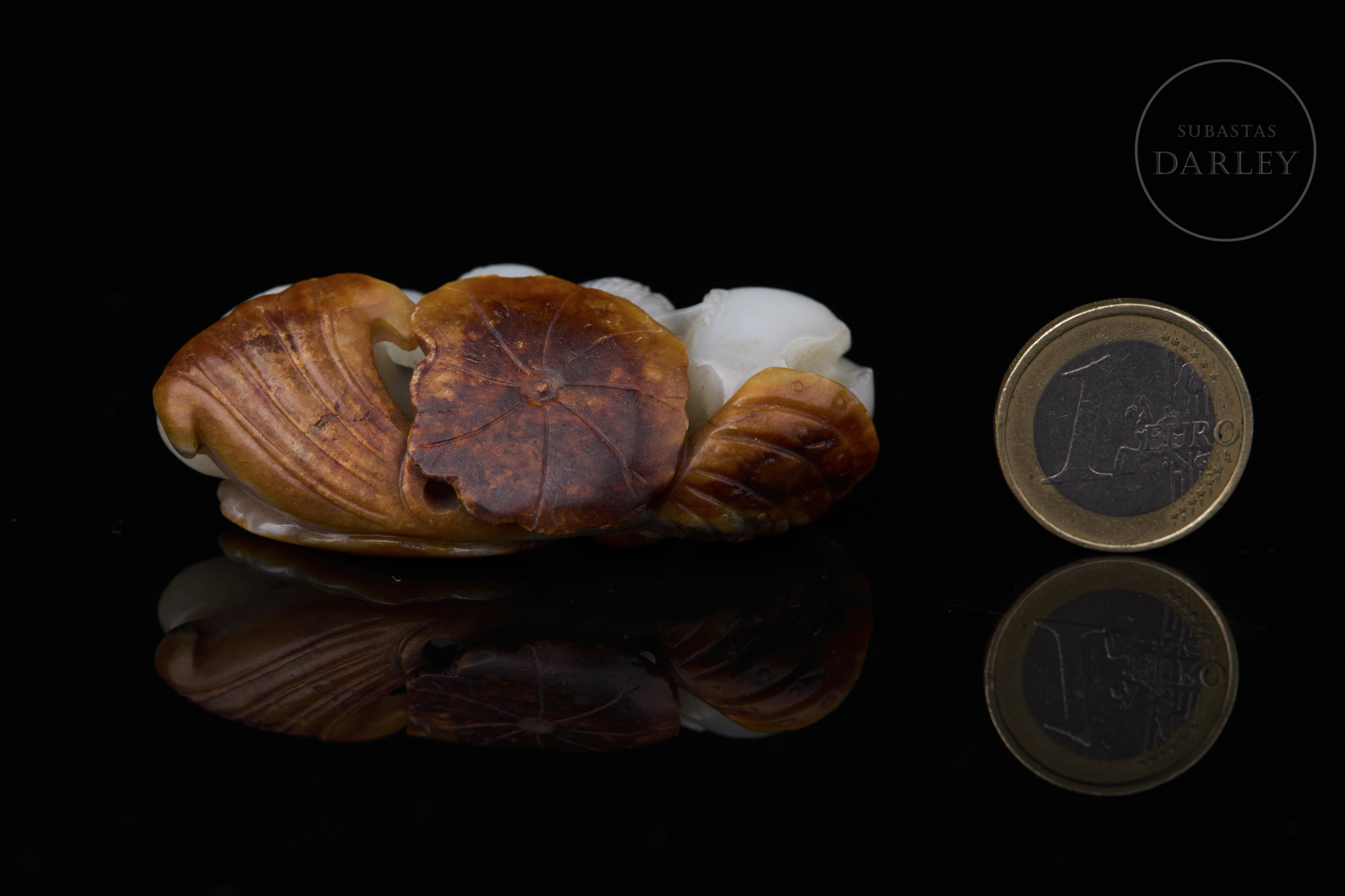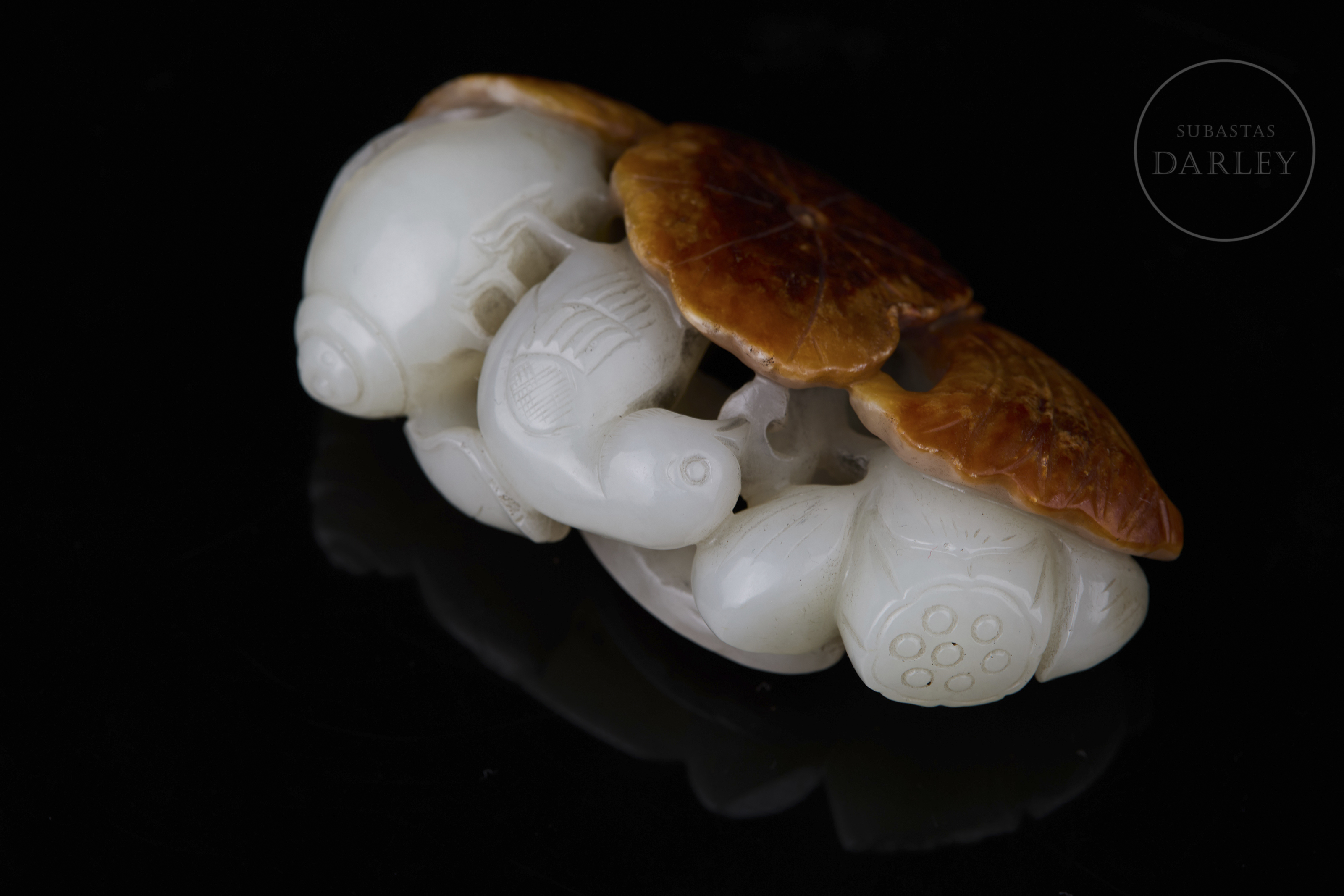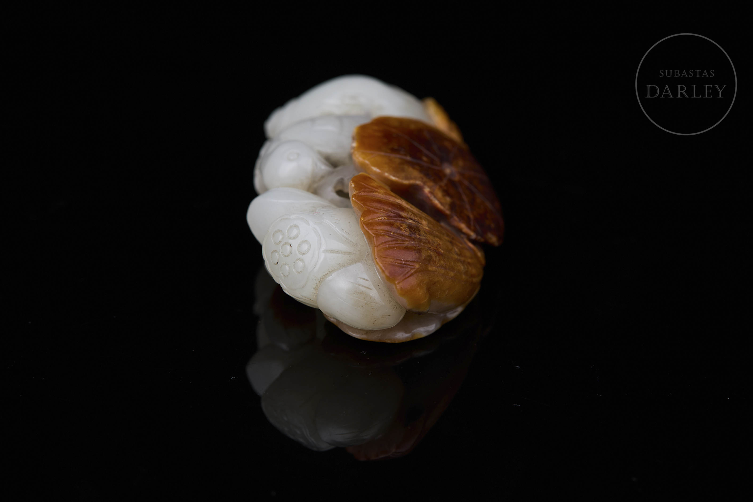 Jade de tonalidad blanca. Muestra una talla en bulto redondo y relieve que aprovecha una gruesa capa natural de tonalidad ocre y óxido. La composición integra hojas de loto de gran tamaño con nervaduras y bordes ondulados. Entre la vegetación y los capullos de loto, se distinguen aves detalladas con finas líneas incisas. La obra muestra una pátina por envejecimiento. Dinastía Qing (1644–1912).