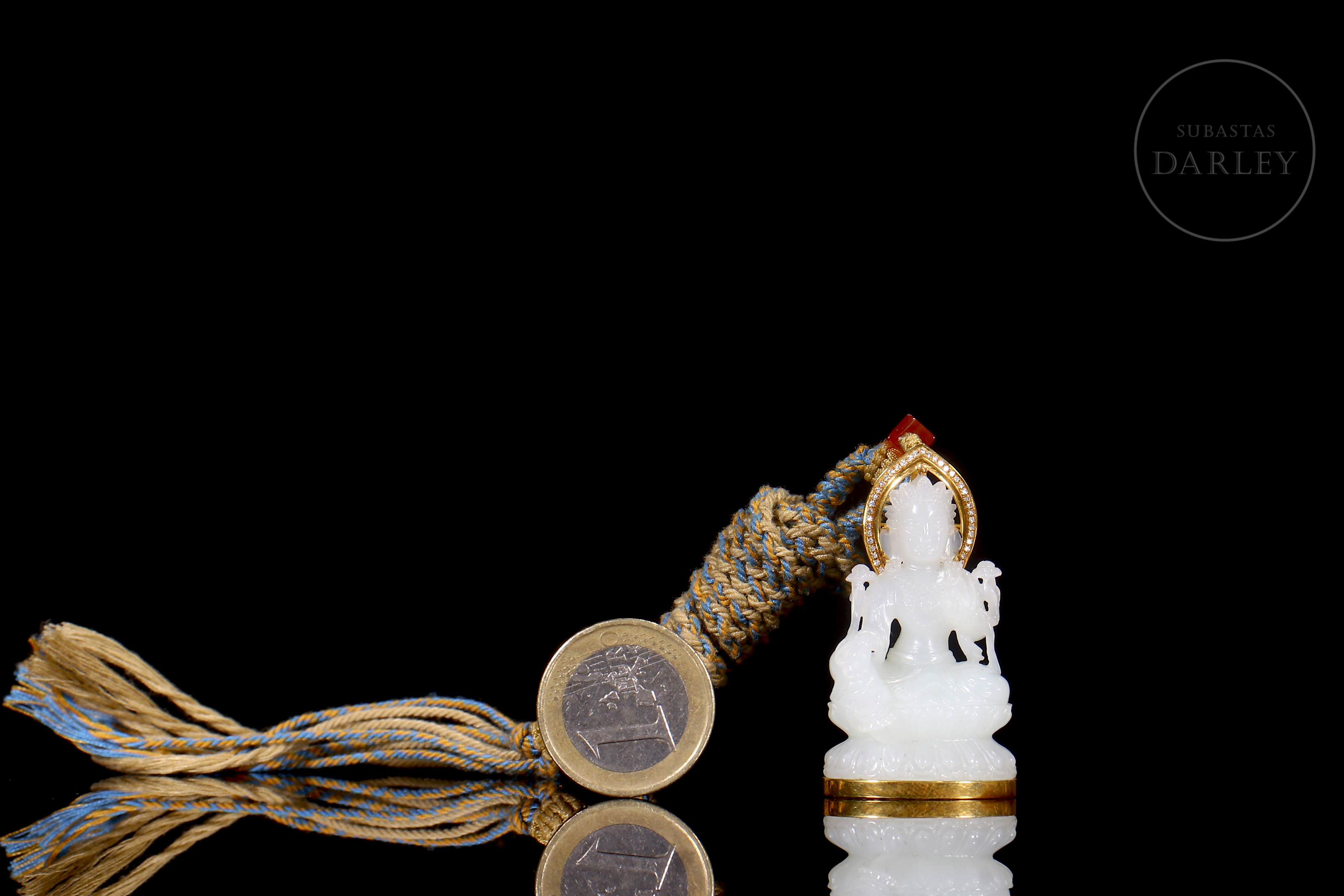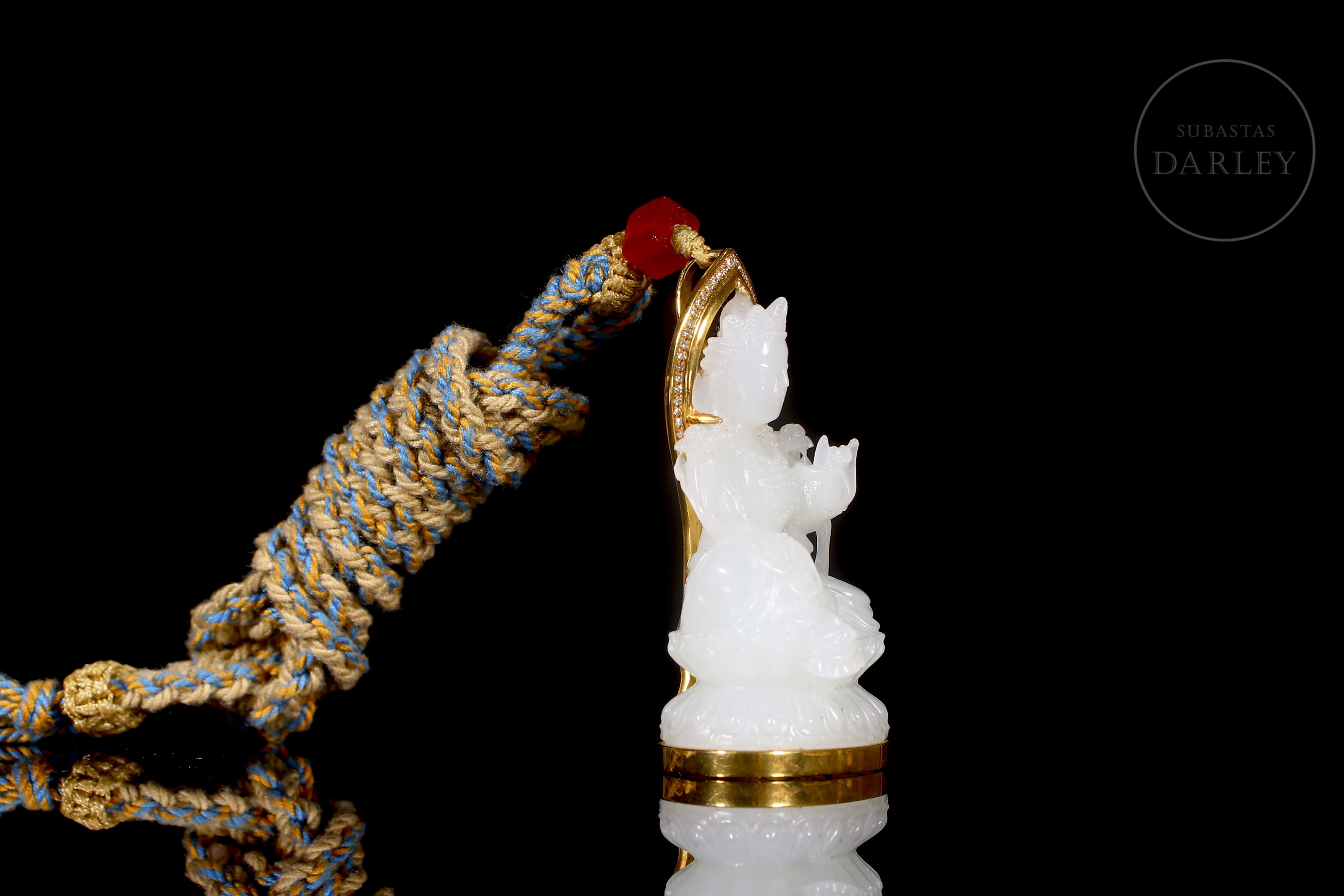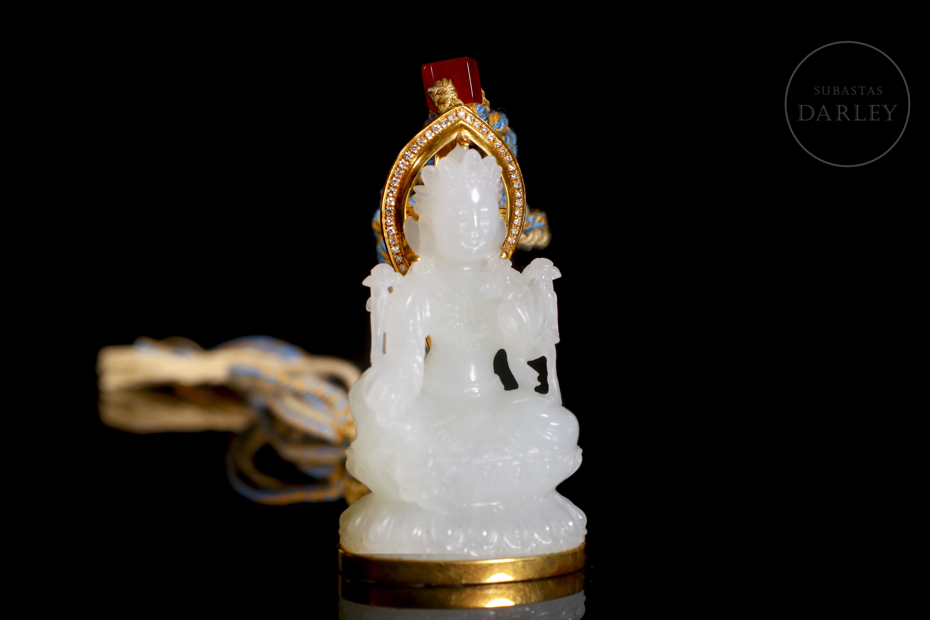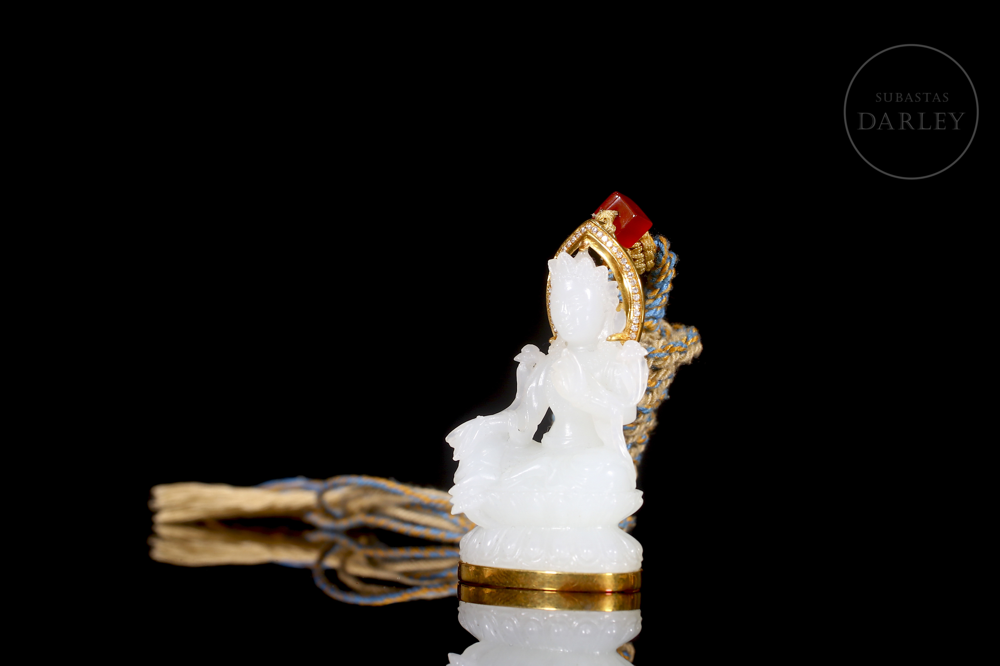 Colgante de jade blanco de Hetian, con un pulido sedoso. Presenta una figura de la deidad Tara, sentada en posición de loto sobre una base floral. La figura, de expresión serena, se muestra ataviada con joyas e indumentaria tradicional, con una alta corona, y portando flores de lotos sobre los hombros y manos. La pieza se encuentra realzada por una montura en oro amarillo de 14 k, que enmarca la figura y se extiende en una anilla superior profusamente ornamentada con brillantes engastados. Dinastía Qing (1644–1911).