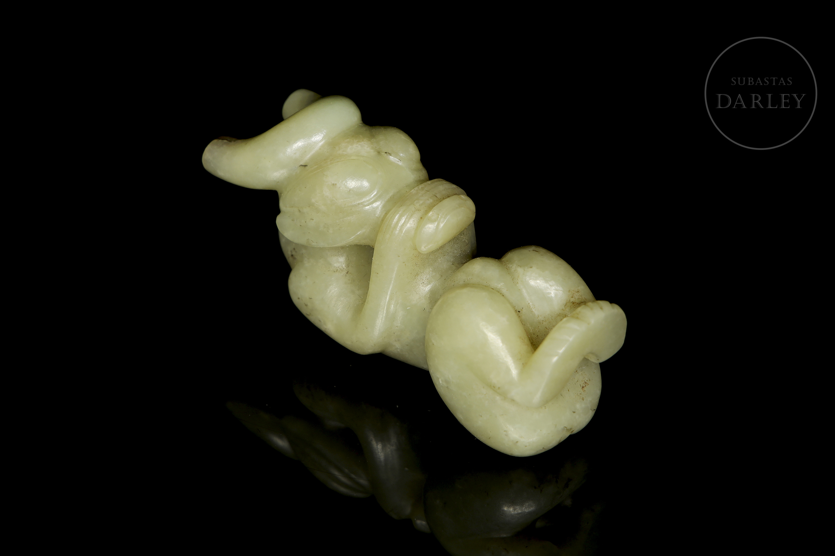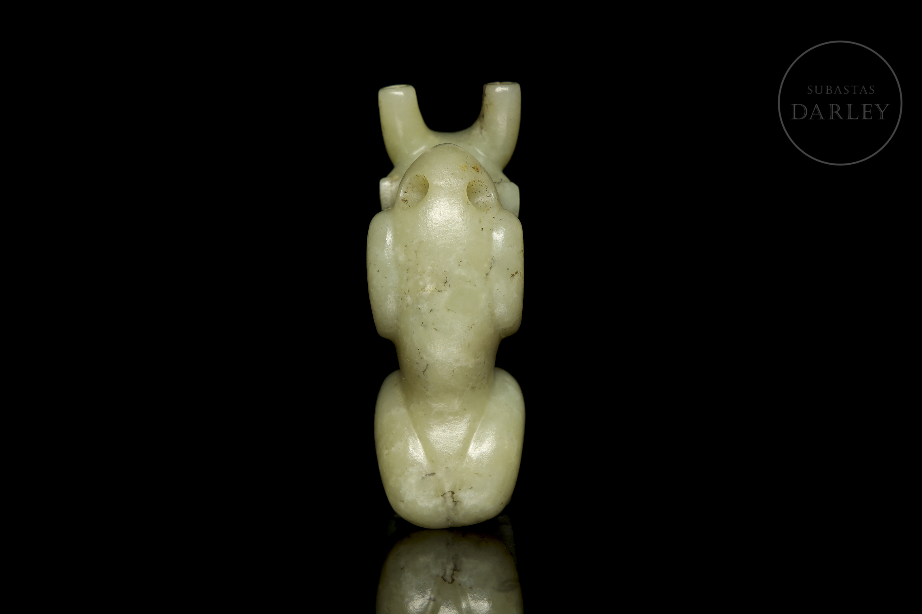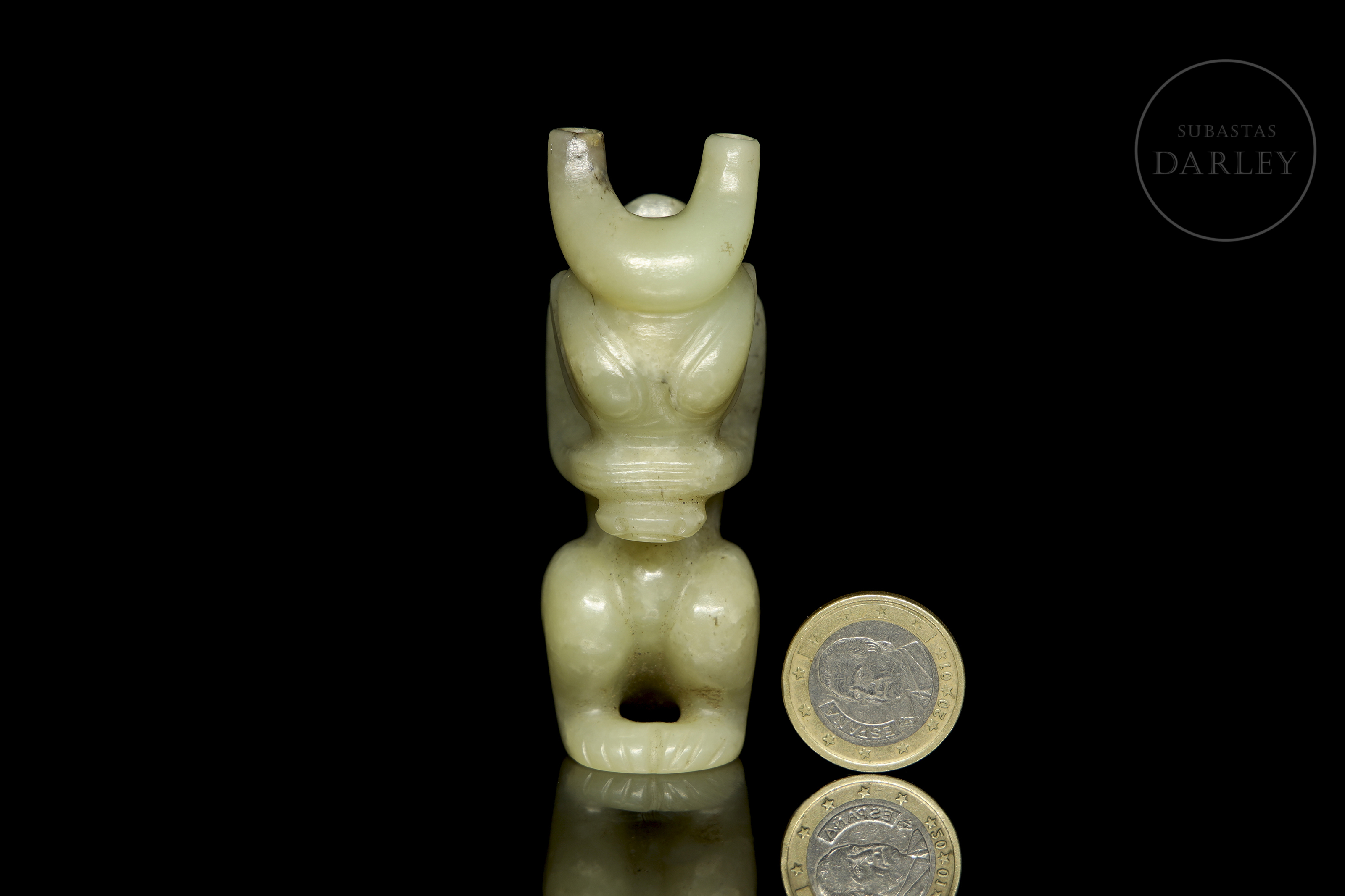 Tallado en jade de tono verde pálido con áreas de pátina de color pardo. La pieza muestra una figura antropomorfa estilizada en posición sedente. Presenta grandes ojos almendrados y una cabeza con alargados cuernos. El cuerpo posee brazos plegados sobre el pecho y piernas flexionadas. Muestra pátina por antigüedad. Cultura Hongshan (aprox. 4000–3000 a.C.) o posterior.