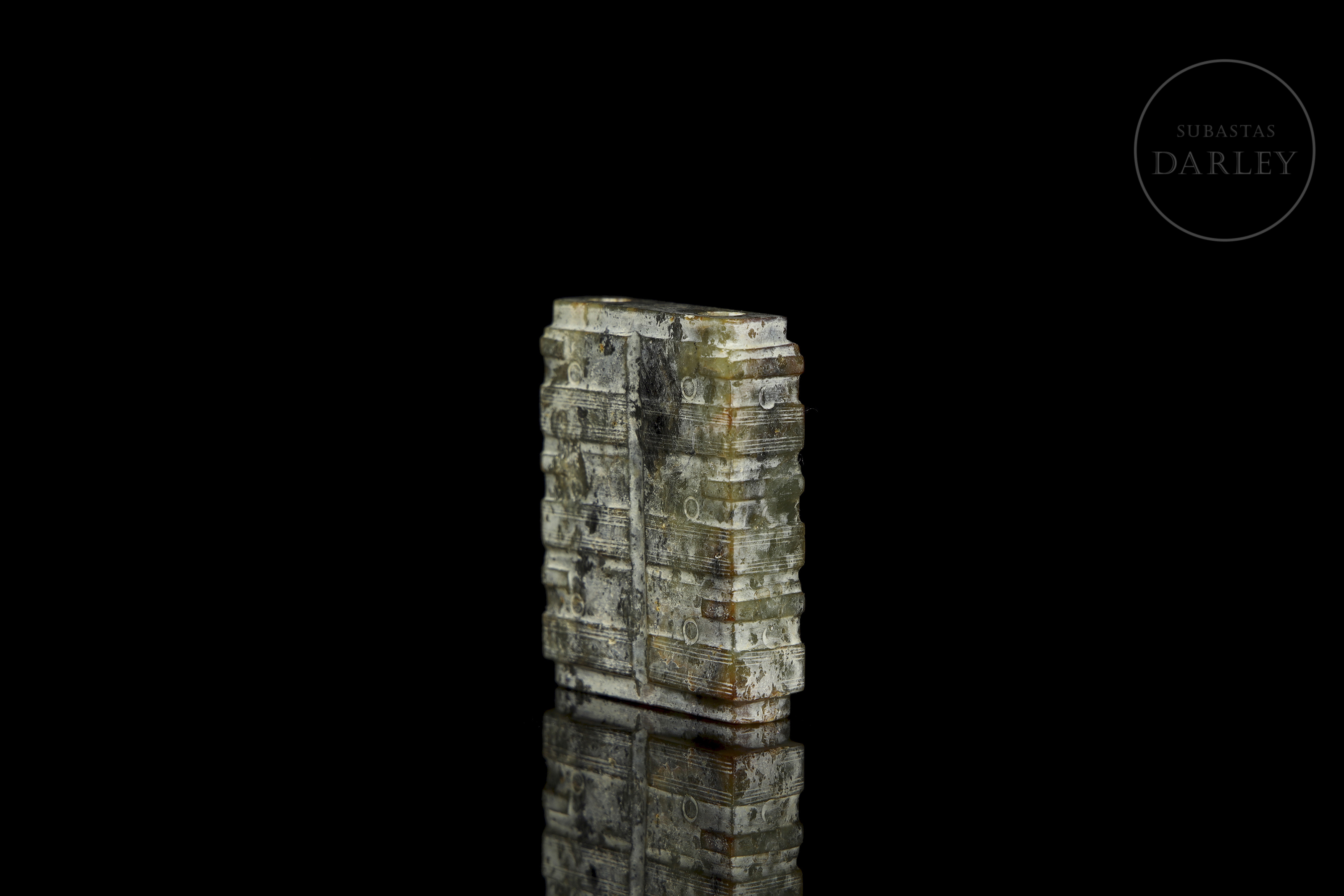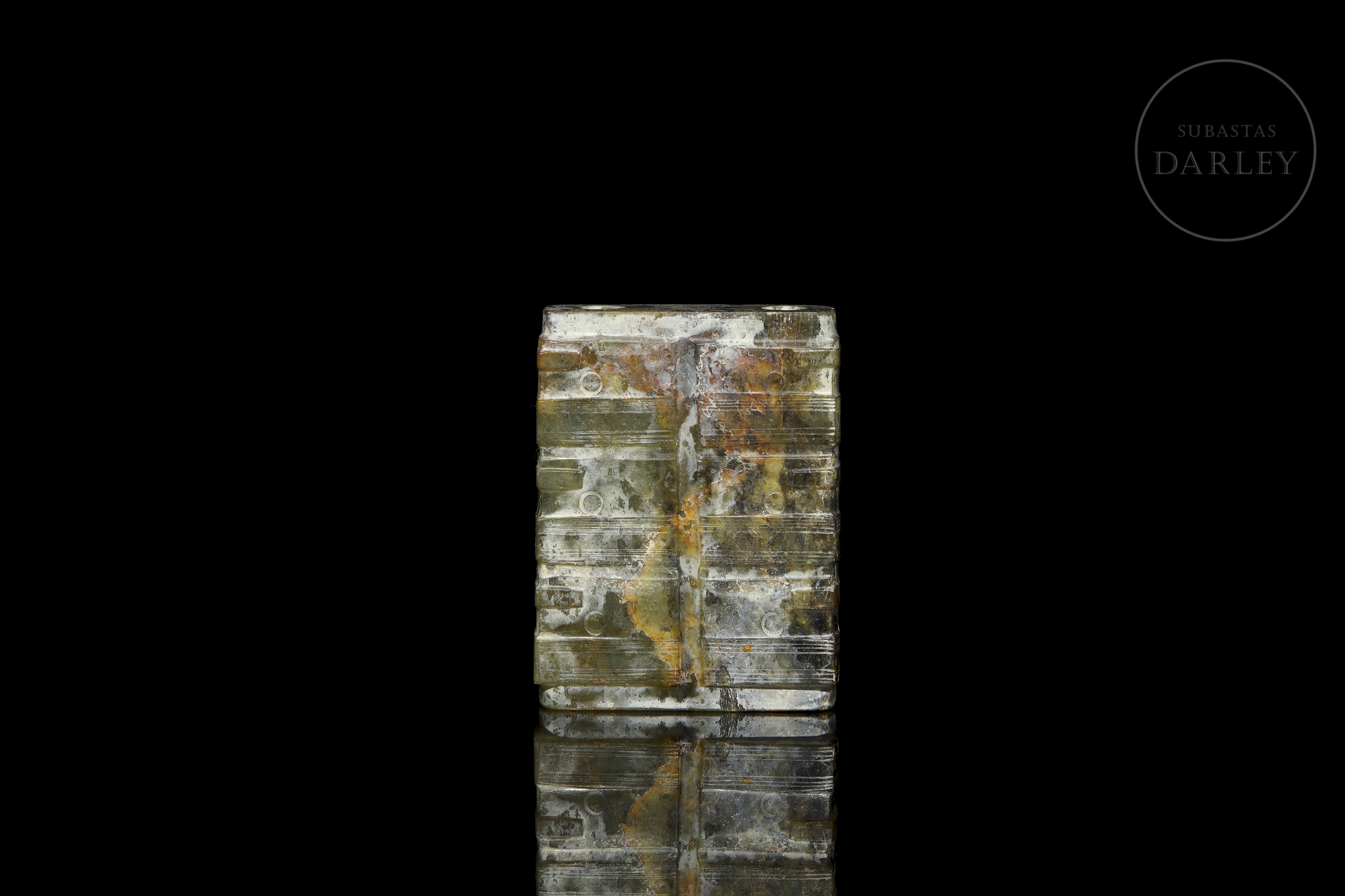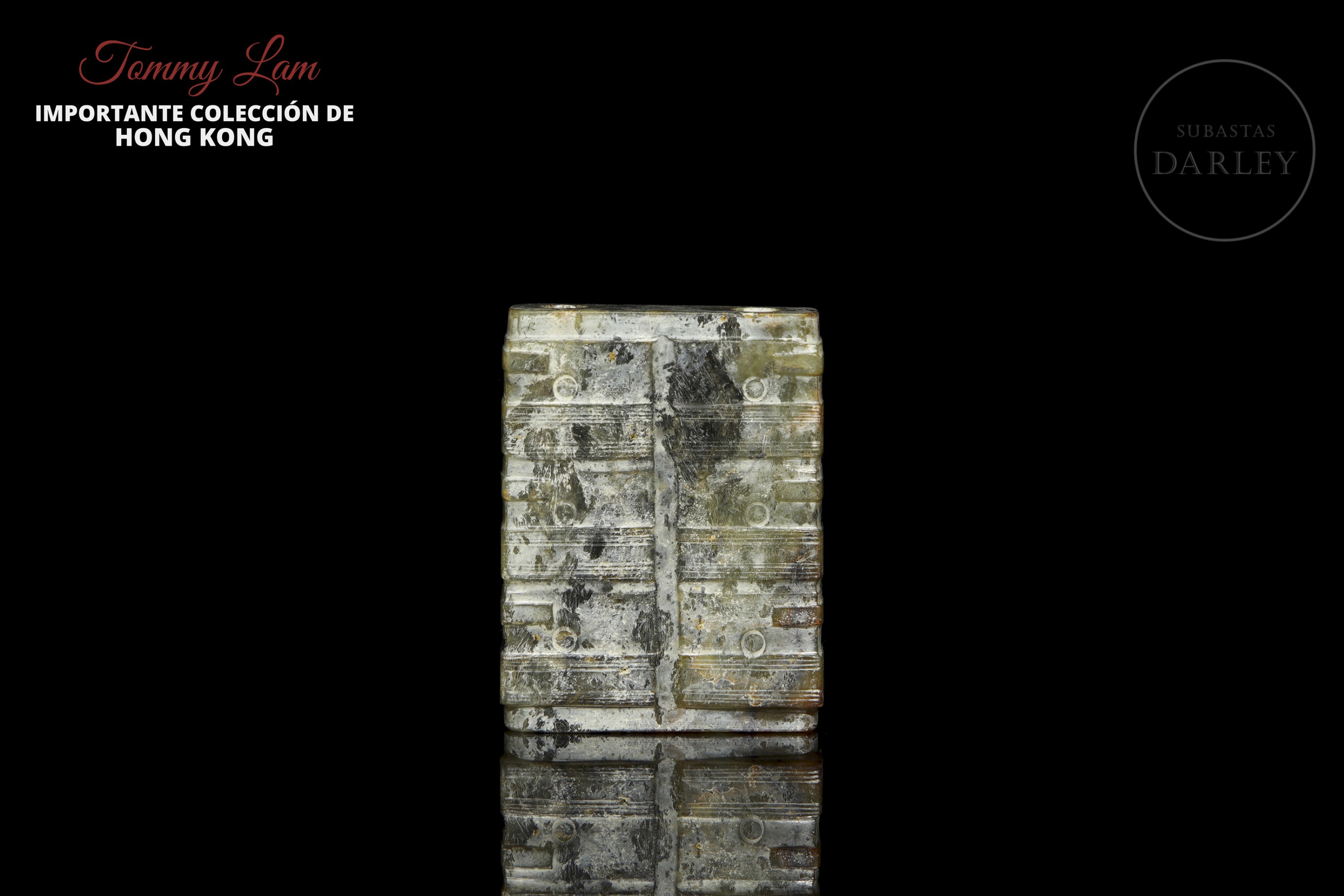 Jade verde grisáceo con una profusa pátina de alteraciones minerales blancas, ocres y marrón rojizo. Presenta un formato rectangular aplanado que fusiona dos estructuras de cong unidas lateralmente, con dos perforaciones longitudinales. Se encuentra adornado con detalles de líneas y círculos incisos en todas sus caras. Muestra desgaste por envejecimiento. Cultura Liangzhu (aprox. 3300–2300 a.C.) o posterior.