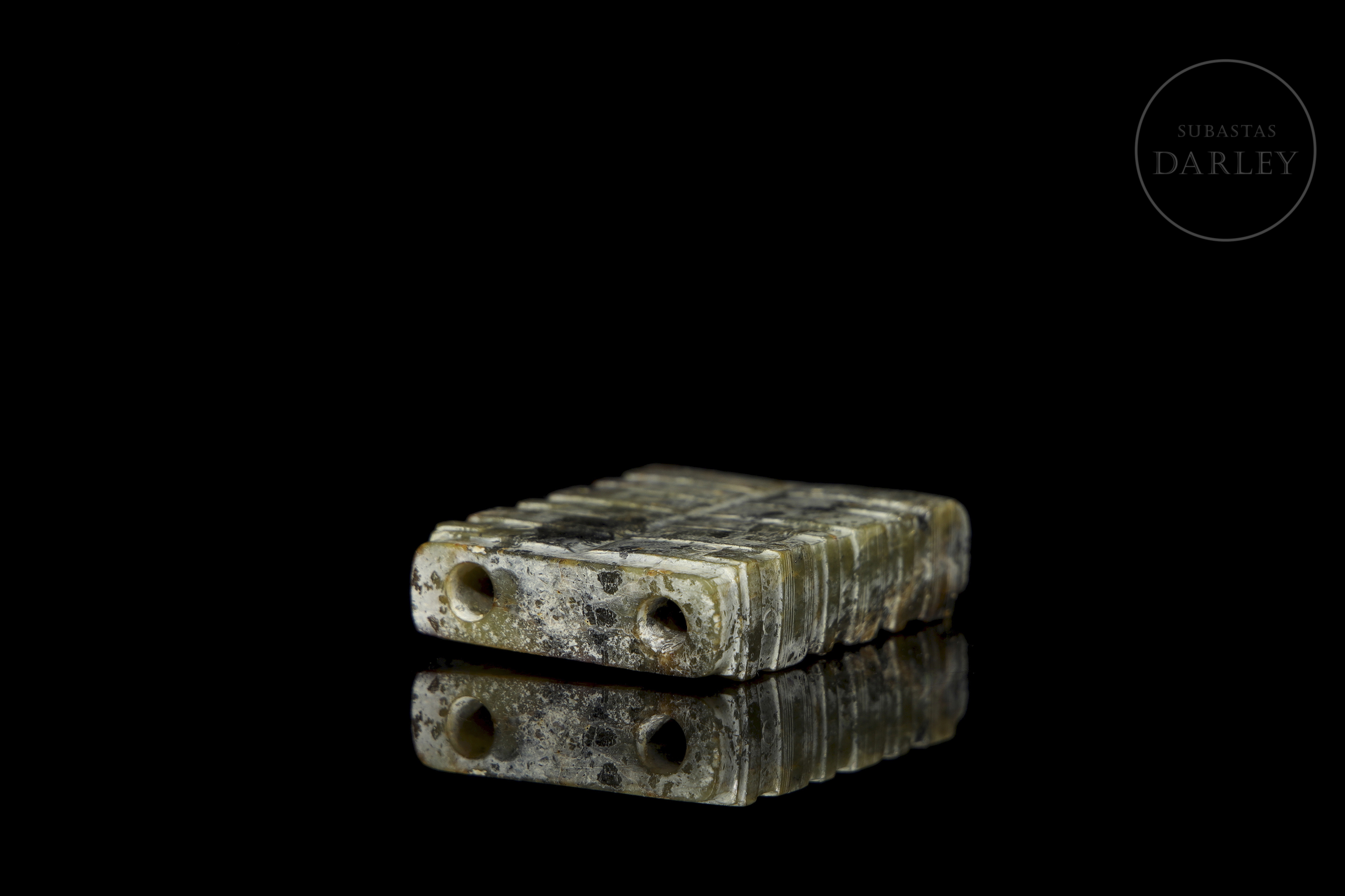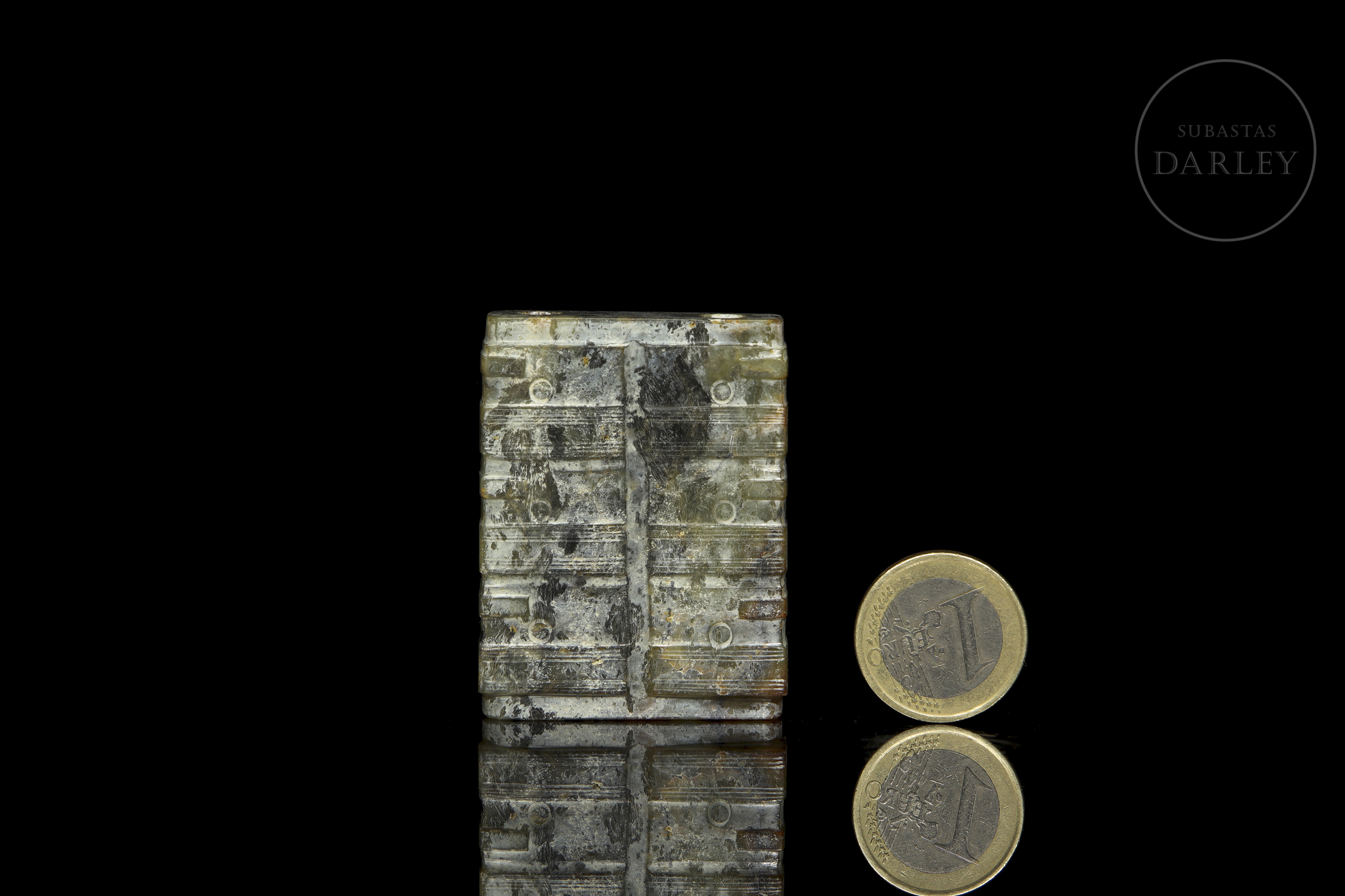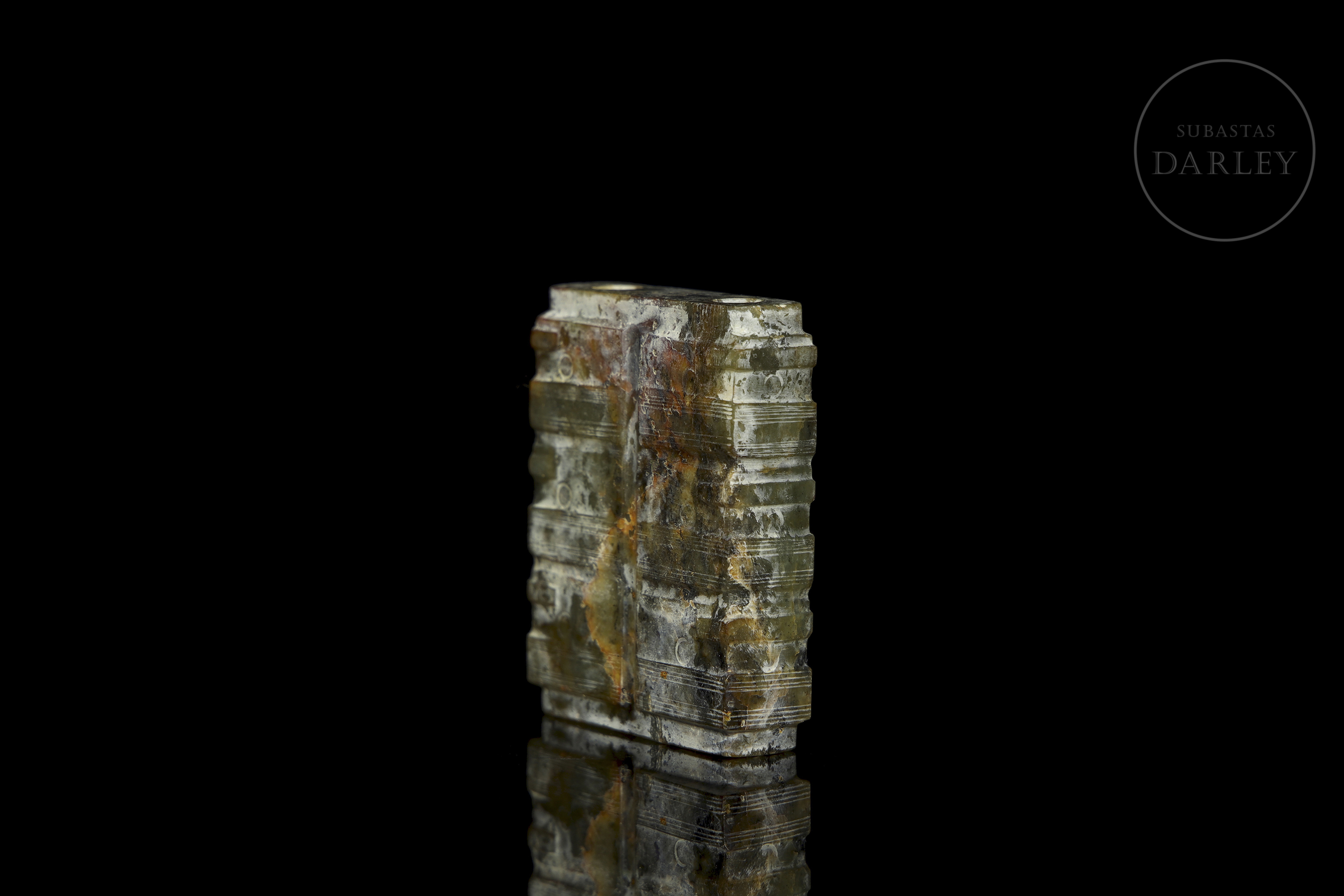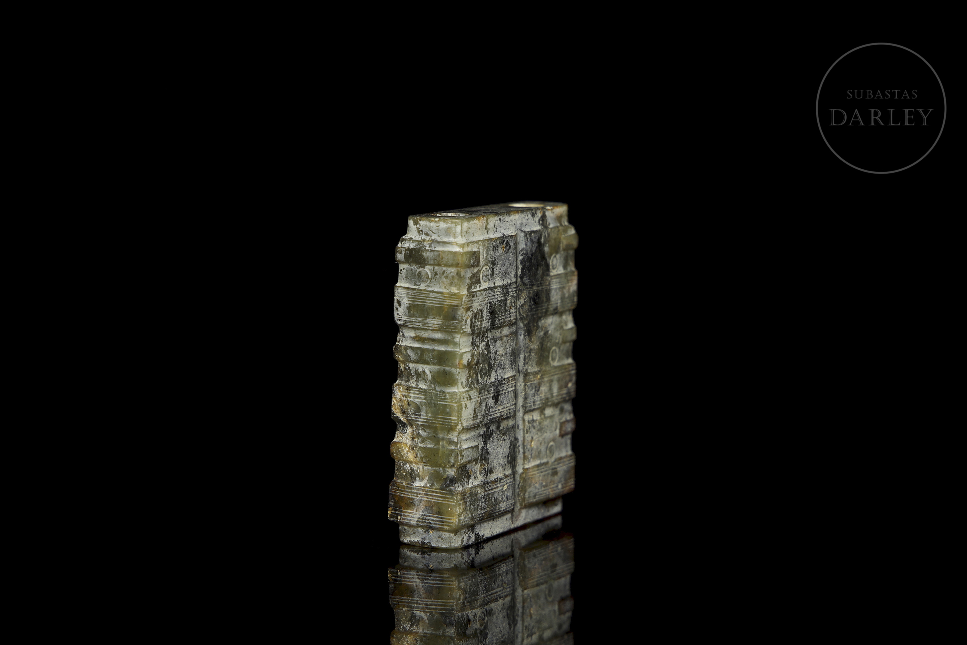 Jade verde grisáceo con una profusa pátina de alteraciones minerales blancas, ocres y marrón rojizo. Presenta un formato rectangular aplanado que fusiona dos estructuras de cong unidas lateralmente, con dos perforaciones longitudinales. Se encuentra adornado con detalles de líneas y círculos incisos en todas sus caras. Muestra desgaste por envejecimiento. Cultura Liangzhu (aprox. 3300–2300 a.C.) o posterior.