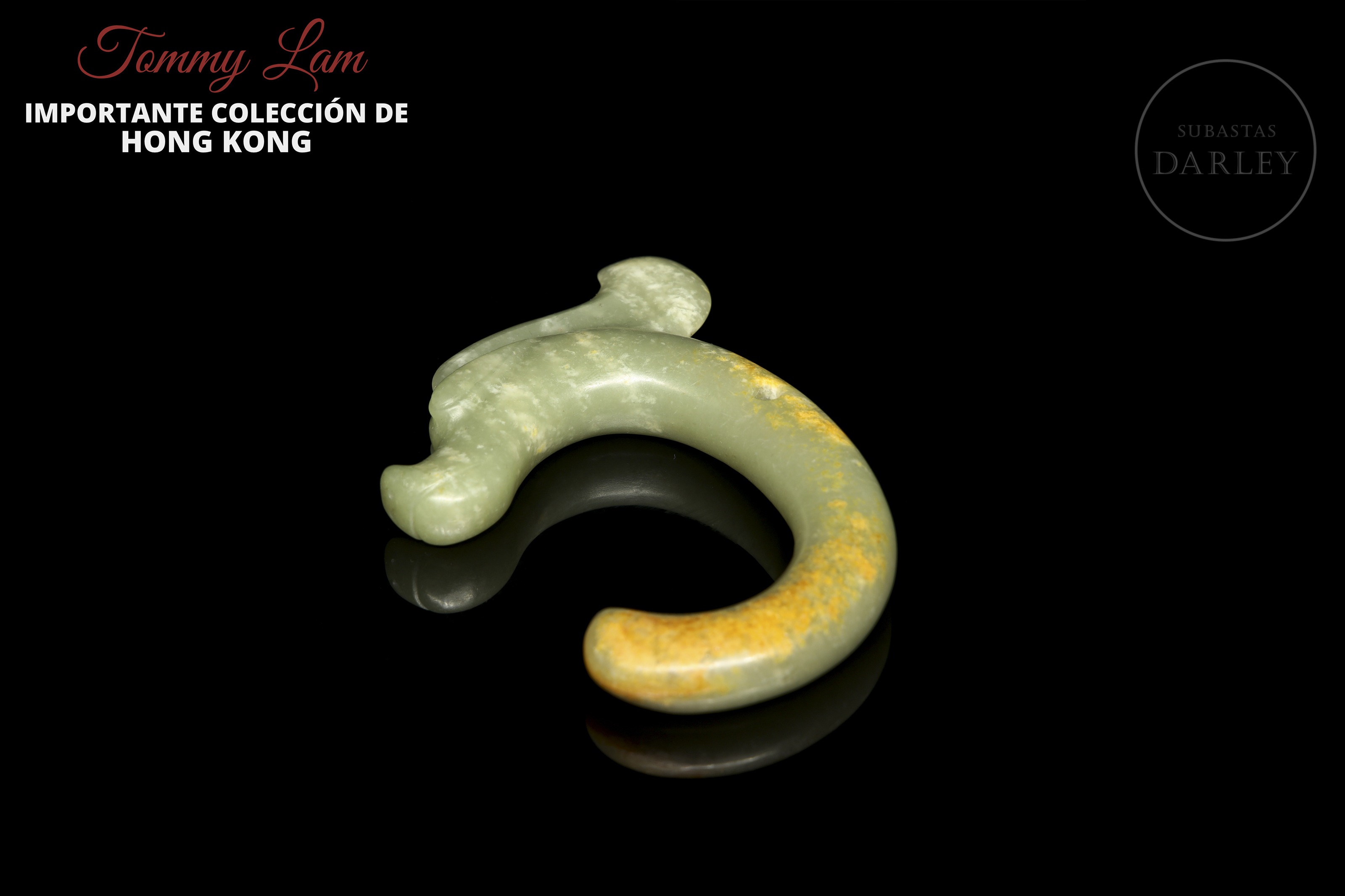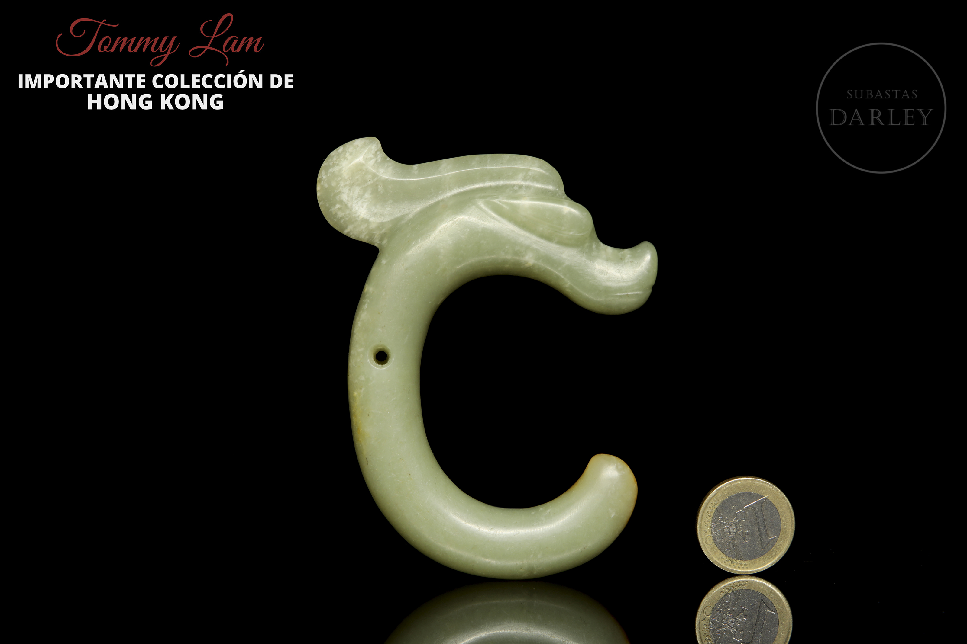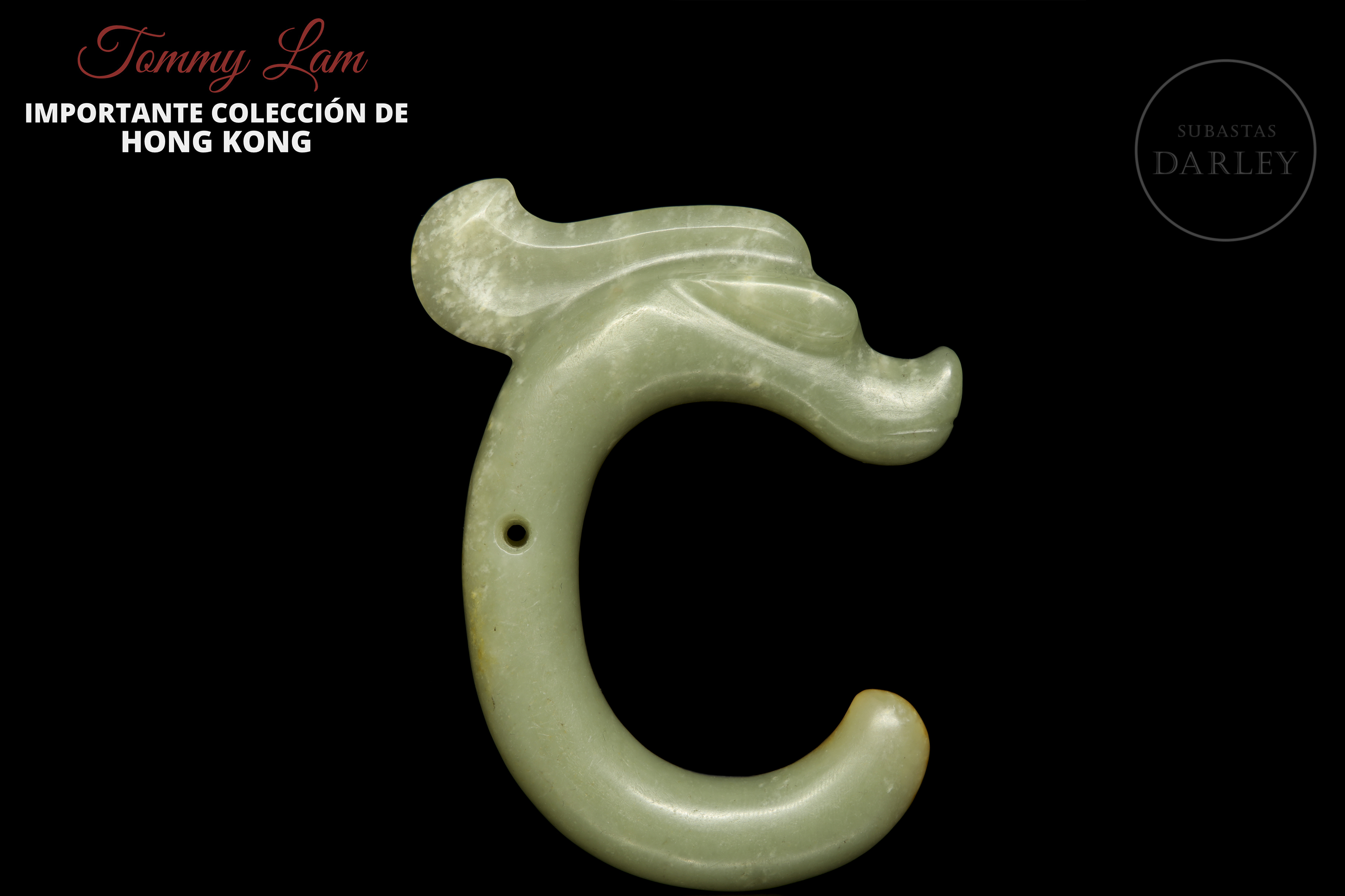 Amuleto de jade tallado en forma de "dragón en forma de C". La pieza, de gran simpleza, representa una cabeza de dragón estilizada unida a un cuerpo curvo y liso. El jade es de un tono verde pálido con áreas de alteración amarillentas.
