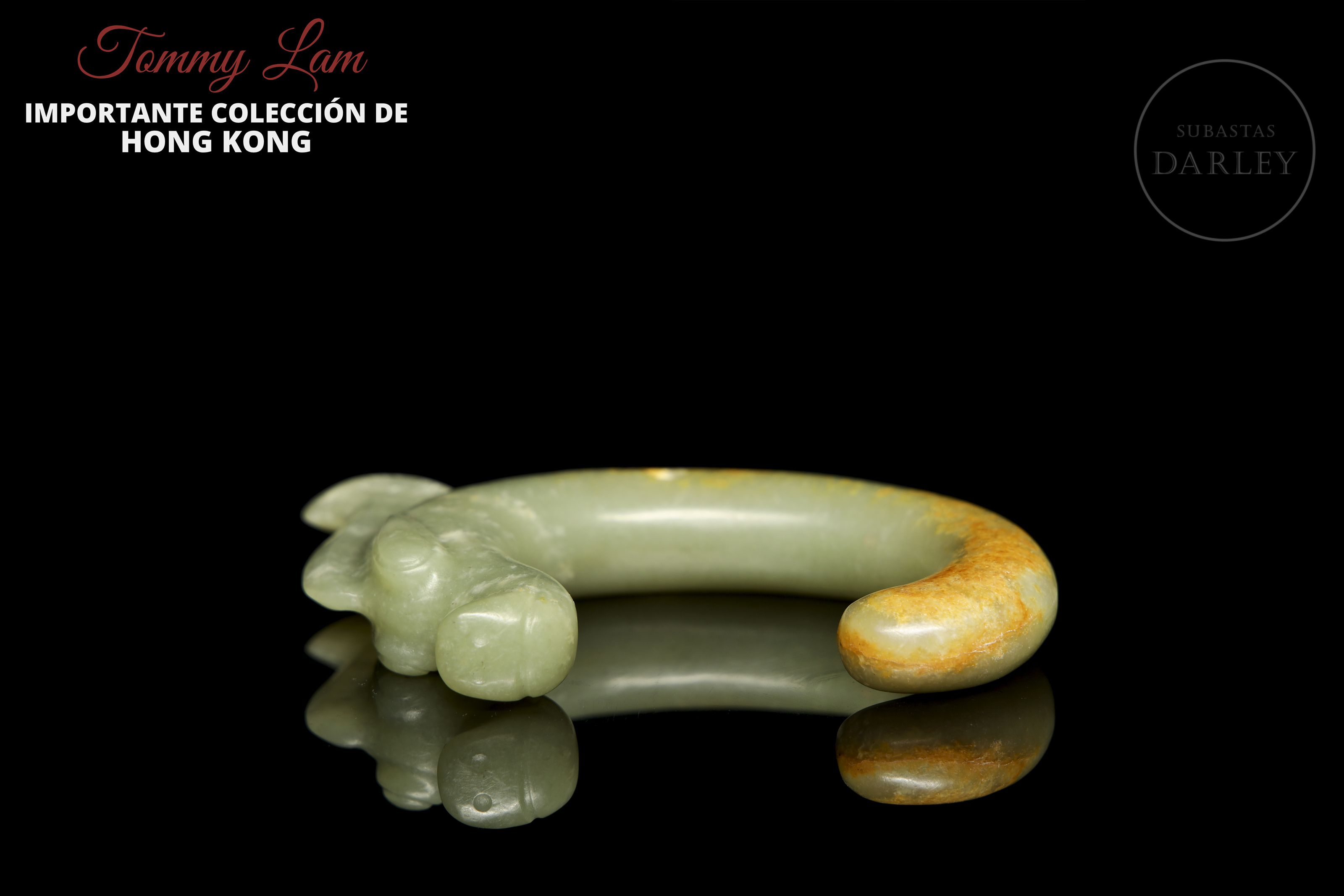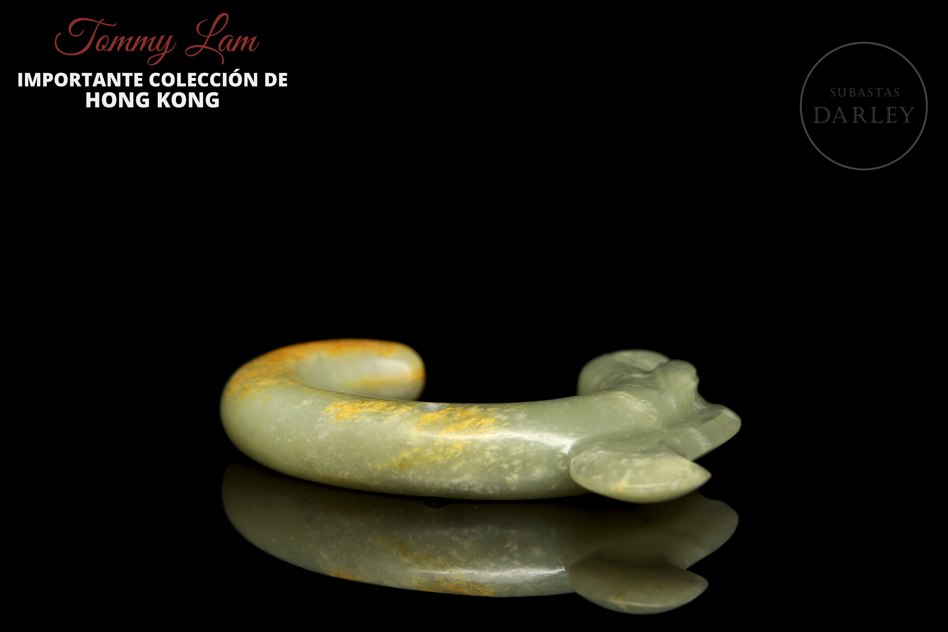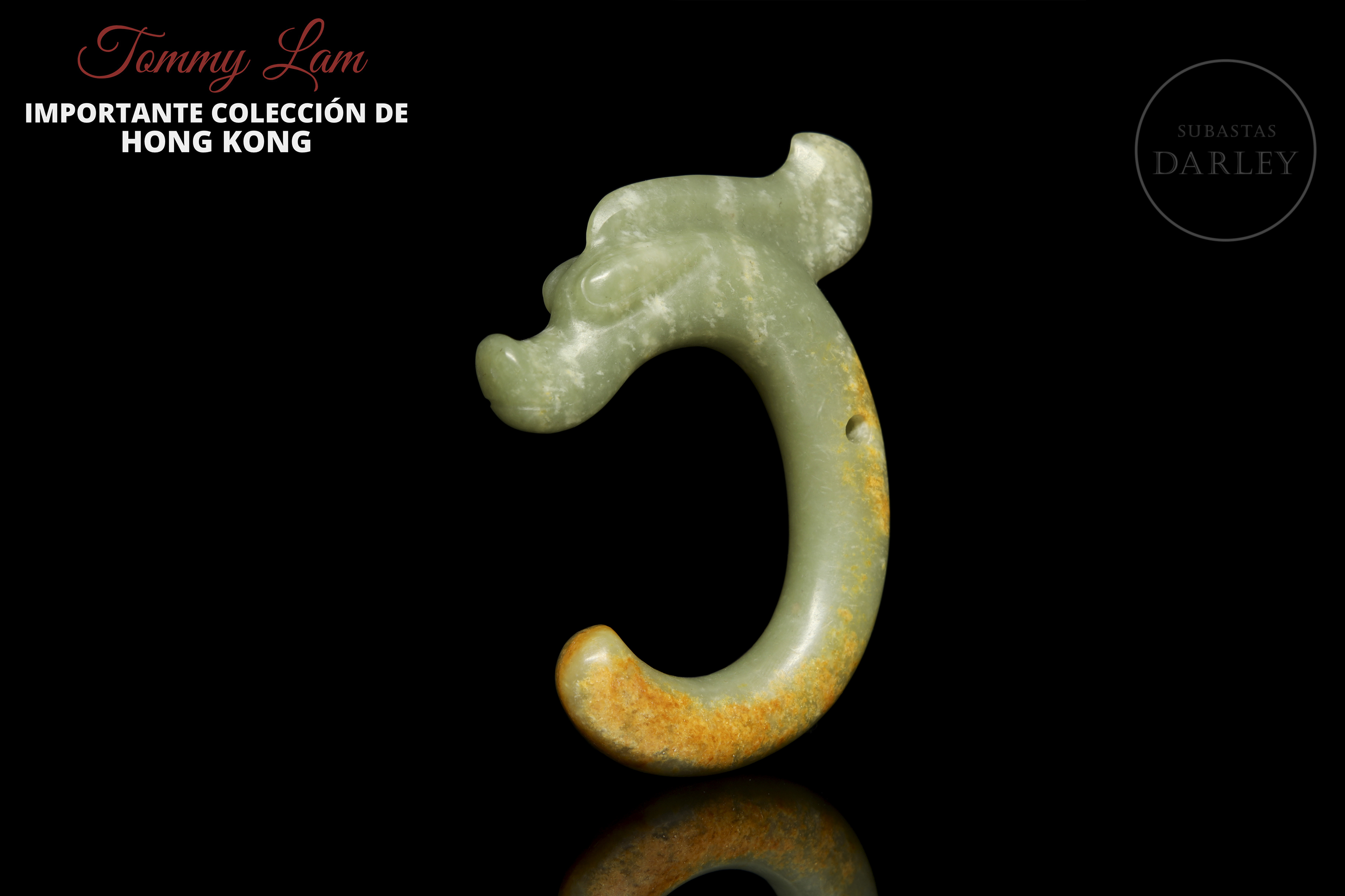 Amuleto de jade tallado en forma de "dragón en forma de C". La pieza, de gran simpleza, representa una cabeza de dragón estilizada unida a un cuerpo curvo y liso. El jade es de un tono verde pálido con áreas de alteración amarillentas.