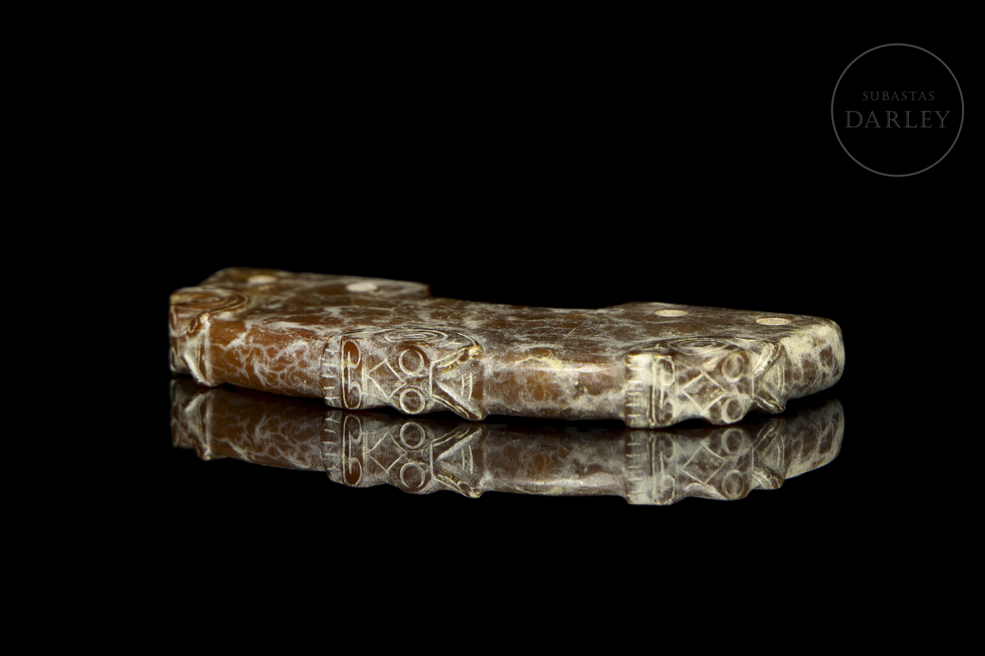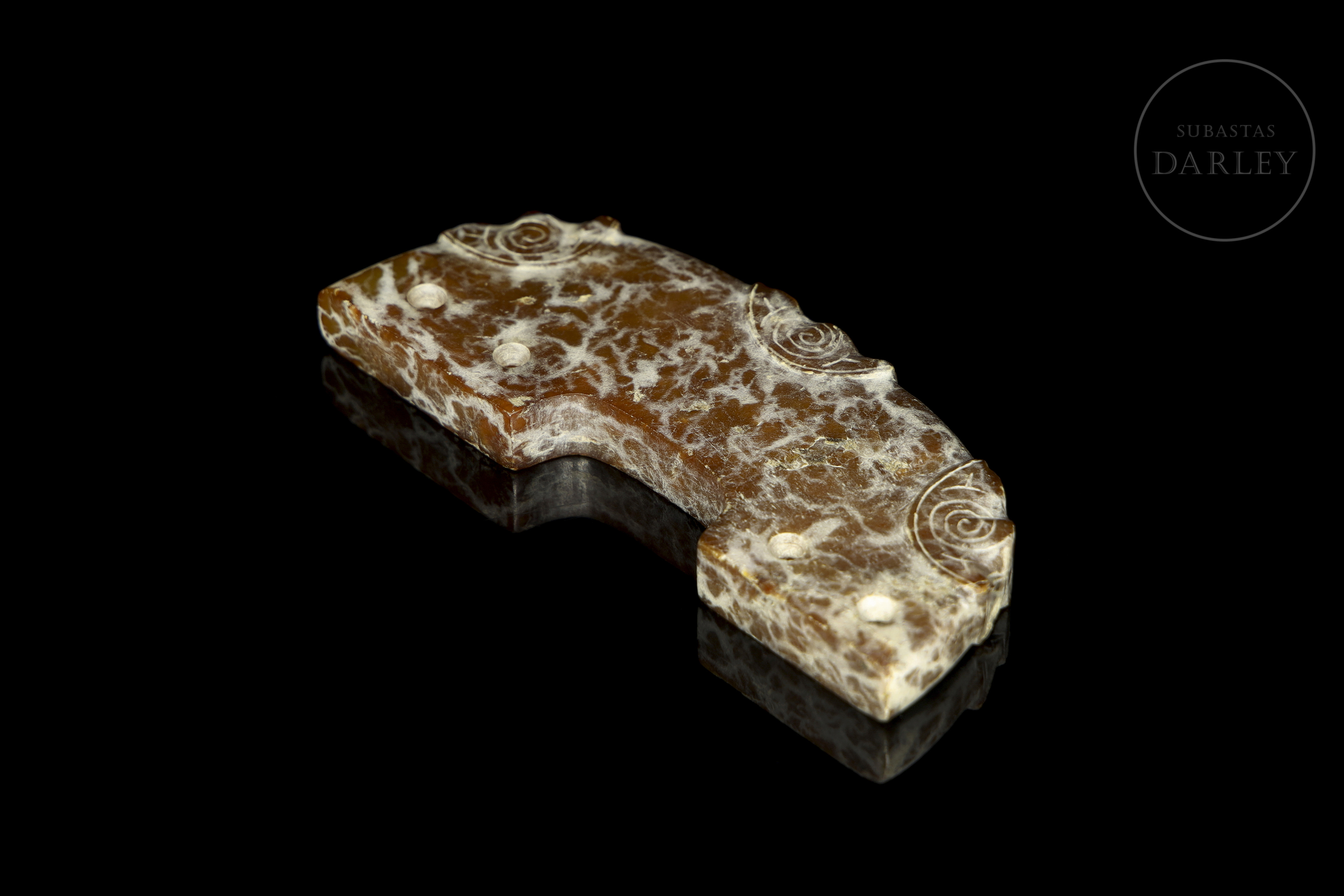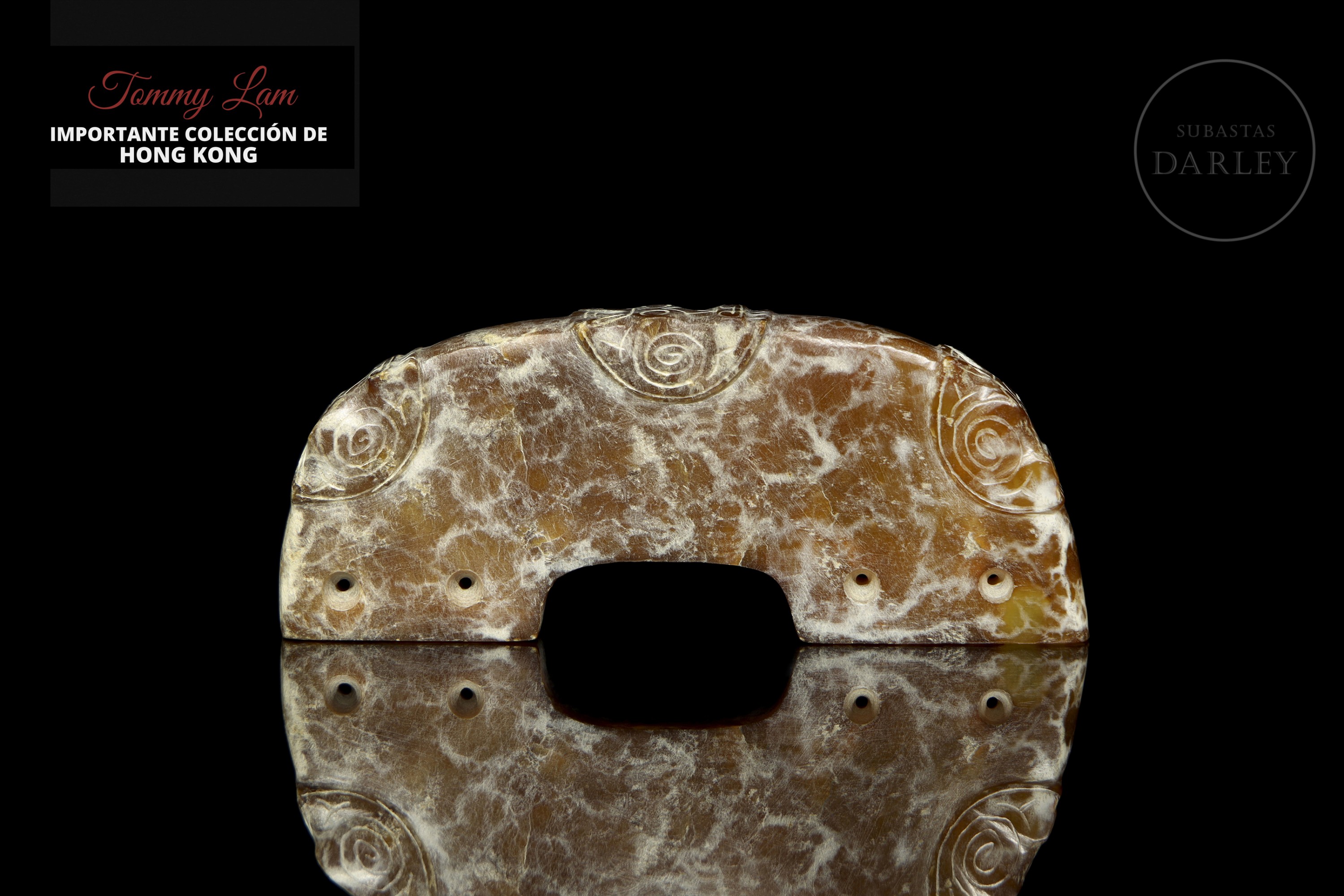 Colgante de jade de tonalidad marrón con una profusa pátina de color blanquecino marmoleado. La pieza presenta el formato clásico de (璜): un arco semicircular plano, de borde crestado, decorado en su parte superior y laterales con finos bajorrelieves de volutas y espirales que conforman la imagen de bestias esquemáticas. Destaca la presencia de cuatro pequeñas perforaciones para su suspensión ritual. Cultura Liangzhu (aprox. 3300–2300 a.C.) o posterior.