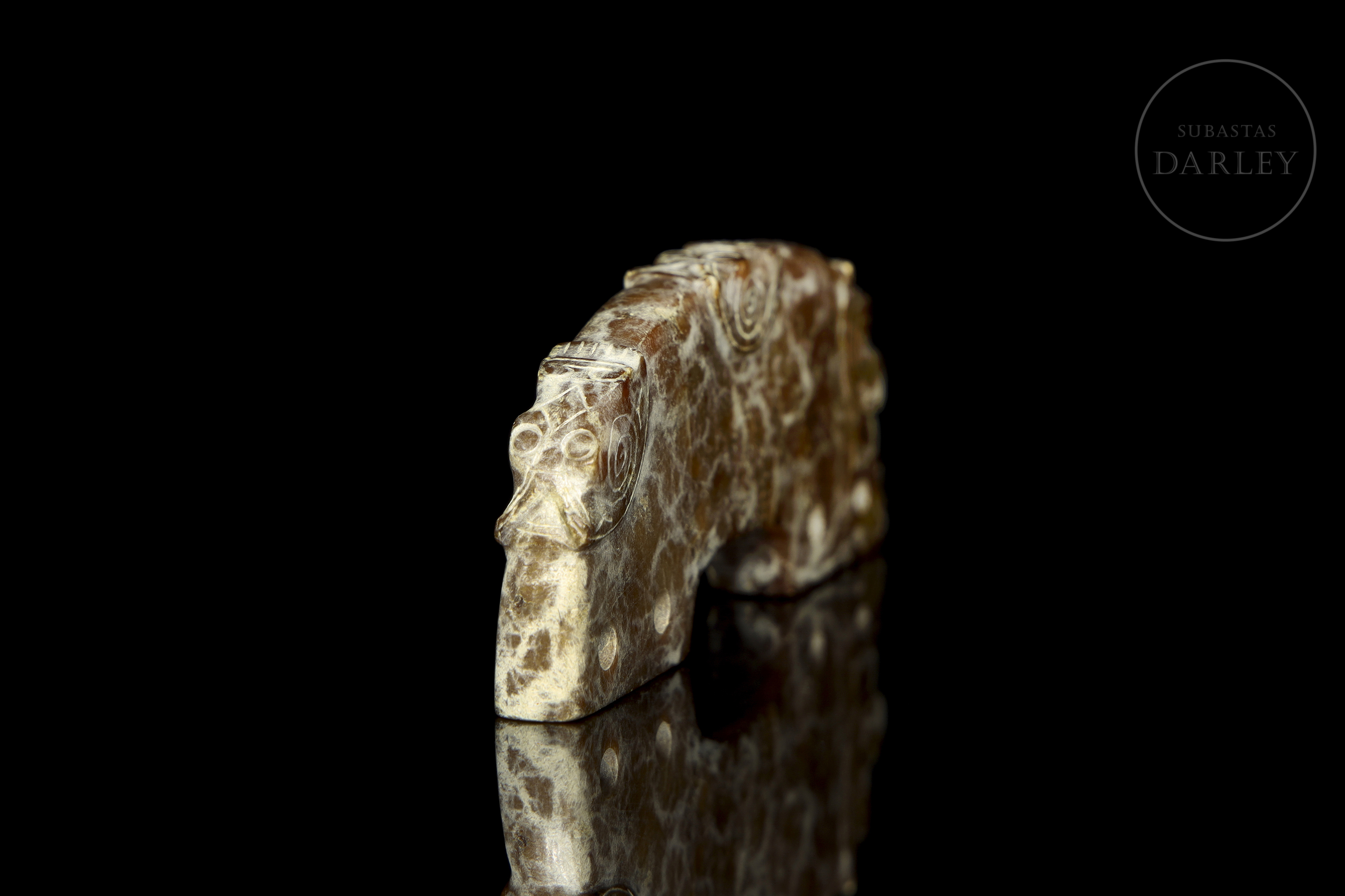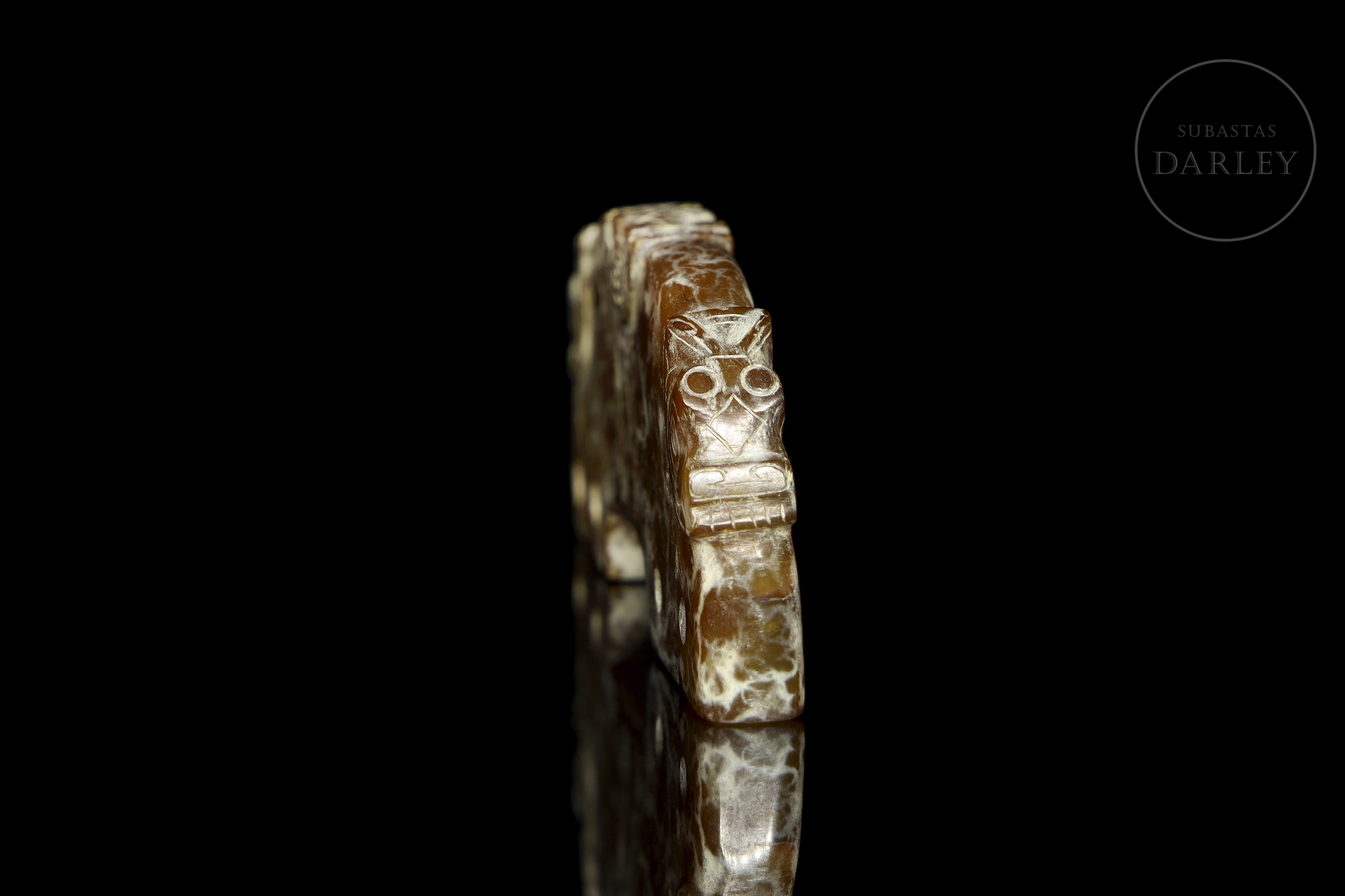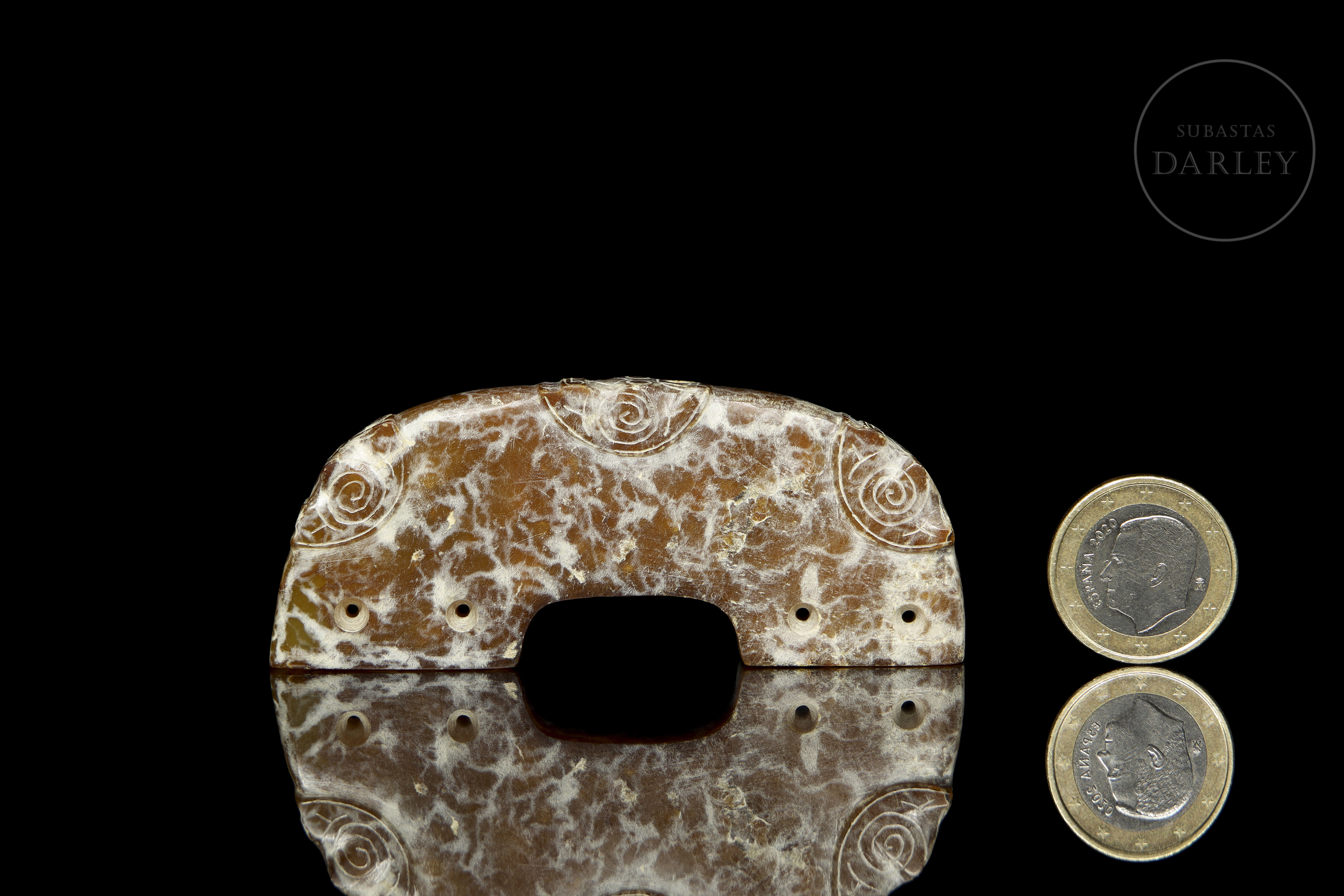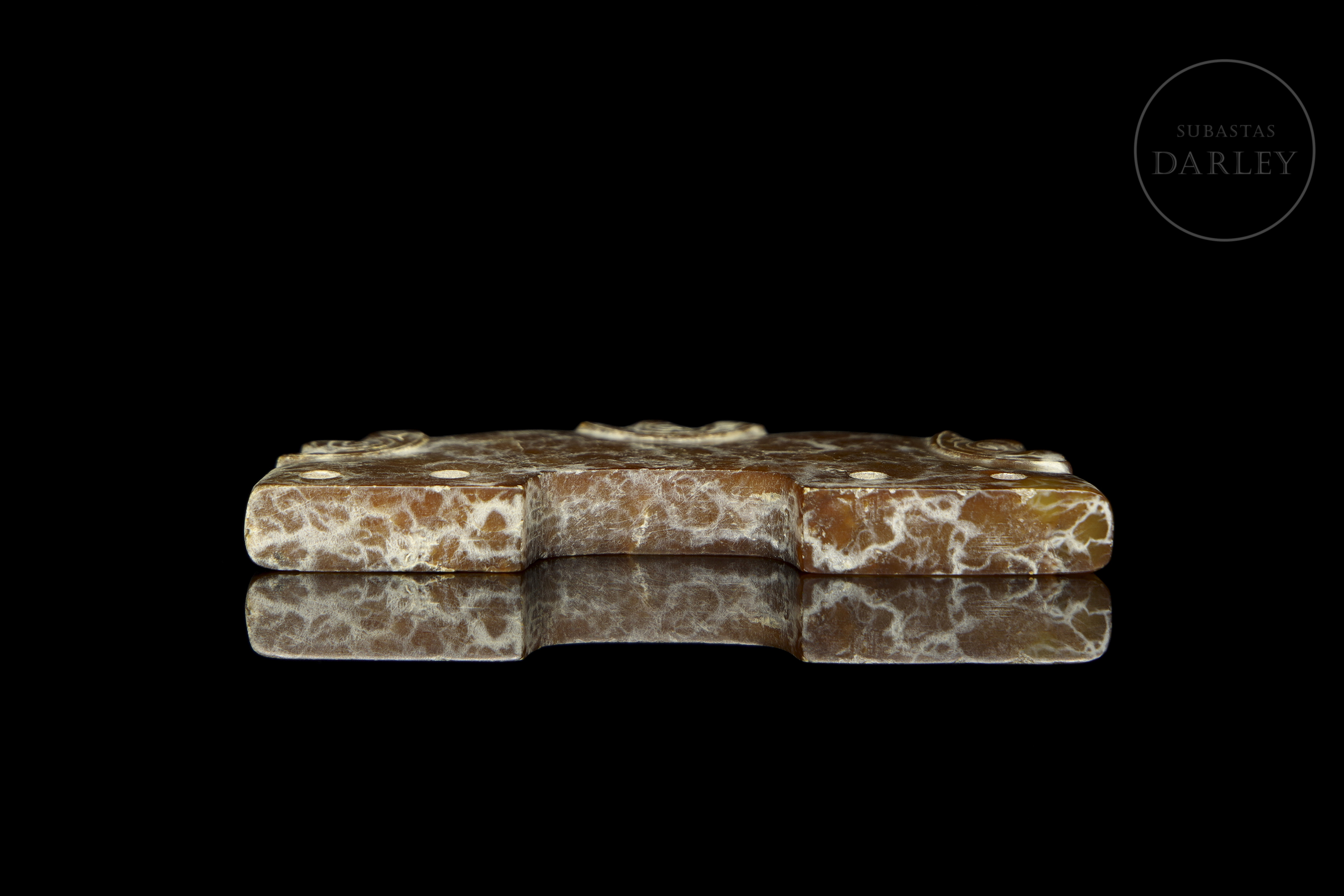 Colgante de jade de tonalidad marrón con una profusa pátina de color blanquecino marmoleado. La pieza presenta el formato clásico de (璜): un arco semicircular plano, de borde crestado, decorado en su parte superior y laterales con finos bajorrelieves de volutas y espirales que conforman la imagen de bestias esquemáticas. Destaca la presencia de cuatro pequeñas perforaciones para su suspensión ritual. Cultura Liangzhu (aprox. 3300–2300 a.C.) o posterior.