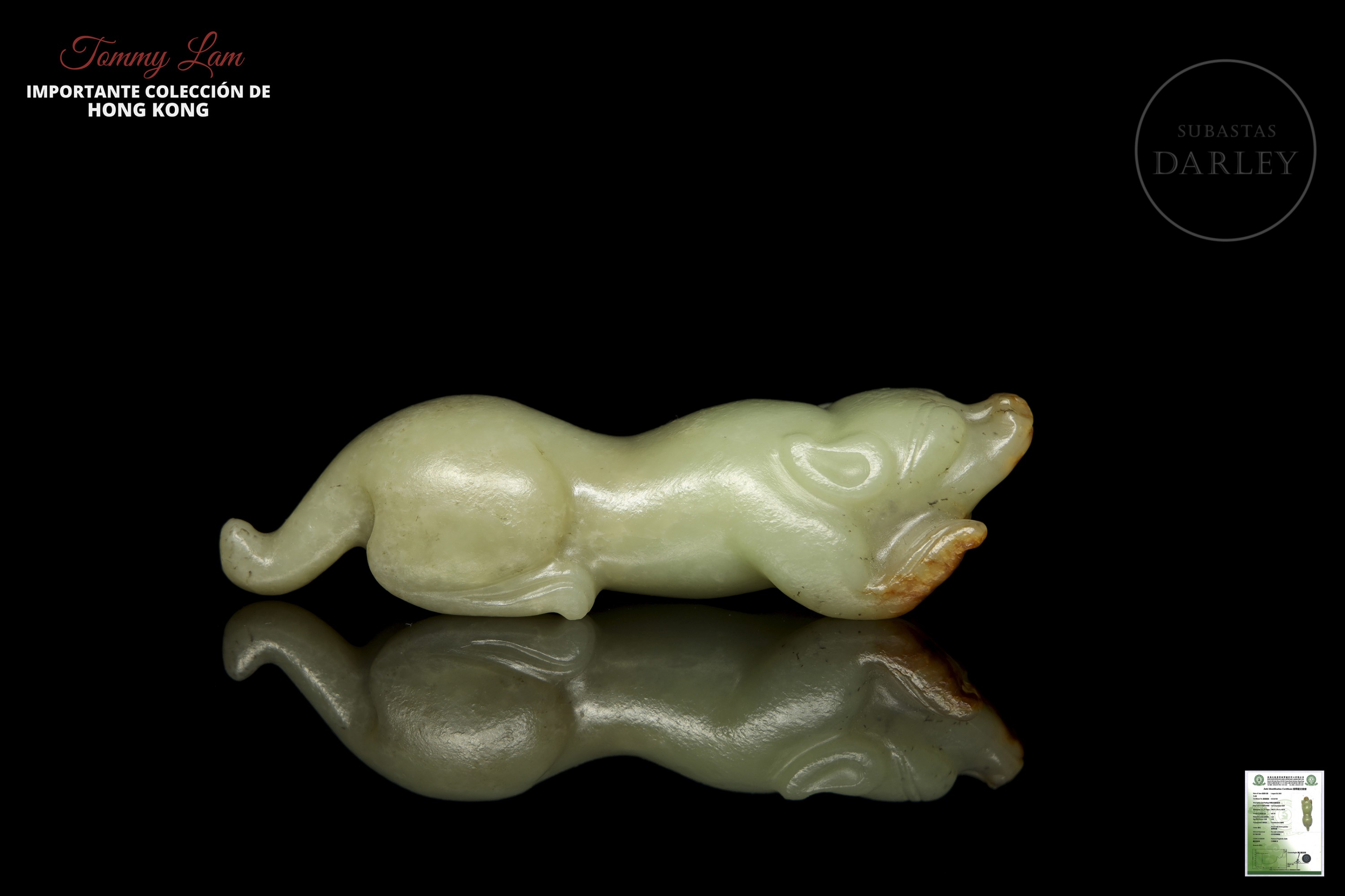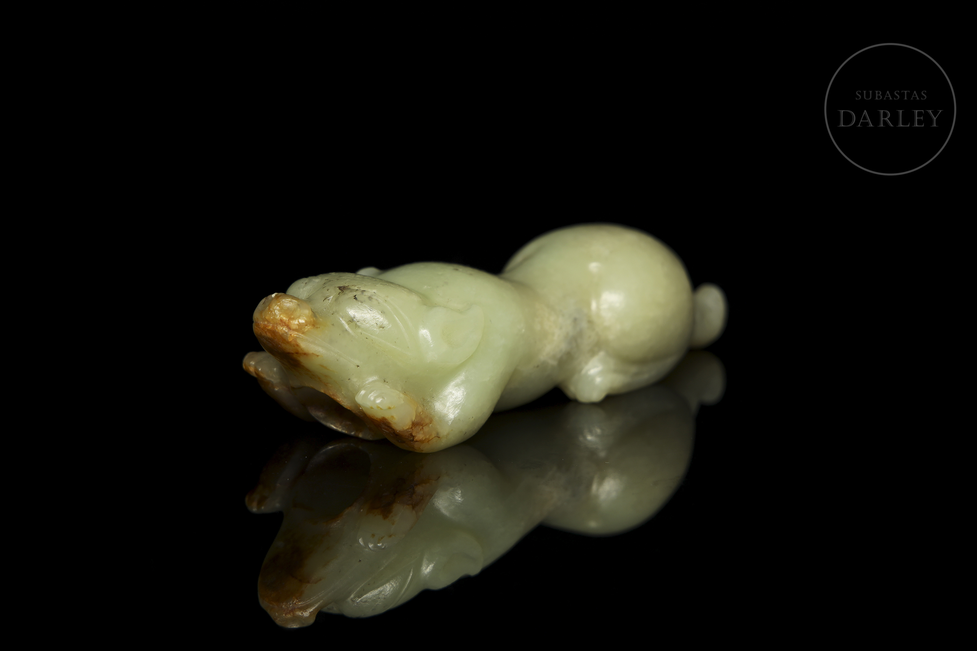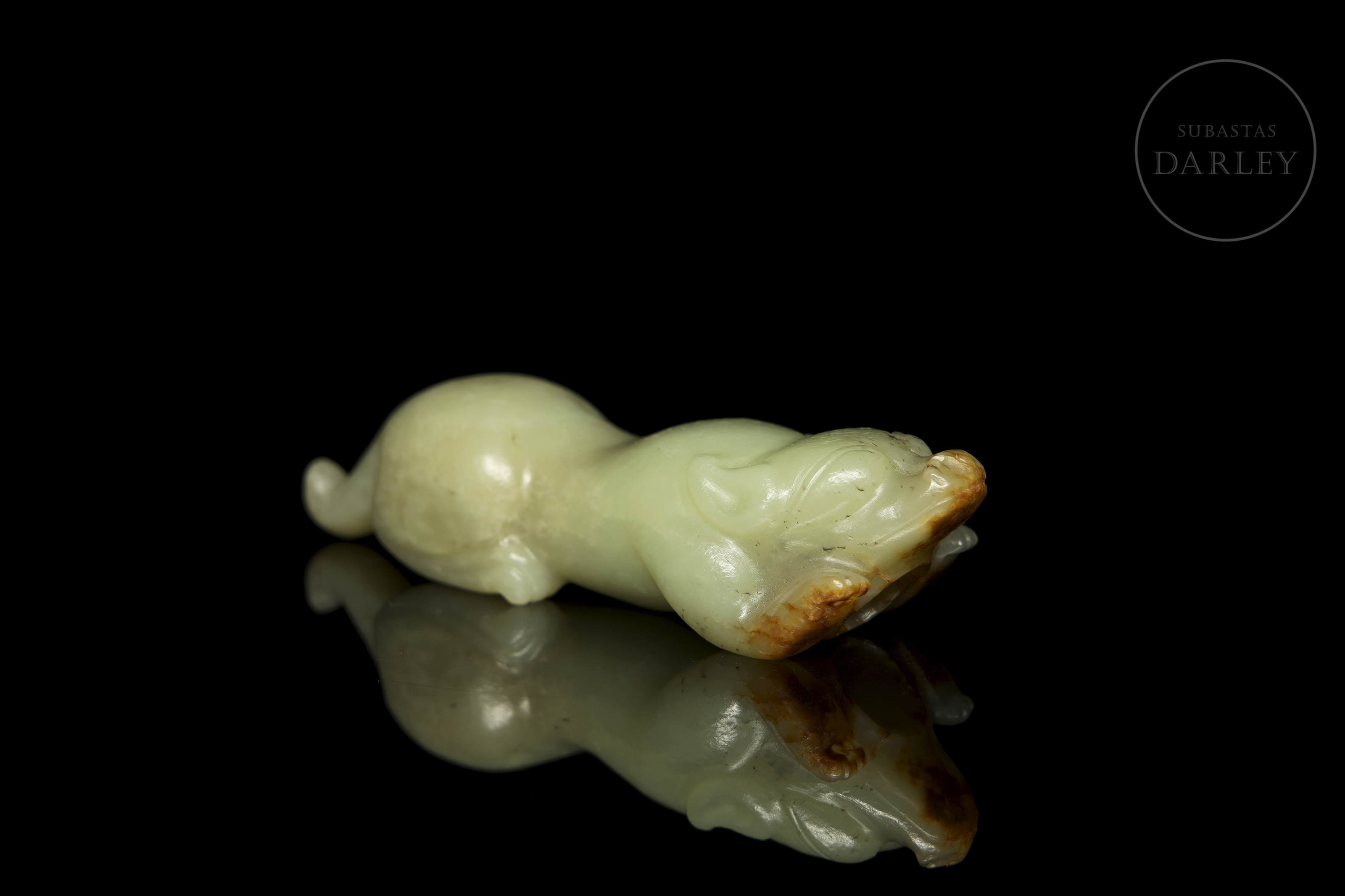 Escultura de bulto redondo, tallada en jade de un suave tono verde celadón. Representa un perro en posición de descanso, con el cuerpo alargado y la cabeza apoyada sobre las patas delanteras. Muestra áreas de pátina en tonos marrones rojizos y ocres concentradas en el hocico y la zona ventral. Con una perforación en la boca para su suspensión. Cultura Hongshan (c. 4700-2900 a.C.).