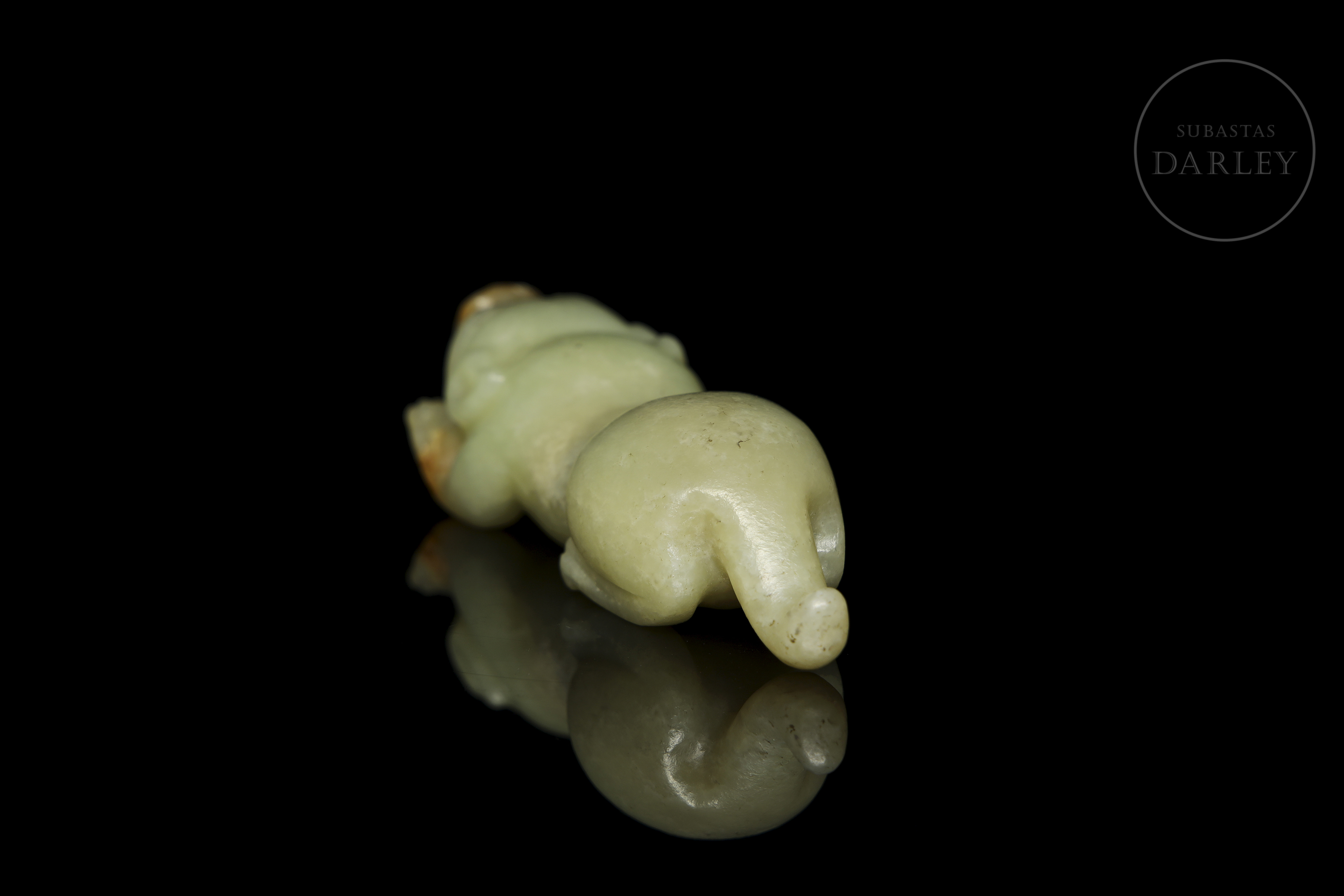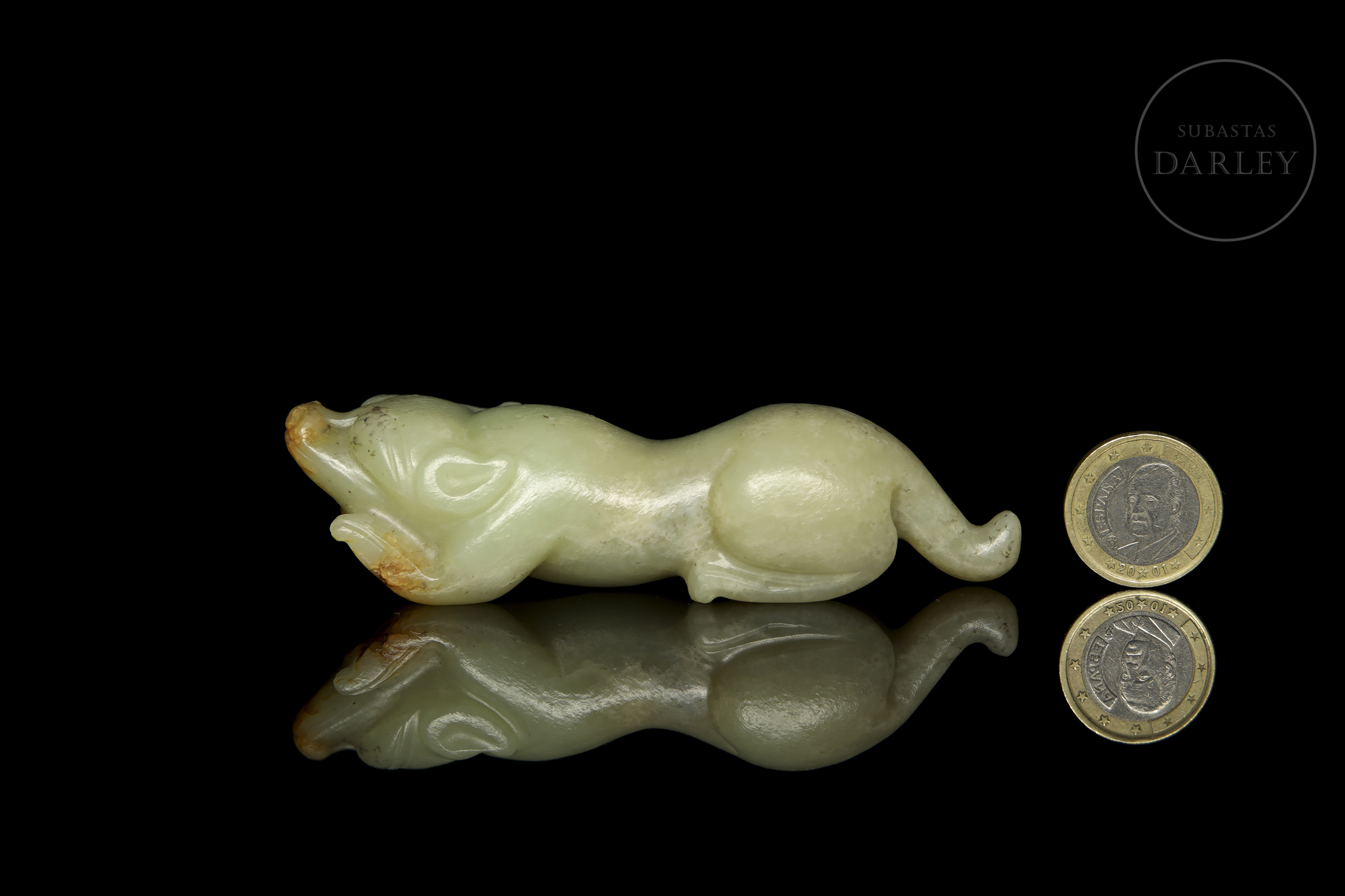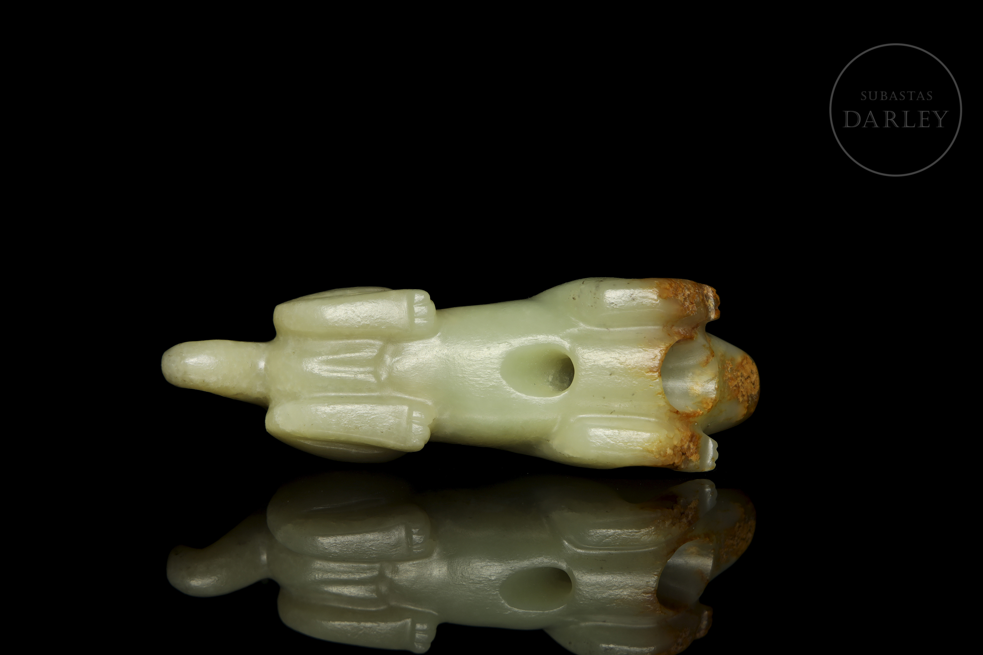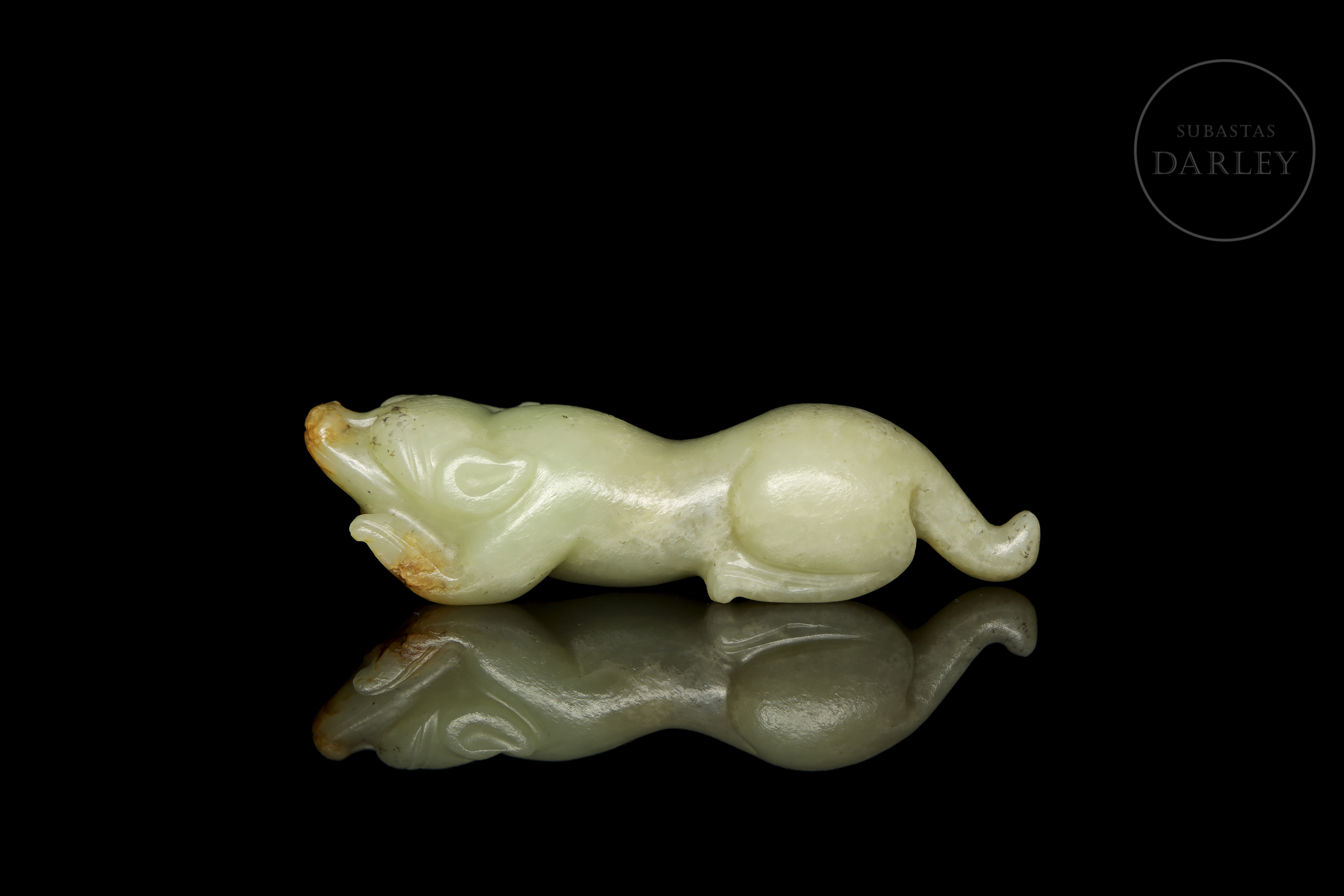 Escultura de bulto redondo, tallada en jade de un suave tono verde celadón. Representa un perro en posición de descanso, con el cuerpo alargado y la cabeza apoyada sobre las patas delanteras. Muestra áreas de pátina en tonos marrones rojizos y ocres concentradas en el hocico y la zona ventral. Con una perforación en la boca para su suspensión. Cultura Hongshan (c. 4700-2900 a.C.).