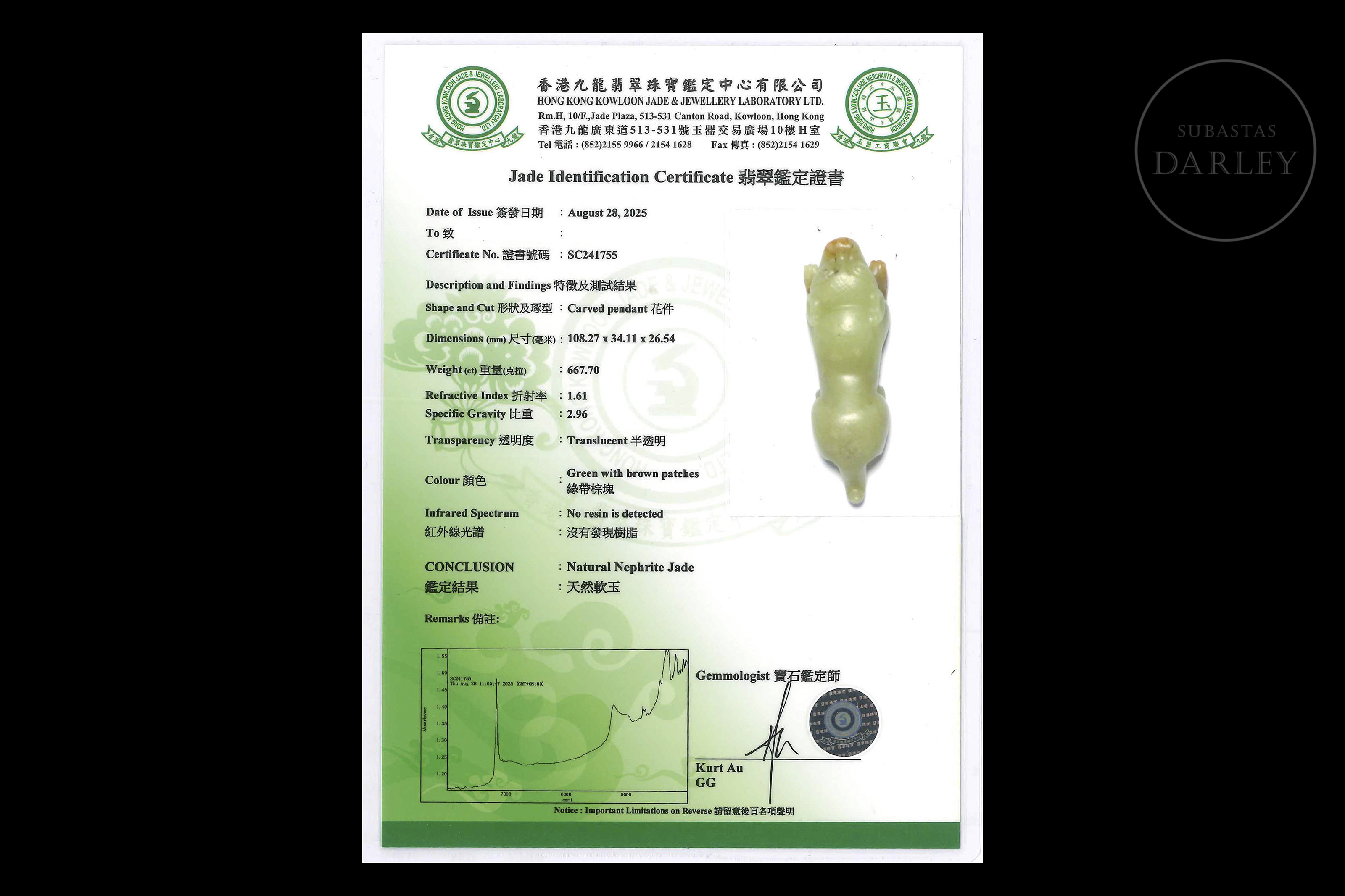 La pieza se acompaña de un certificado gemológico emitido por Hong Kong Kowloon Jade & Jewellery Laboratory LTD en el año 2025. SC241755.
