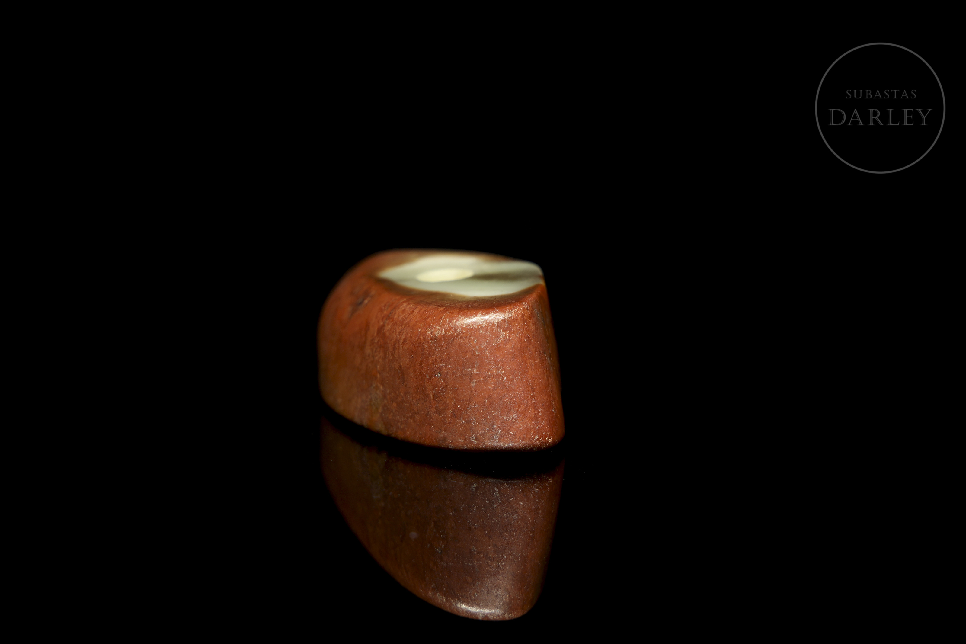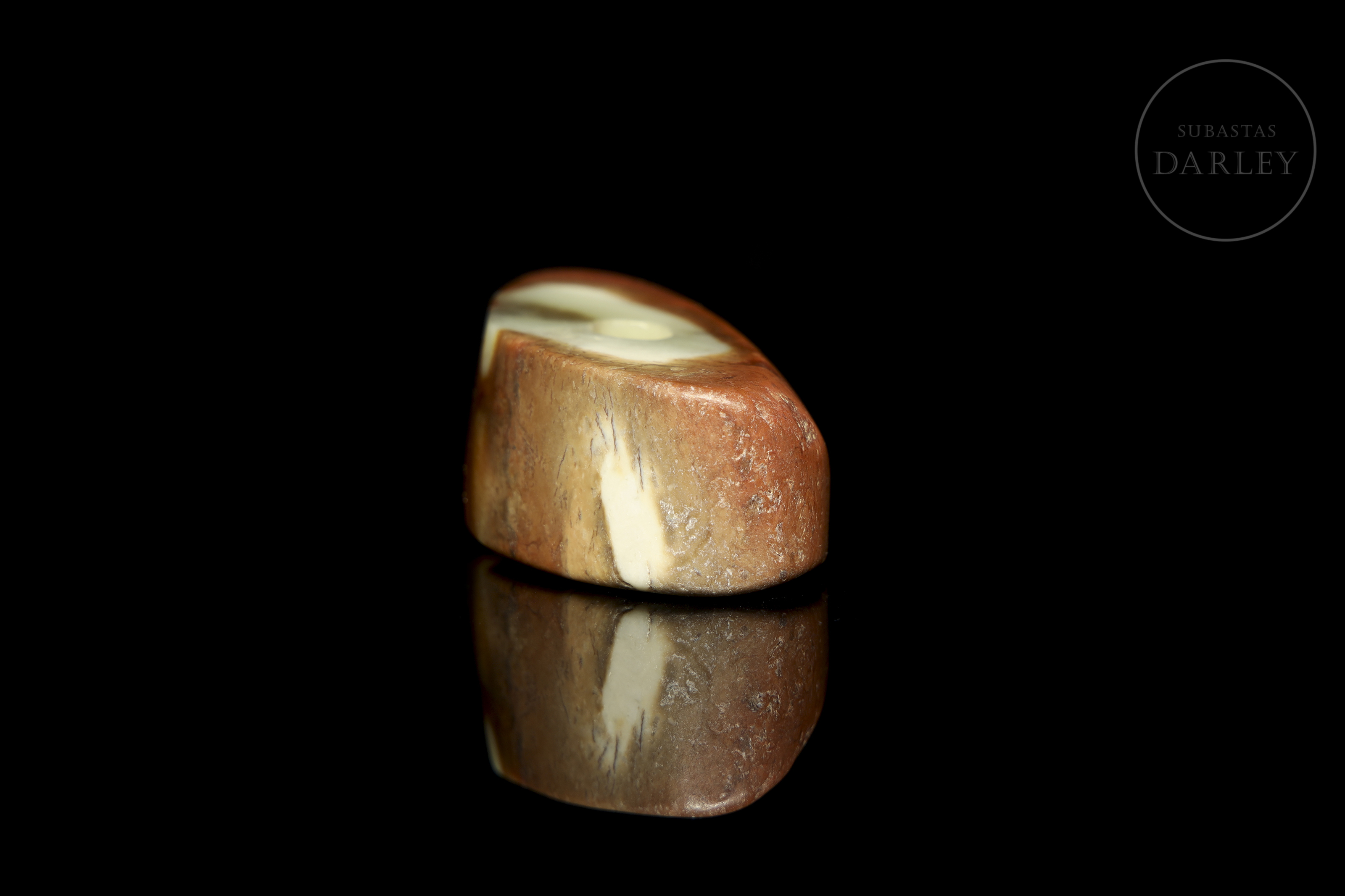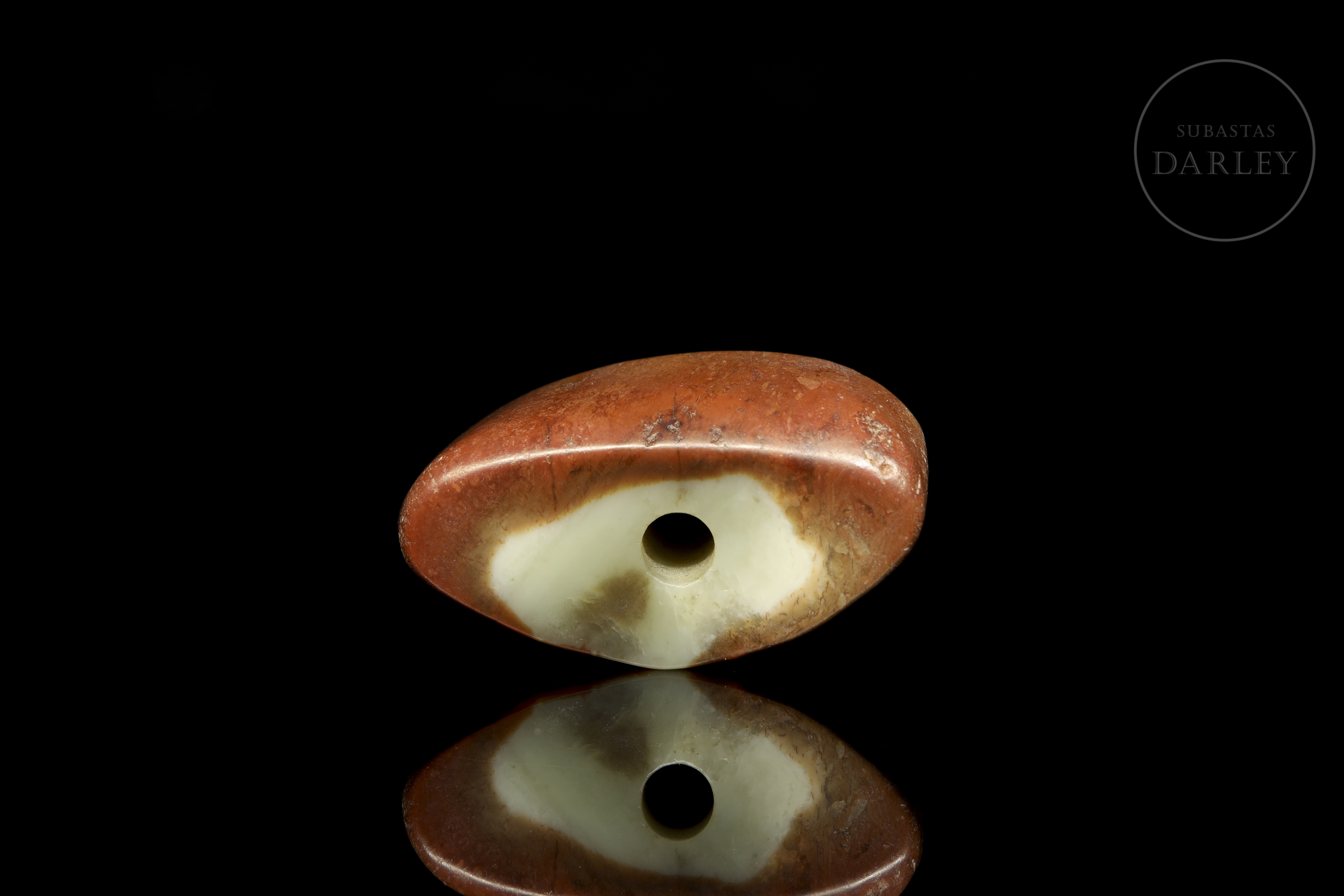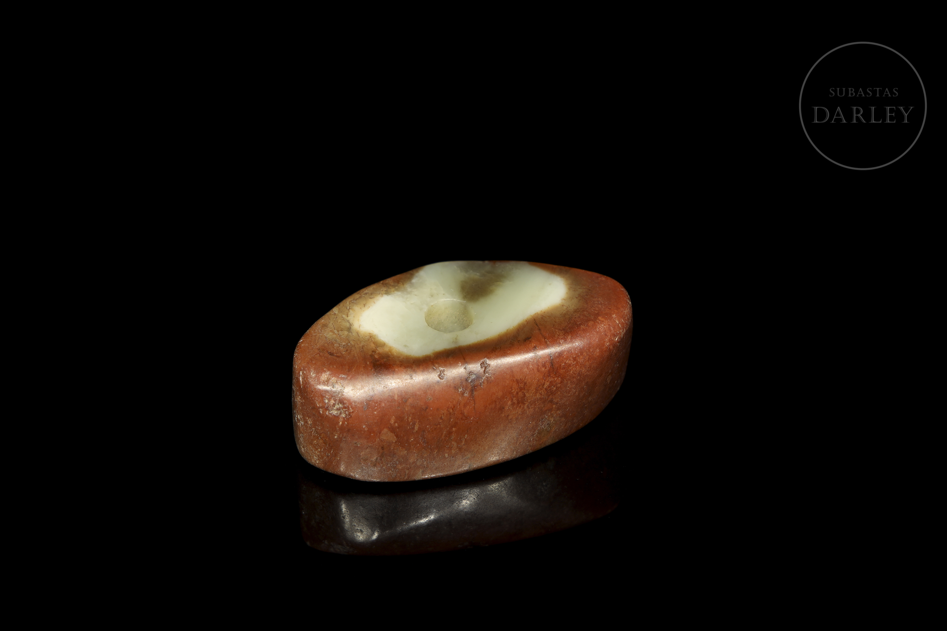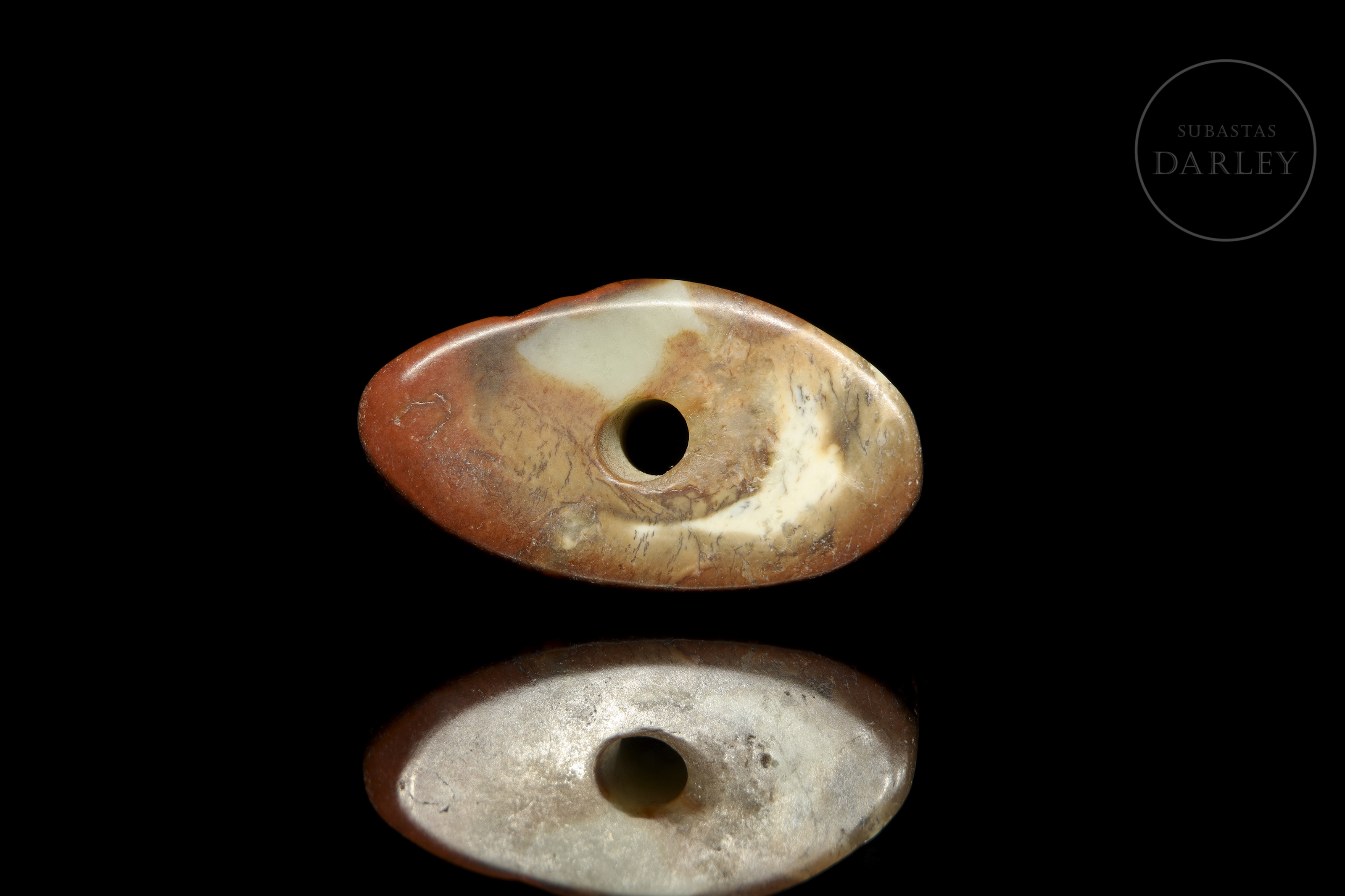 Colgante de jade tallado de tono pálido con áreas de color marrón rojizo que cubre la mayor parte de su superficie. La pieza posee forma de pentágono aplanado, con una perforación longitudinal para su suspensión. Cultura Hongshan (aprox. 4000–3000 a.C.) o posterior.