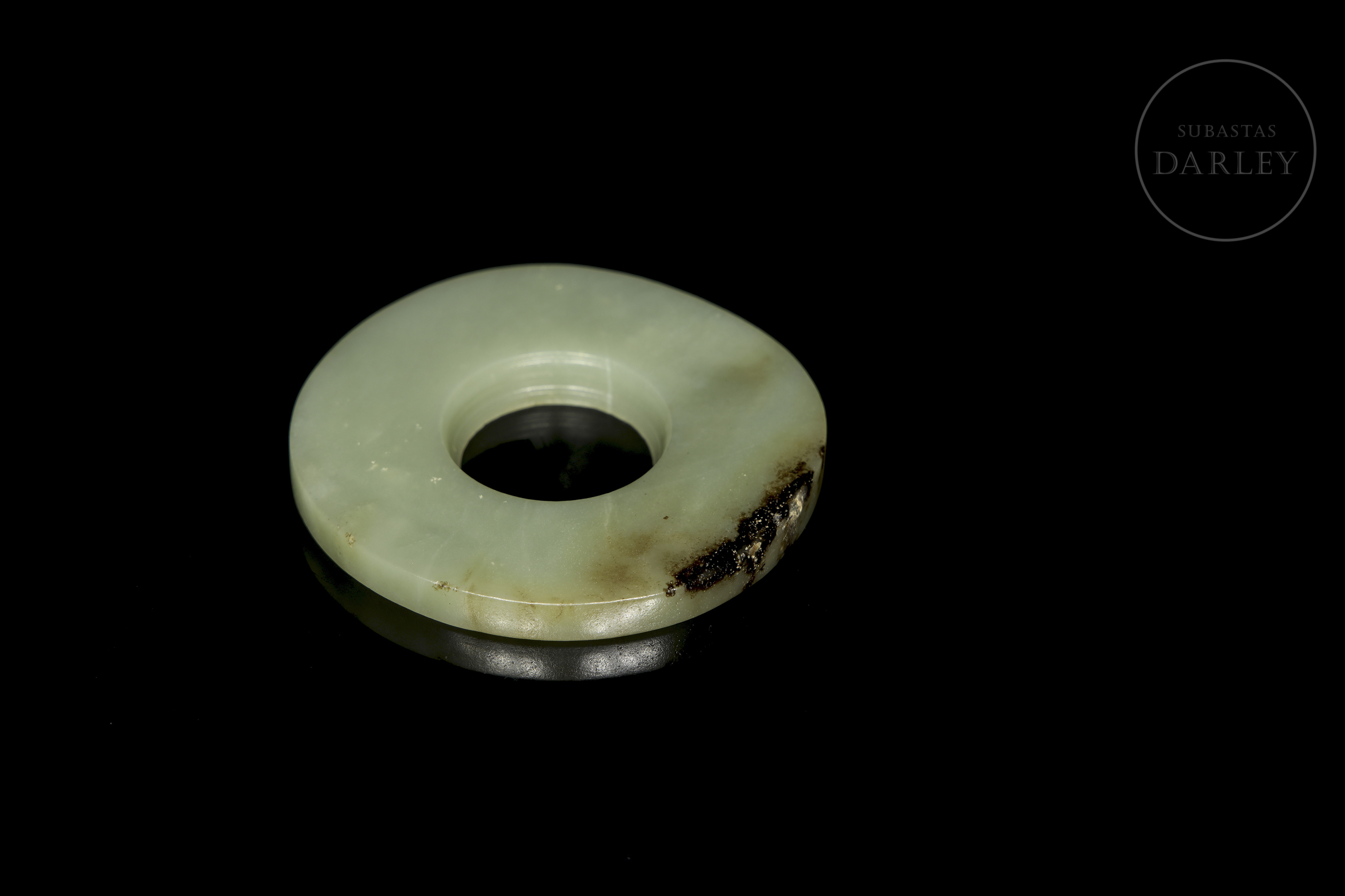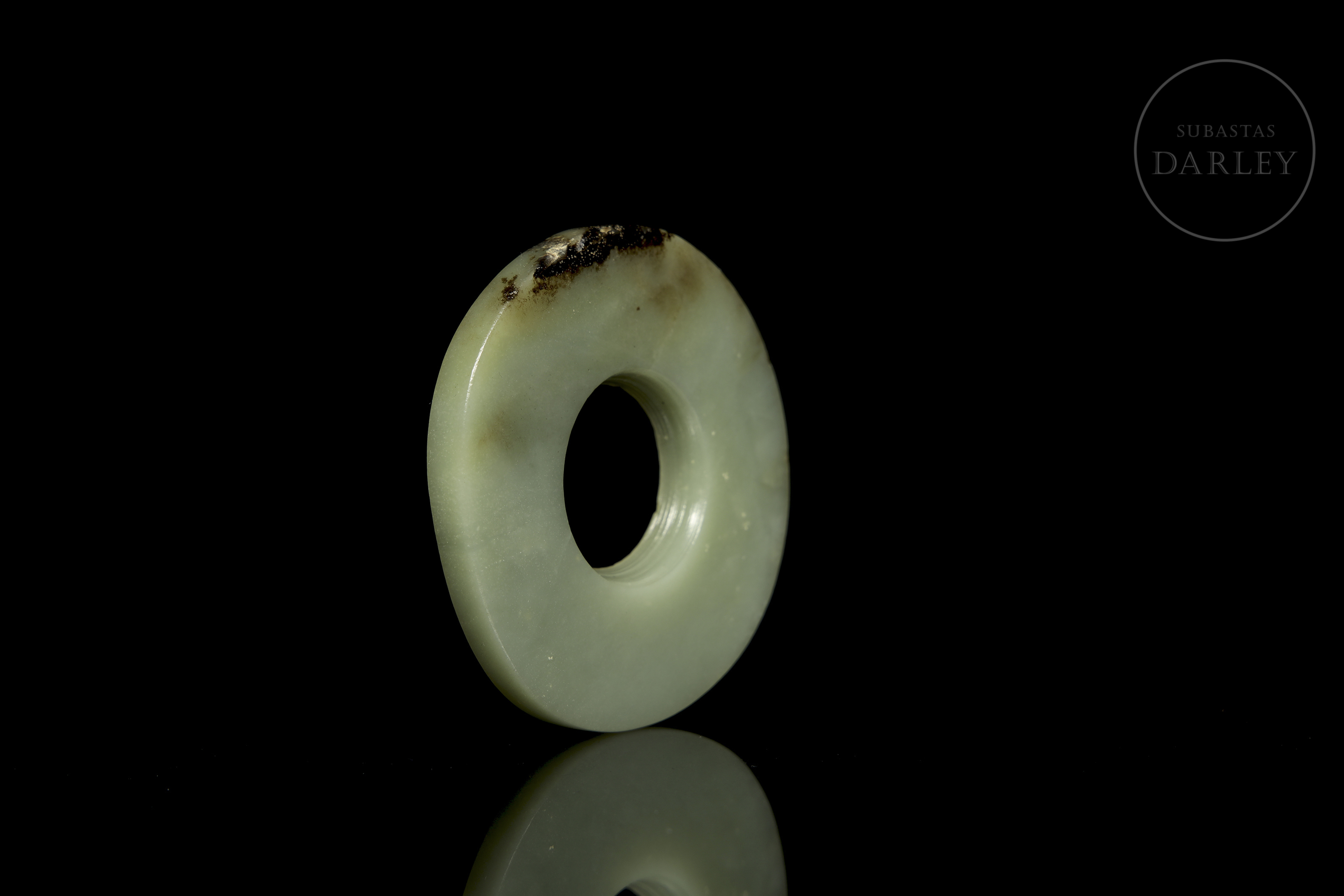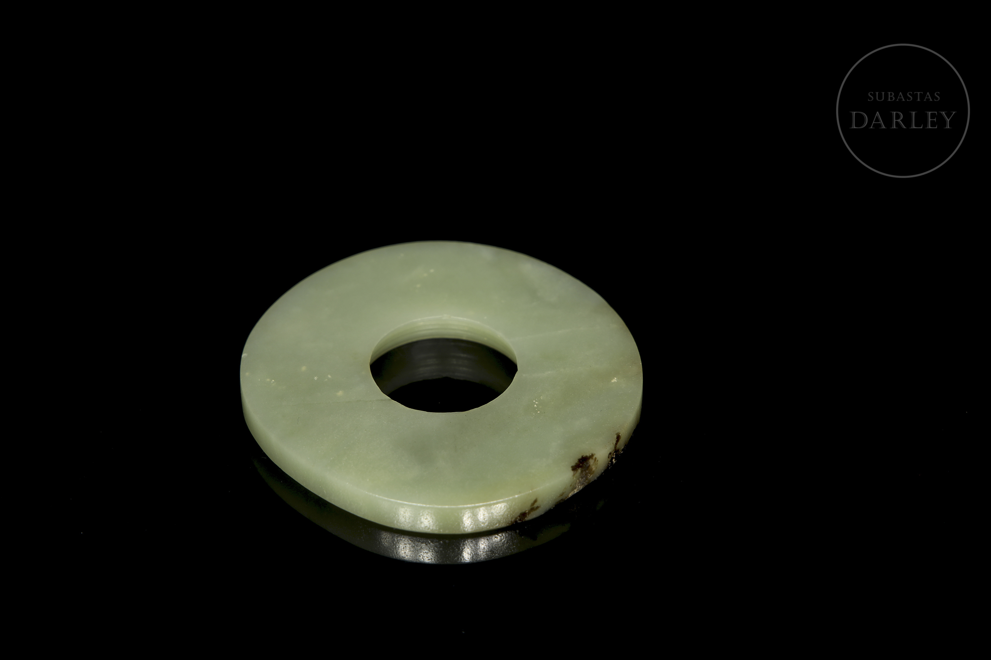 Colgante de jade, de perfil plano y forma circular. La pieza se caracteriza por su estética purista y minimalista, con una superficie exterior e interior completamente lisas. El jade base es de un tono verde celadón pálido. La pieza muestra pátina de alteración natural de color ocre y negro producido por antigüedad. Cultura Qijia (c. 2200-1600 a.C.).