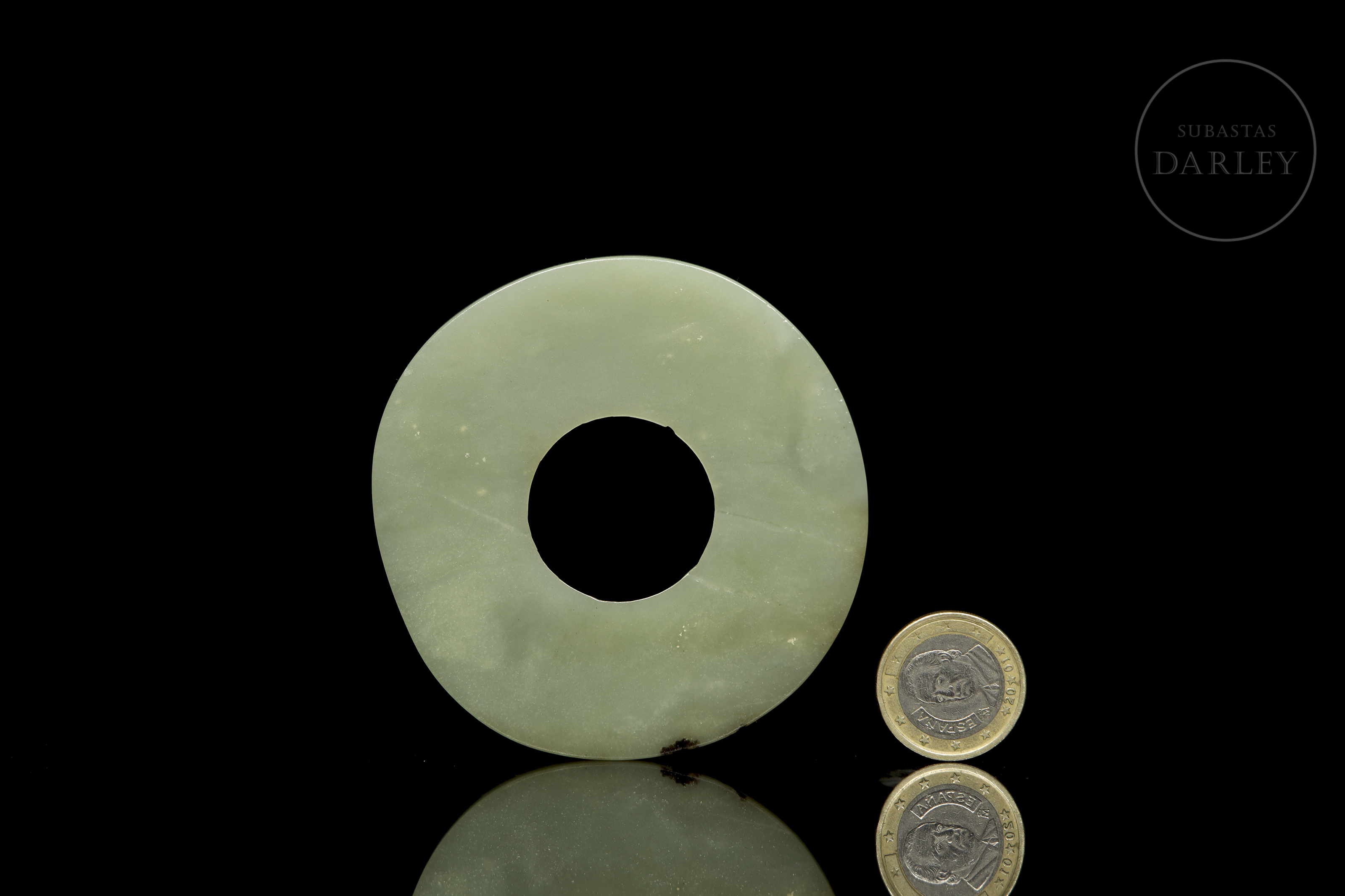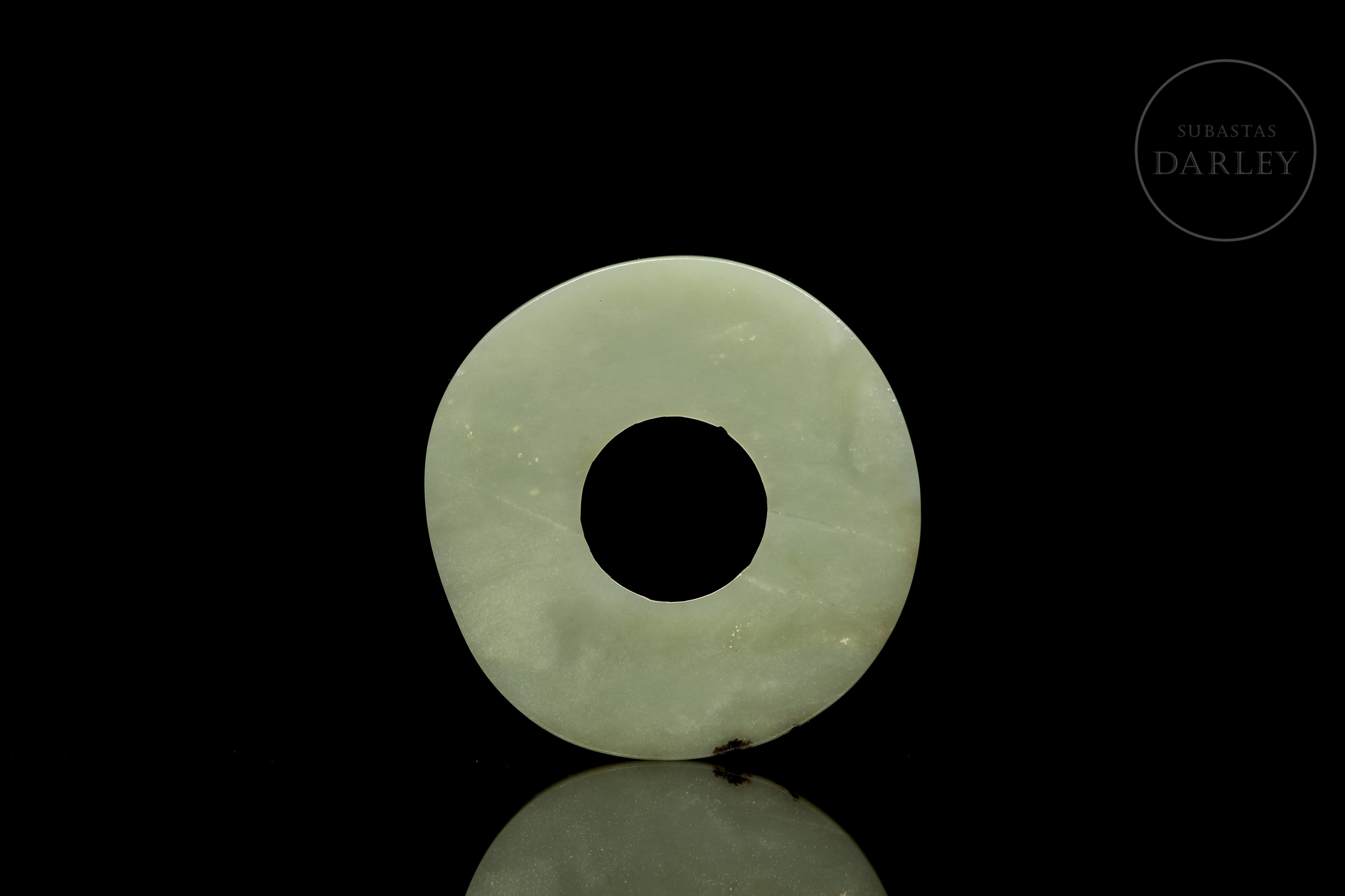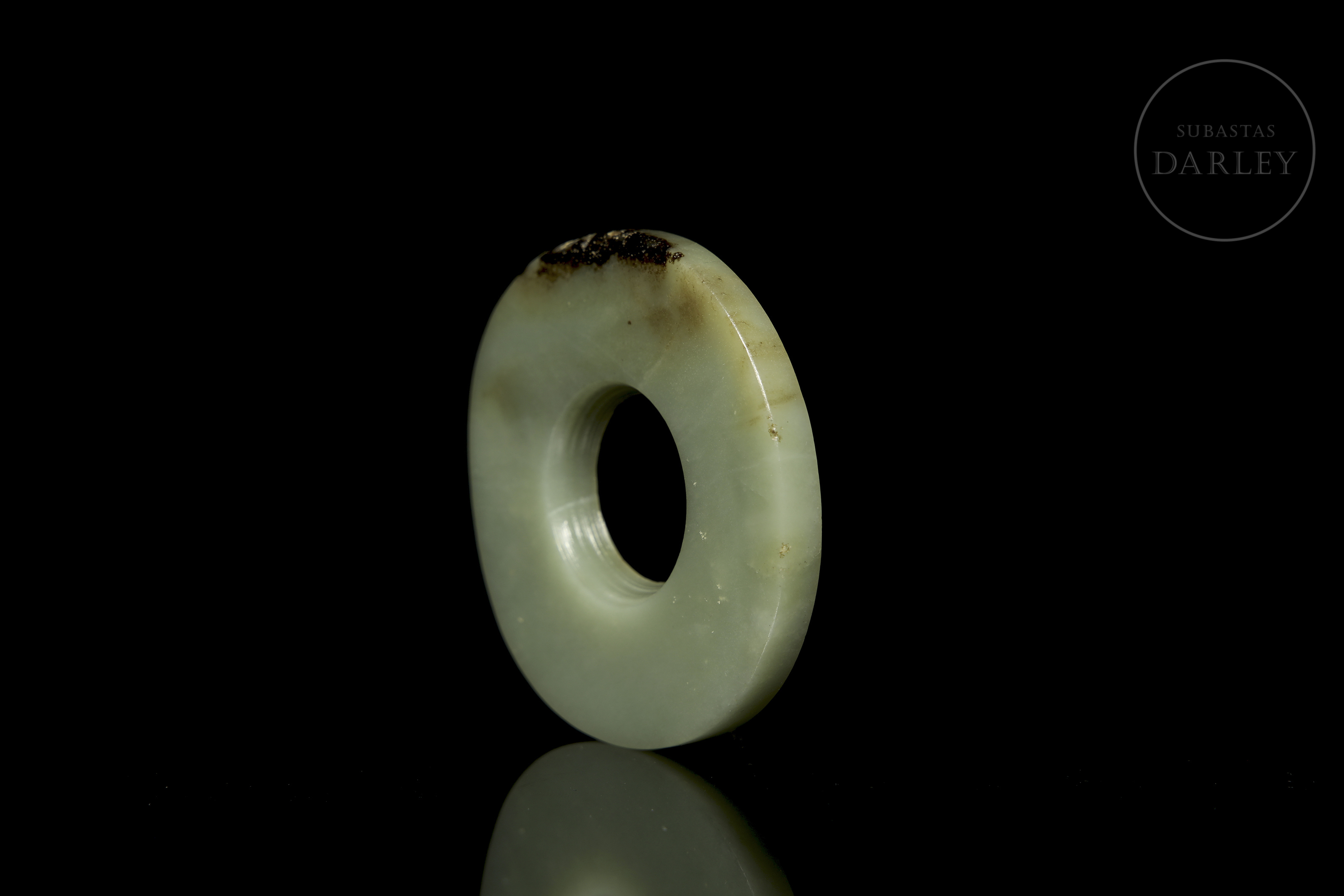 Colgante de jade, de perfil plano y forma circular. La pieza se caracteriza por su estética purista y minimalista, con una superficie exterior e interior completamente lisas. El jade base es de un tono verde celadón pálido. La pieza muestra pátina de alteración natural de color ocre y negro producido por antigüedad. Cultura Qijia (c. 2200-1600 a.C.).