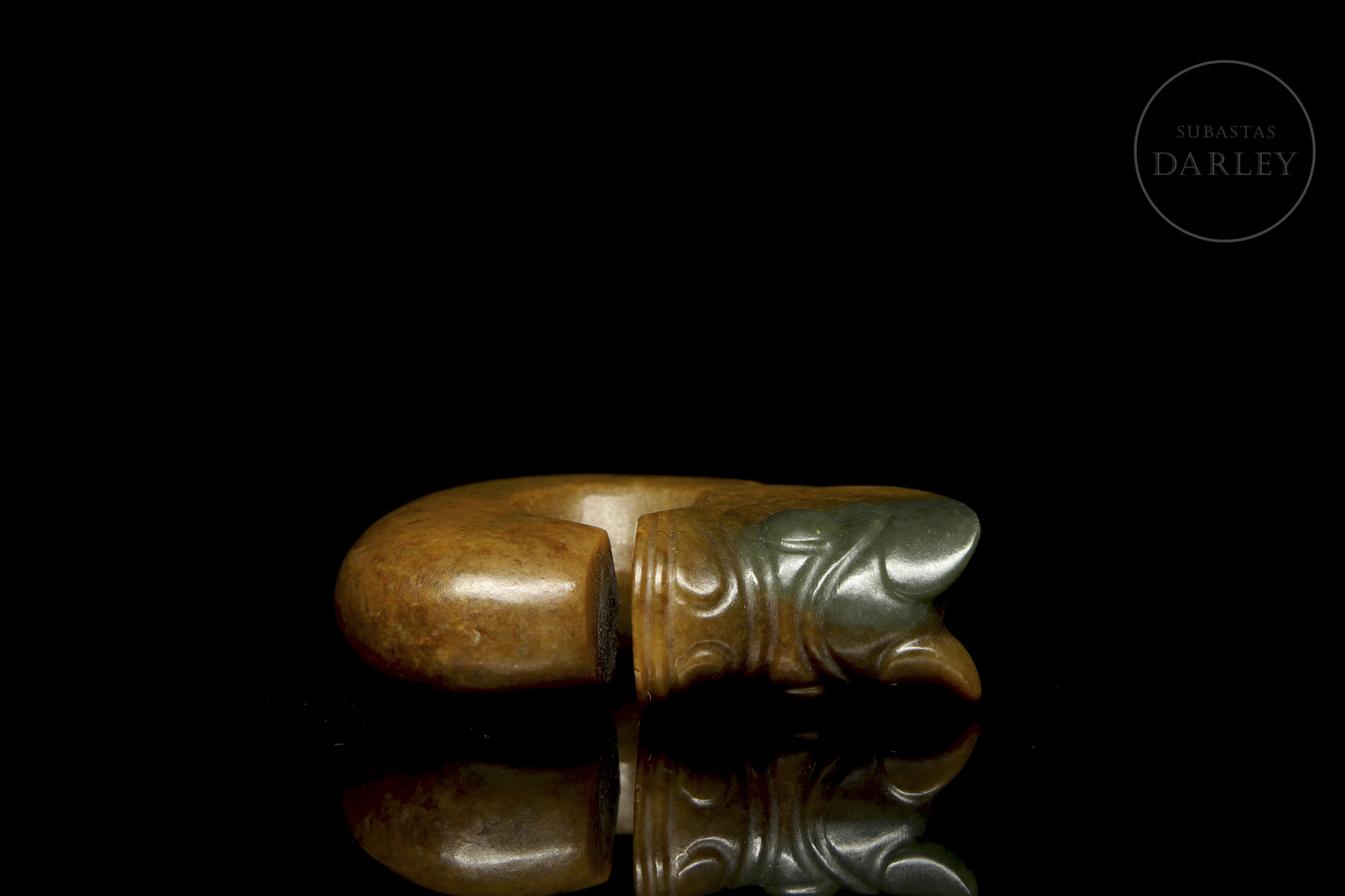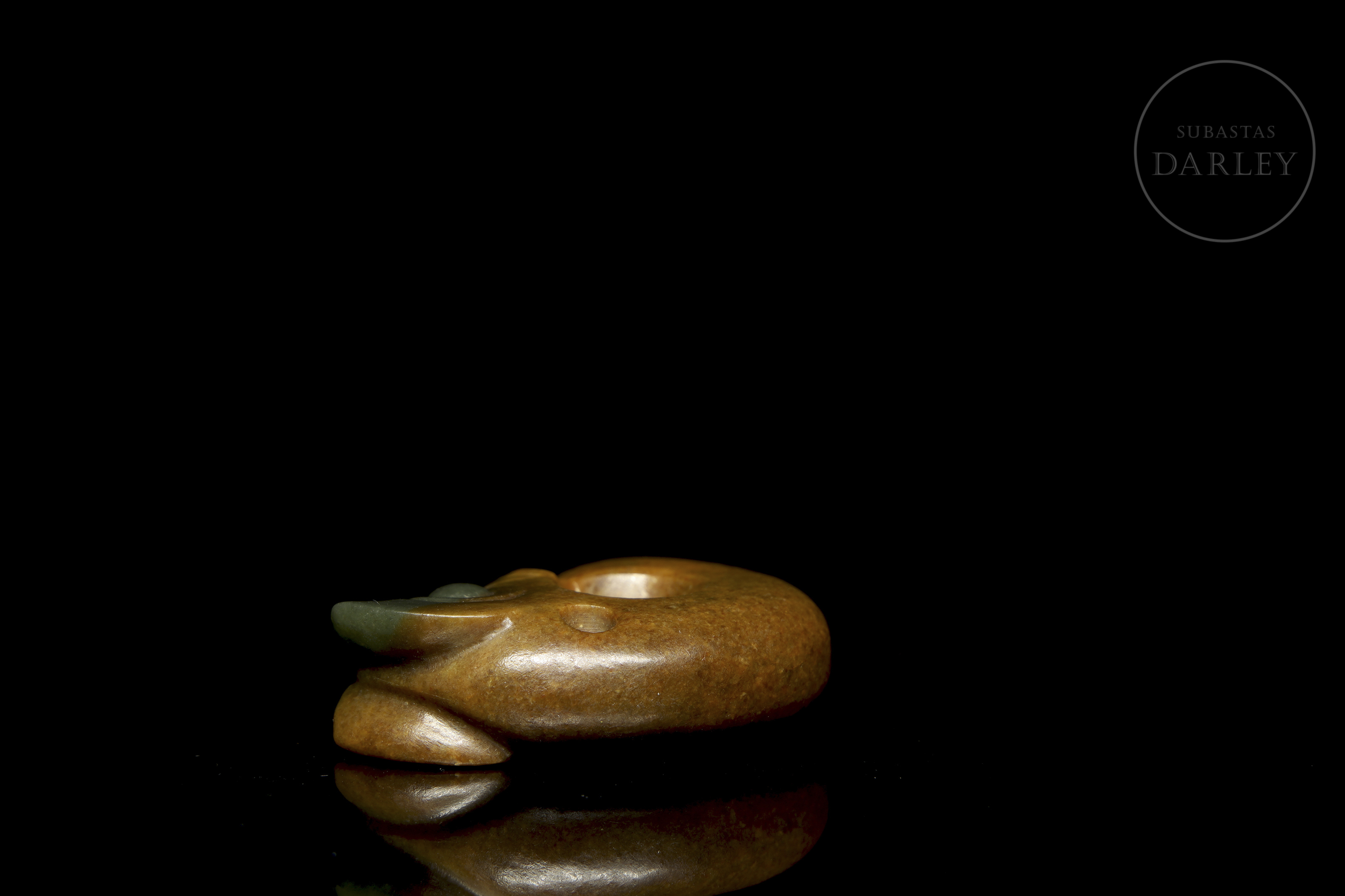 Tallado en forma de "Zhulóng", realizado en jade de tonalidad verde, cubierta por una extensa pátina ocre rojiza. La pieza presenta forma de "C", con el cuerpo enroscado y hocico separado de la cola. Destaca la talla de la cabeza, con grandes ojos circulares y un hocico arrugado. Posee una perforación para su suspensión. Cultura Hongshan (aprox. 4700–2900 a.C.) o posterior.