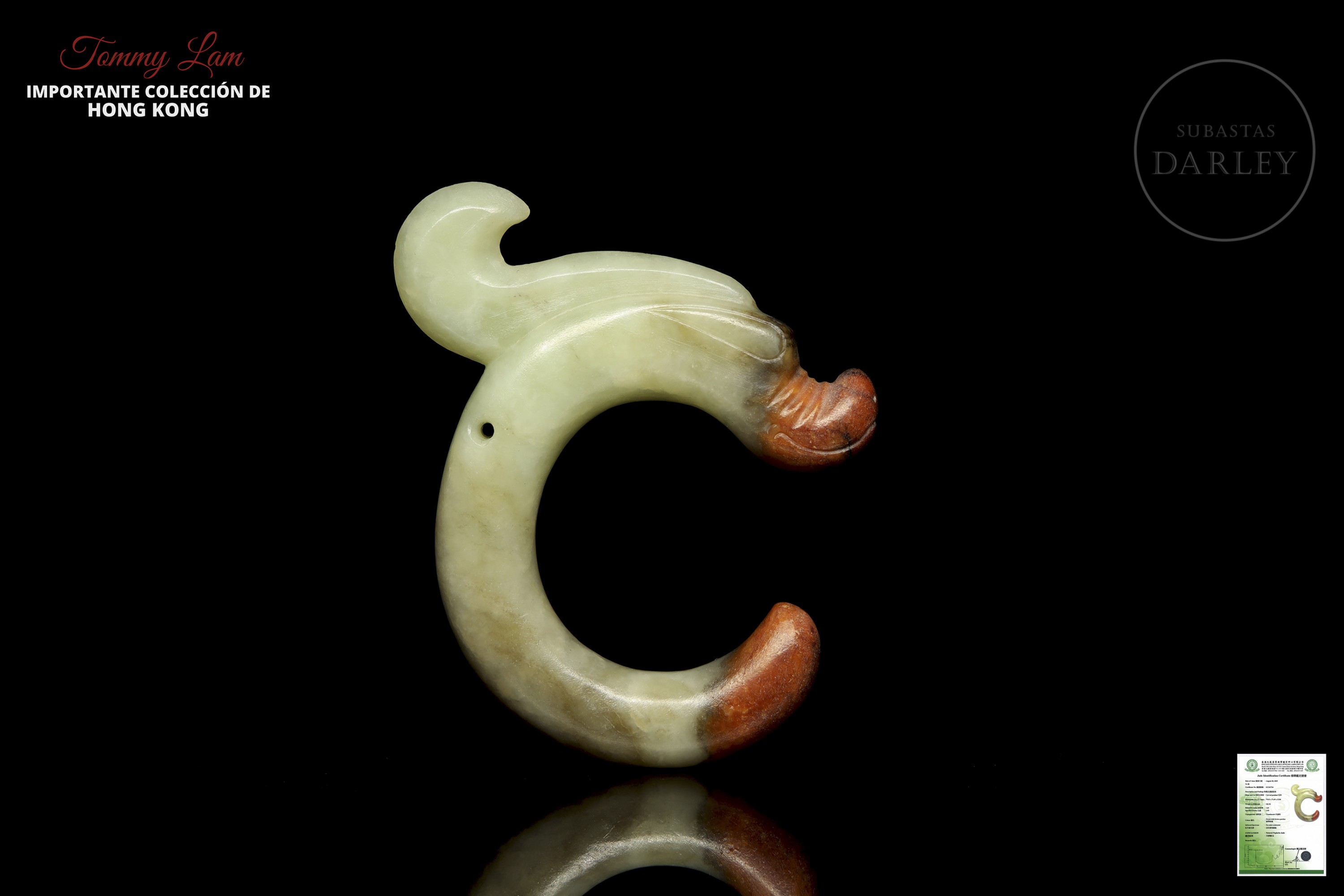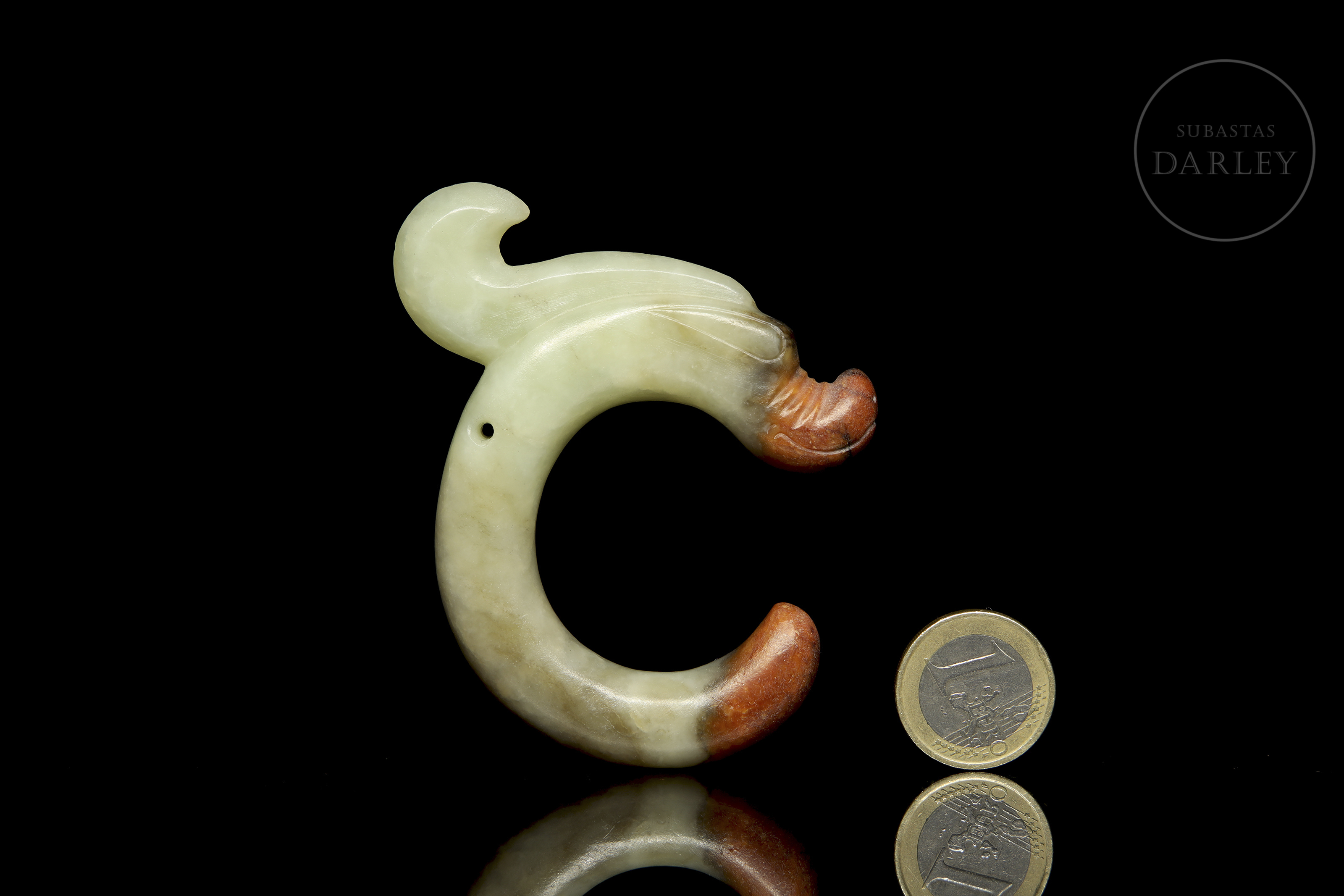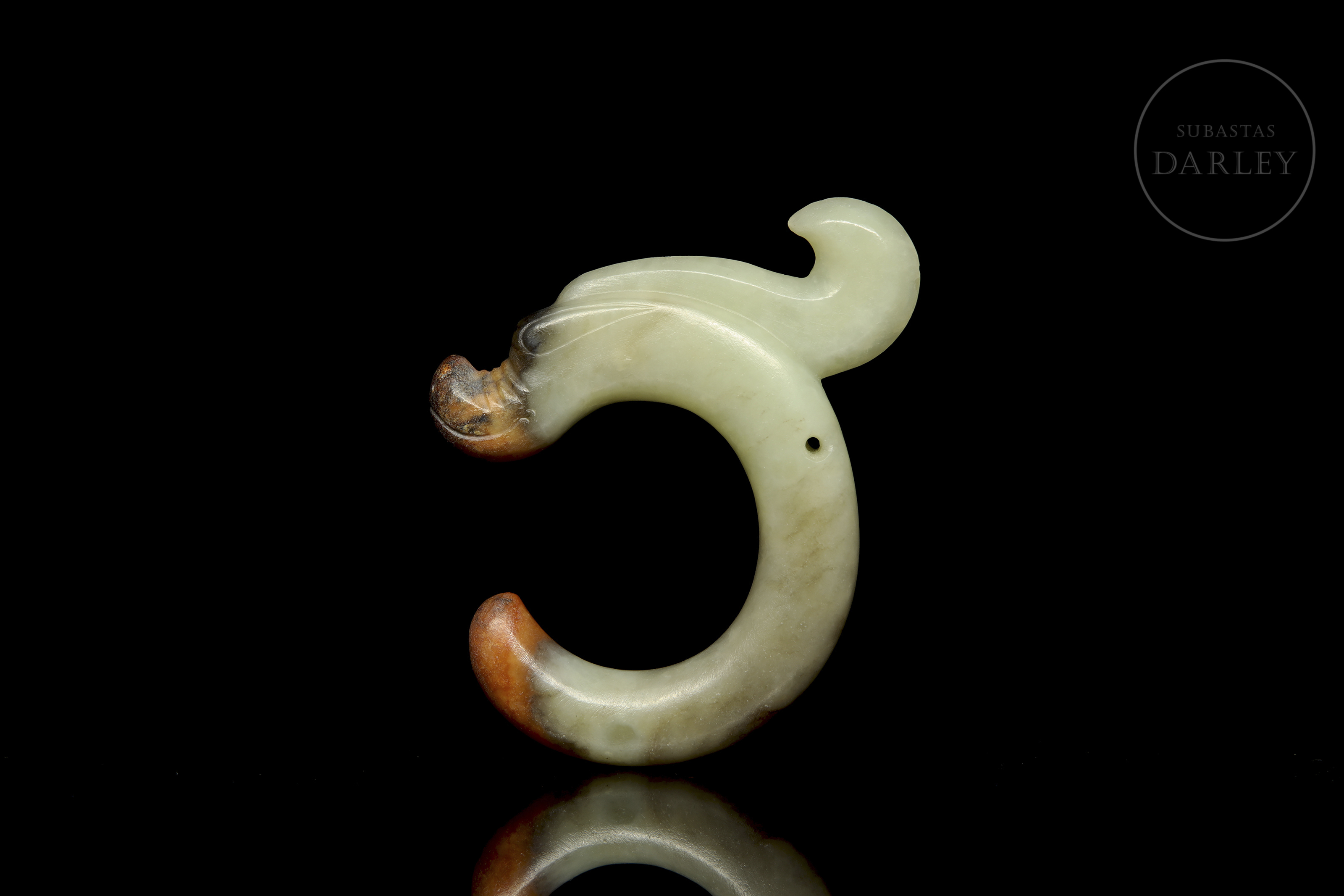 Jade tallado de tono verde celadón pálido. Representa al "Zhulong" (o cerdo-dragón), caracterizado por su cuerpo enroscado en forma de "C" y su cabeza con grandes orejas y hocico arrugado. La pieza destaca por el contraste cromático de la pátina marrón rojiza y ocre en el hocico y la punta de la cola. Presenta el característico orificio de suspensión en la parte dorsal. Cultura Hongshan (c. 4700-2900 a.C.)