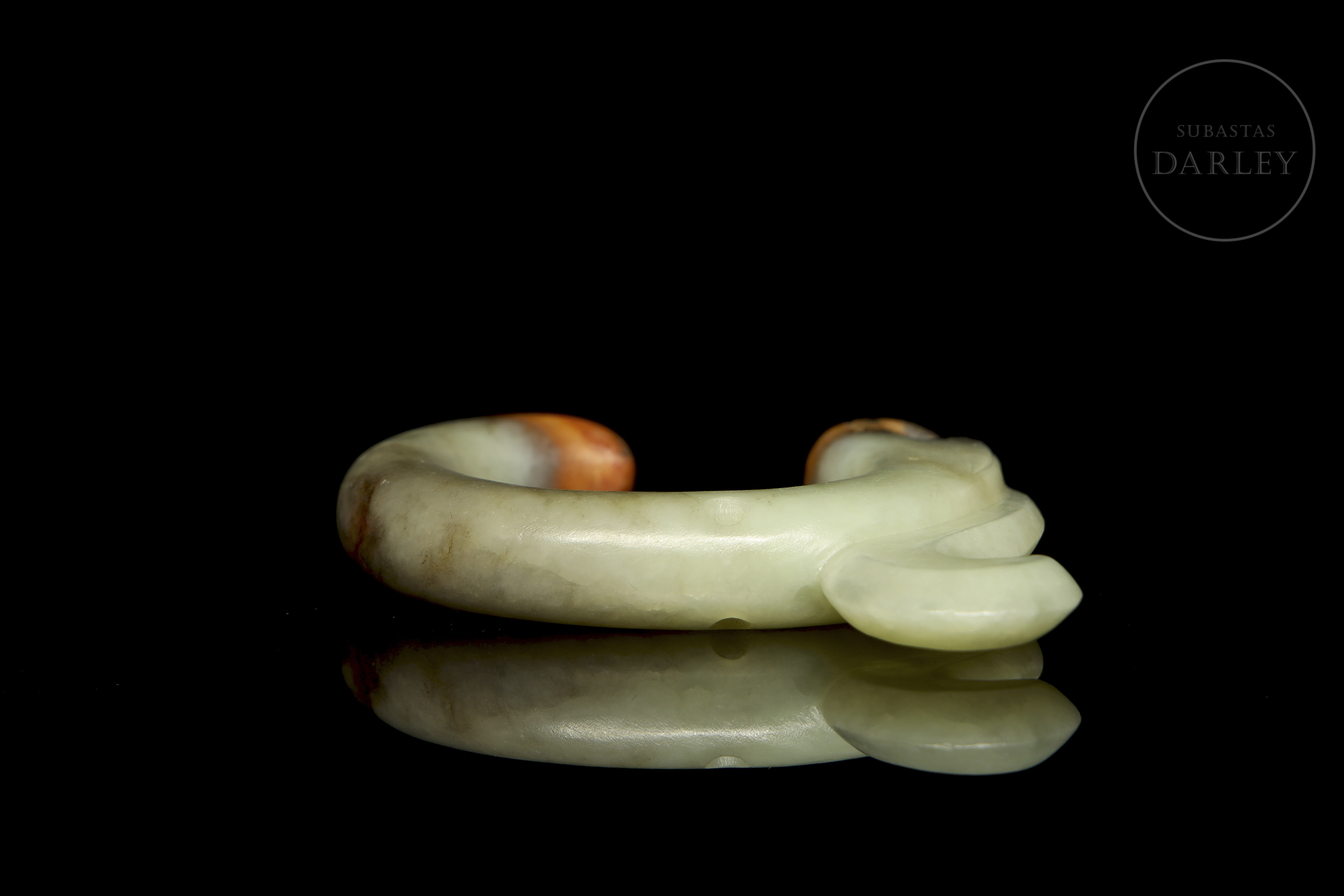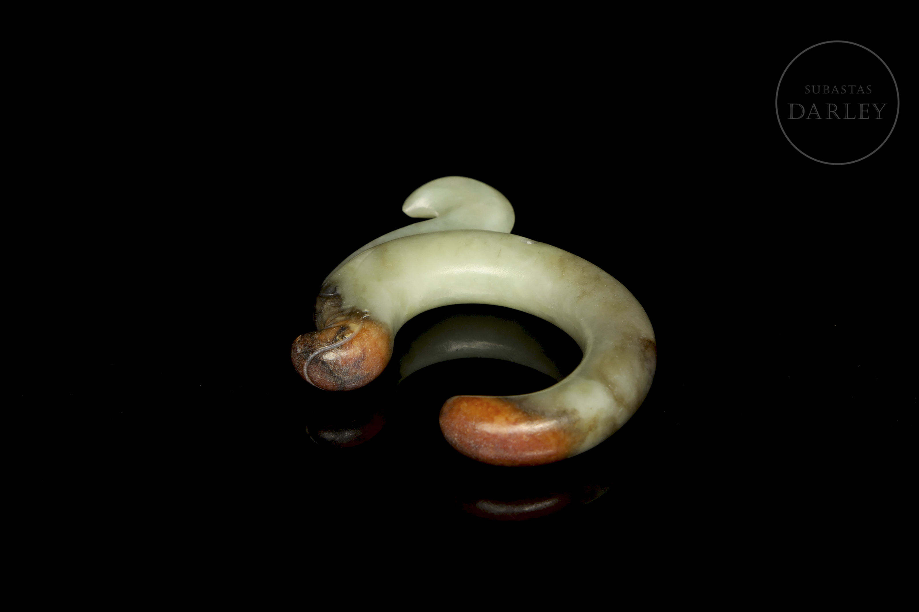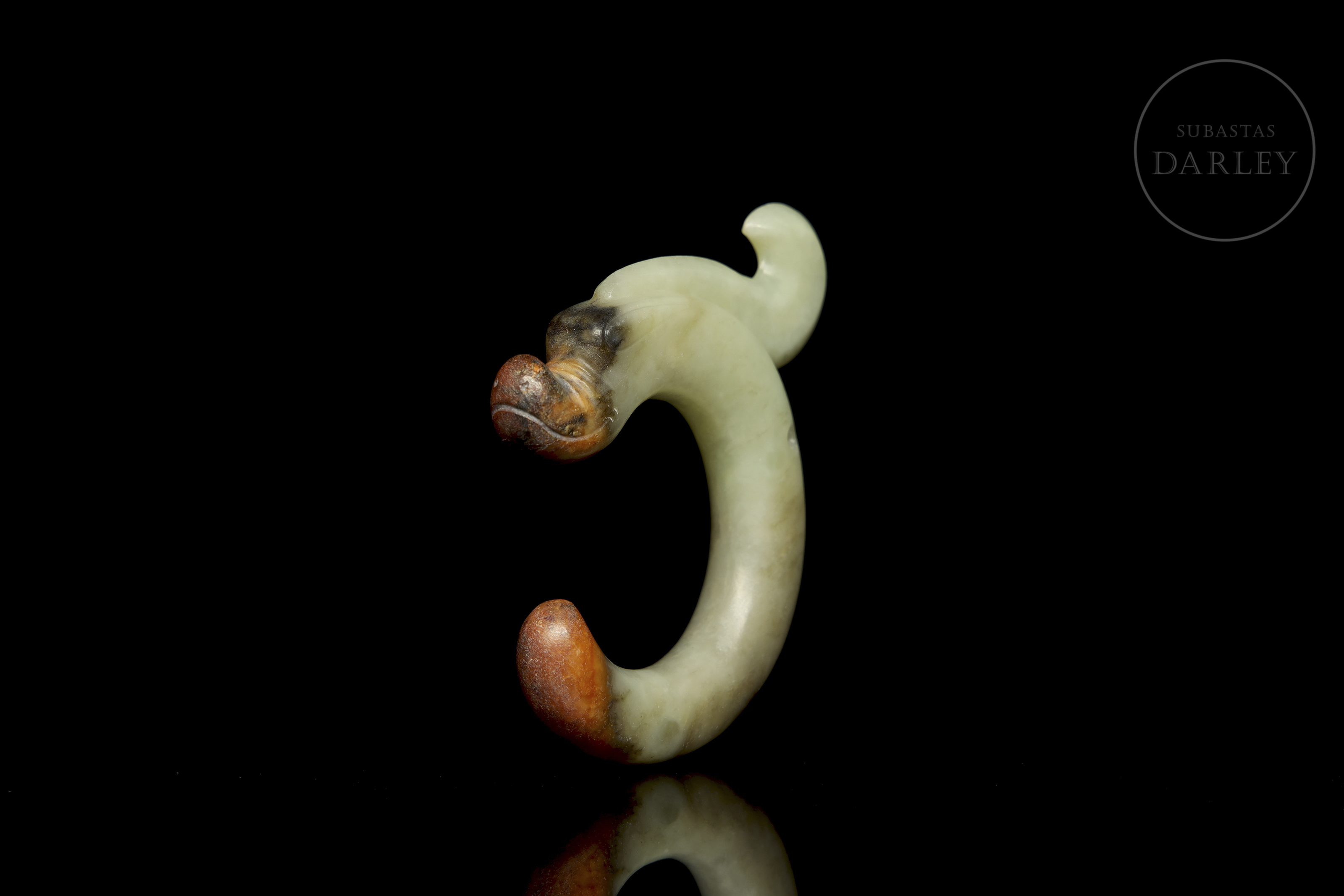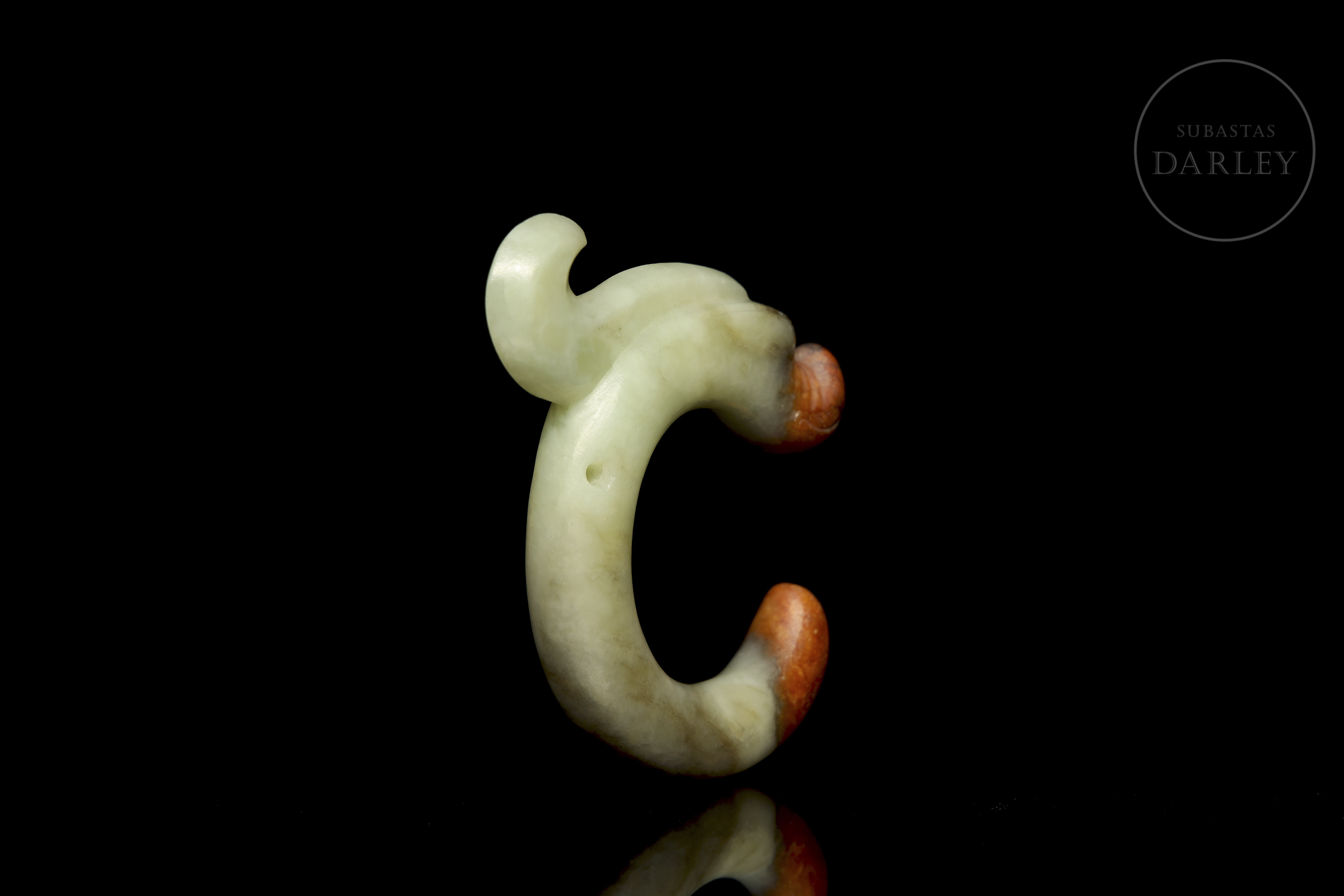 Jade tallado de tono verde celadón pálido. Representa al "Zhulong" (o cerdo-dragón), caracterizado por su cuerpo enroscado en forma de "C" y su cabeza con grandes orejas y hocico arrugado. La pieza destaca por el contraste cromático de la pátina marrón rojiza y ocre en el hocico y la punta de la cola. Presenta el característico orificio de suspensión en la parte dorsal. Cultura Hongshan (c. 4700-2900 a.C.)