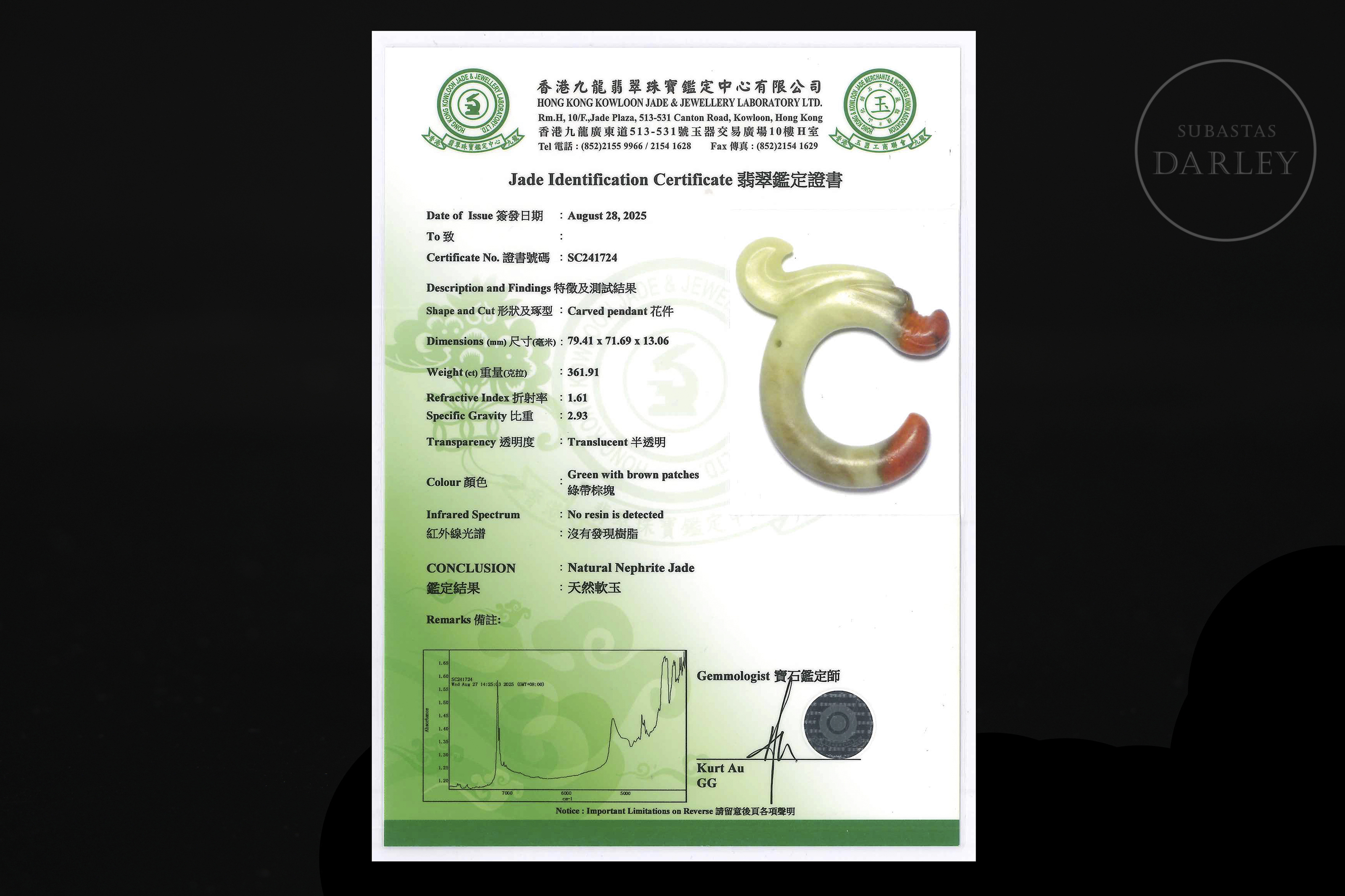 La pieza se acompaña de un certificado gemológico emitido por Hong Kong Kowloon Jade & Jewellery Laboratory LTD en el año 2025. SC241723.