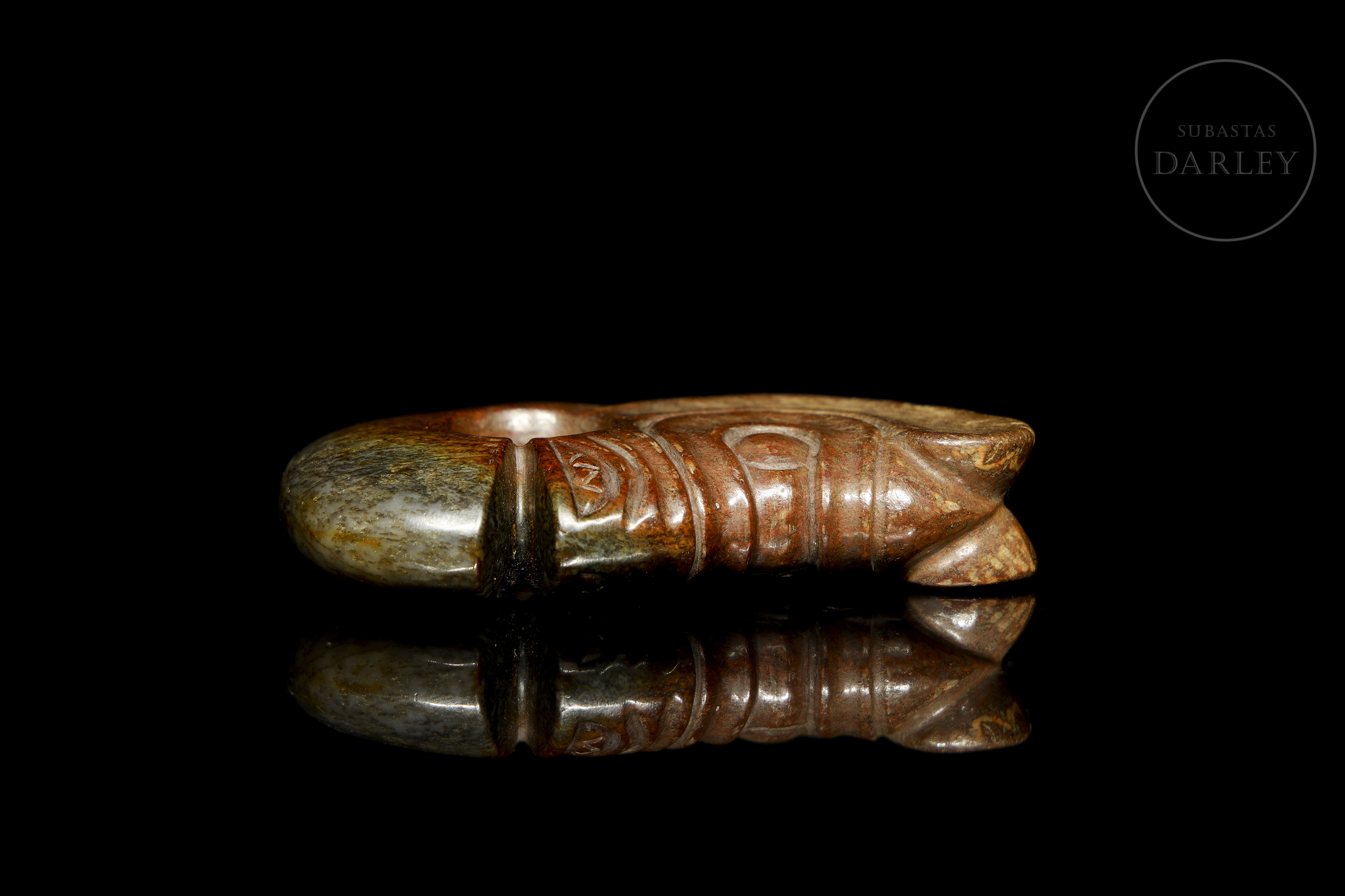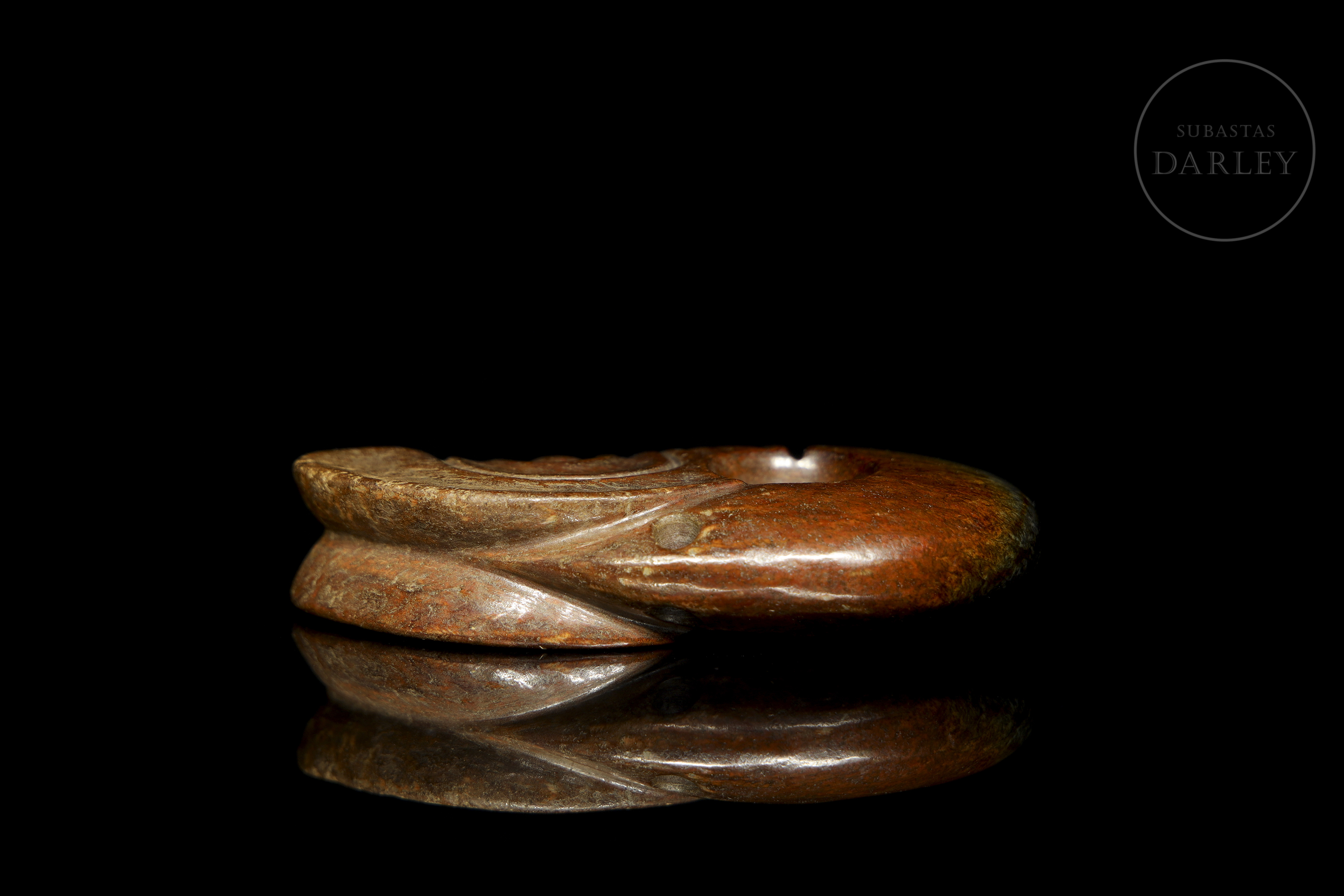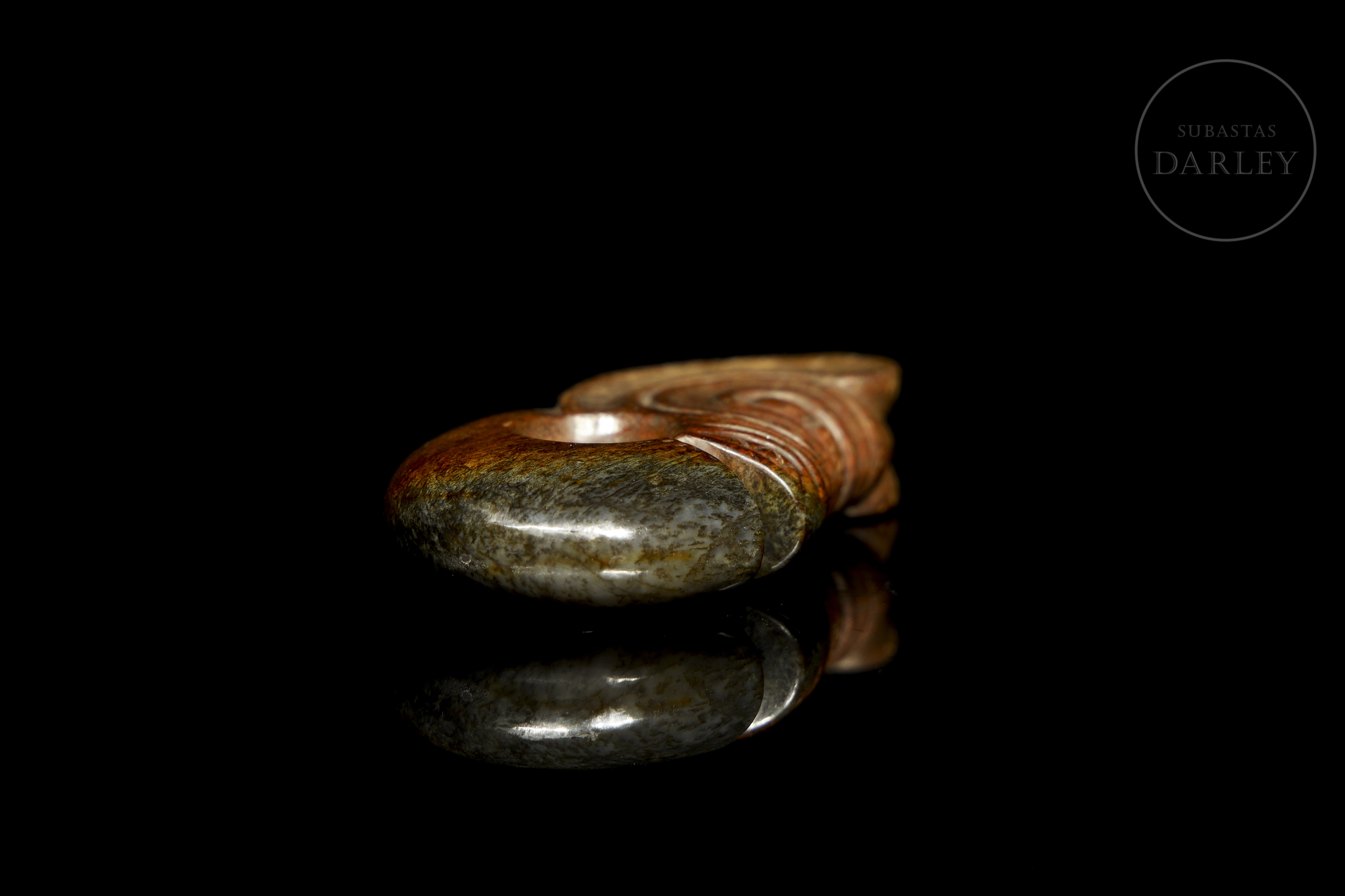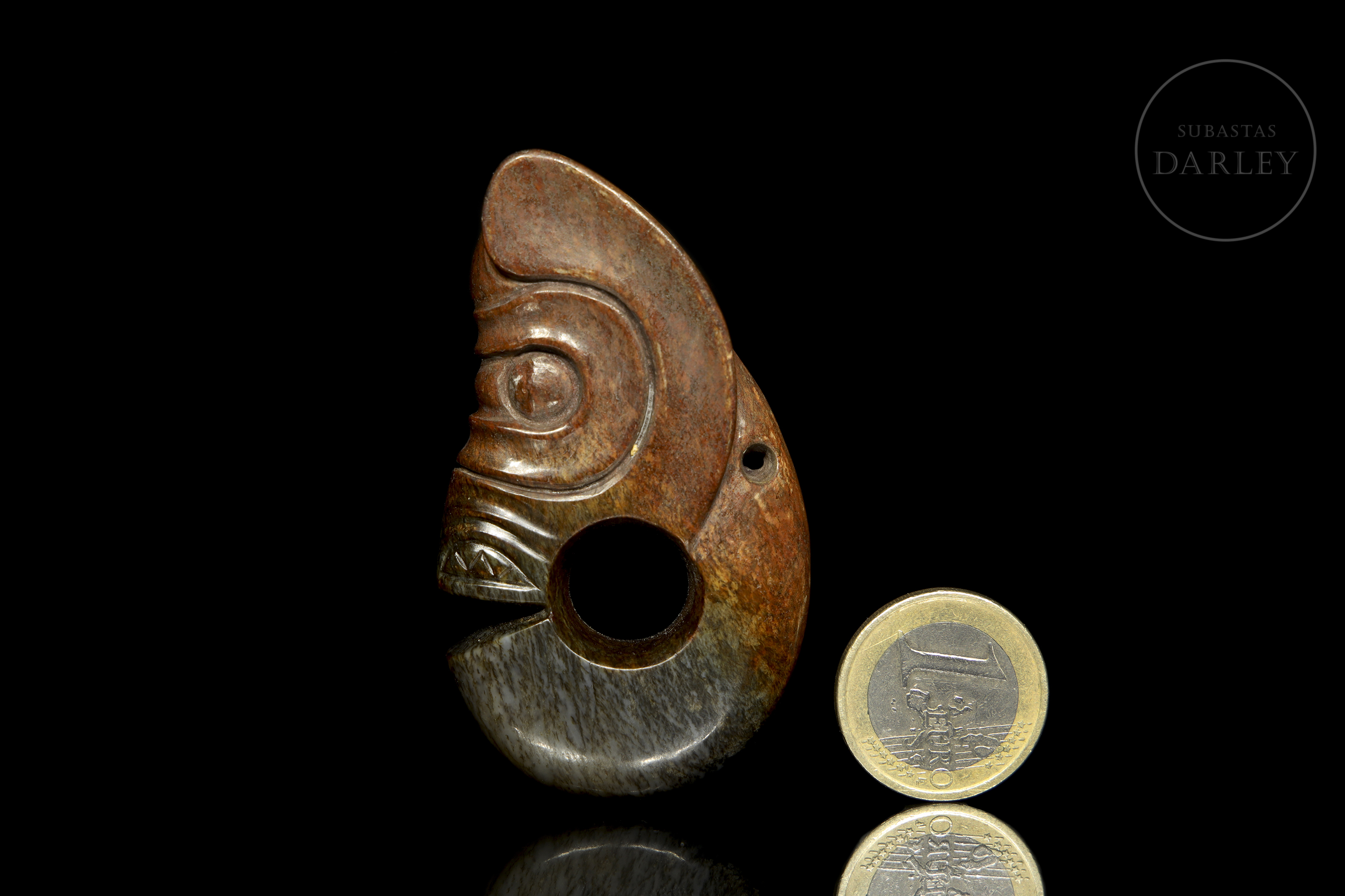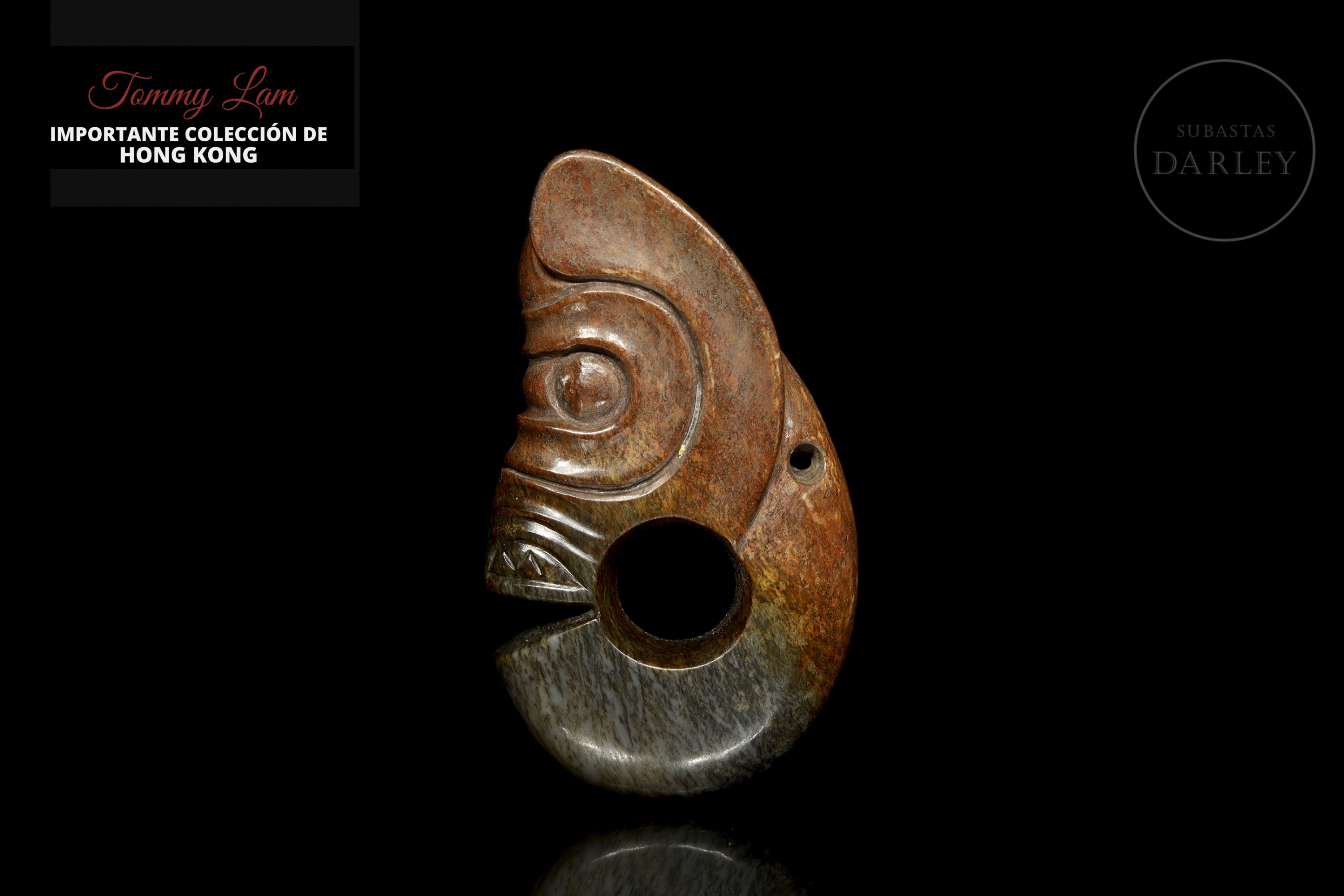 Colgante de jade "Cerdo dragón" o "Zhulong", de tonalidad grisácea con extensas áreas de pátina en tonos marrón rojizo, pardos y ocre. La pieza presenta la forma clásica de un dragón arcaico enroscado que no llega a cerrarse por completo. Destaca por sus rasgos zoomorfos, con grandes ojos, orejas alzadas y un hocico plano, todo ello realizado en relieve e incisiones. Cultura Hongshan (aprox. 4000–3000 a.C.) o posterior.