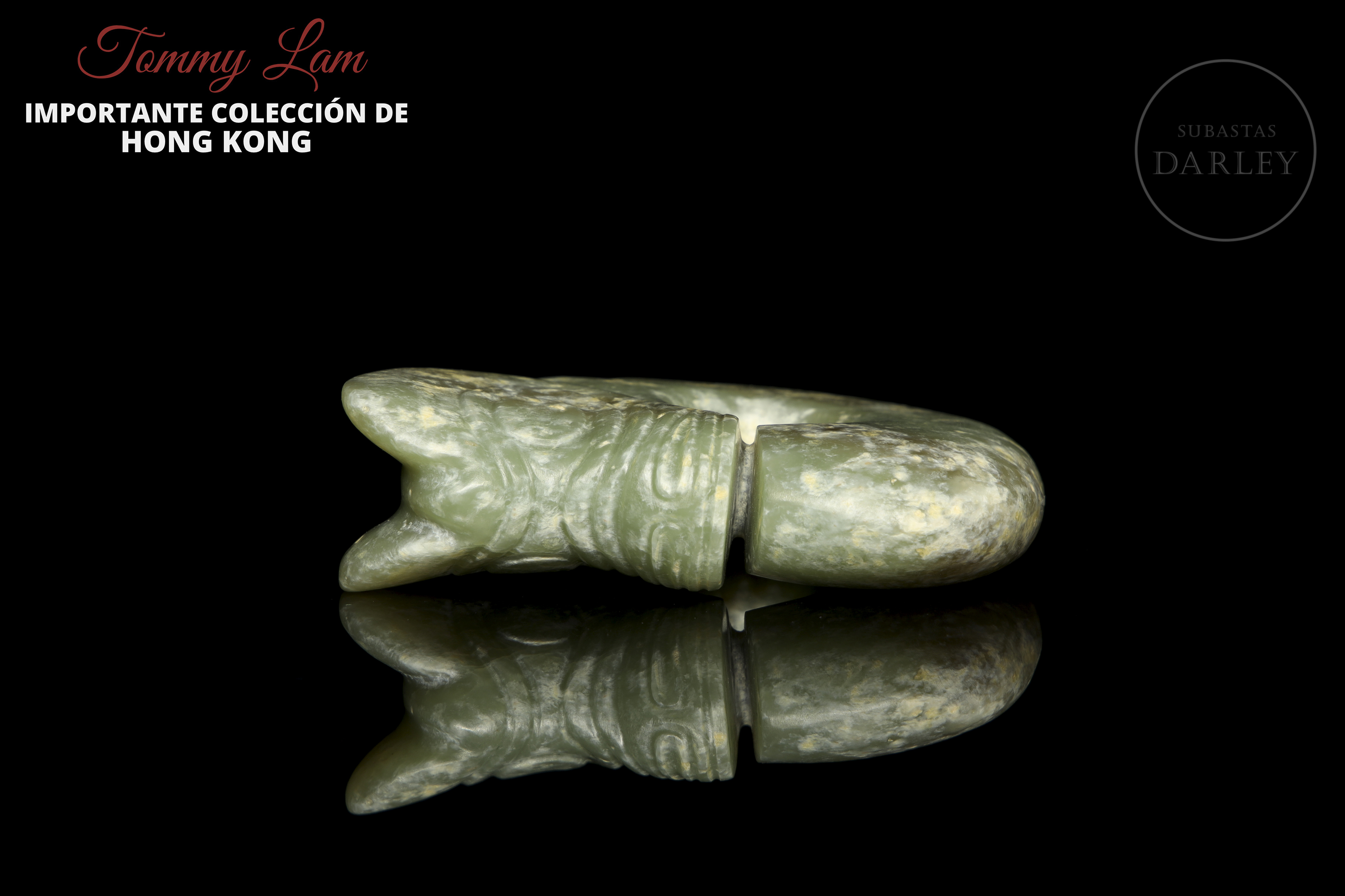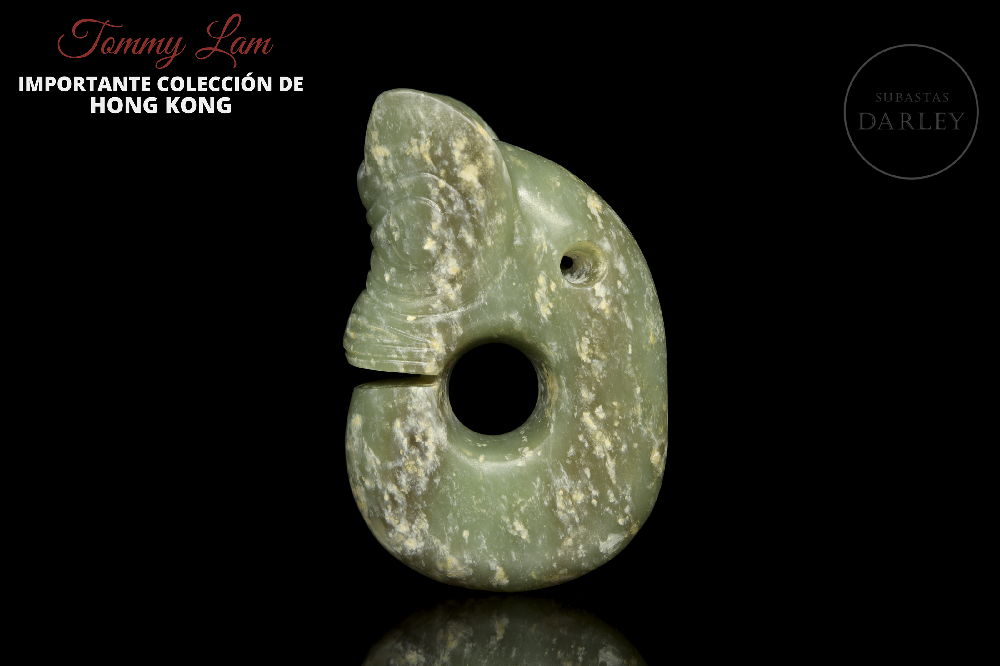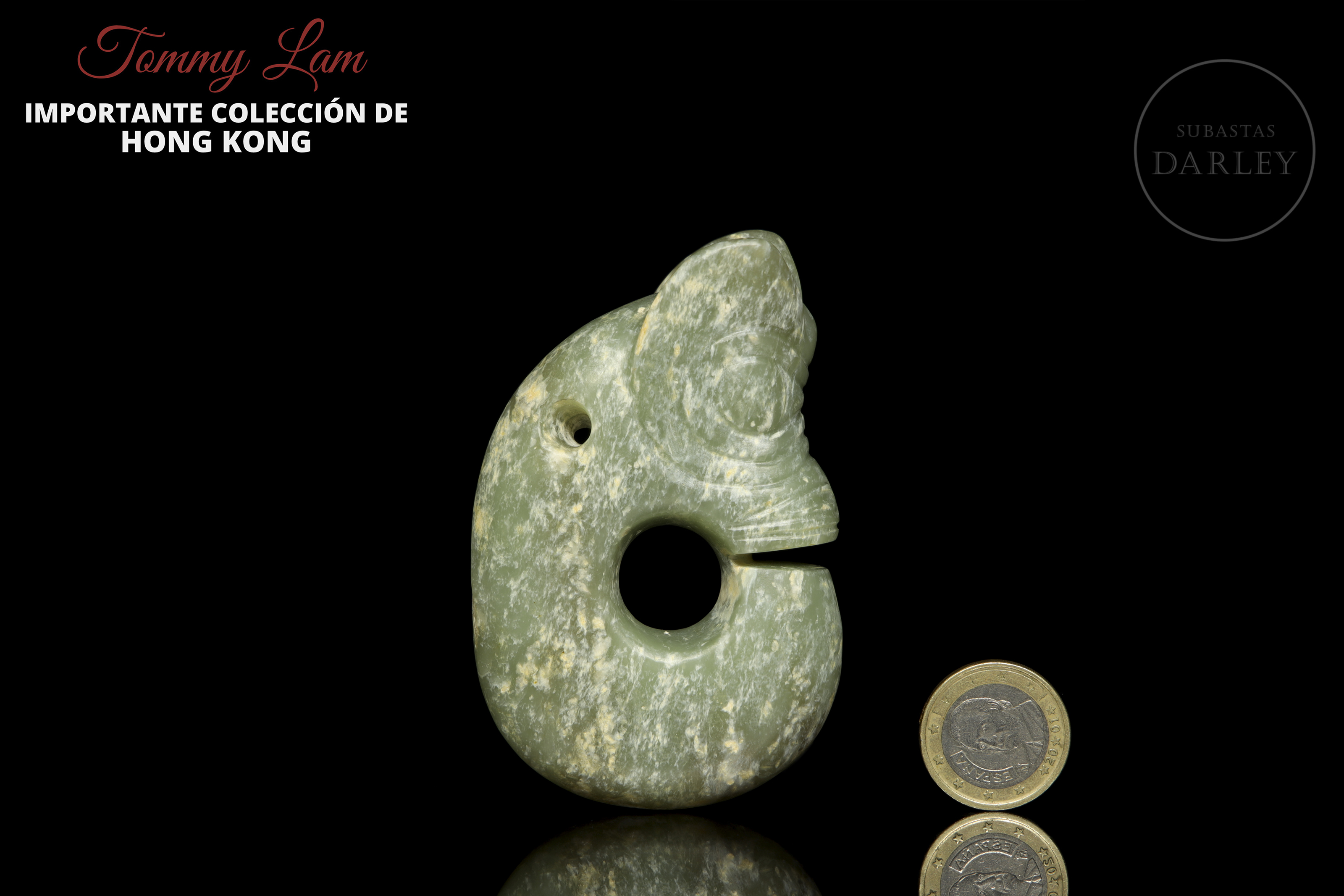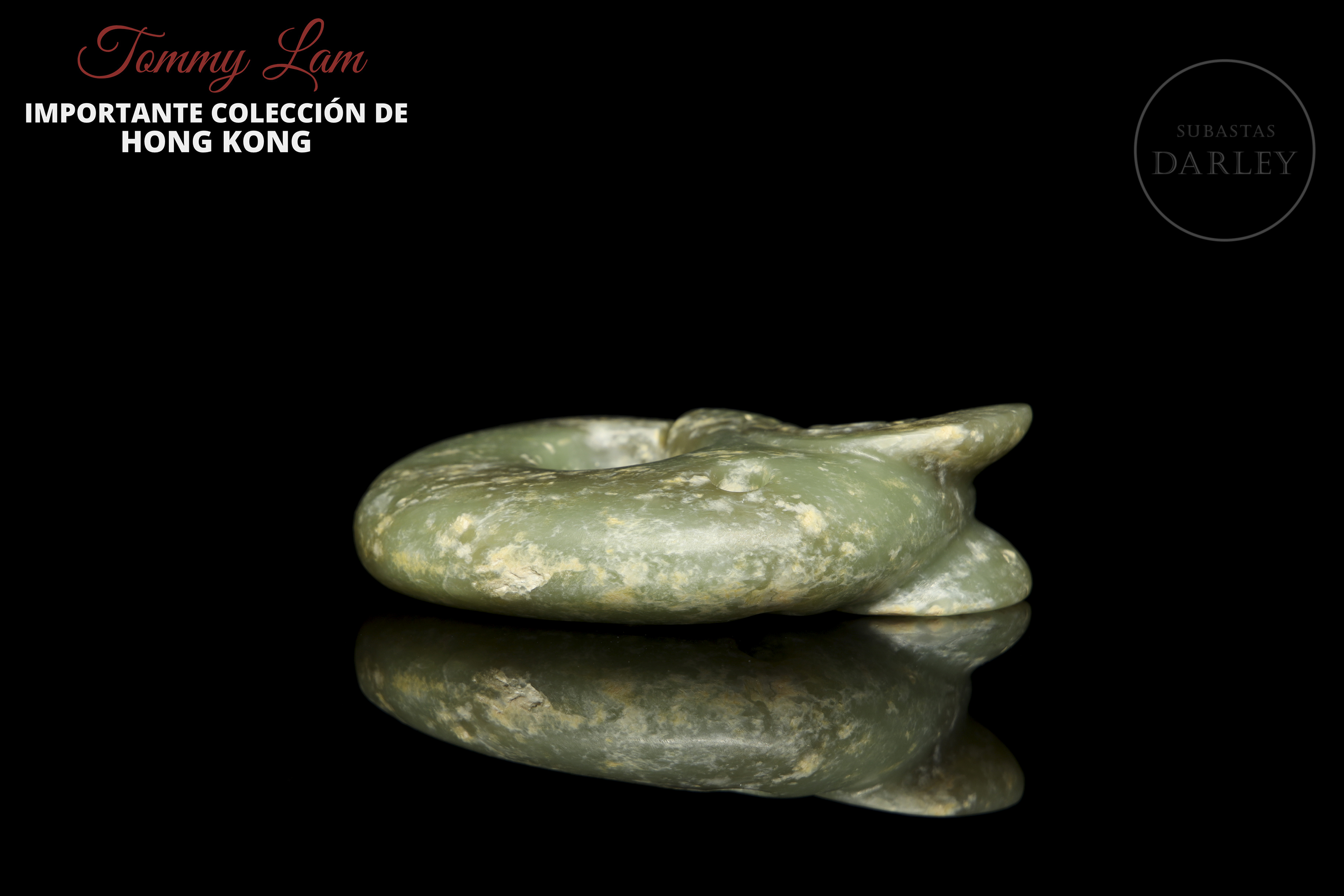 Amuleto arcaico de jade, tallado en la icónica forma de "dragón-cerdo" o "zhulong". La piez, presenta un cuerpo anular enroscado, con una cabeza de rasgos porcinos, de hocico plano, grandes orejas y cuerpo de dragón. Está tallado en un jade veteado de tonos verdes y presenta una gran perforación central y otra menor para ser suspendido.
