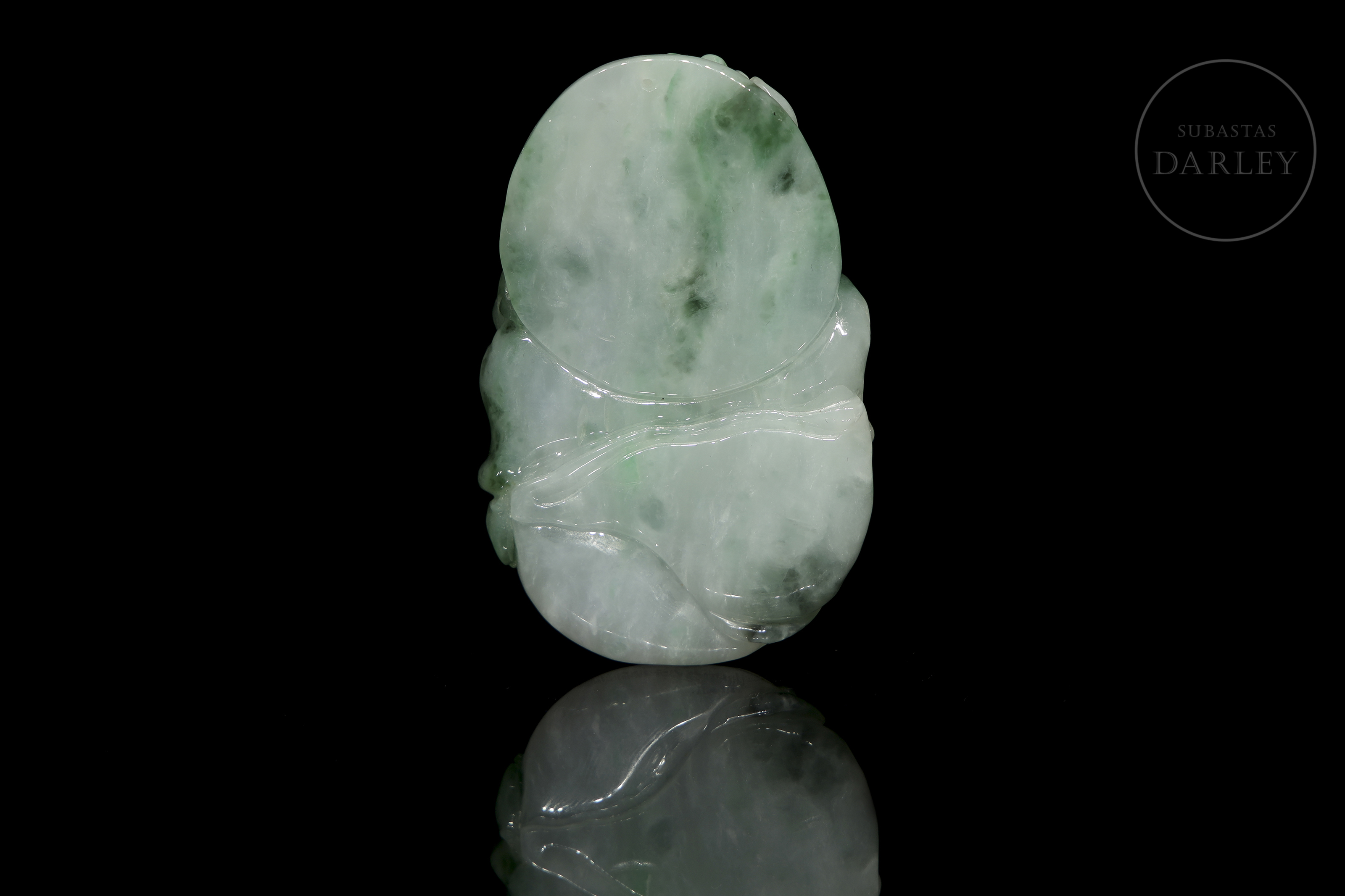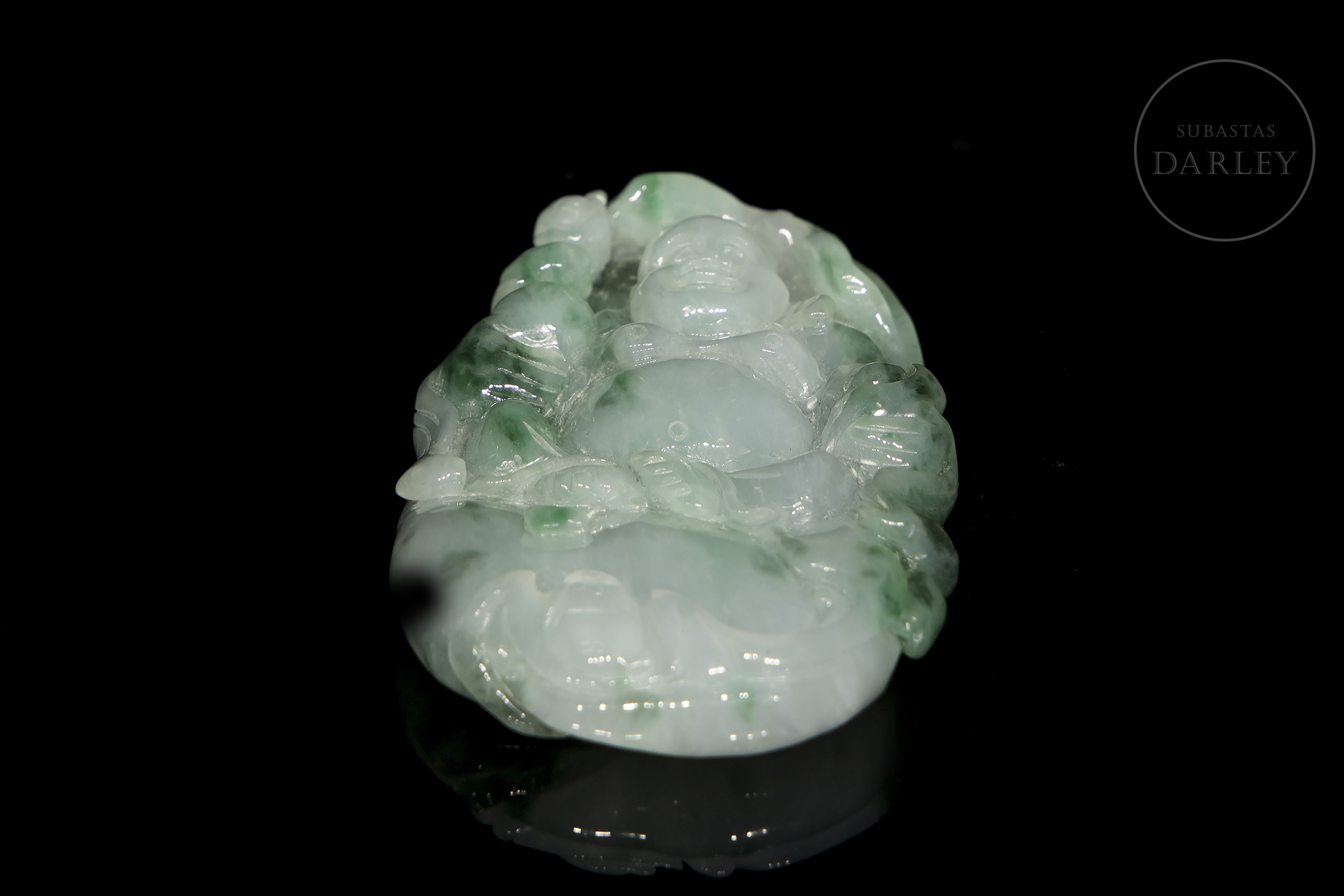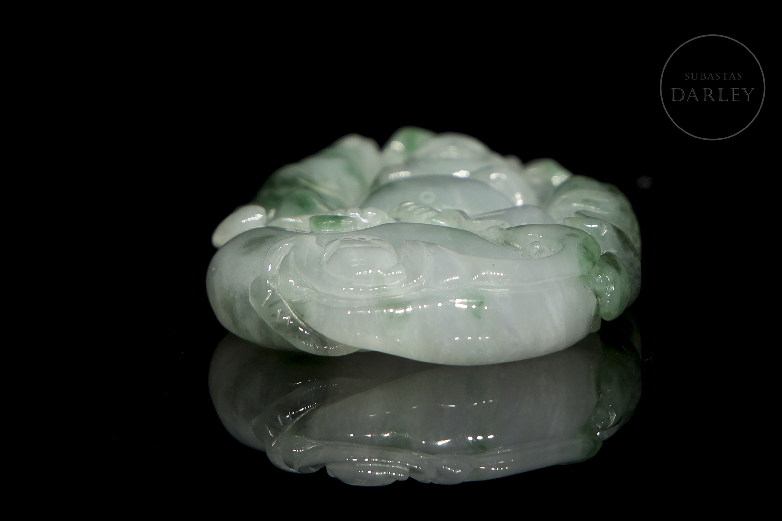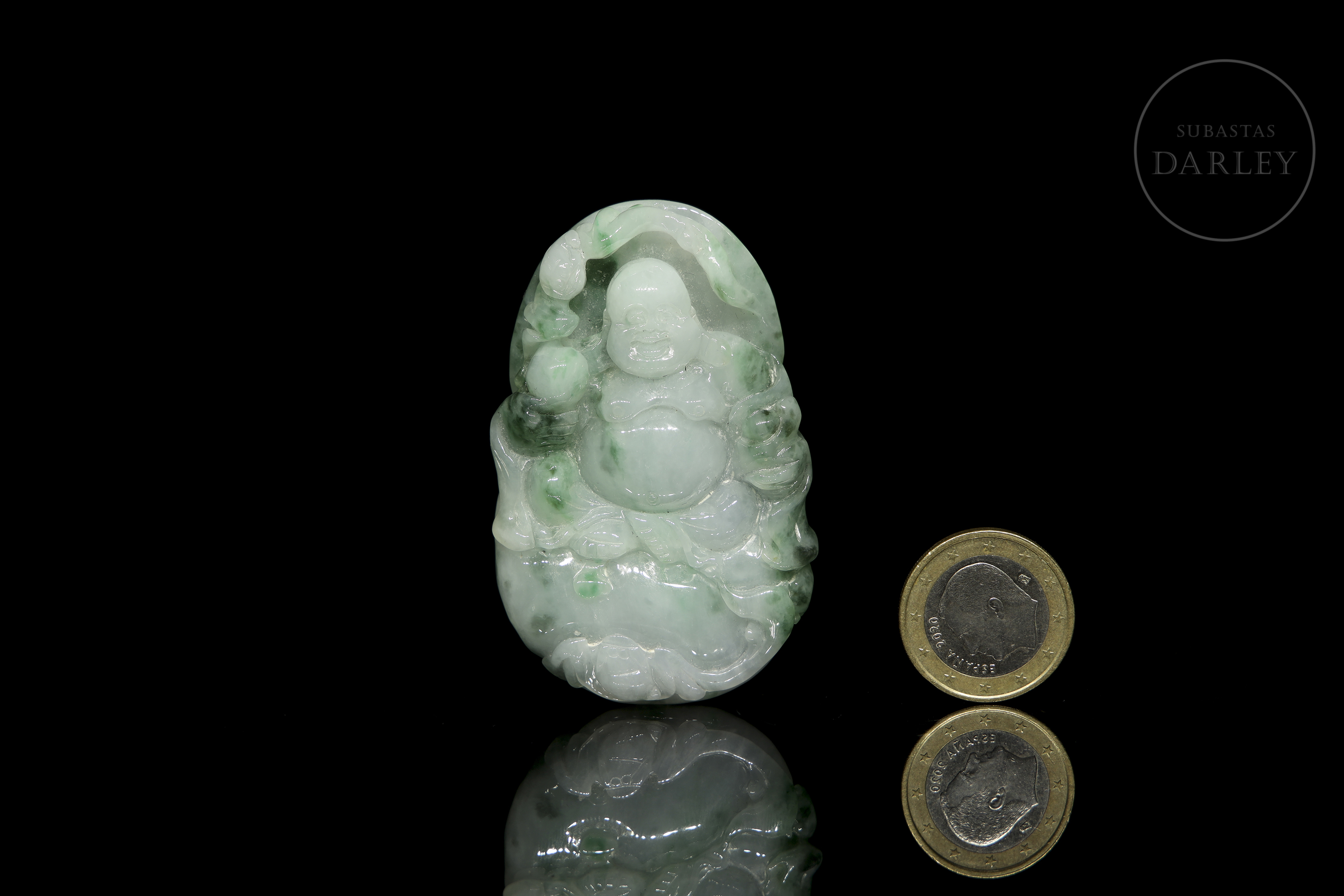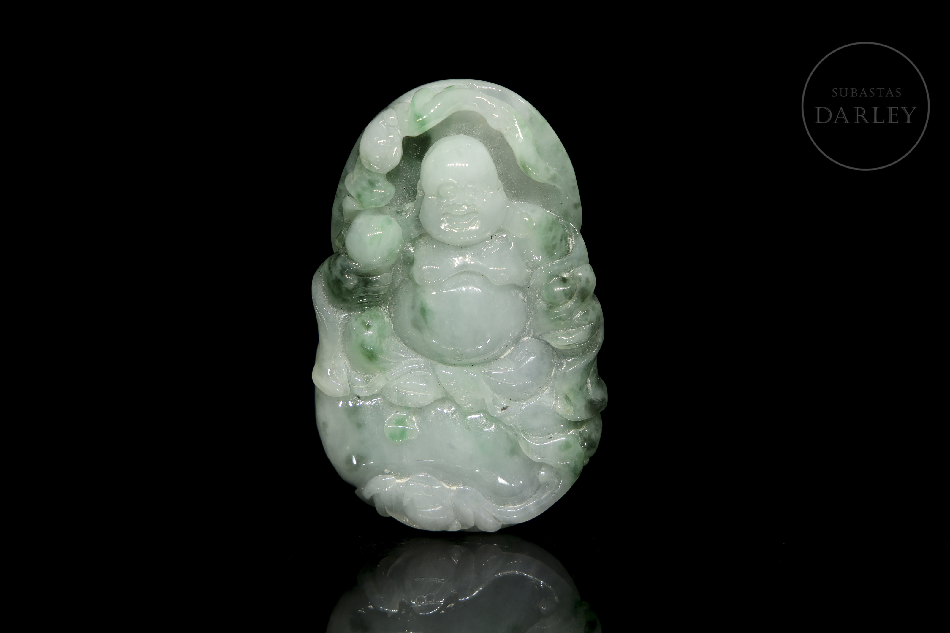 Pequeño colgante de jadeíta natural tallada, de elegante tonalidad clara con manchas verdosas de mayor y menor intensidad. Muestra la imagen de un gran Buda sonriente, con el pecho descubierto y una túnica que cubre sus piernas, dispuestas en posición de loto. En su mano derecha sostiene una esfera.