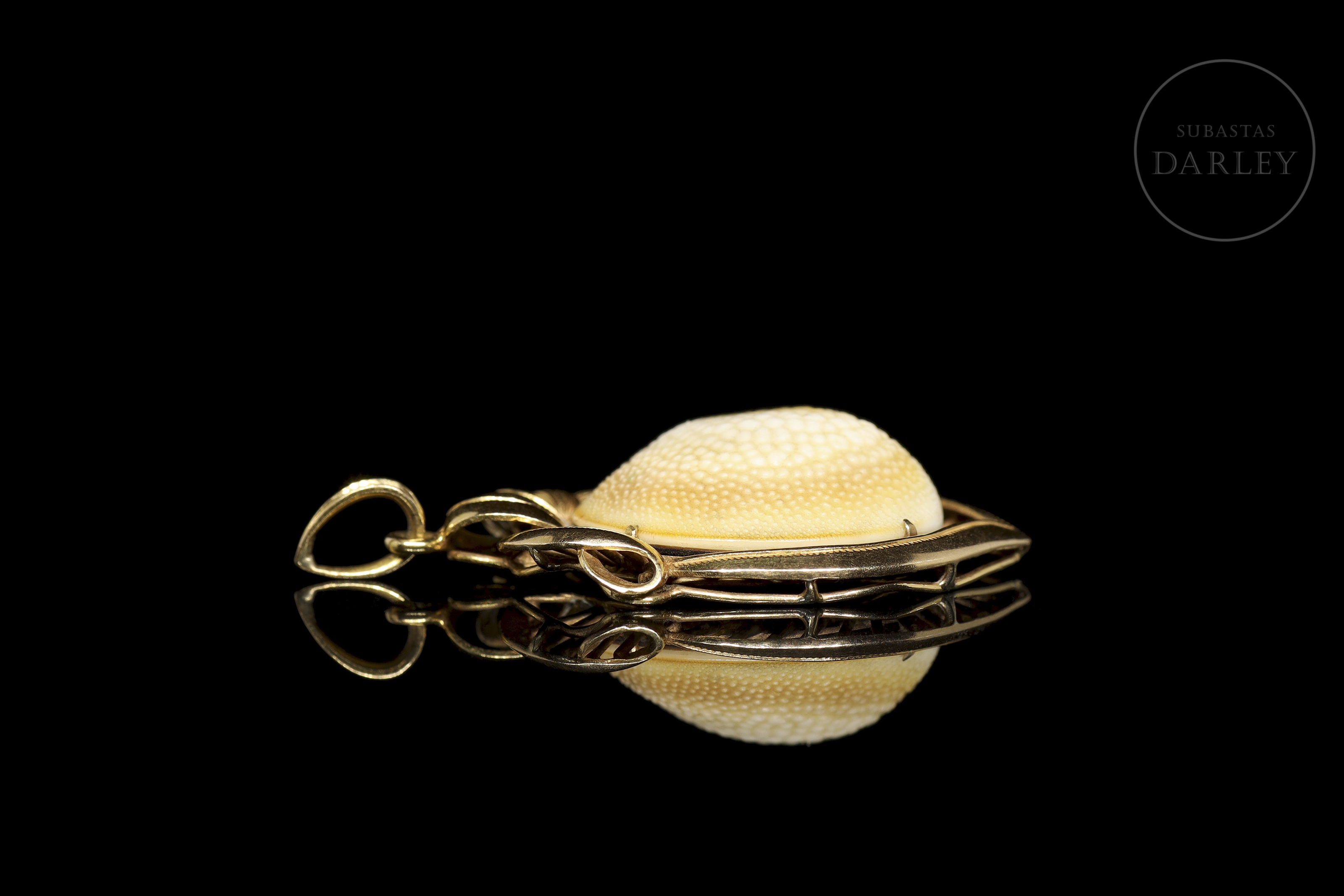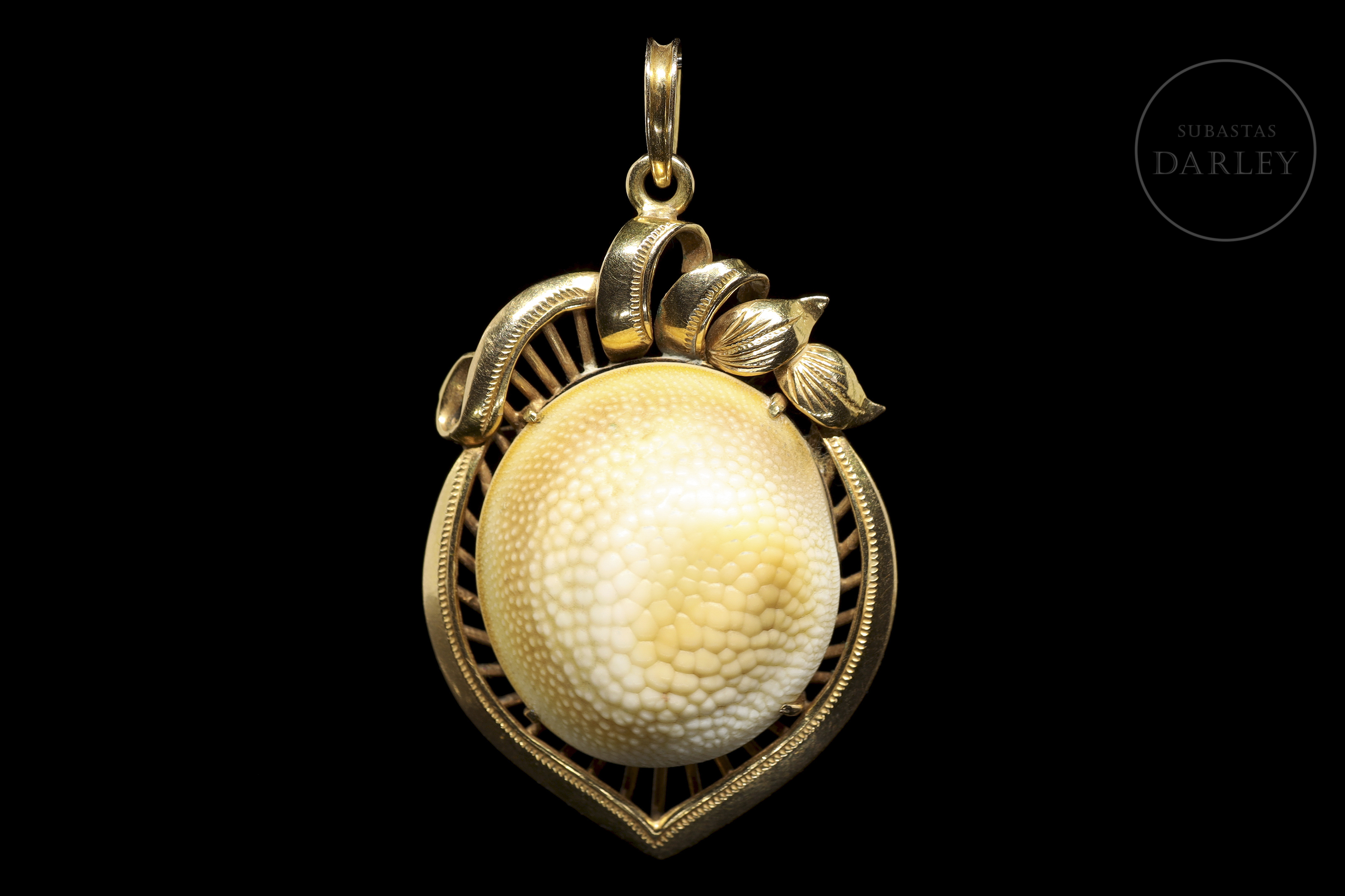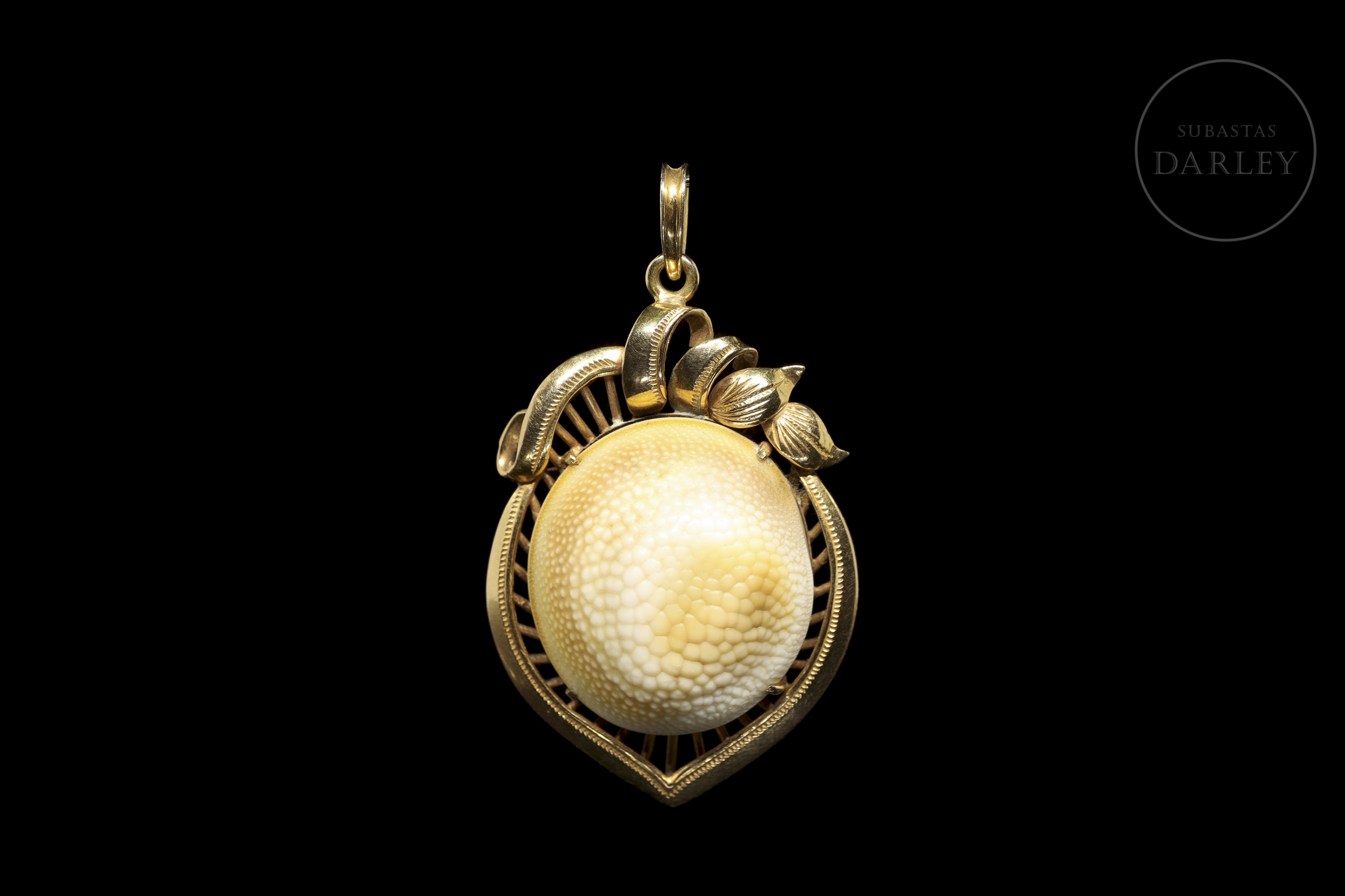 Colgante realizado en oro amarillo de 18 kt, compuesto por una pieza oval de concha con textura natural, engastada en una montura calada y enmarcada por un motivo de hojas y cintas grabadas en relieve. Estilo eduardino y reminiscencias Art Nouveau.