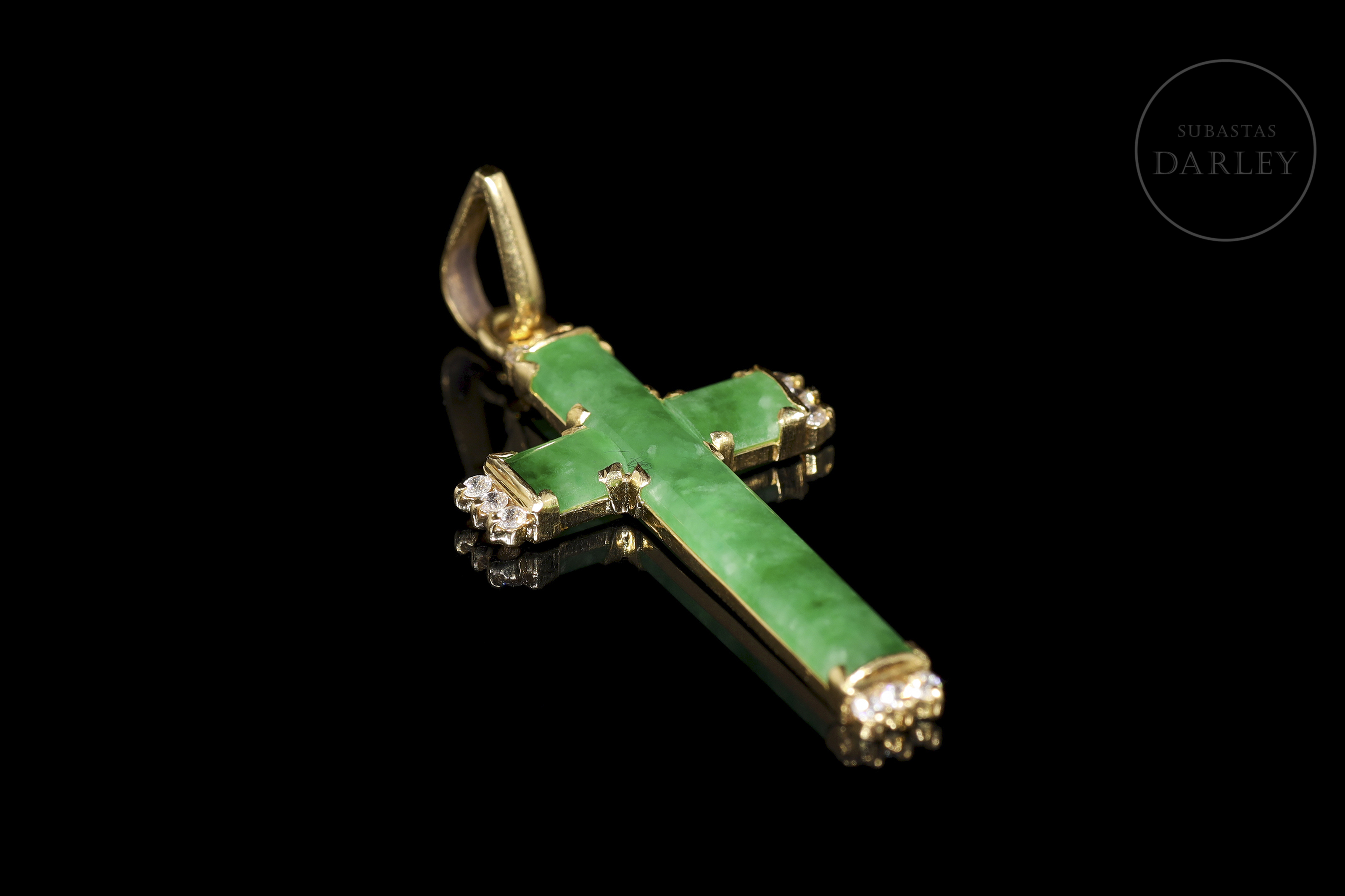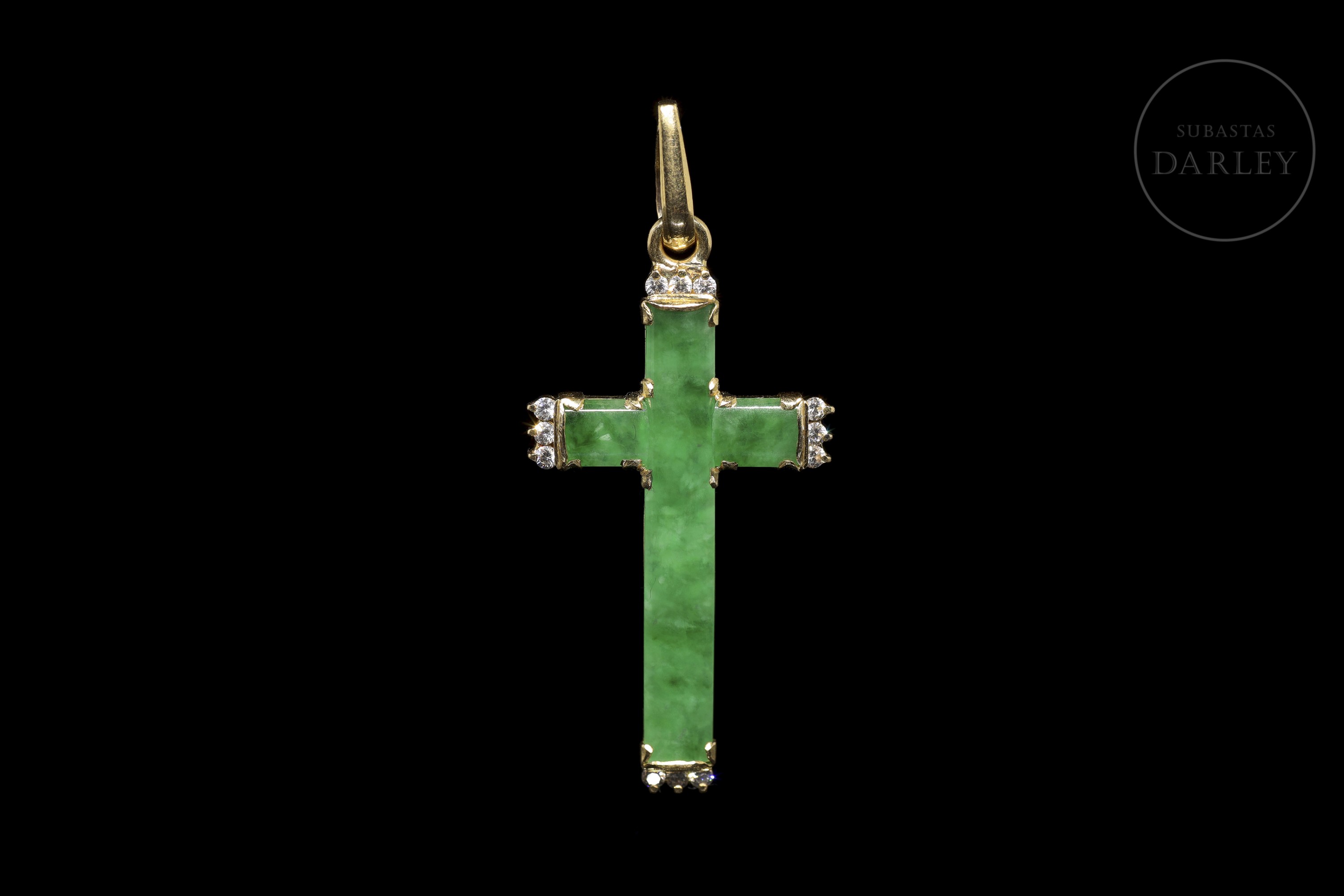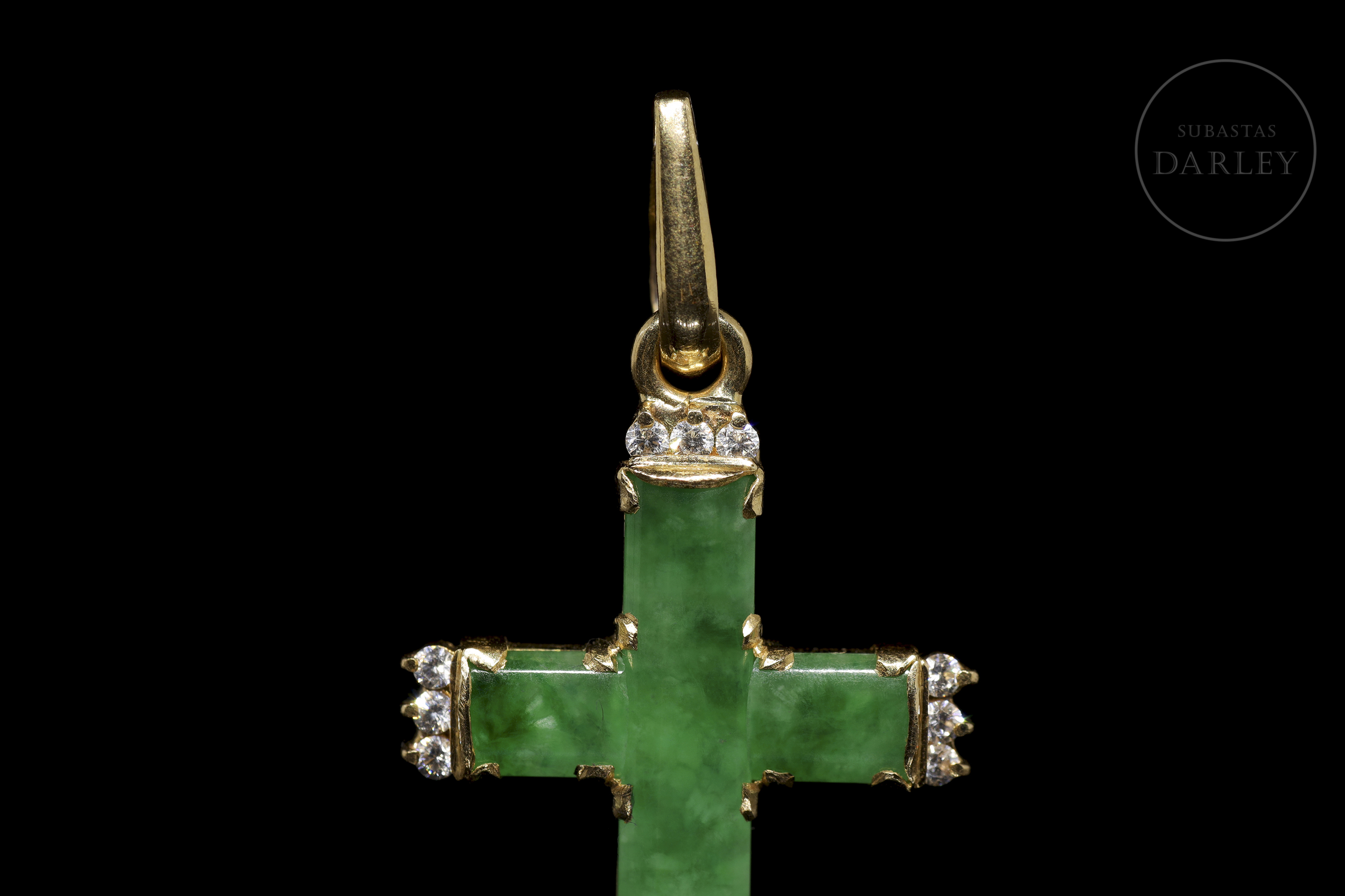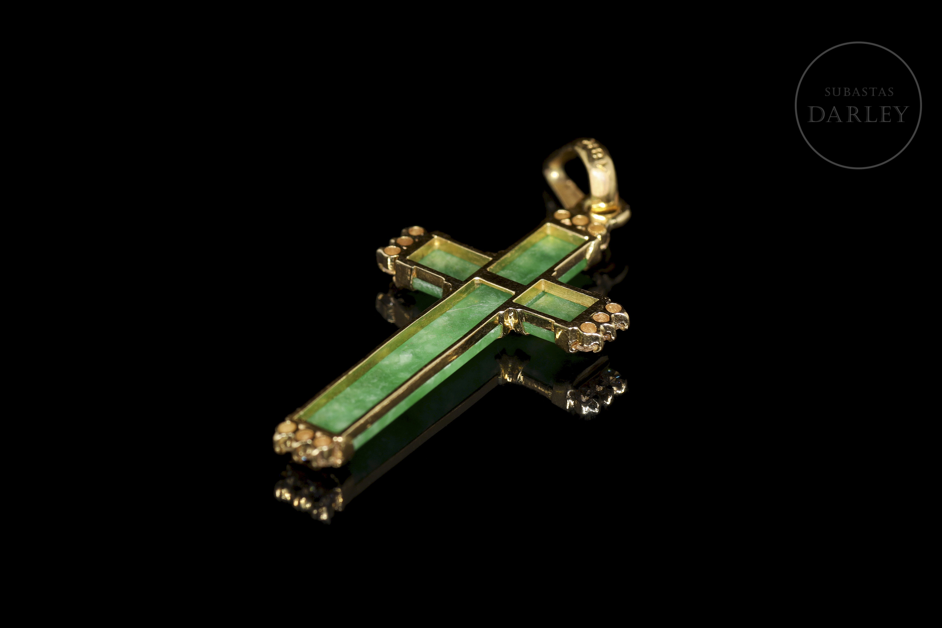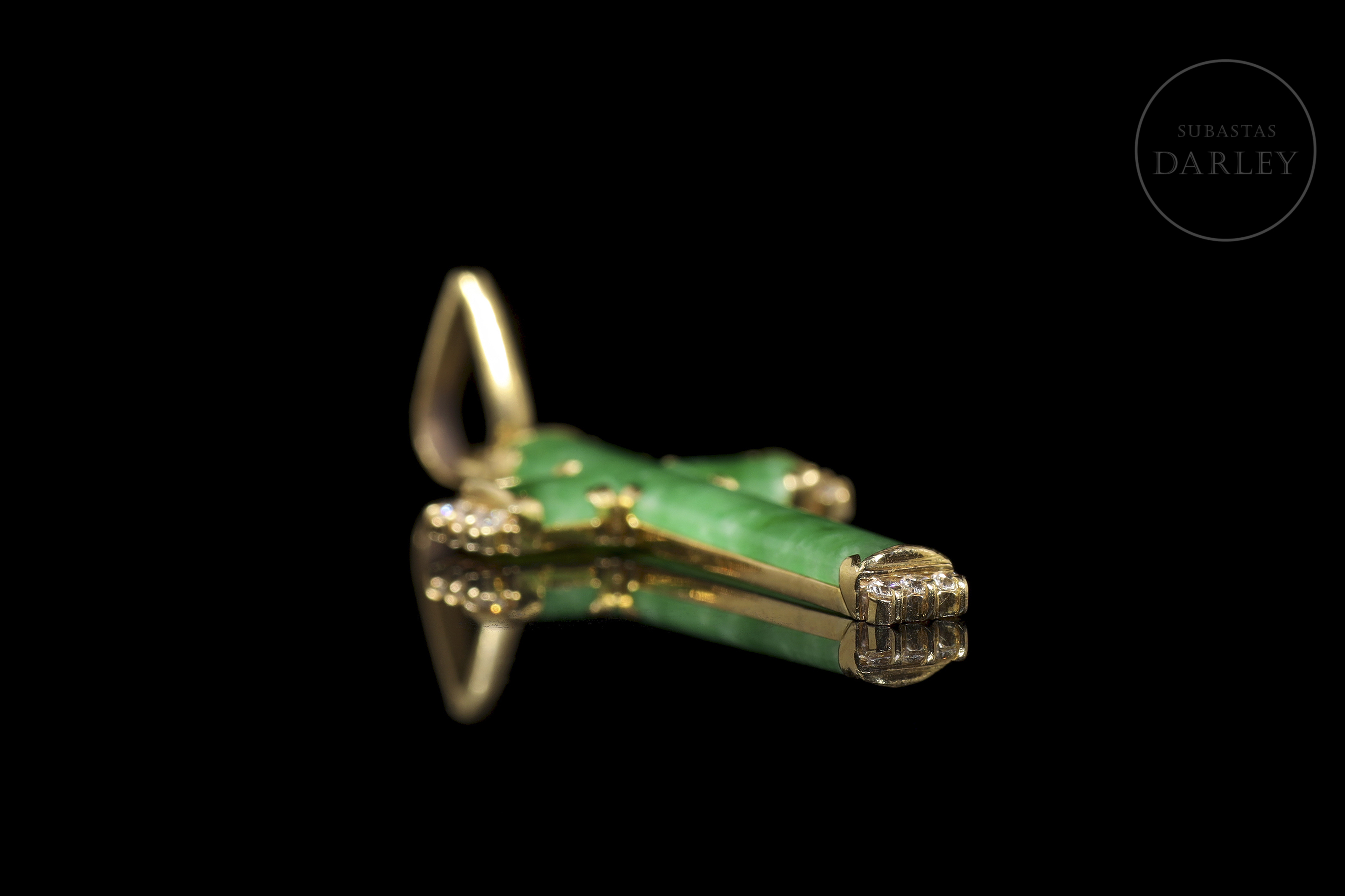 Colgante en oro amarillo de 18 k con forma de cruz, decorado con placas rectangulares de jade verde engastadas en bisel y rematadas por pequeñas piedras transparentes.