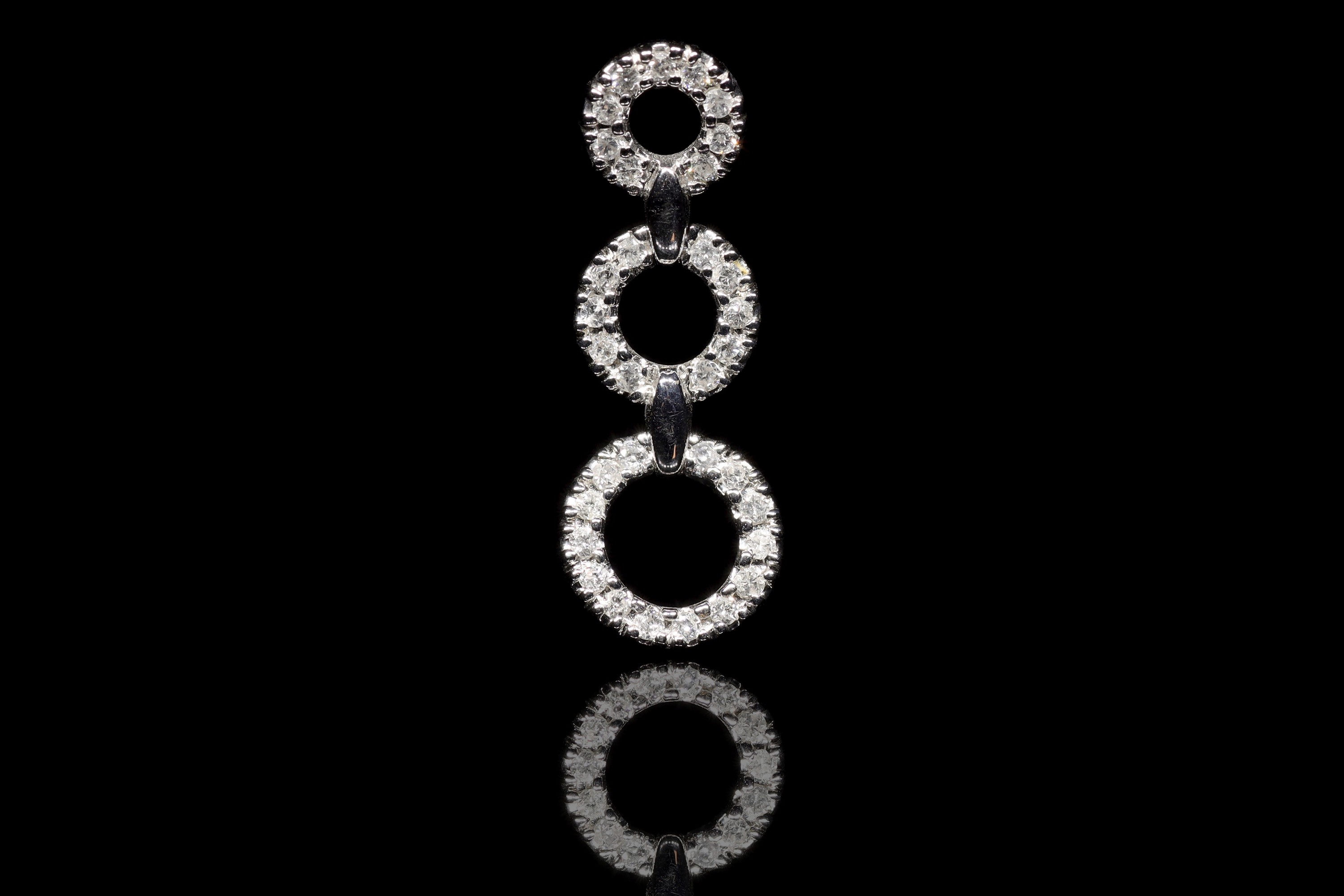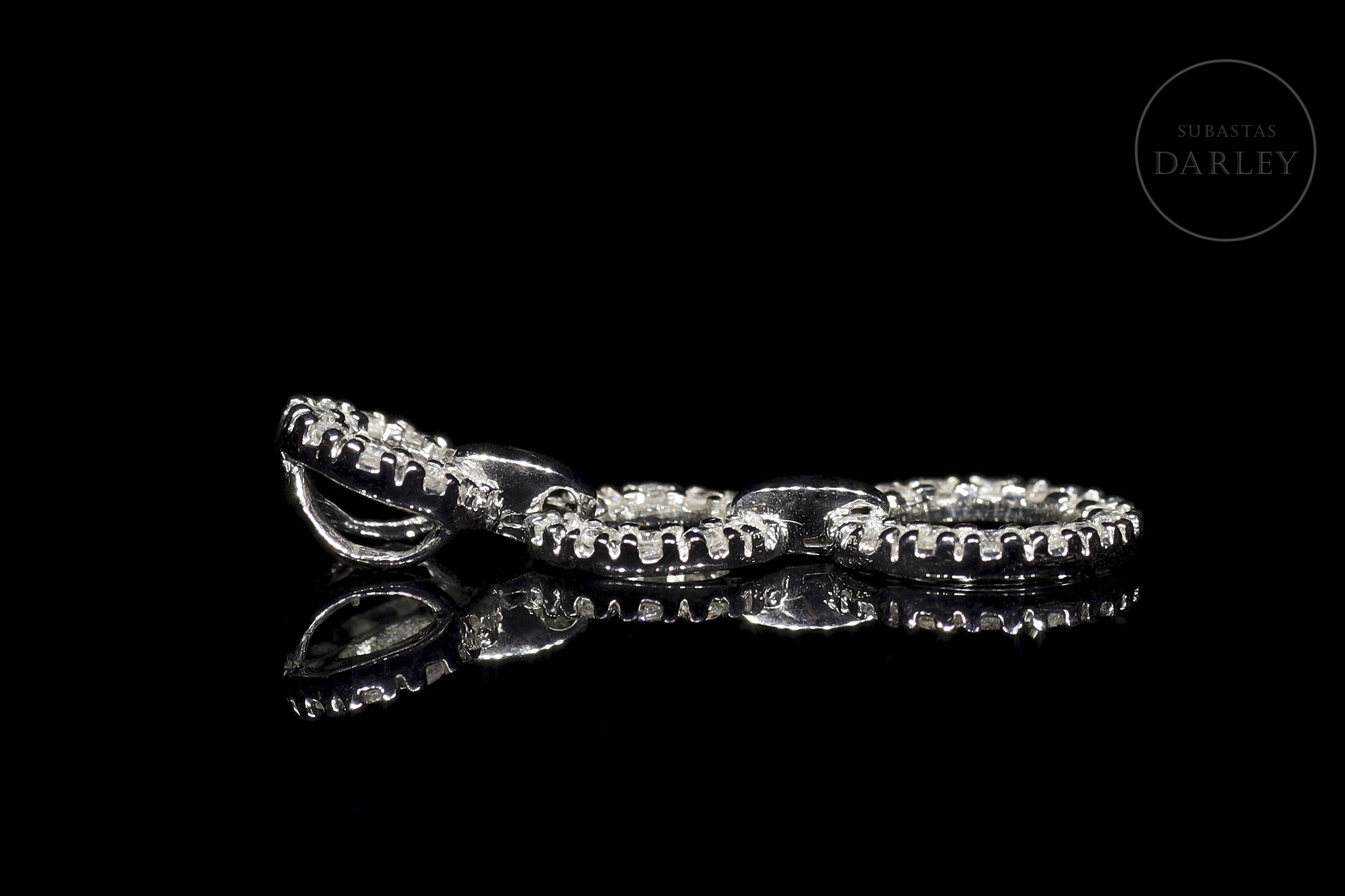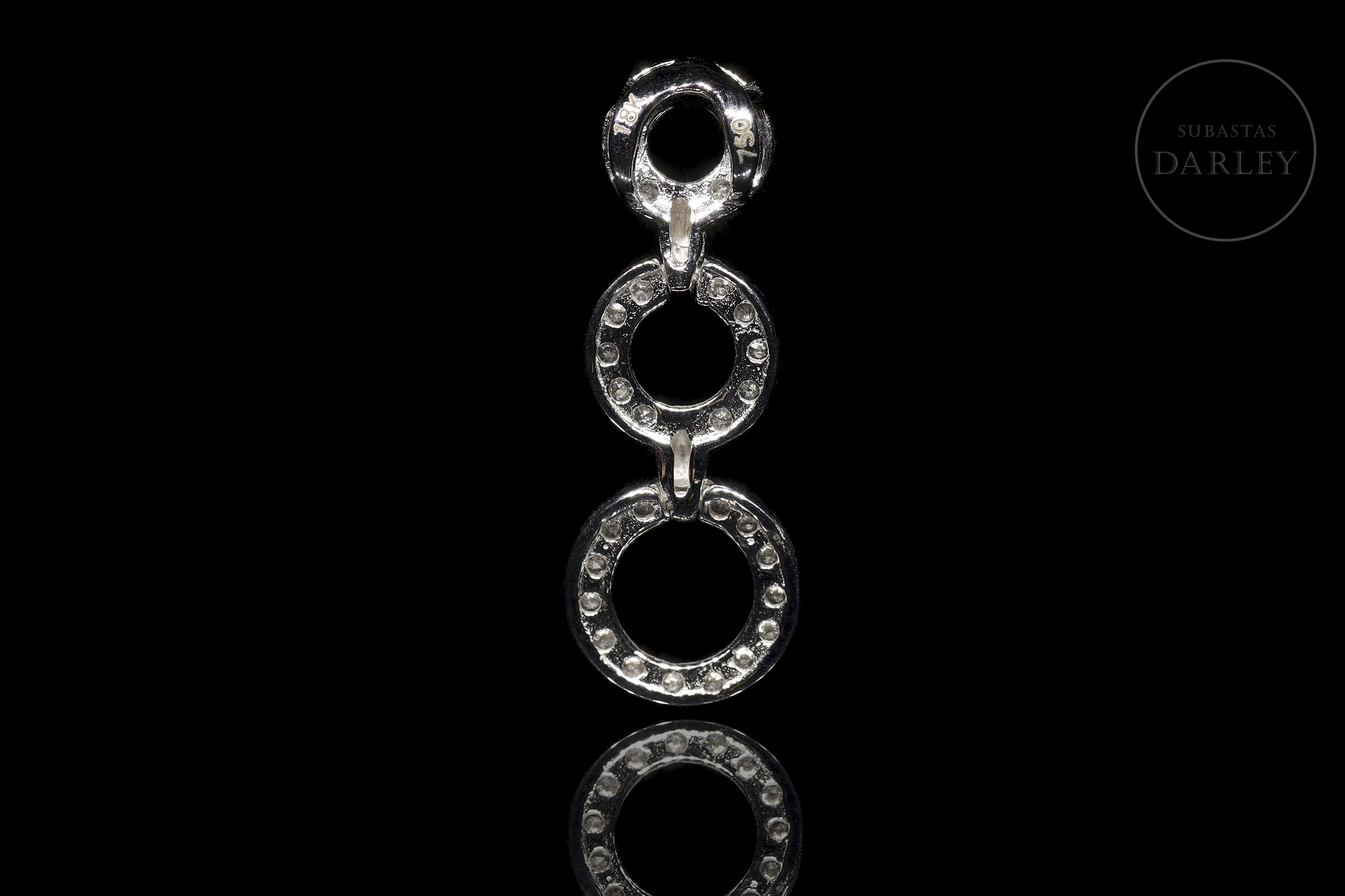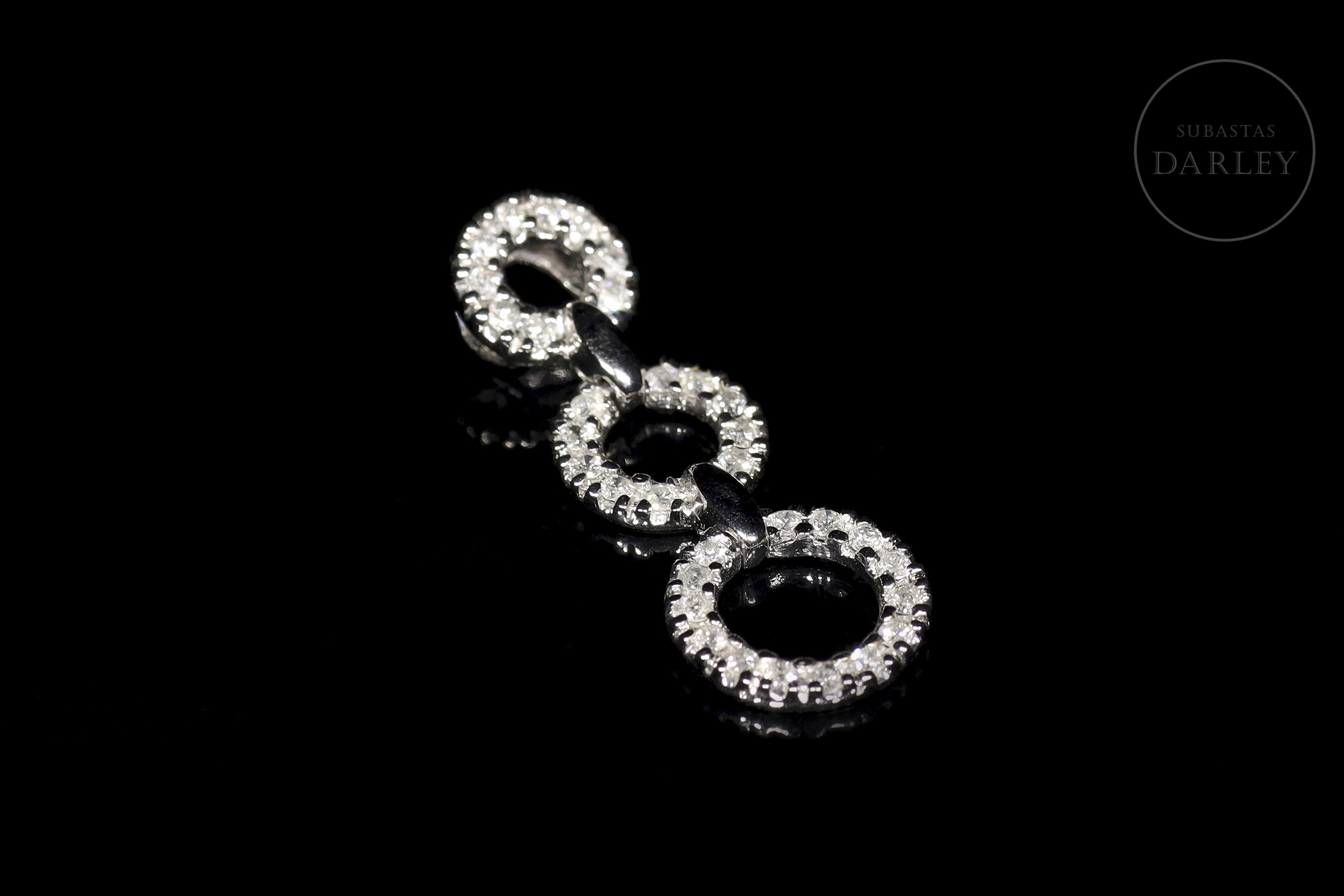 Colgante en oro blanco de 18k con diseño estilizado de tres perfiles ovales dispuestos en línea vertical, unidos por abrazaderas articuladas. Forrado con un total de 32 diamantes talla brillante, engarzados en garras, con peso total de 0,25 cts.