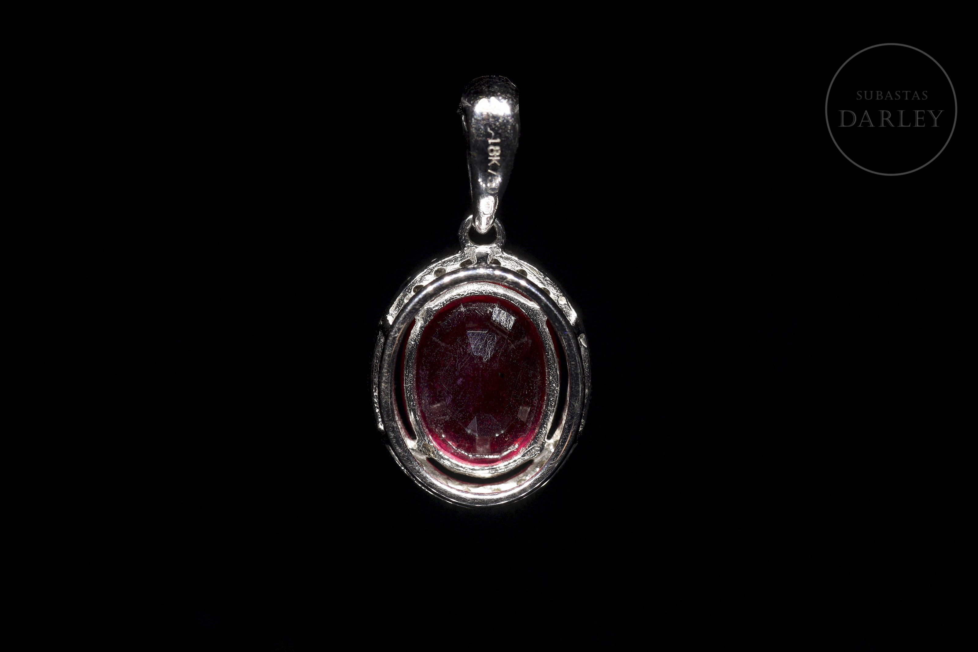 Lo preside un destacado rubí de color rojo oscuro en talla oval engarzado en cuatro garras angulares, con un peso de 5,55 ct. Se adorna con una orla de 28 diamantes, talla brillante, engarzados en garras.