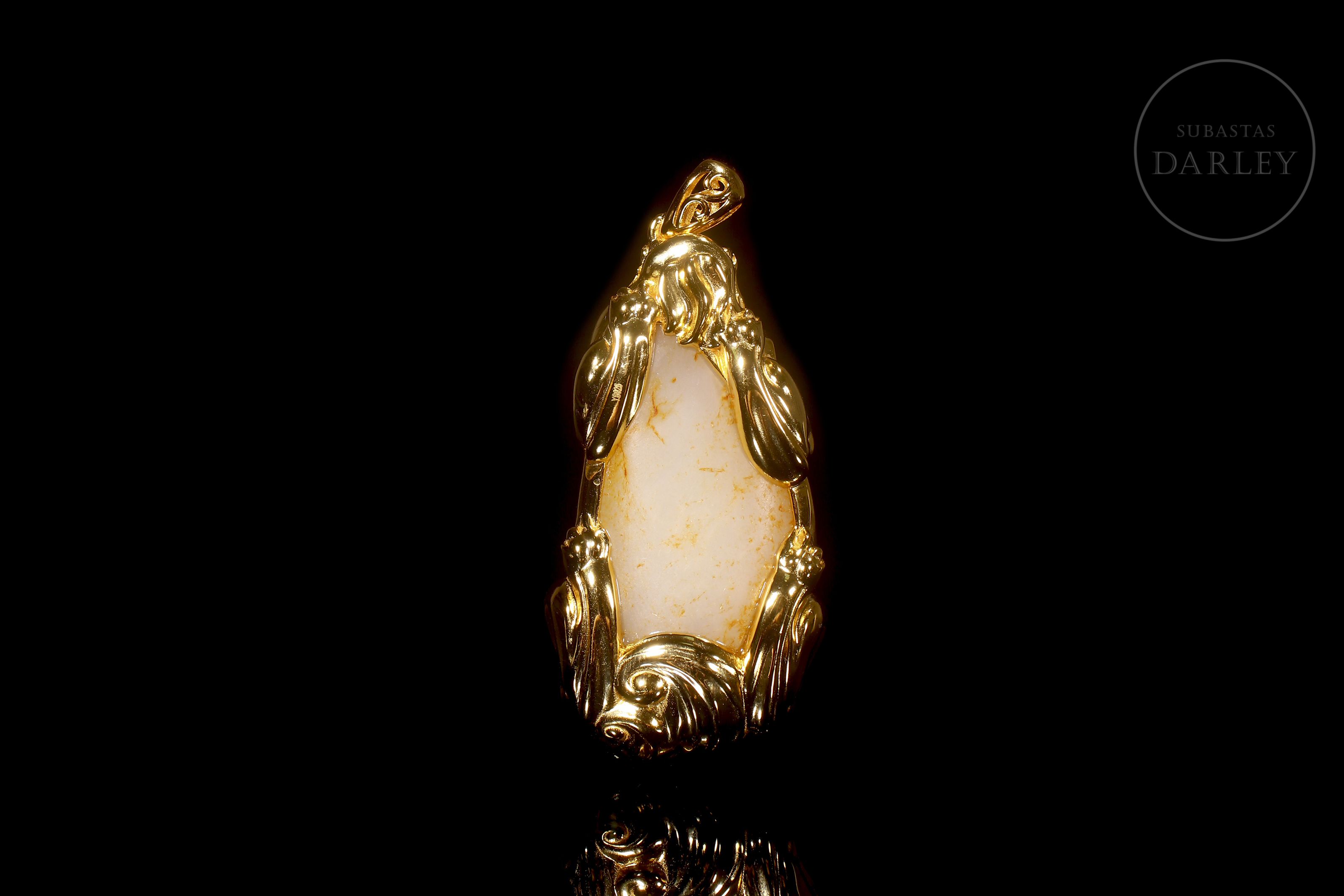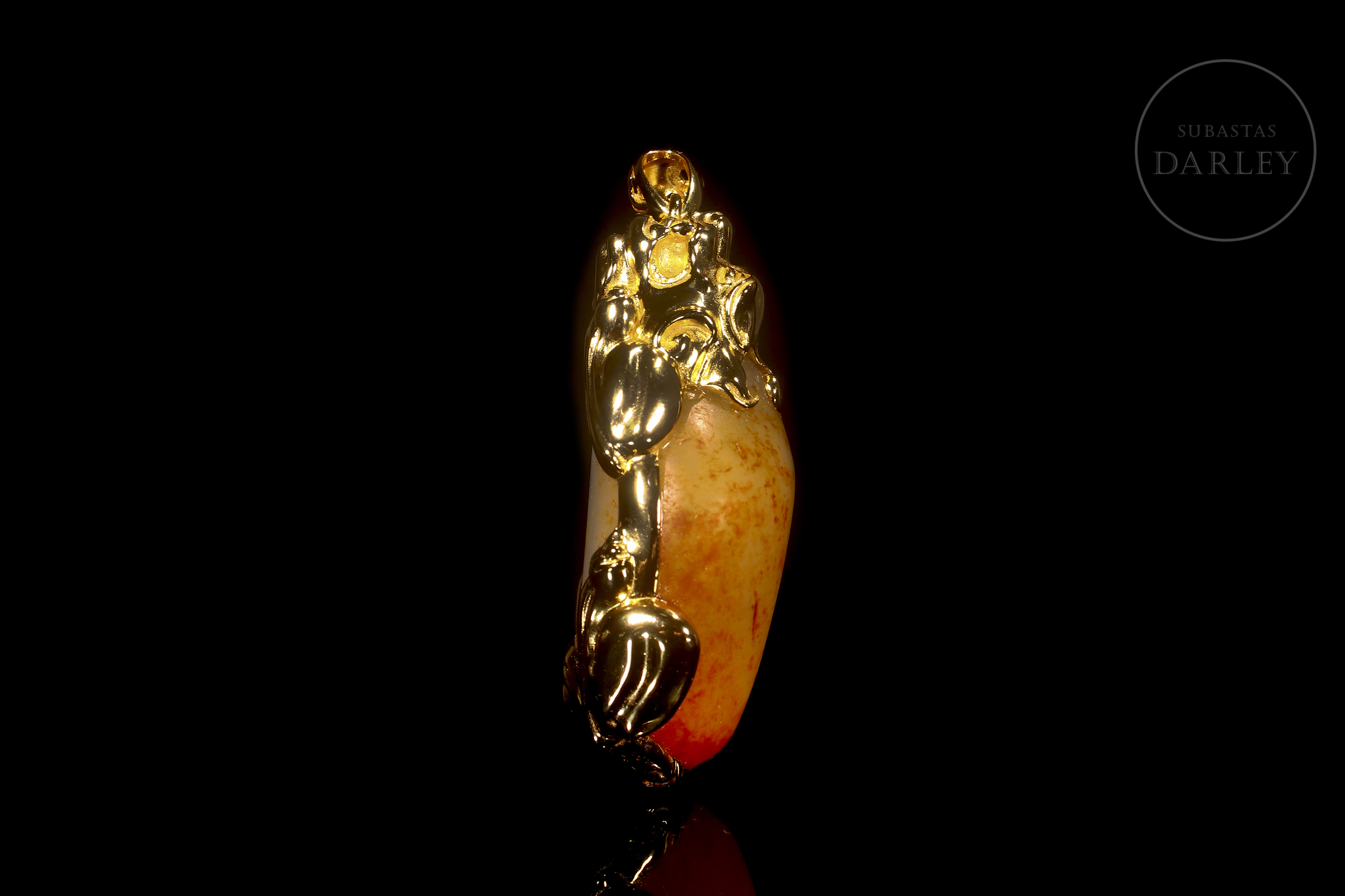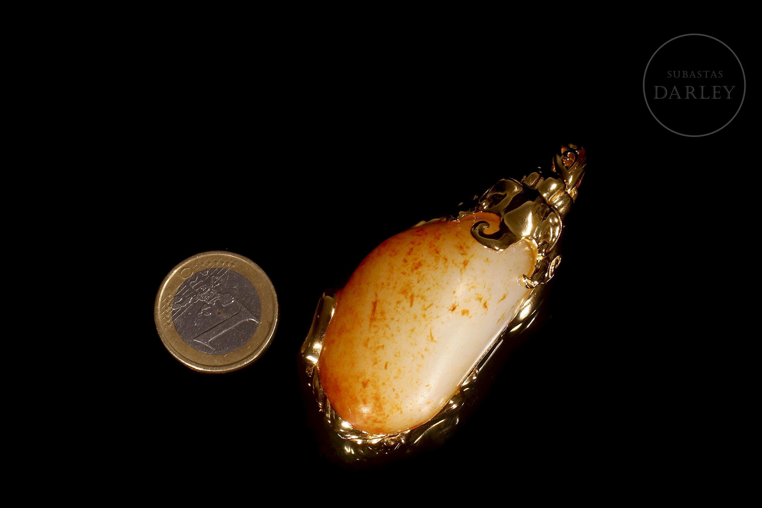 Colgante elaborado en jade de Hetian de tonalidad blanca con piel natural en tonos anaranjados y rojizos, enmarcado en una montura de plata dorada finamente trabajada con motivos de olas voluminosas.
