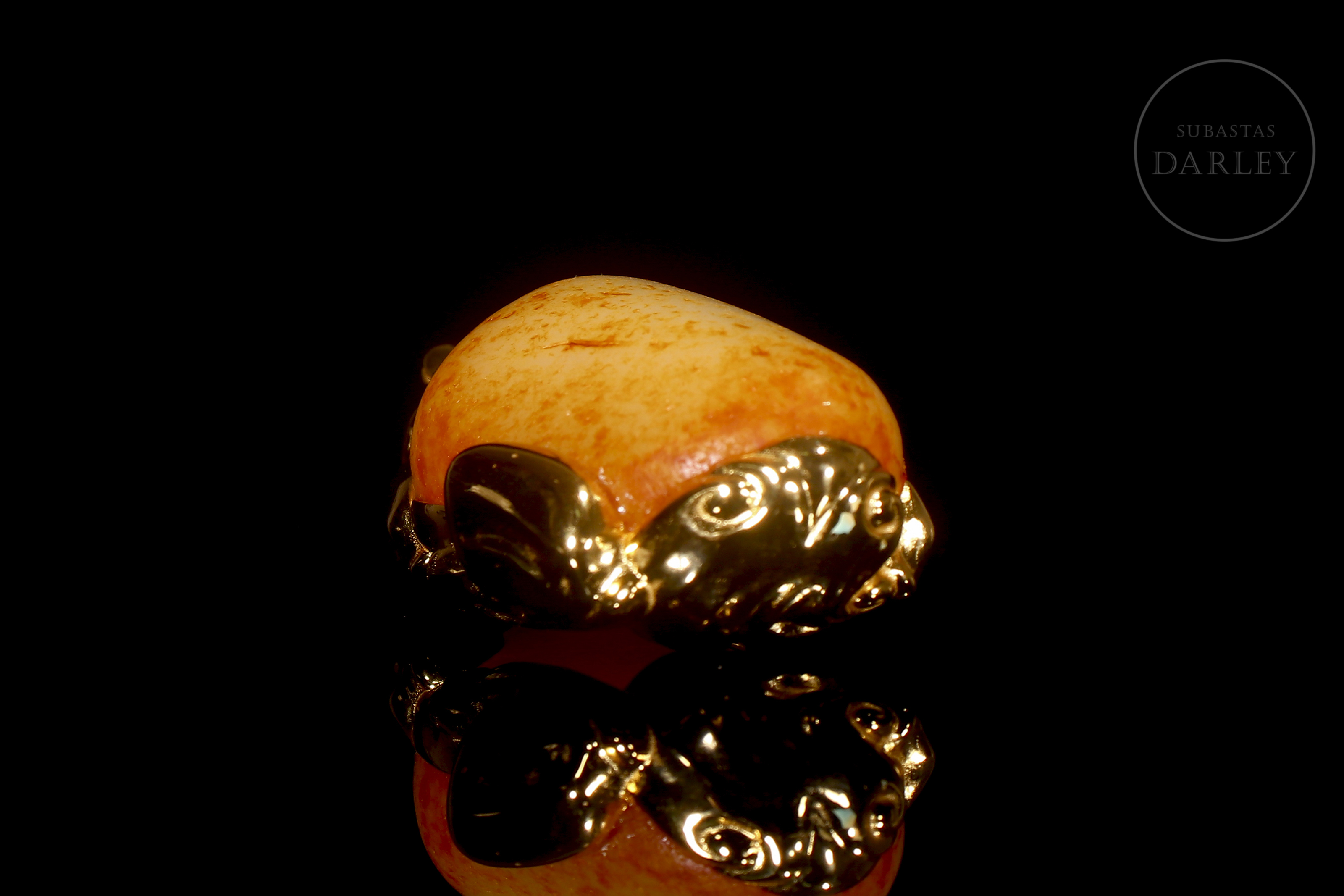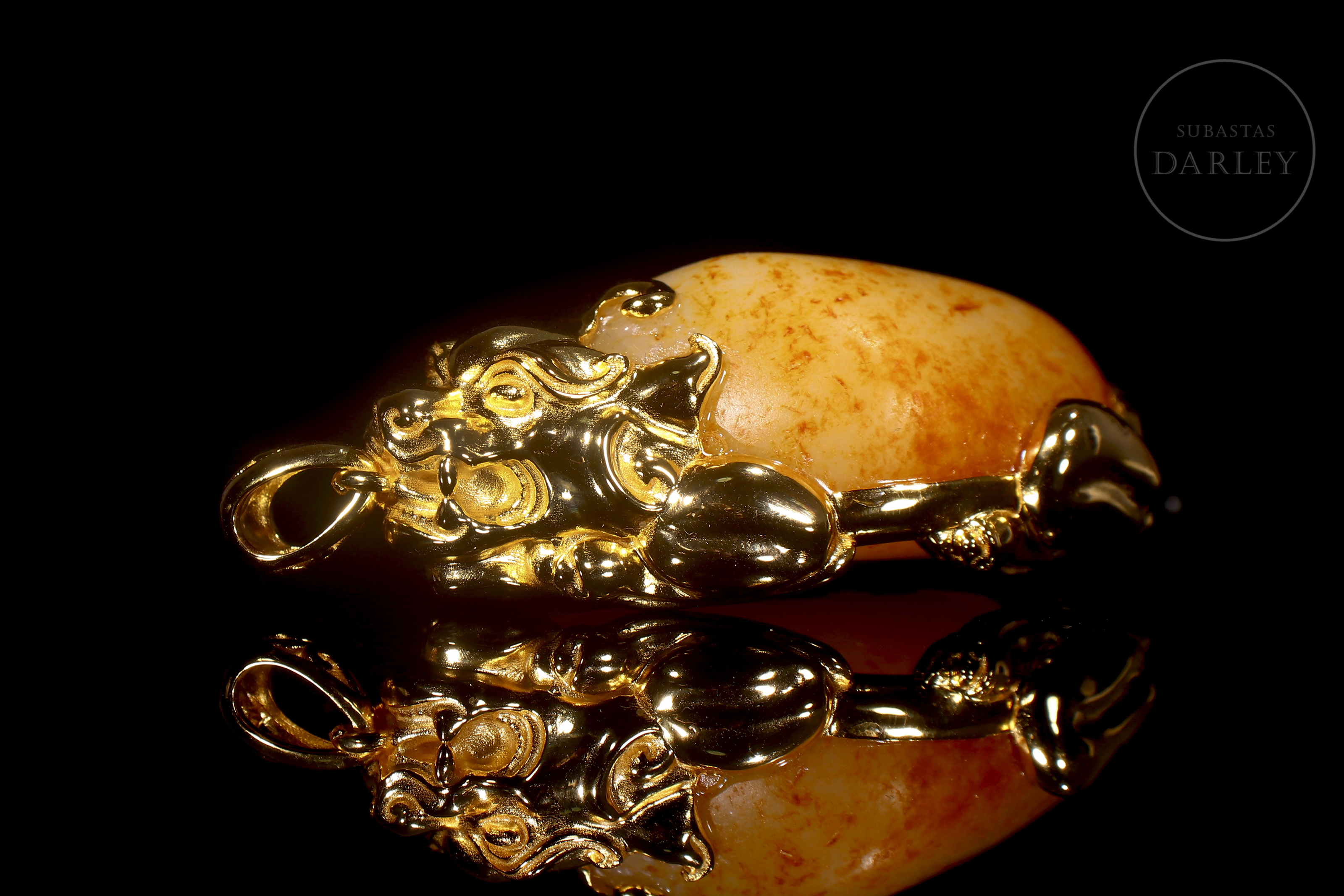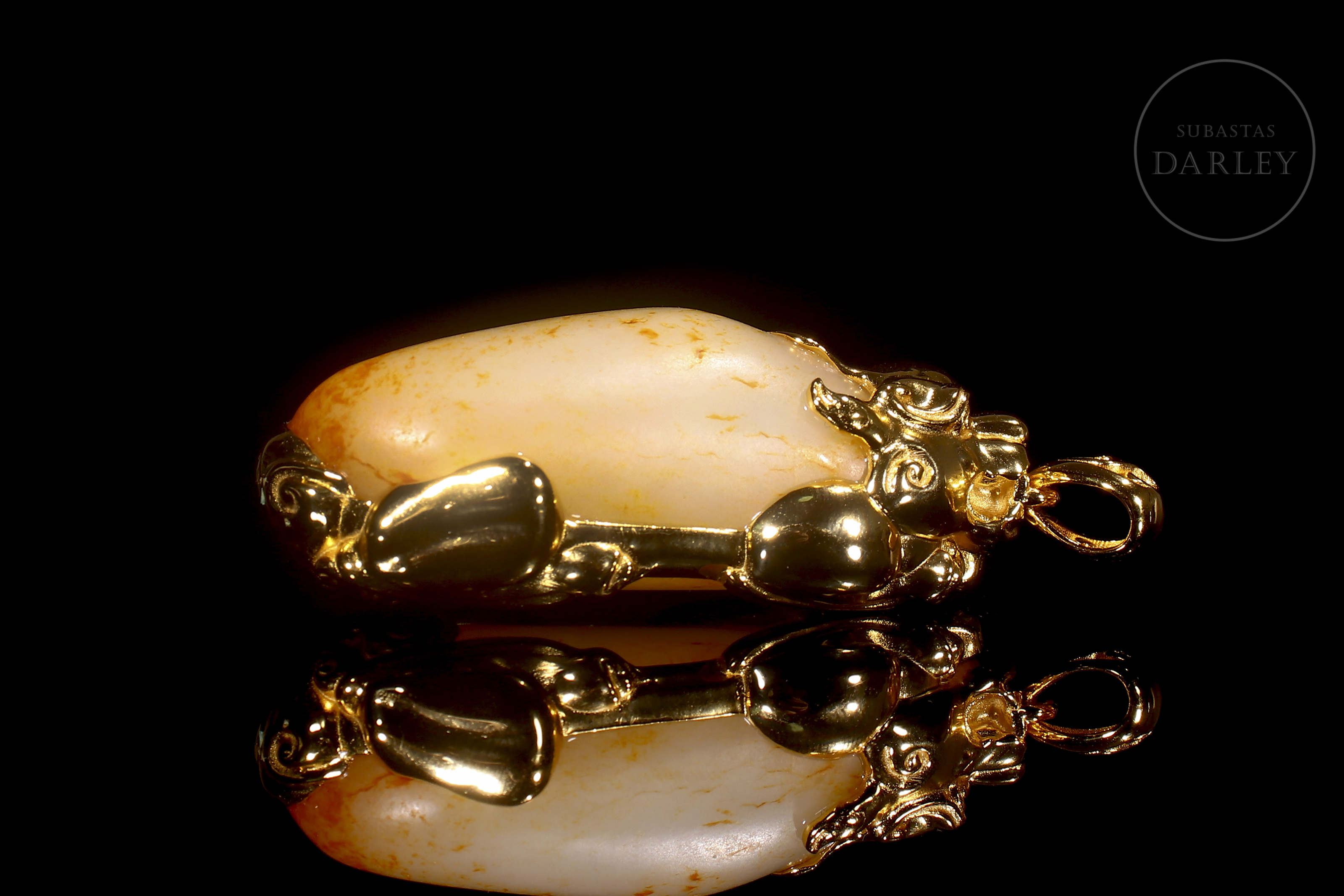 Colgante elaborado en jade de Hetian de tonalidad blanca con piel natural en tonos anaranjados y rojizos, enmarcado en una montura de plata dorada finamente trabajada con motivos de olas voluminosas.