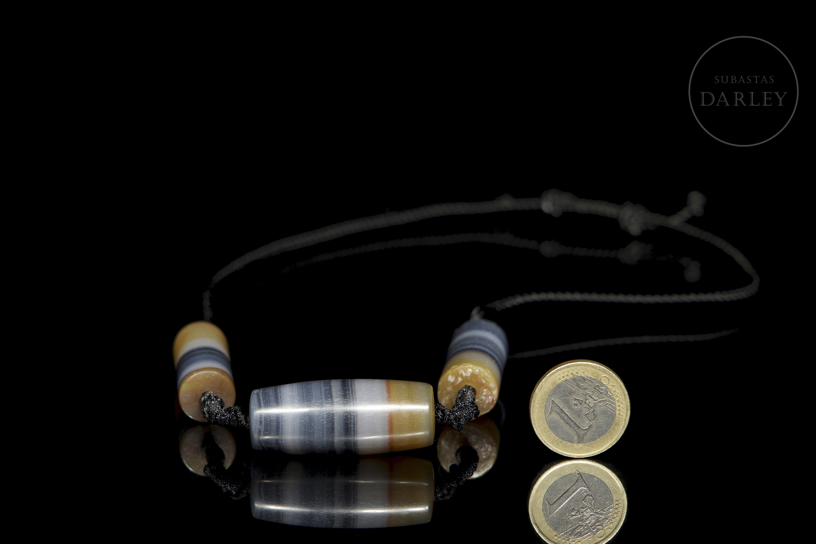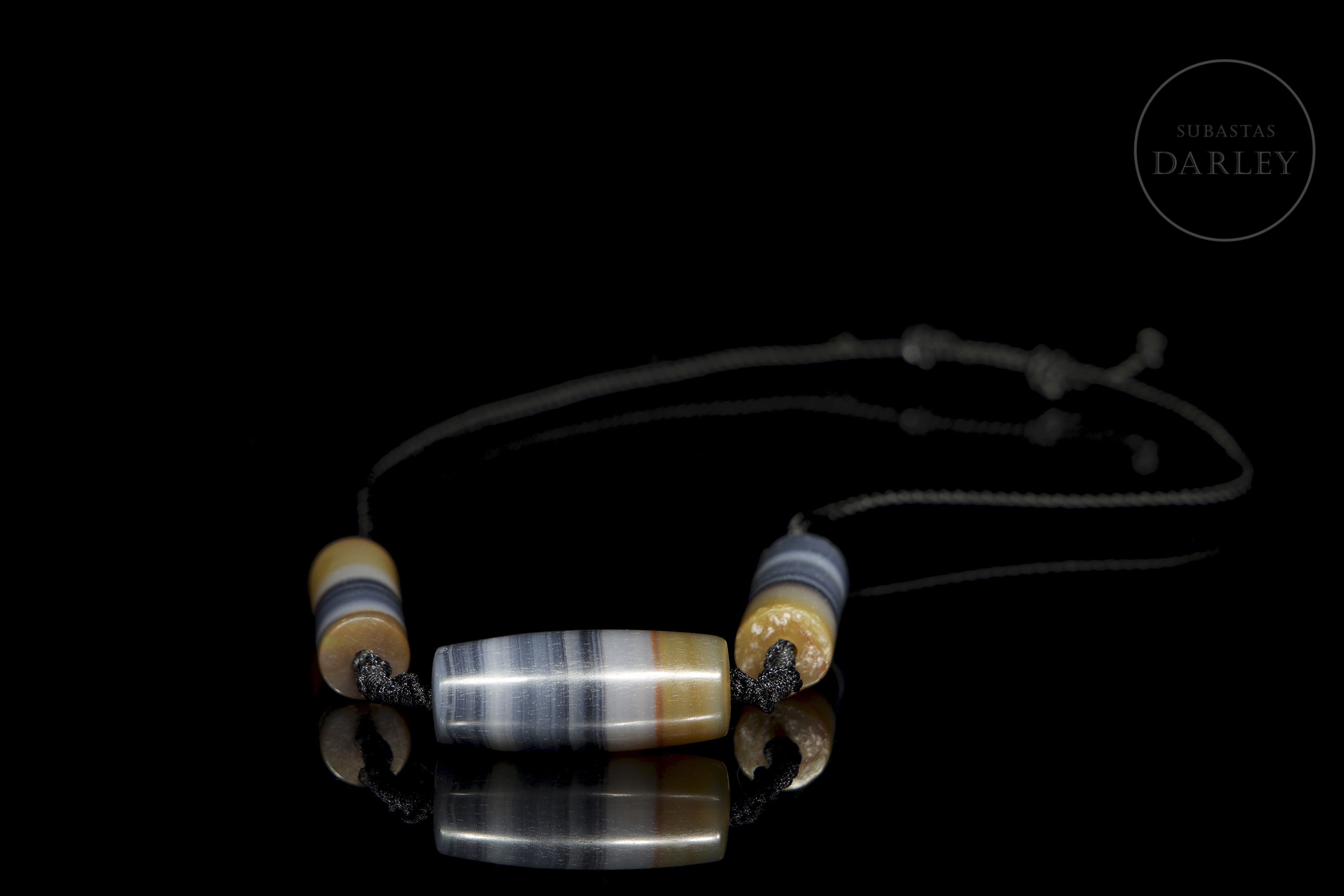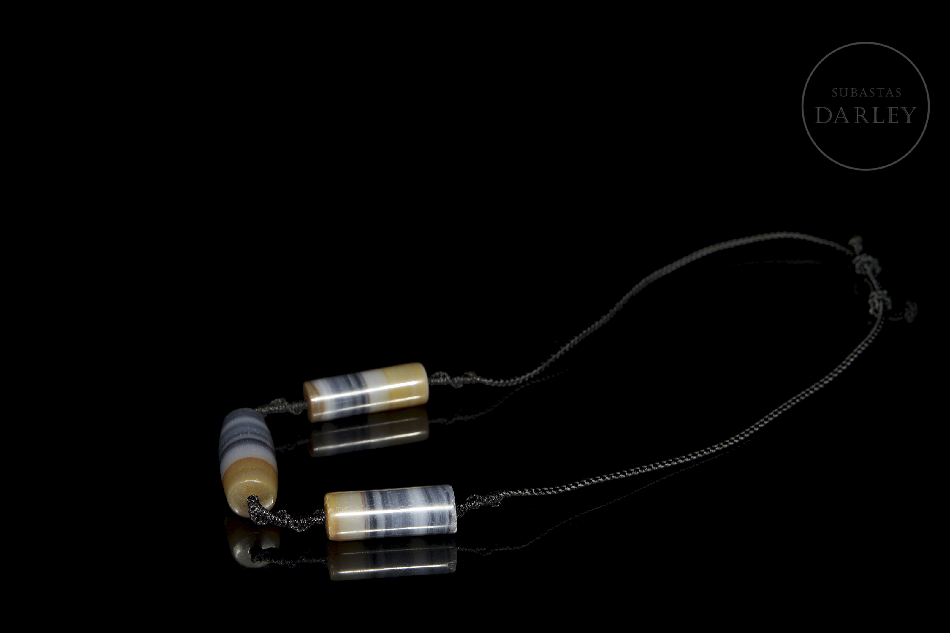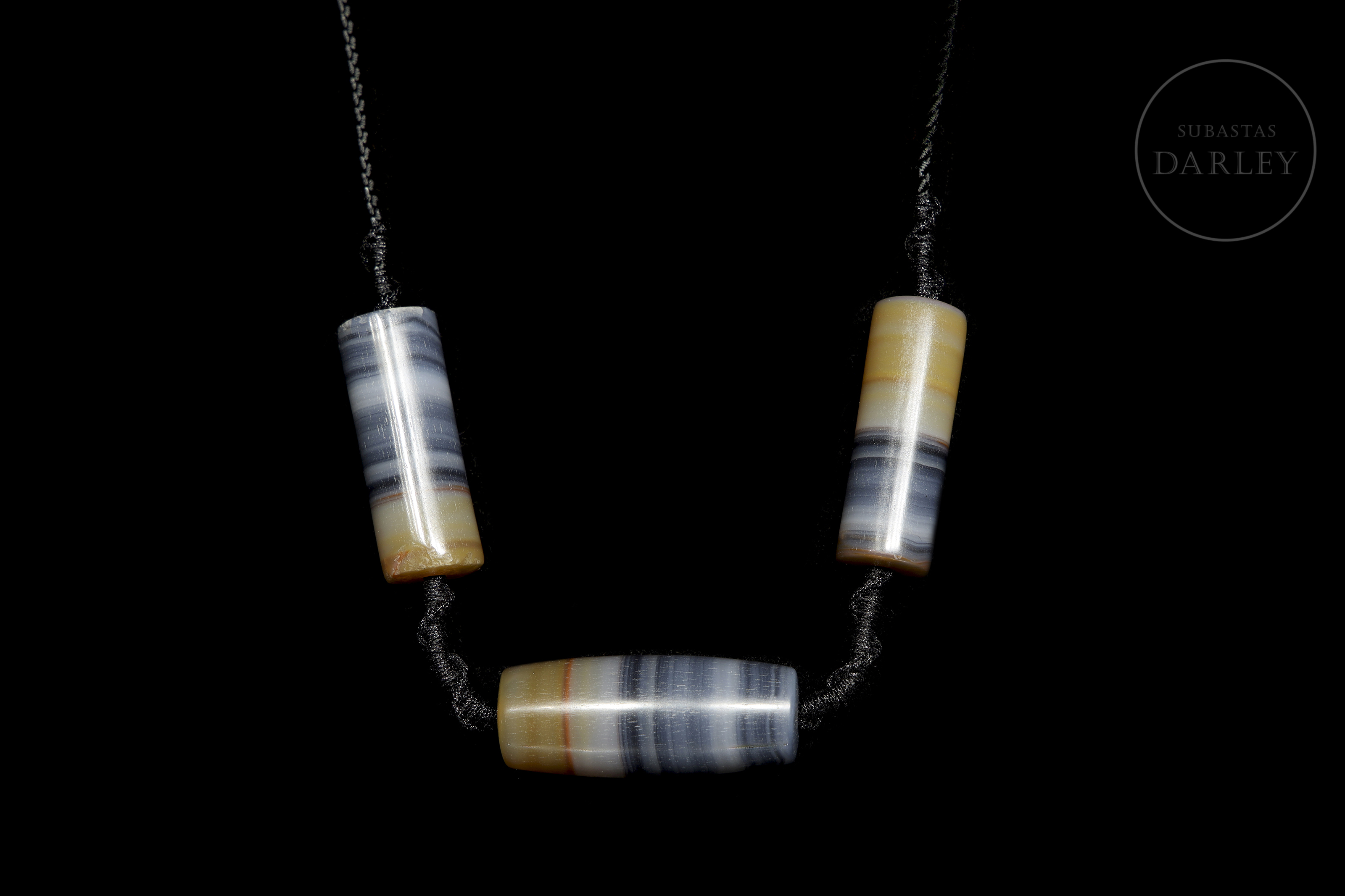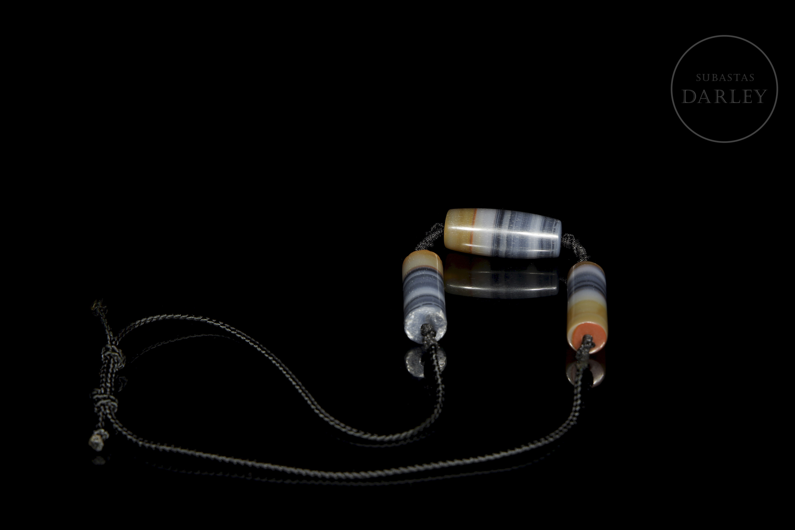 Formado por tres cuentas de ágata en tonos blanco, gris azulado, ocre y marrón. Posee una cuanta central de forma de barril, flanqueada por dos cuentas cilíndricas, todas ellas destacan por sus patrones de líneas paralelas y una perforación central para su ensartado en un cordón trenzado contemporáneo. La superficie exhibe pulido y pátina por antigüedad. Dinastía Liao (916–1125).
