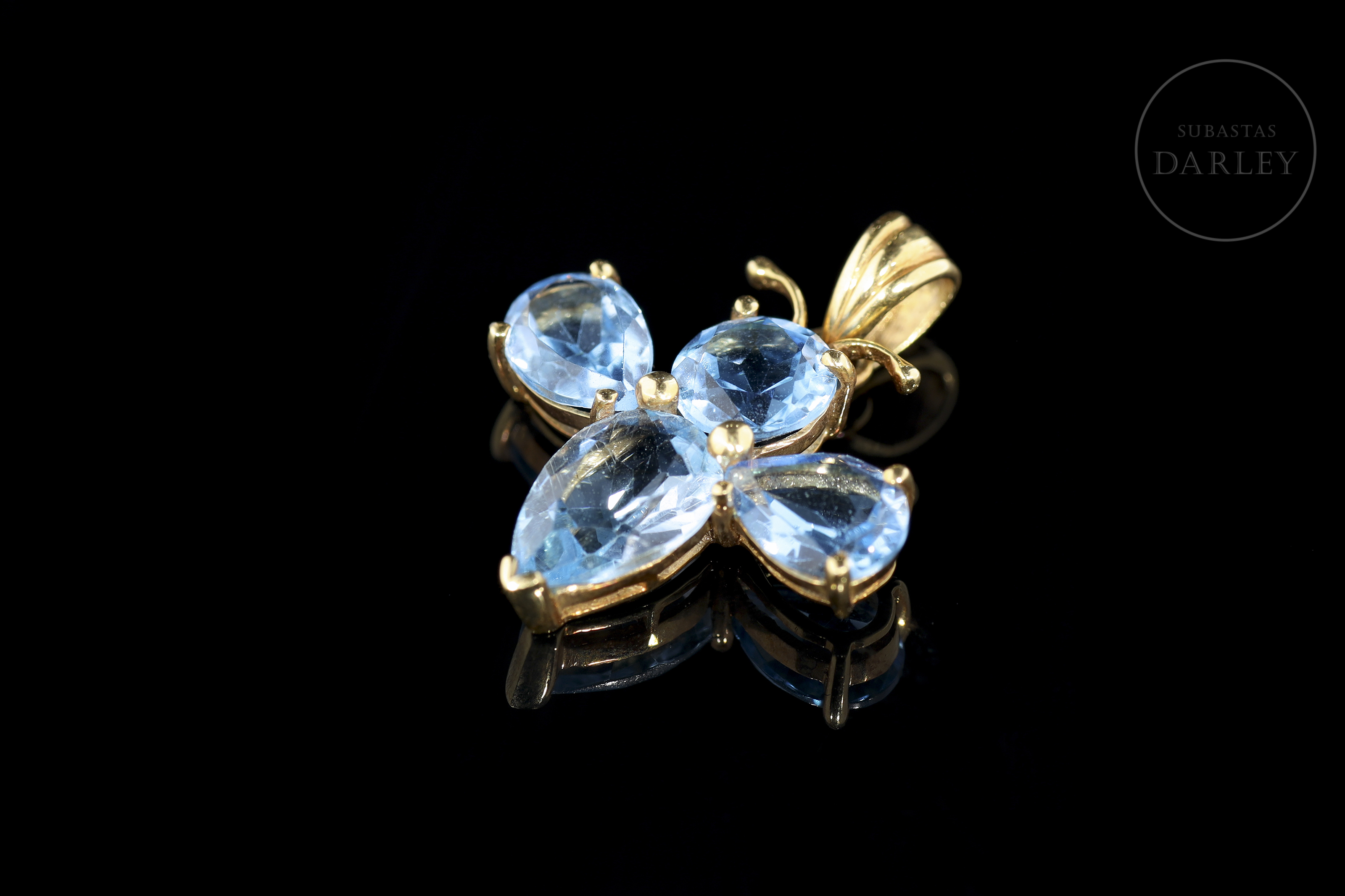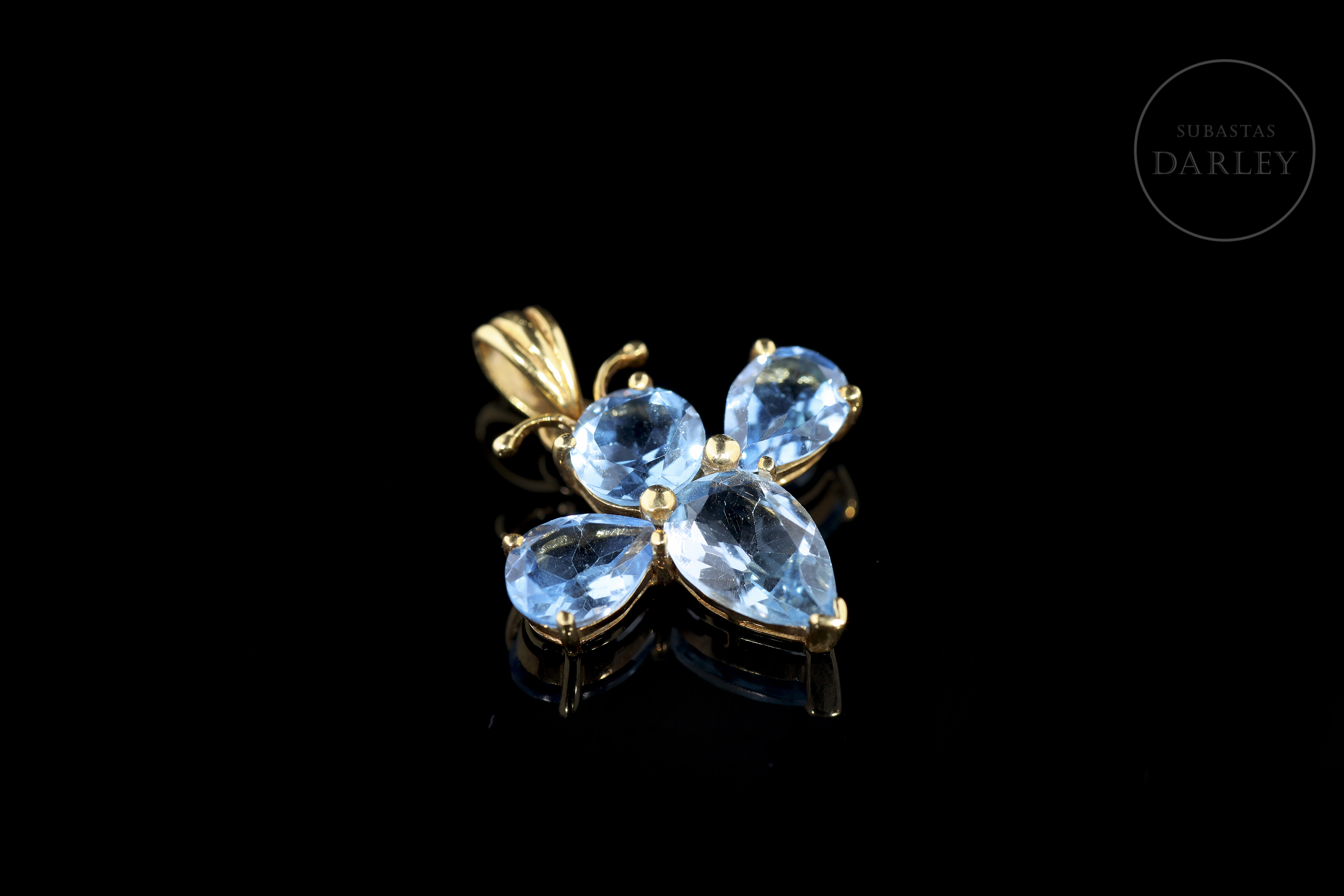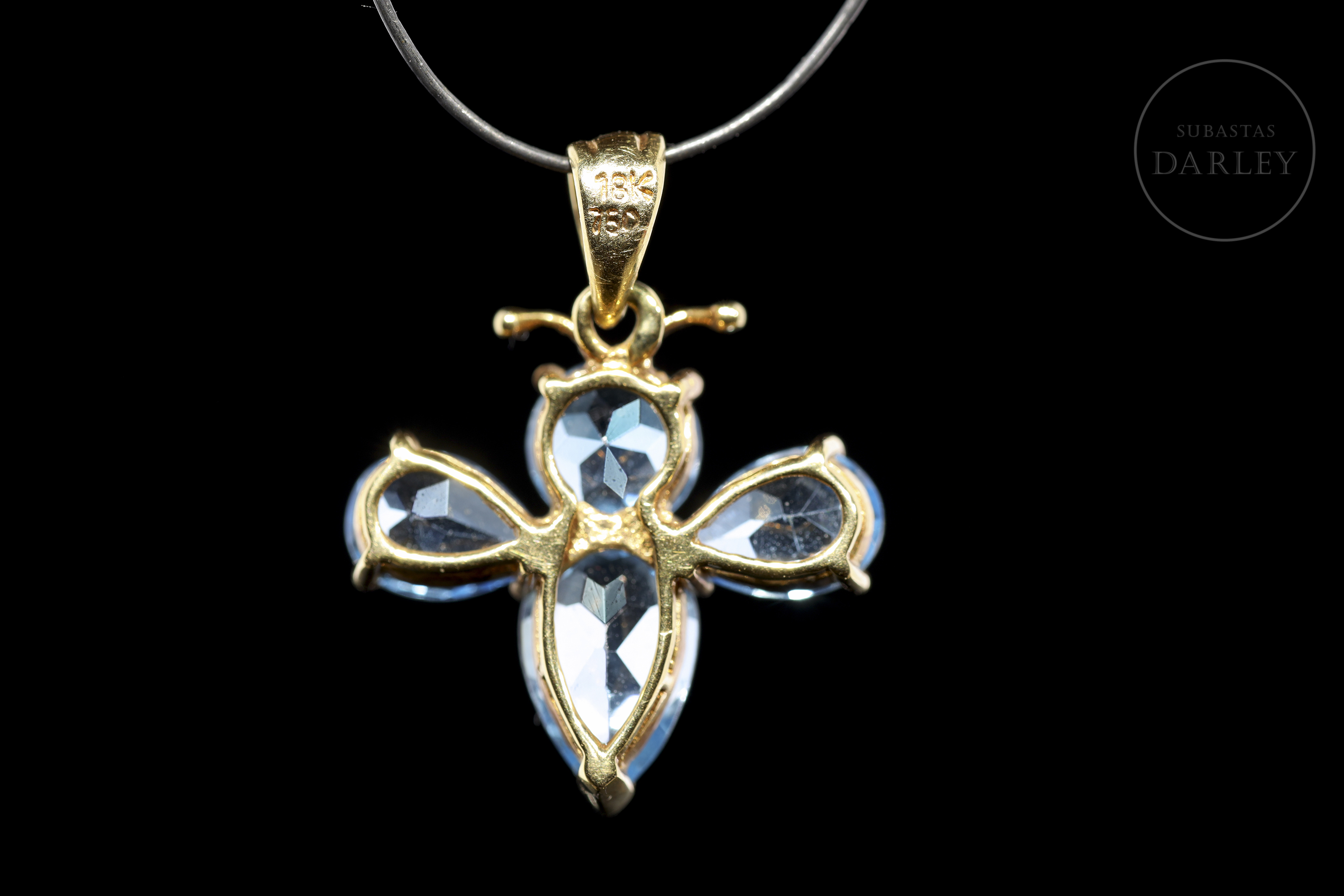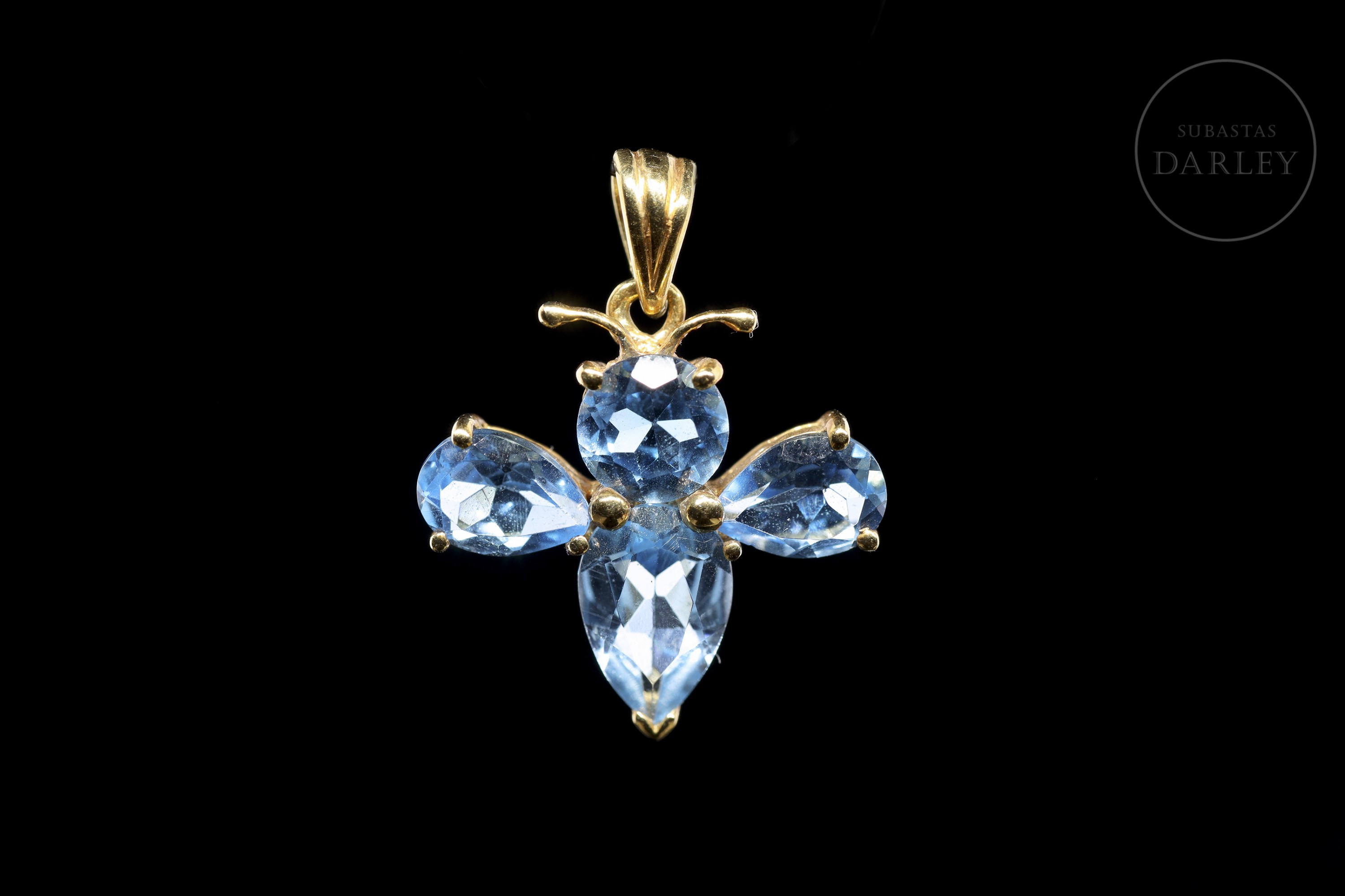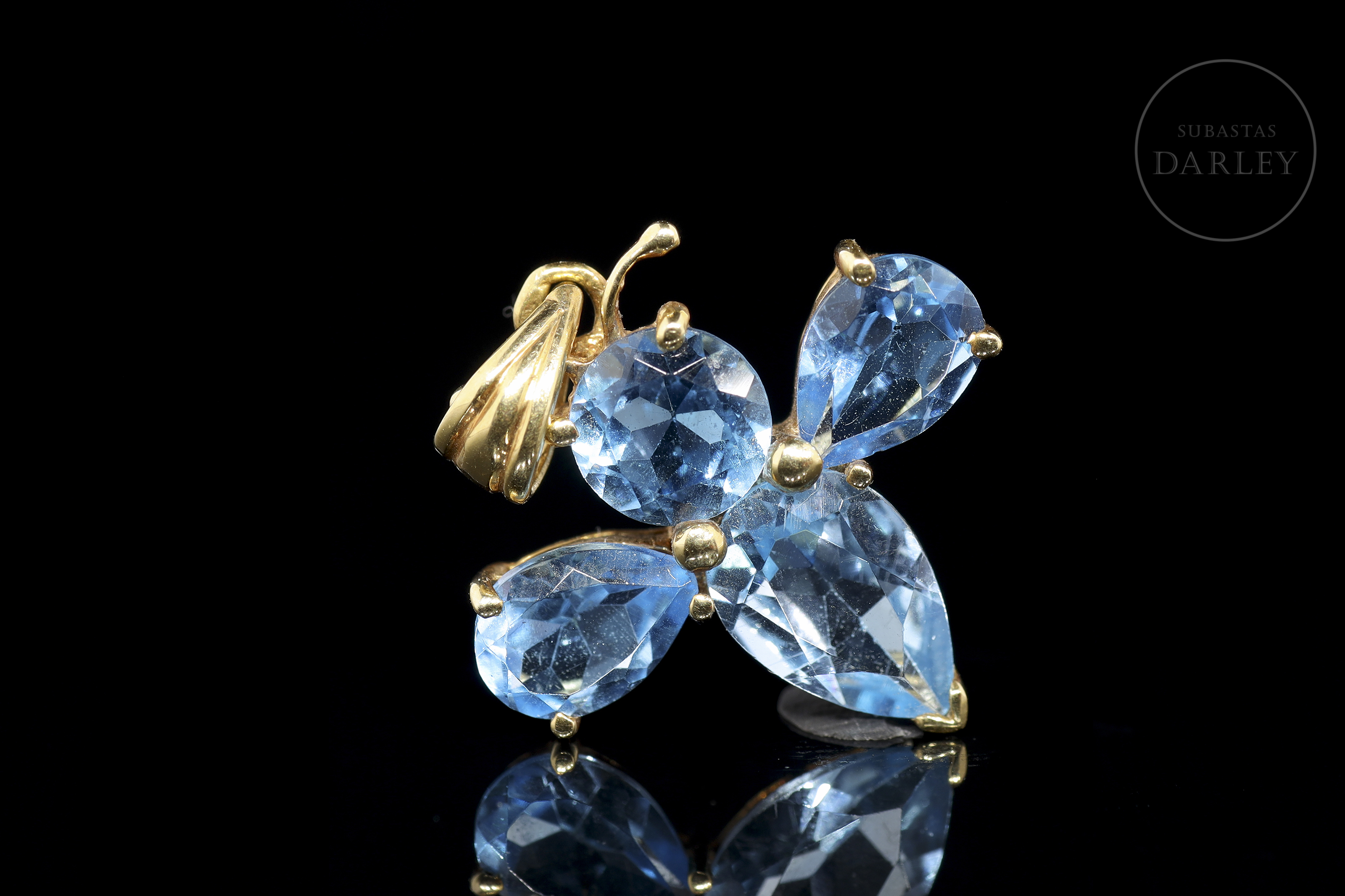 Colgante de forma irregular, similar a una flor de lys, con cuatro topacios en color azul intenso, siento el superior, talla brillante, acompañado por otros tres, talla pera facetada. Se engarzan en garras y presentan un peso total de 3,80 ct.