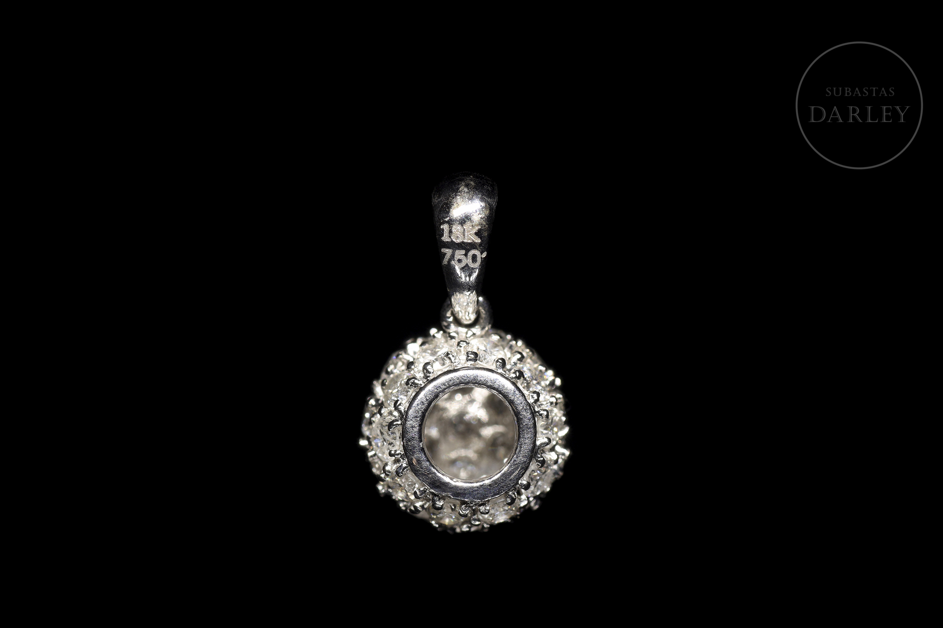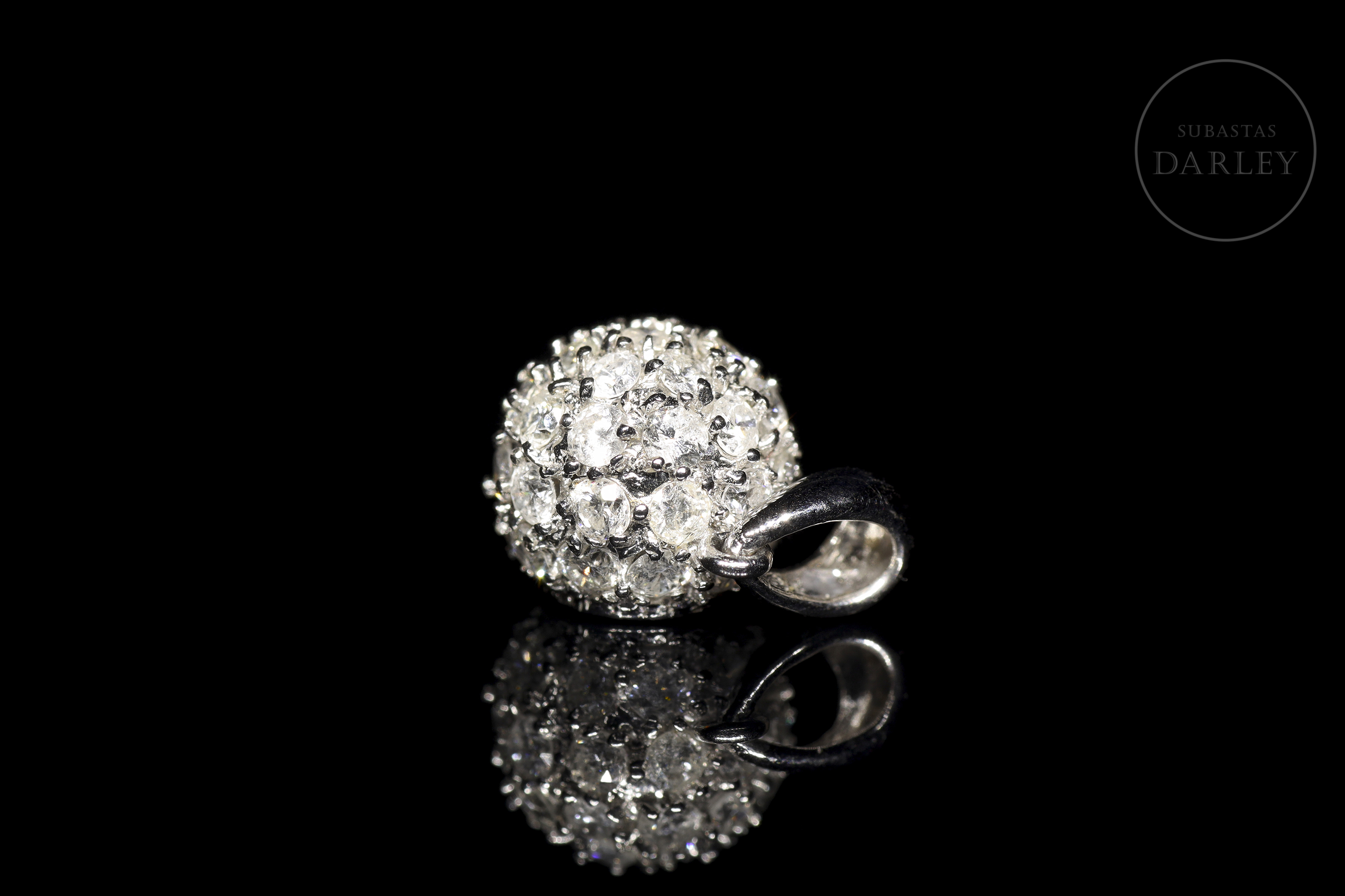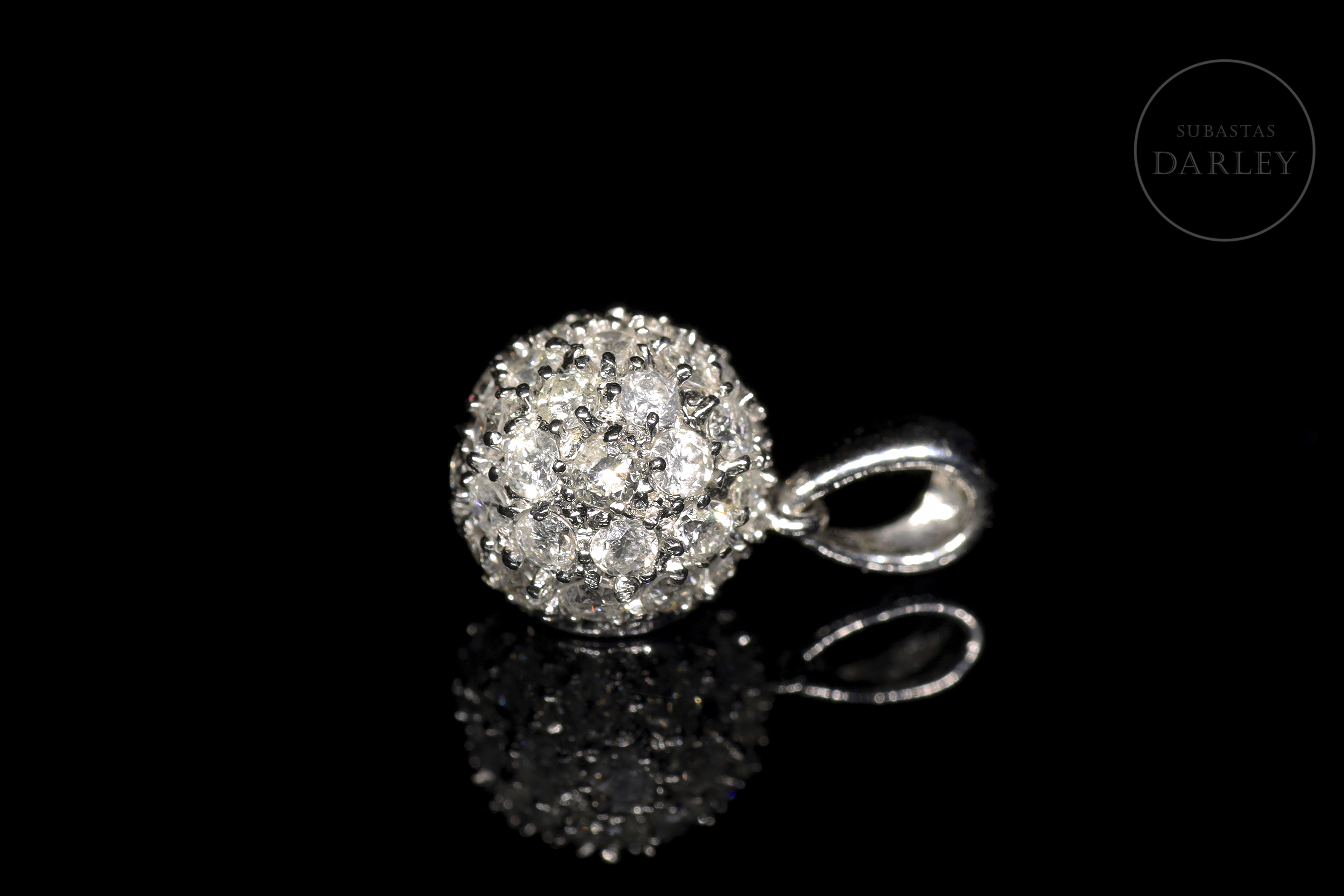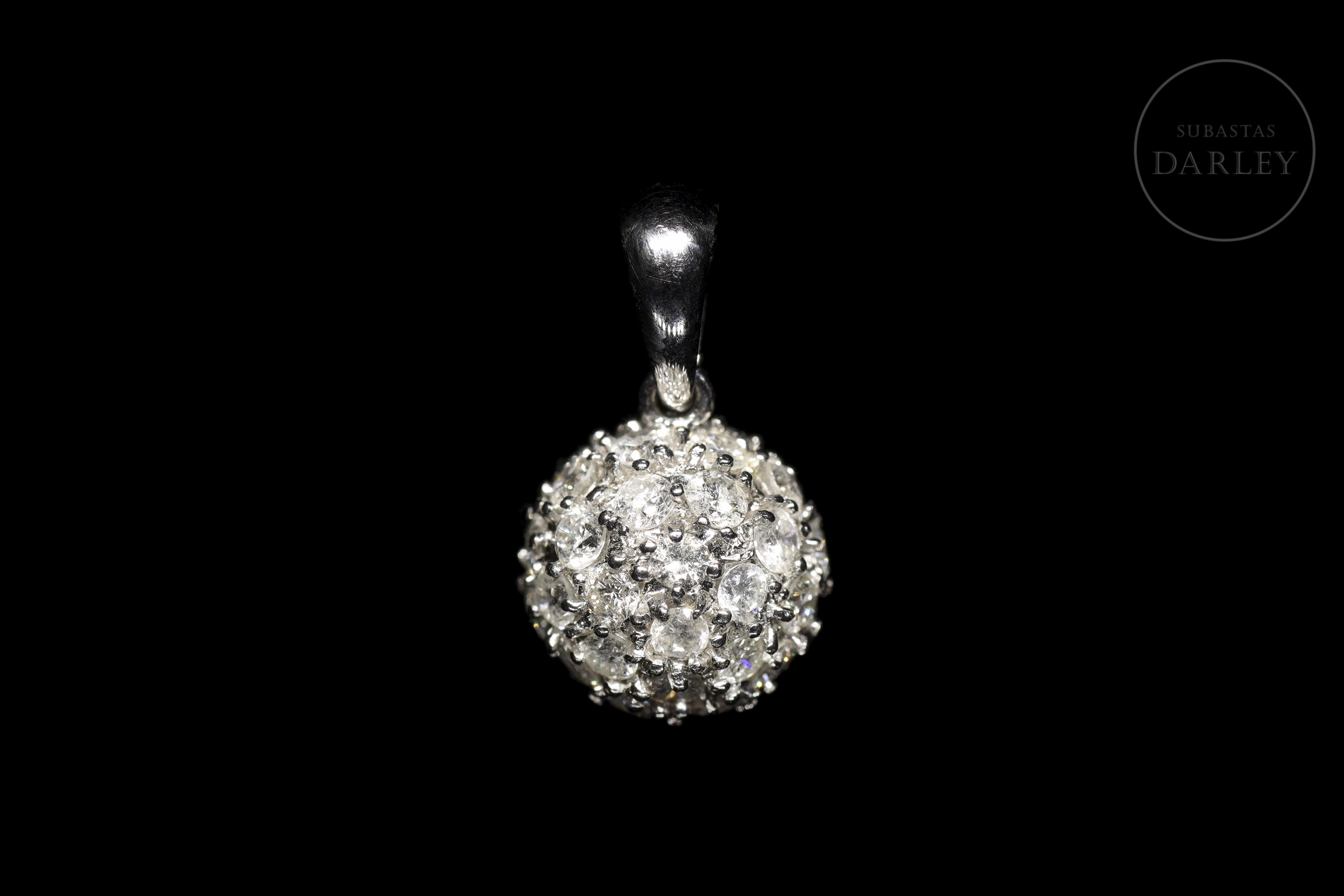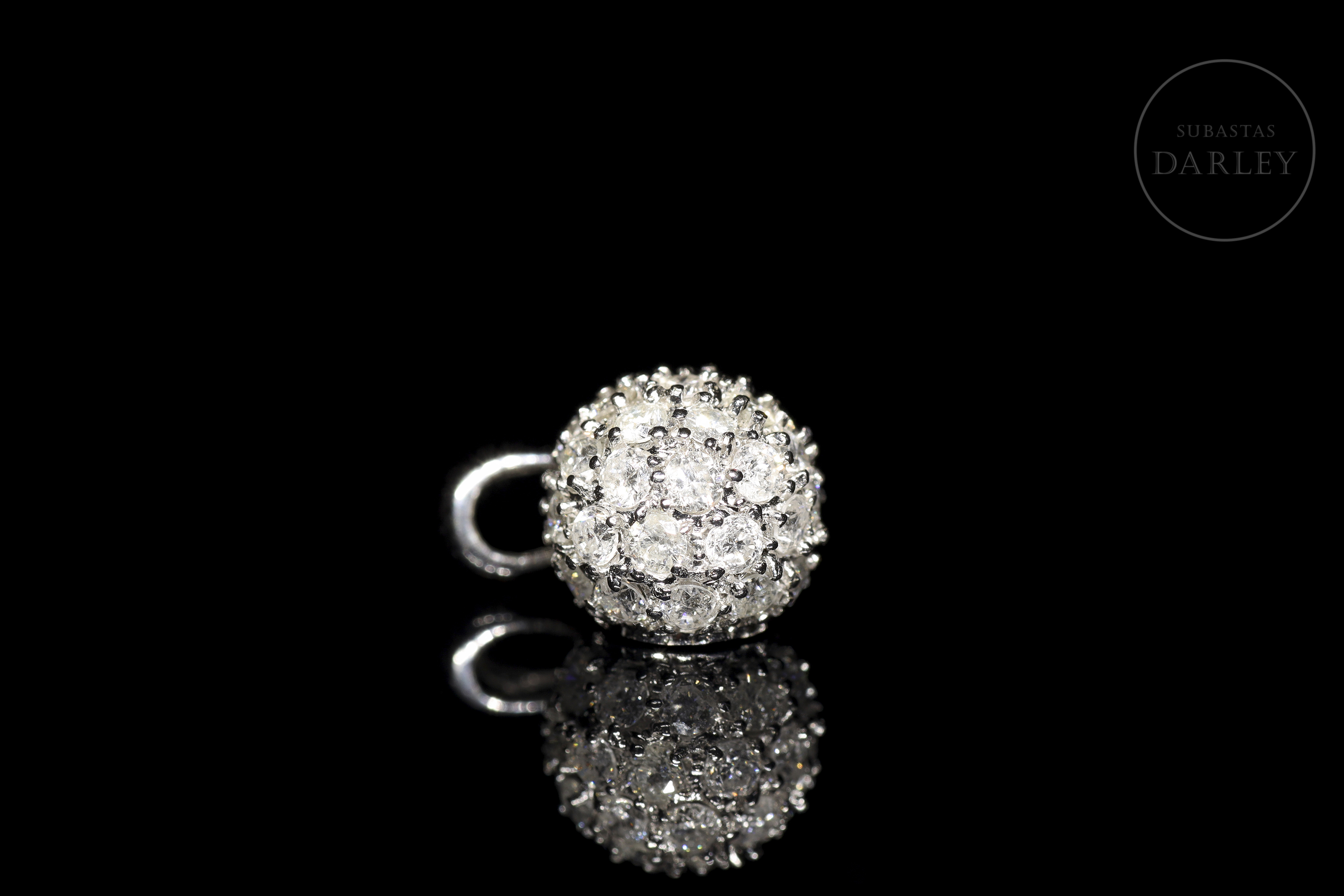 Modelo con diseño de bola, que engarza en grané un total de 38 diamantes, talla brillante, y peso total 0.97 ct. Presenta una apertura delimitada por un bisel en brillo. Pende de un asa de cuña lisa. Color H, Calidad SI.