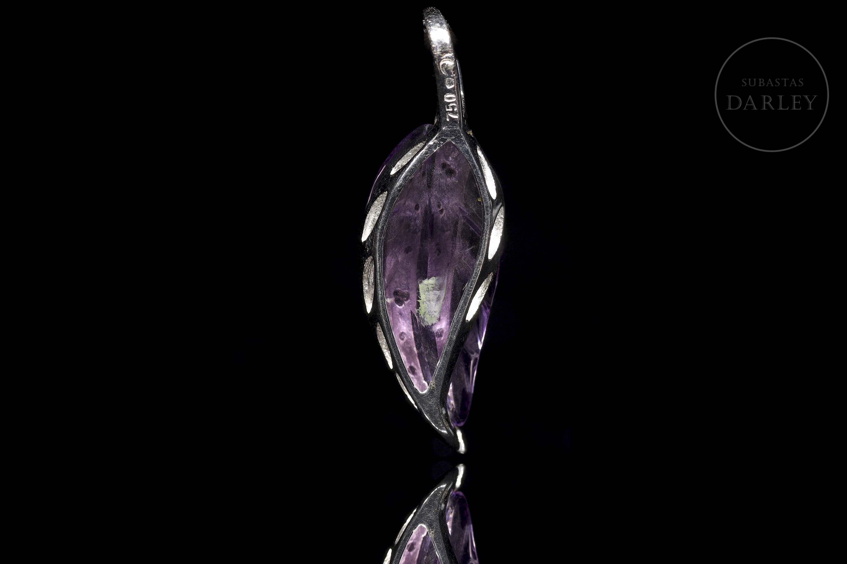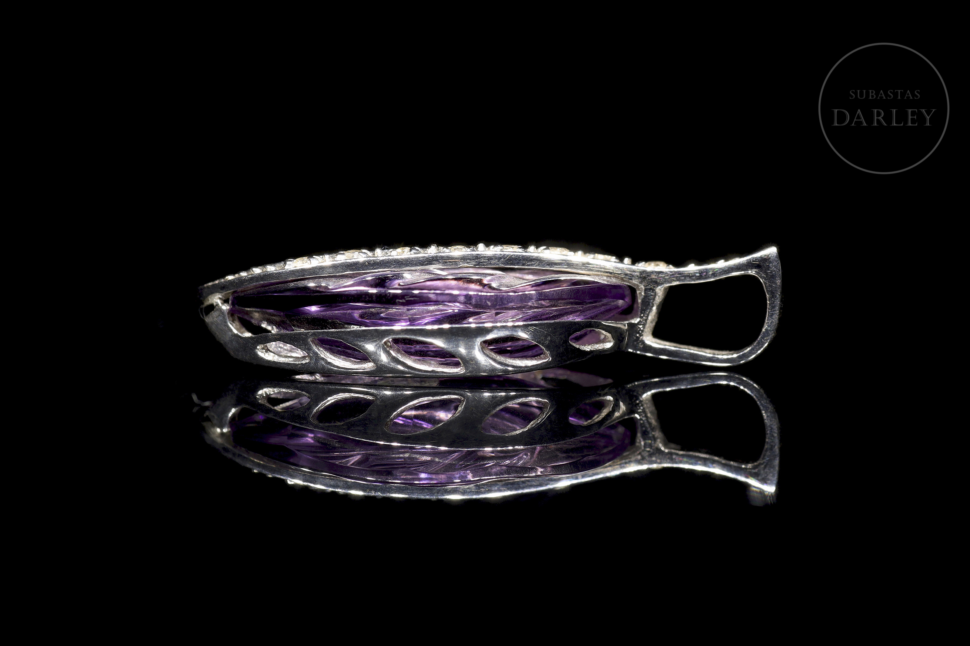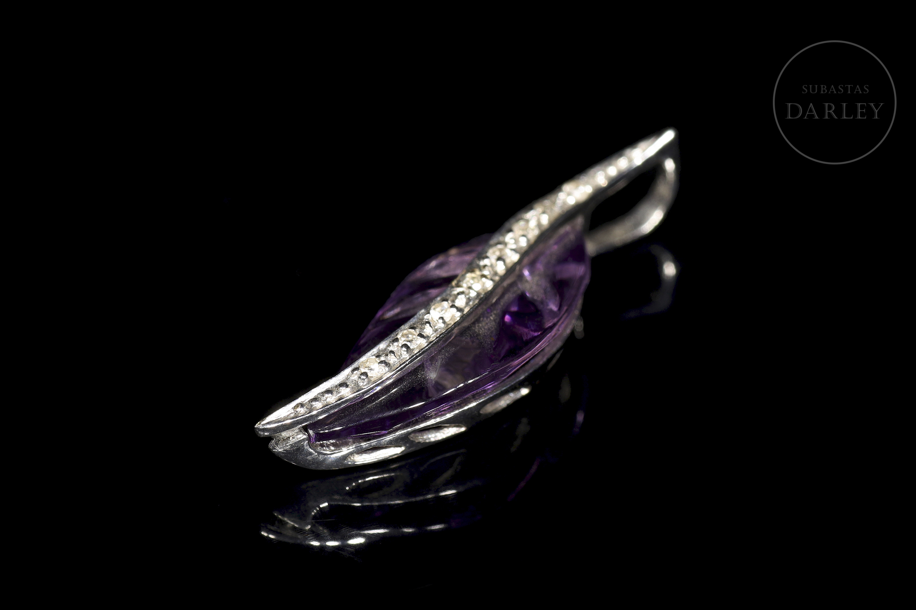 Oro blanco de 18k con diseño en forma de hoja. Centrado por una amatista de 7,52 ct con surcos que simulan ramificaciones. Un carril ondulado con 8 diamantes talla brillante, engarzados en garra, recorre la pieza y se prolonga para formar un asa oculta.