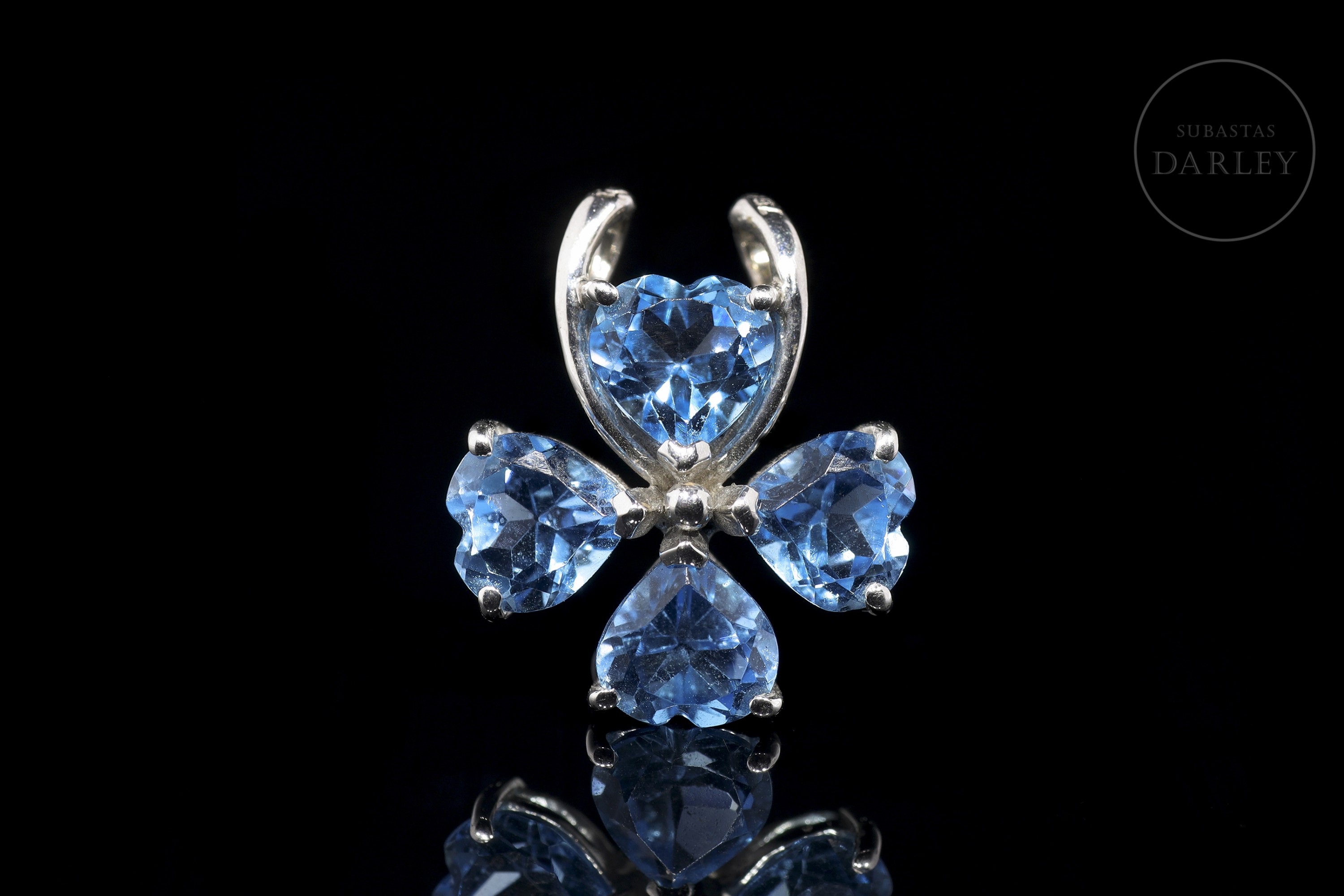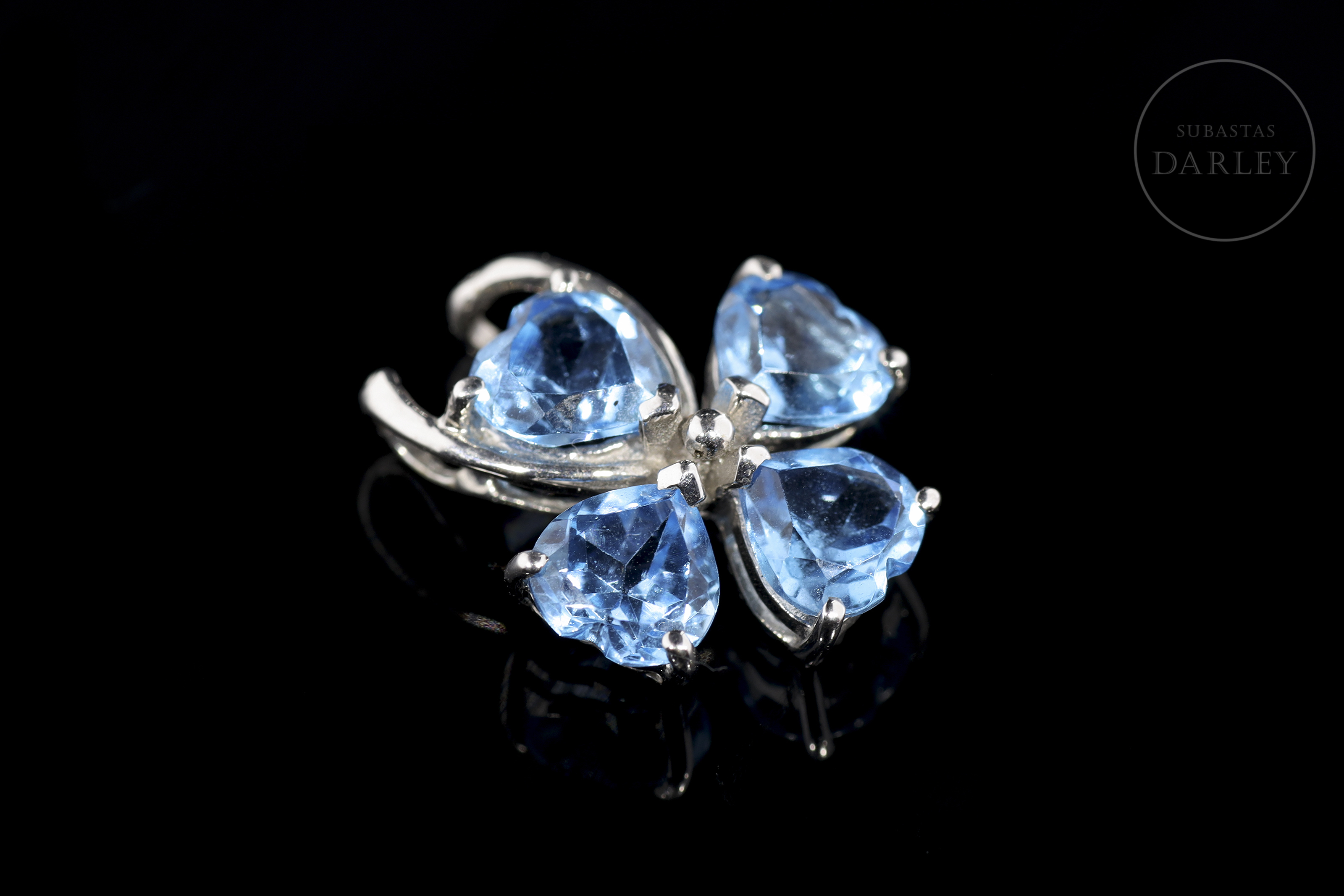 Bonito modelo de diseño floral a cuyos pétalos dan forma 4 topacios en talla corazón de peso global 3.59ct, que se engarzan en garras. Traza una original asa abierta que actúa a su vez de bisel del pétalo superior.