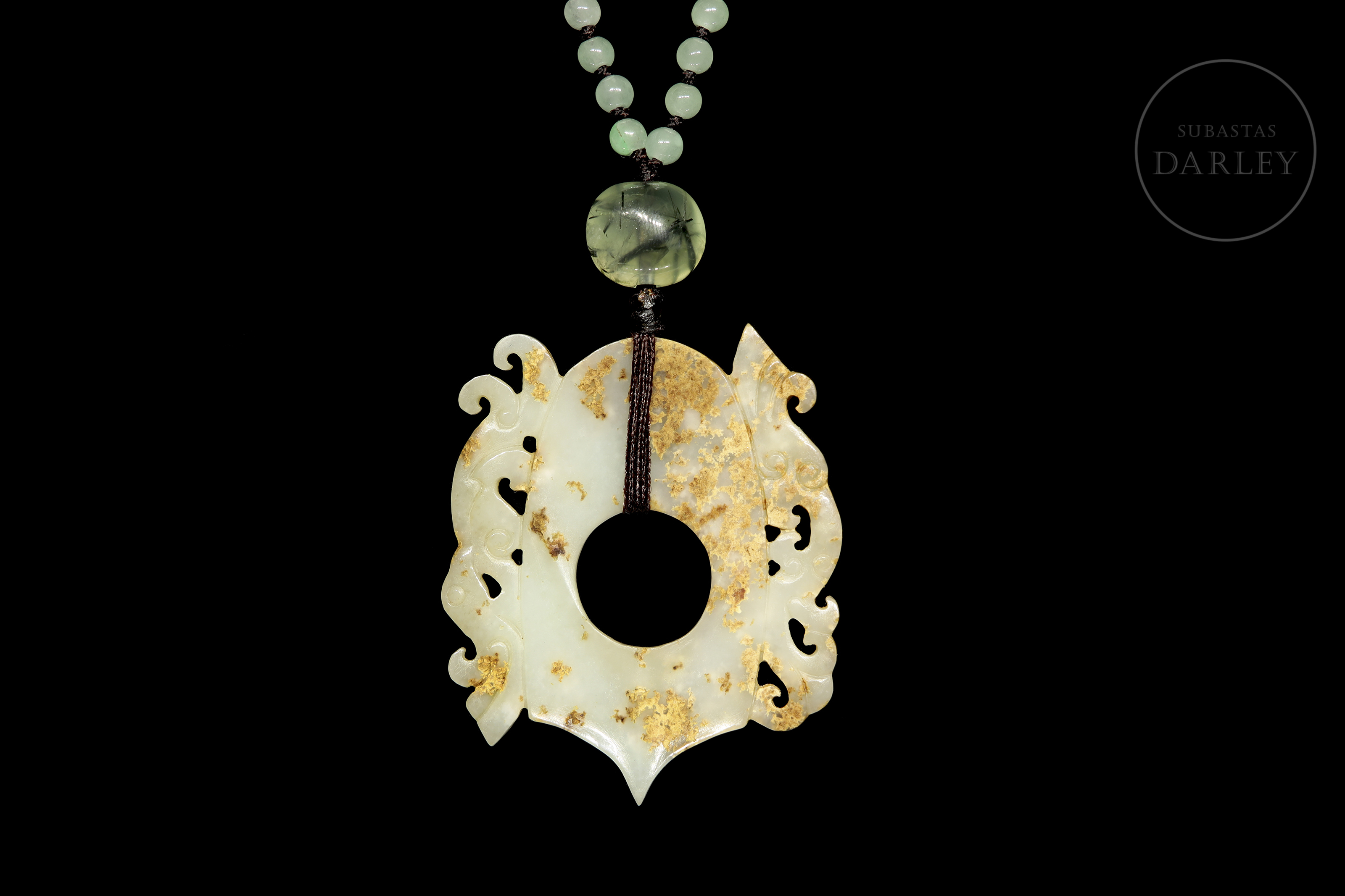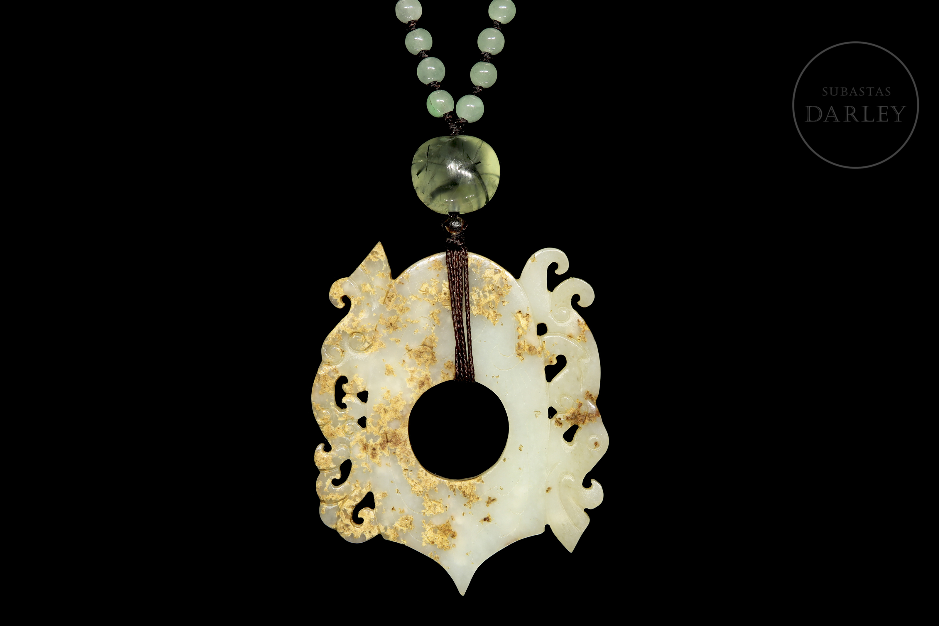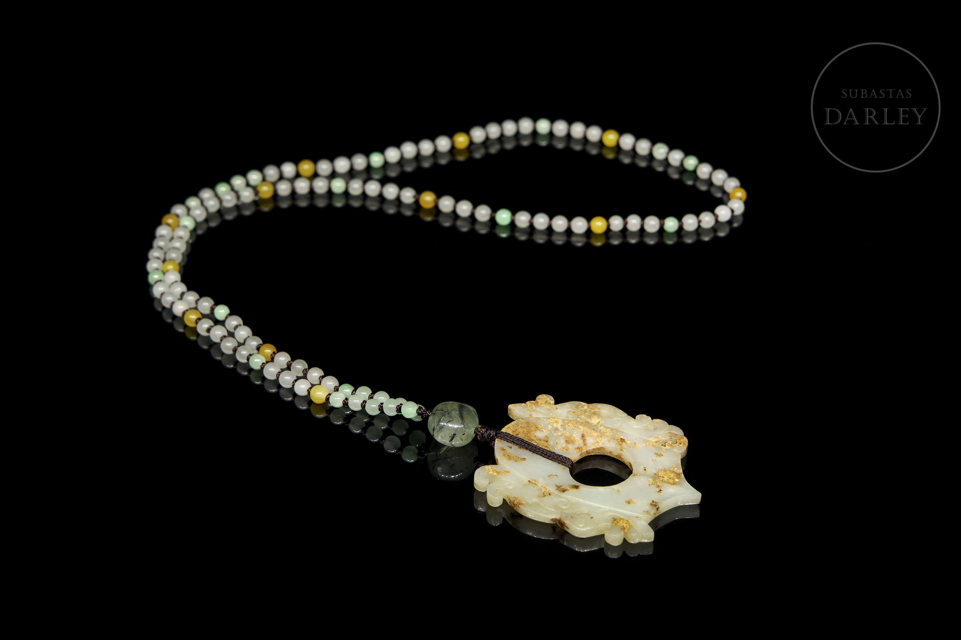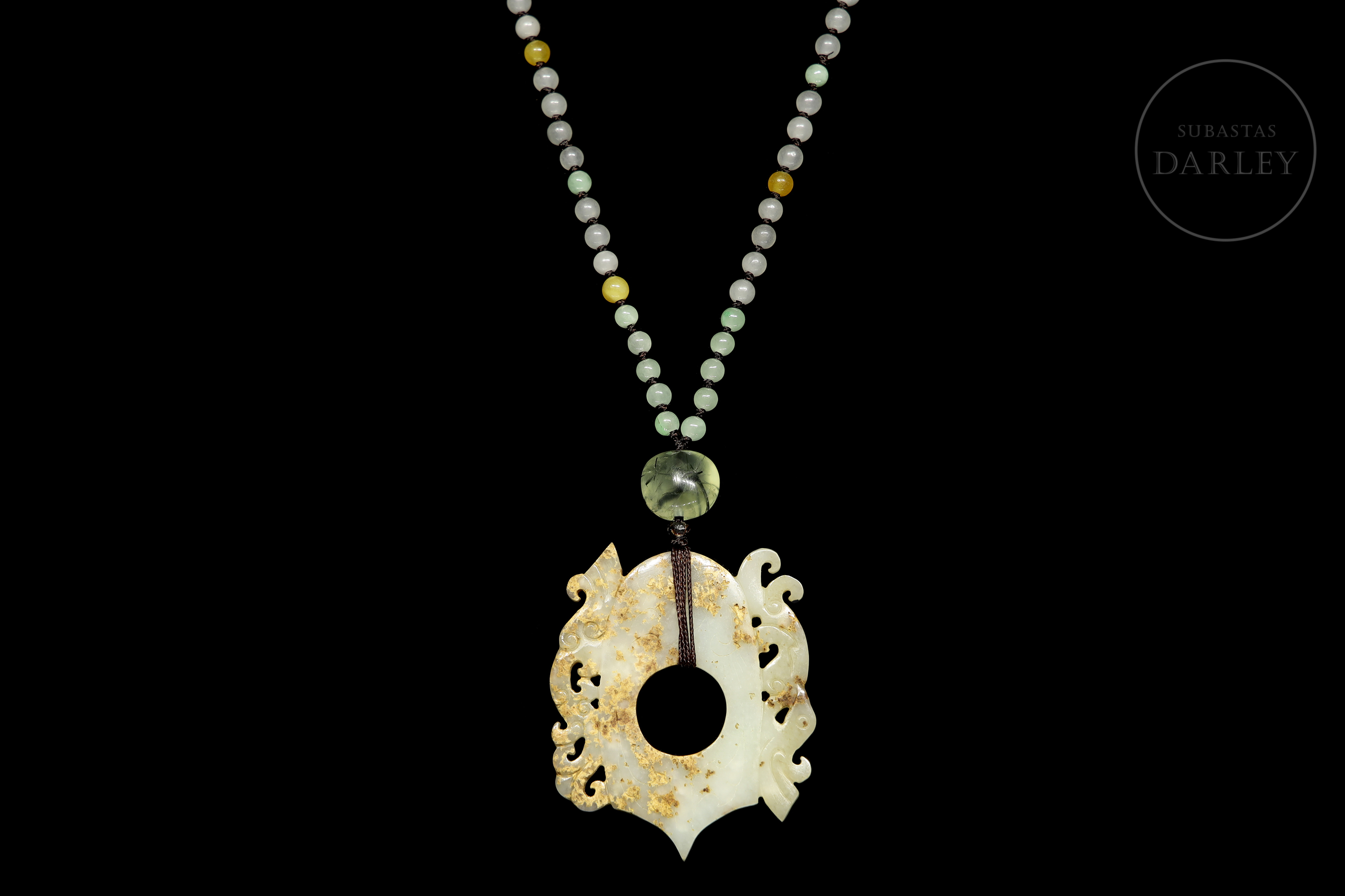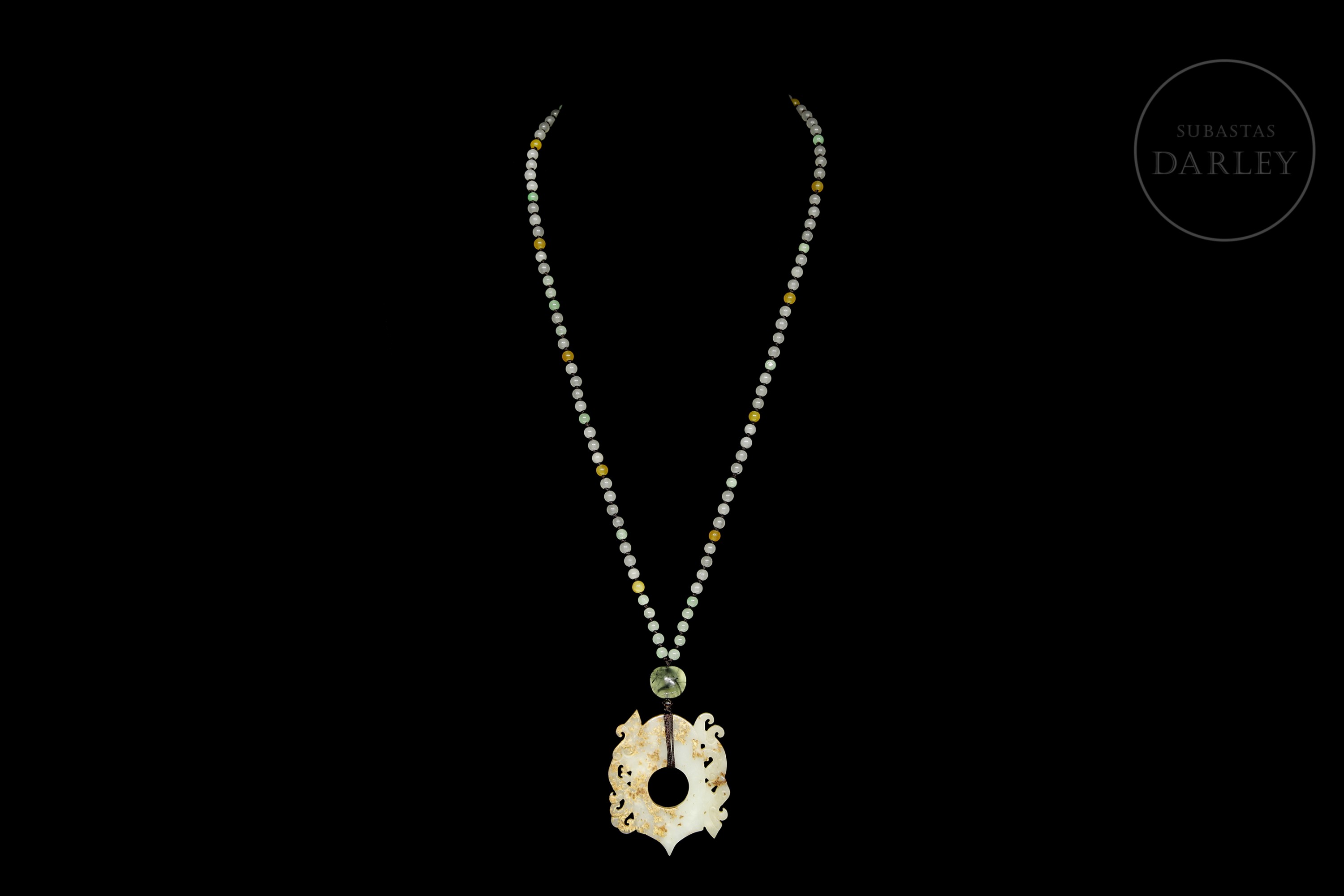 Collar, compuesto por un colgante central de jade de tono pálido. La morfología es plana y presenta una ornamentación de talla calada que representa dos bestias míticas dispuestas simétricamente y detalles incisos en el cuerpo del jade. El colgante pende de un cordón formado por una hilera de pequeñas cuentas polícromas de vidrio o piedra.