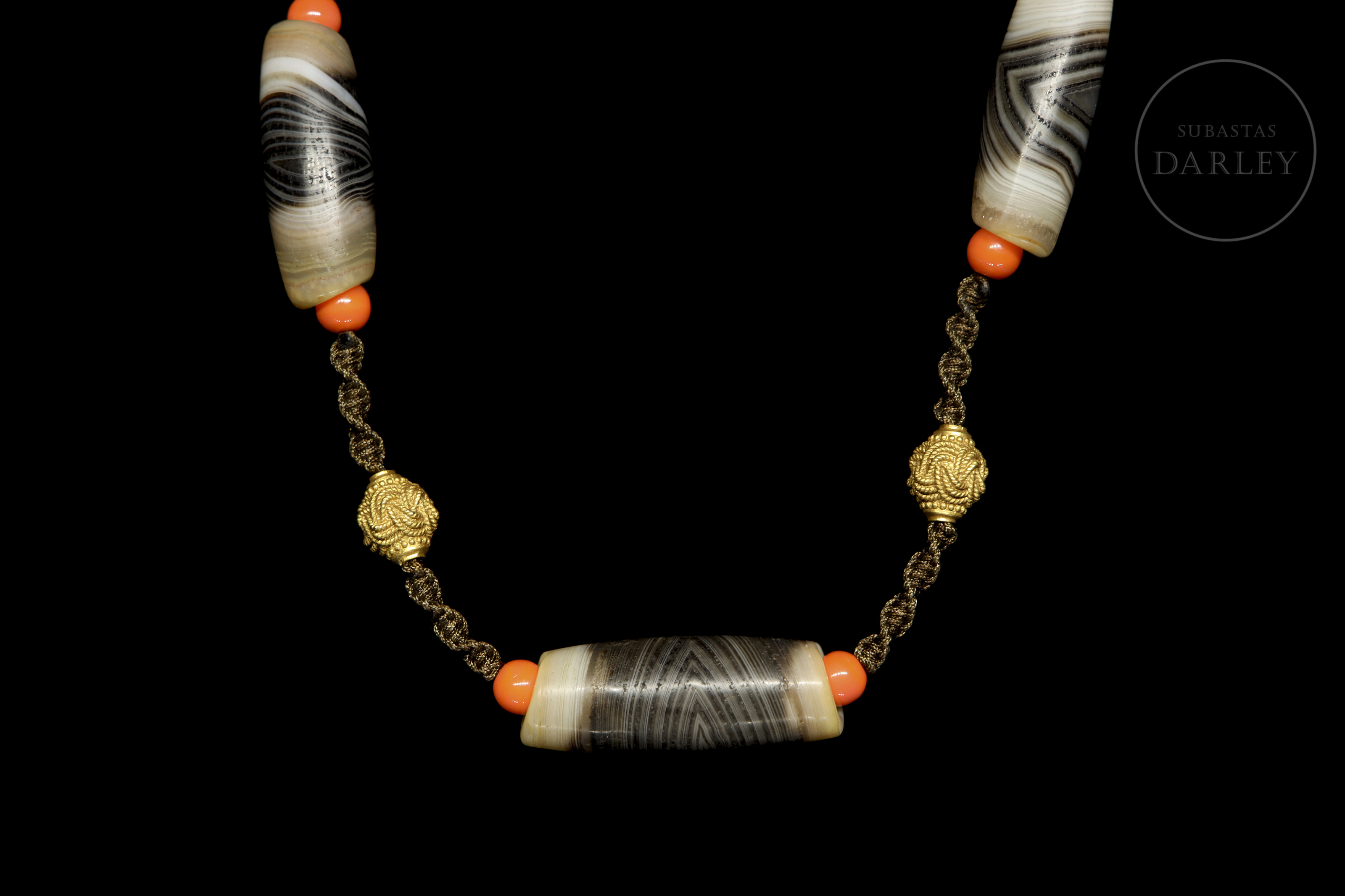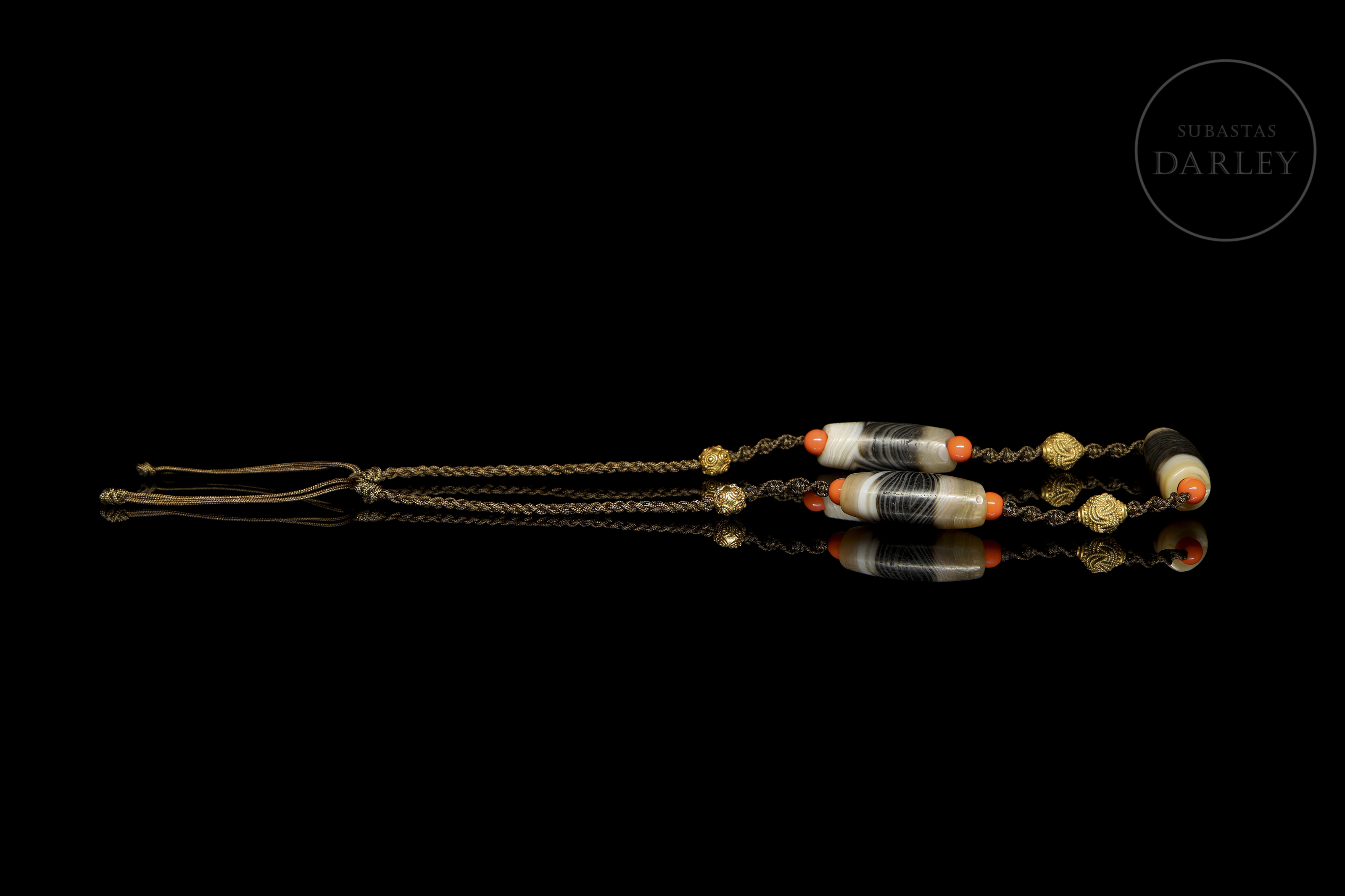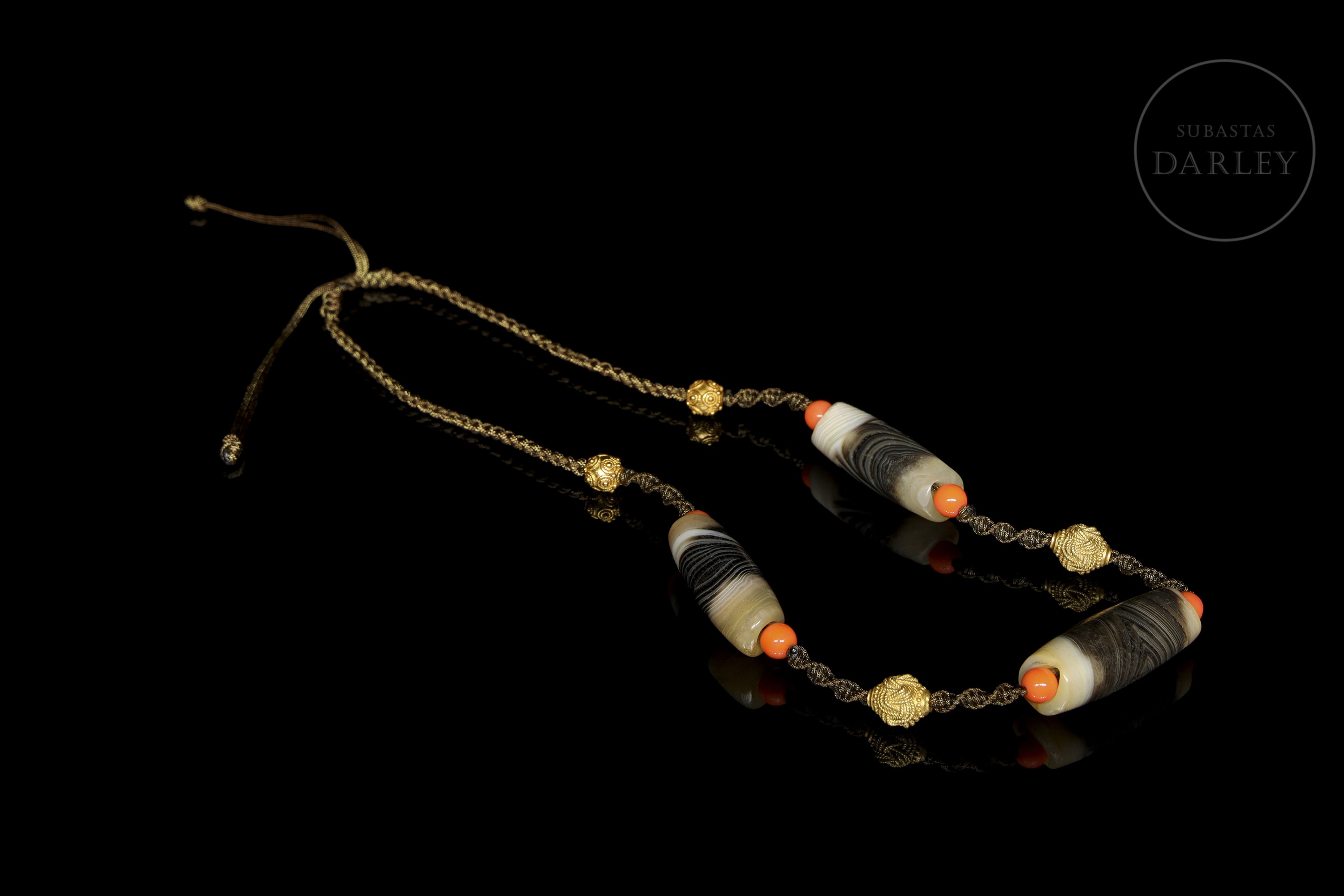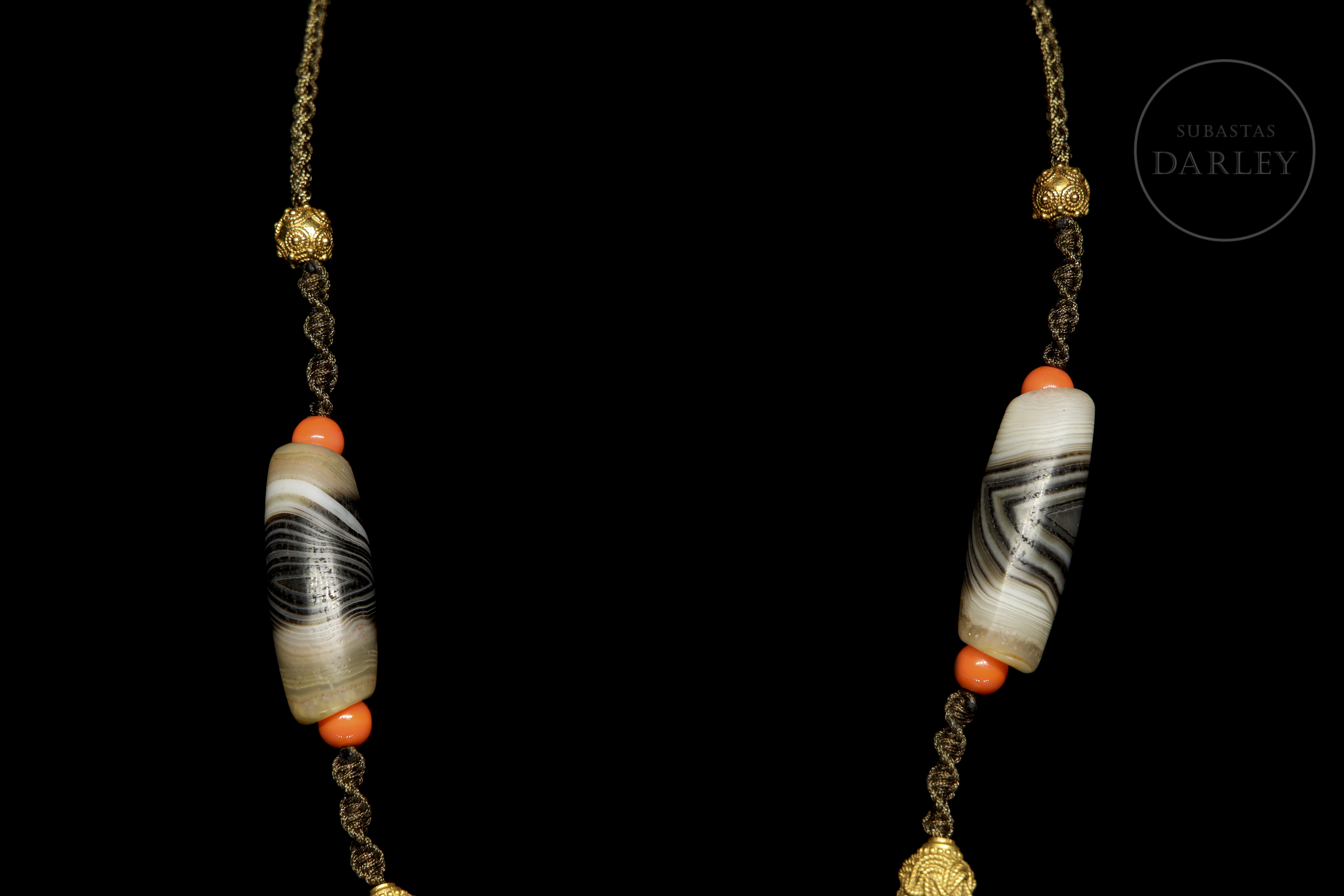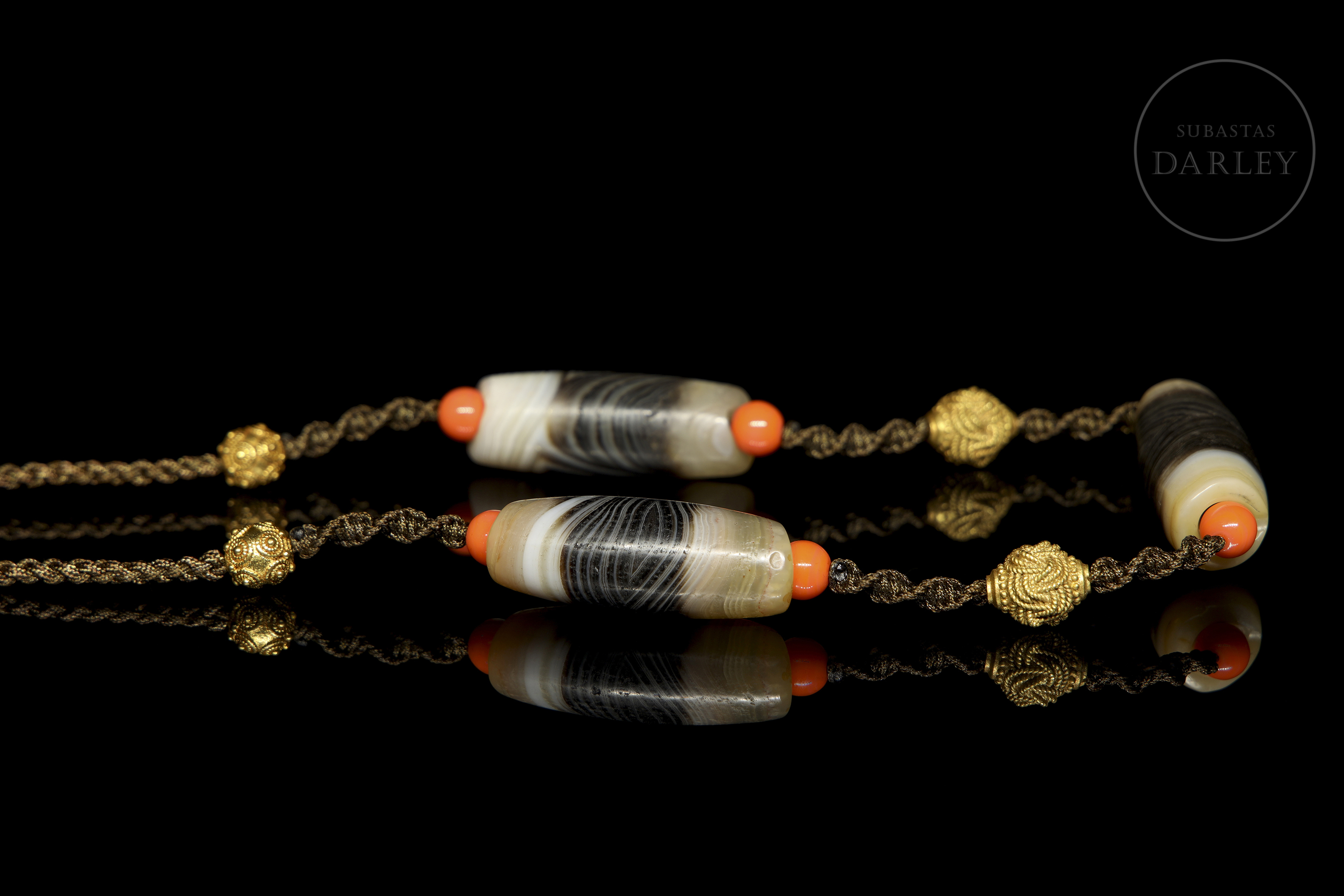 Collar montado sobre un cordón trenzado de color marrón. Se compone de tres grandes cuentas Dzi de ágata veteada natural, en forma de barril, que muestran bandas concéntricas en tonos blancos, grises y negros. Se intercala con cuentas esféricas de bronce dorado con trabajo de filigrana y pequeñas esferas de color coral. Tíbet, s.XV.