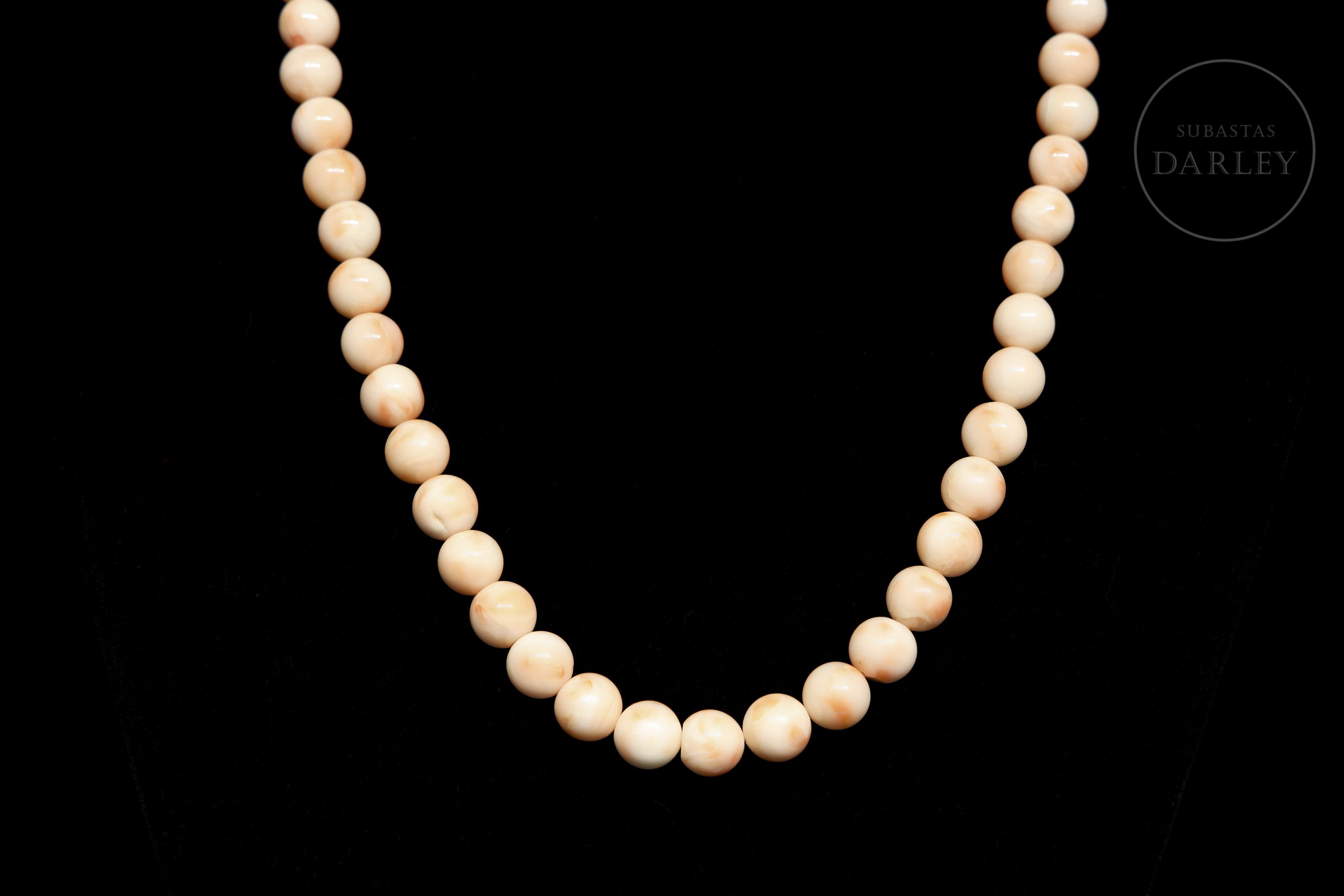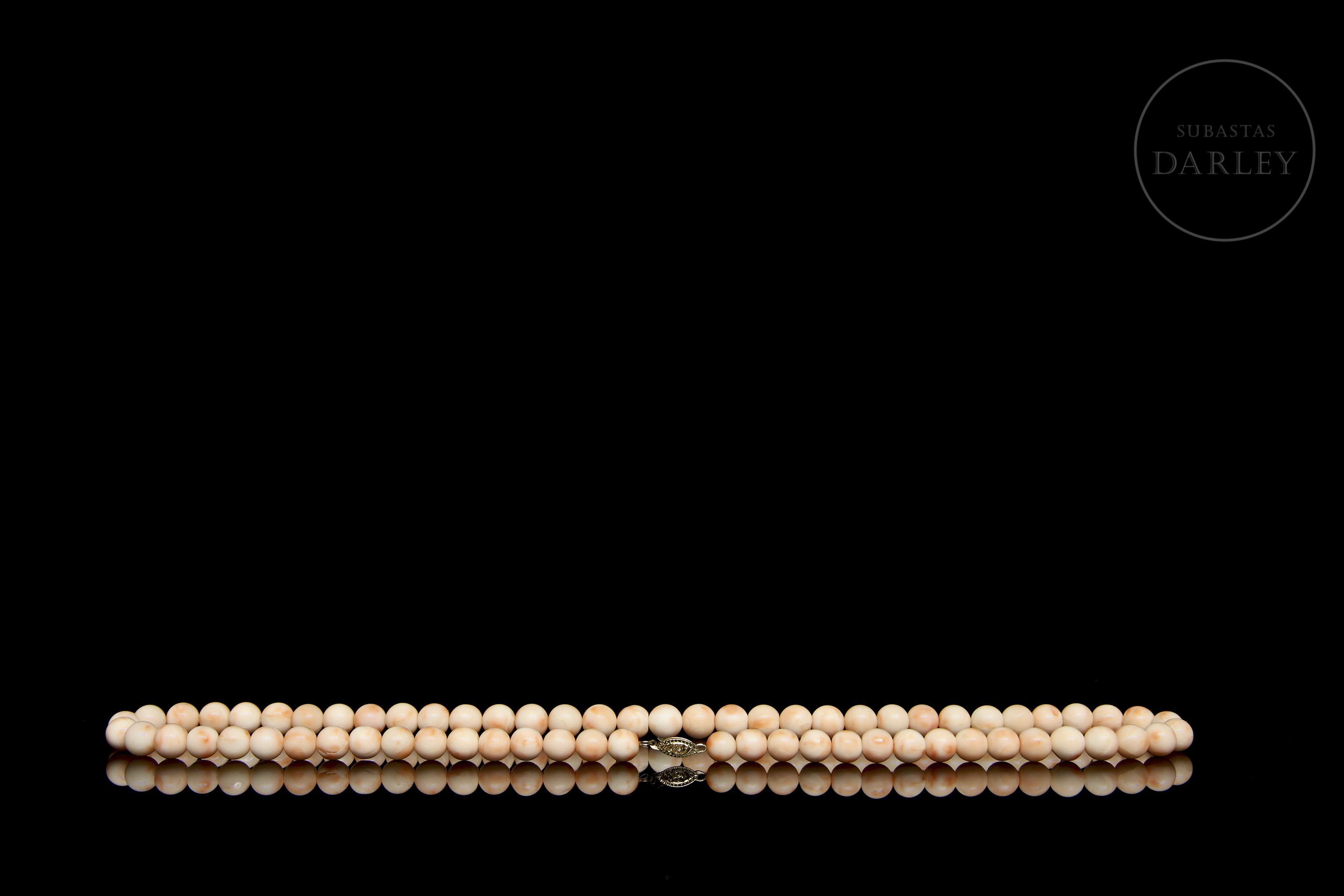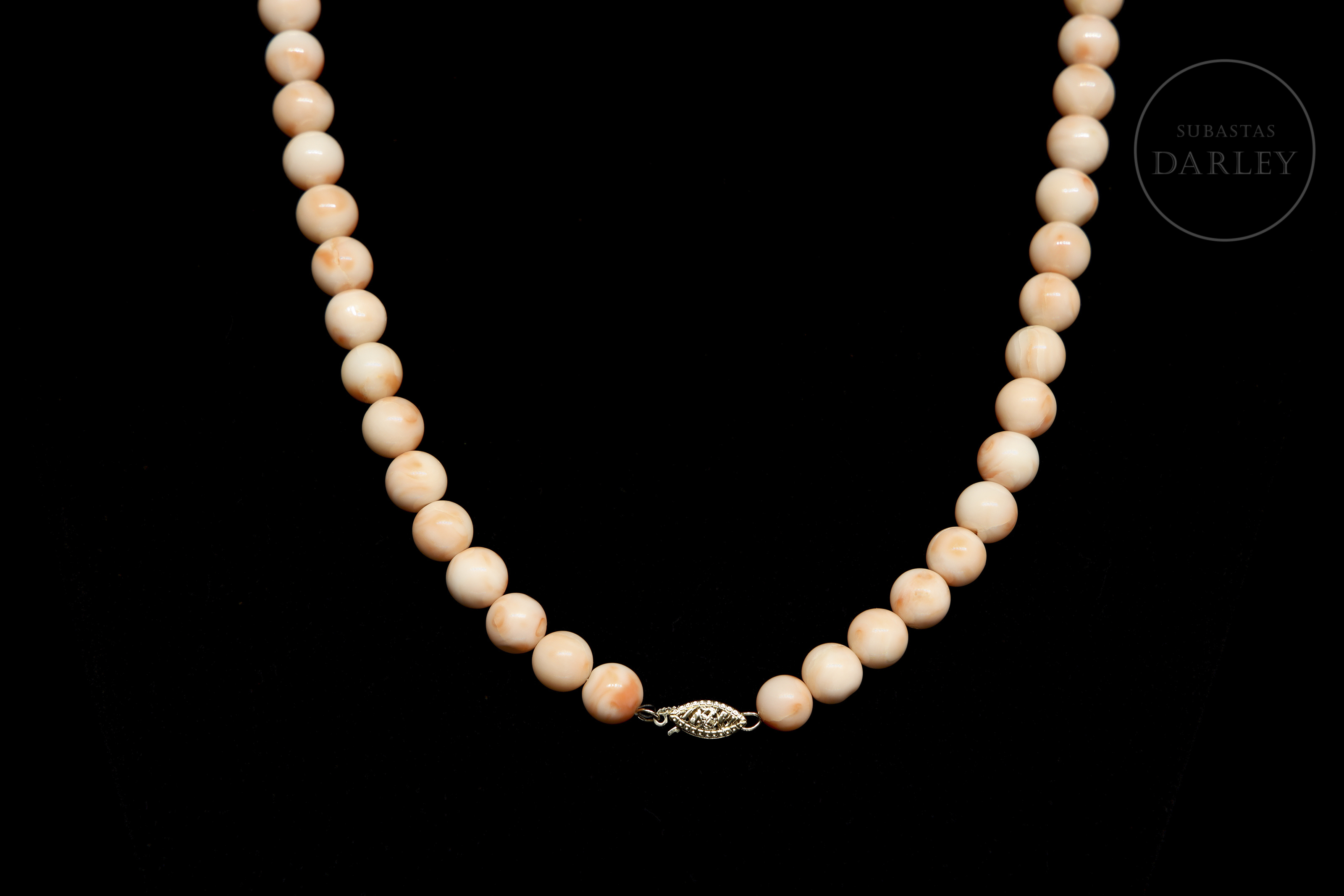 Collar de diseño clásico, compuesto por 67 cuentas de piel de ángel en tonalidades rosada. Presenta un cierre de lengüeta en oro amarillo de 14k.