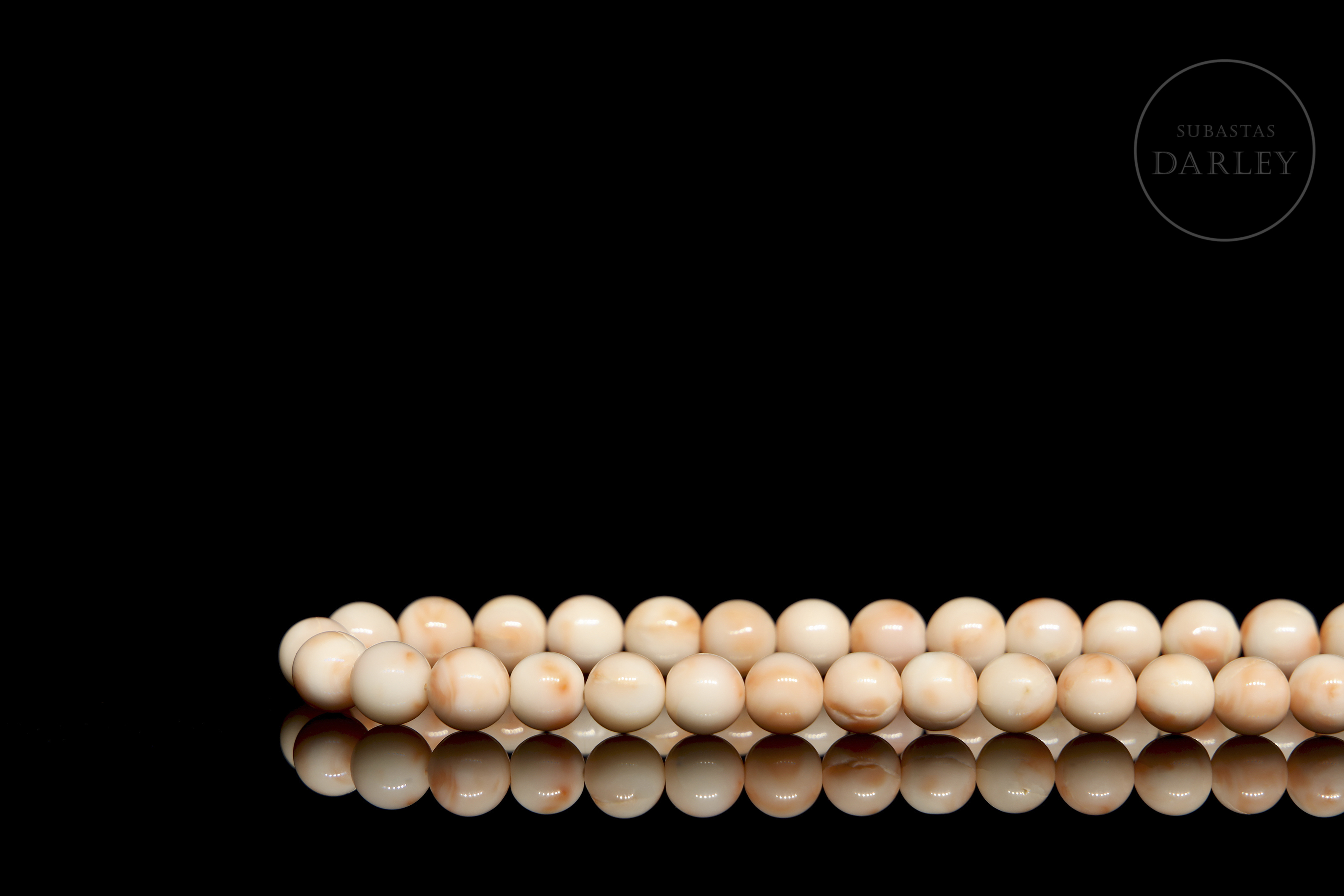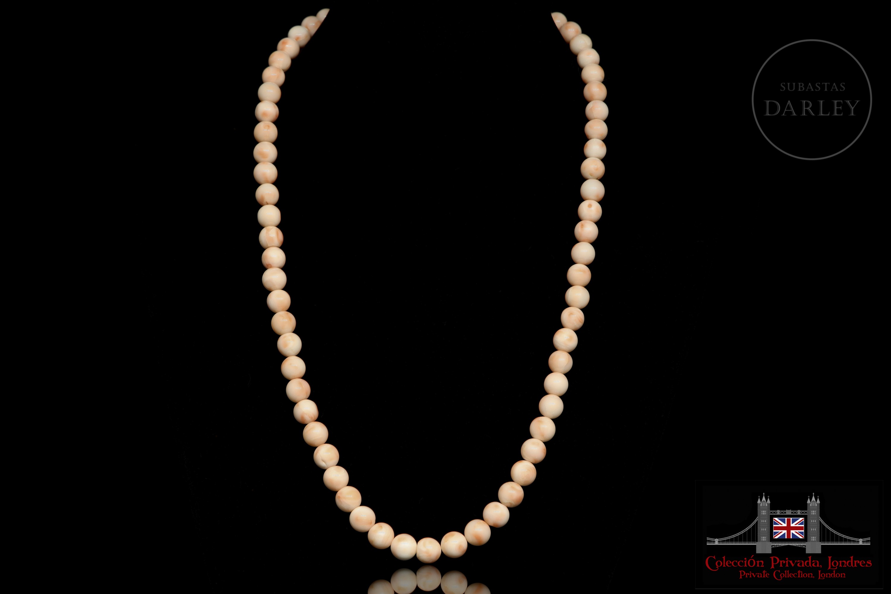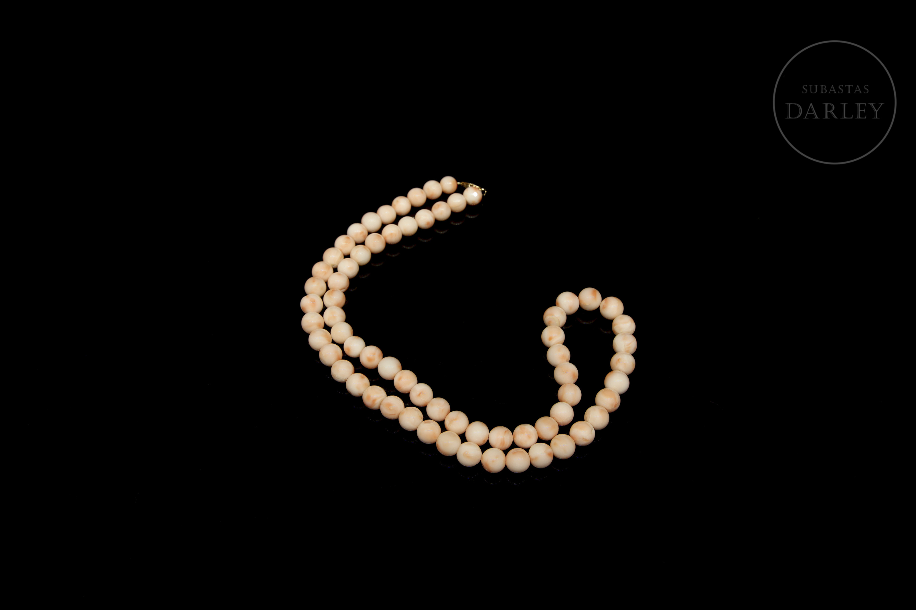 Collar de diseño clásico, compuesto por 67 cuentas de piel de ángel en tonalidades rosada. Presenta un cierre de lengüeta en oro amarillo de 14k.