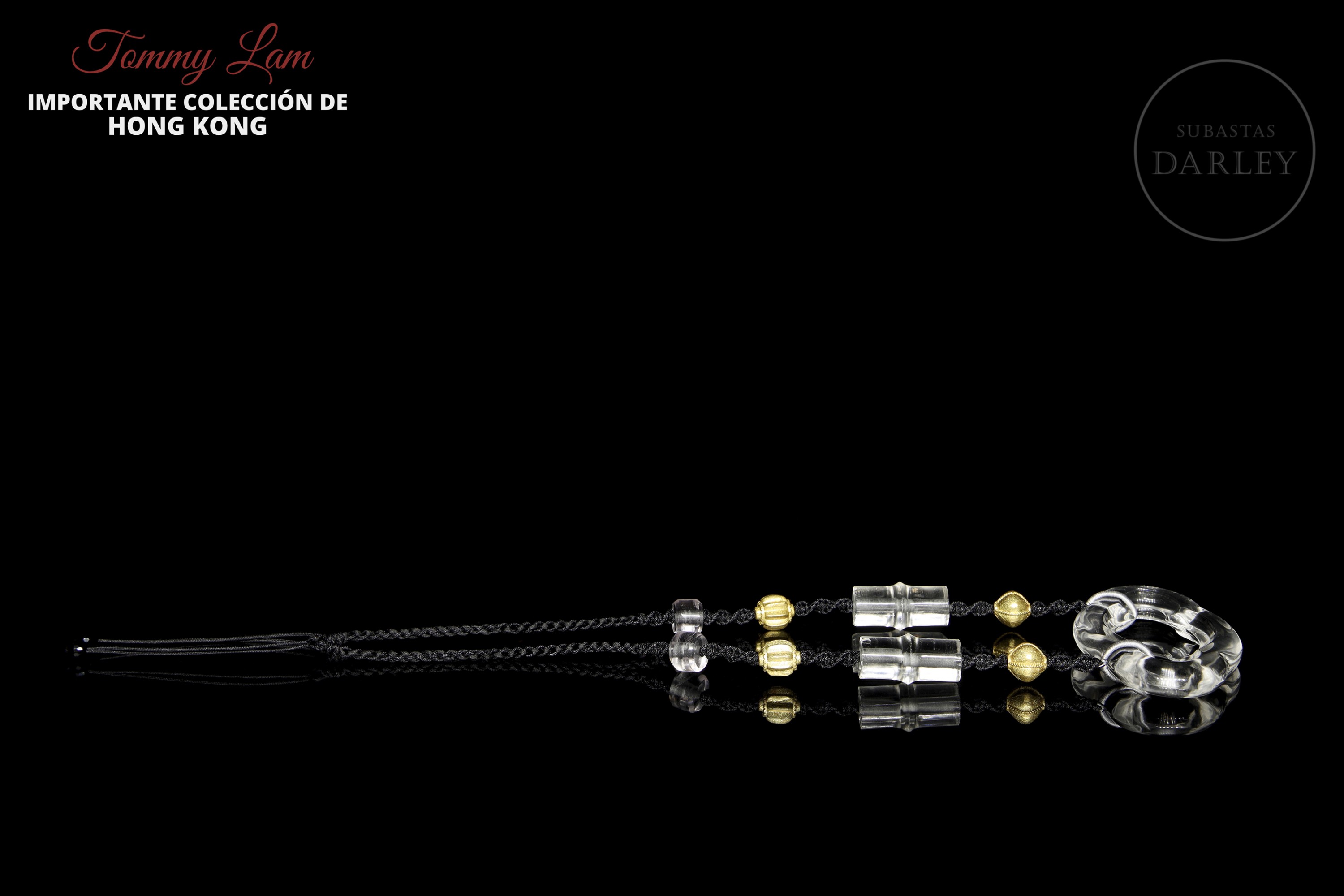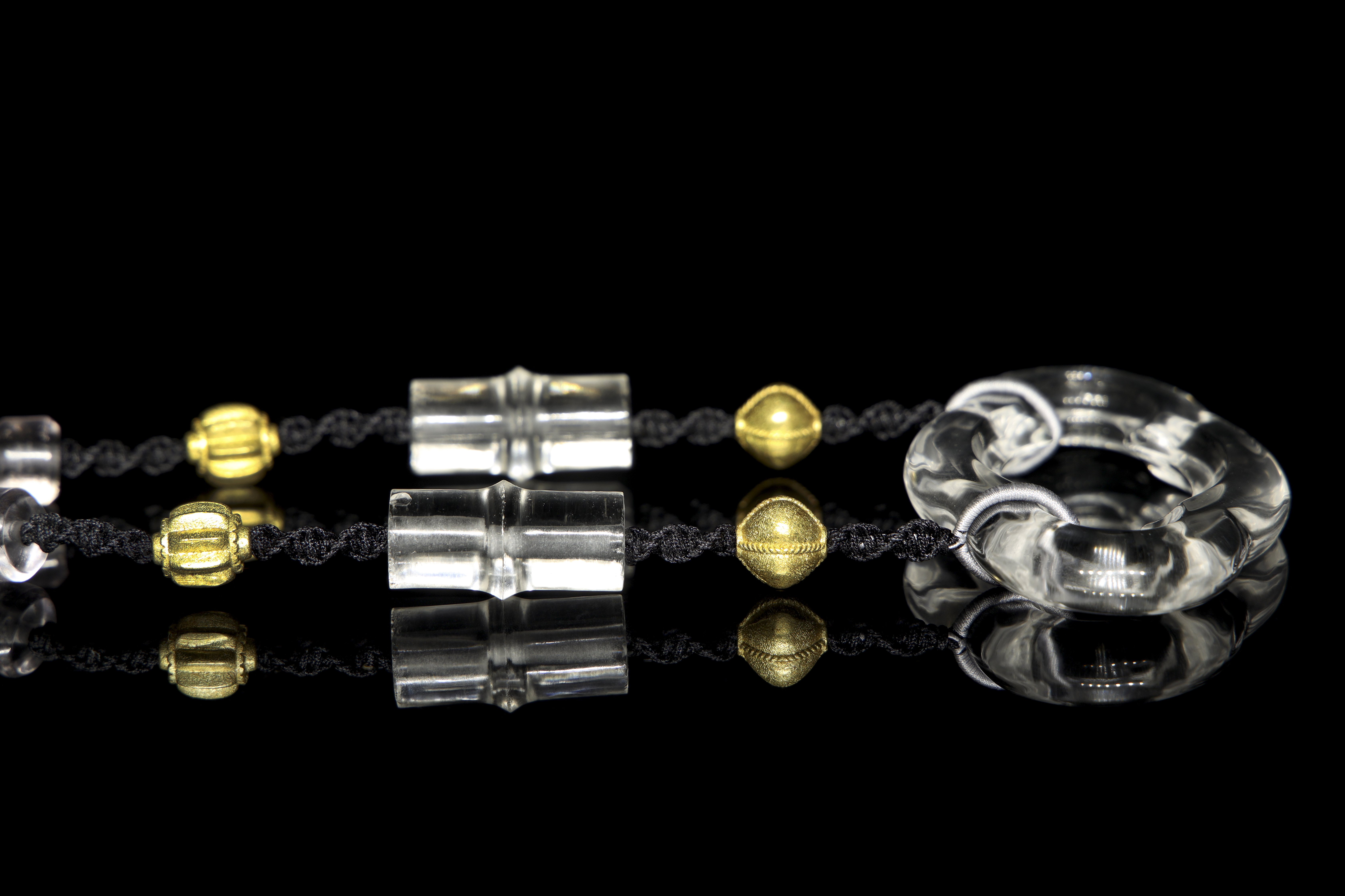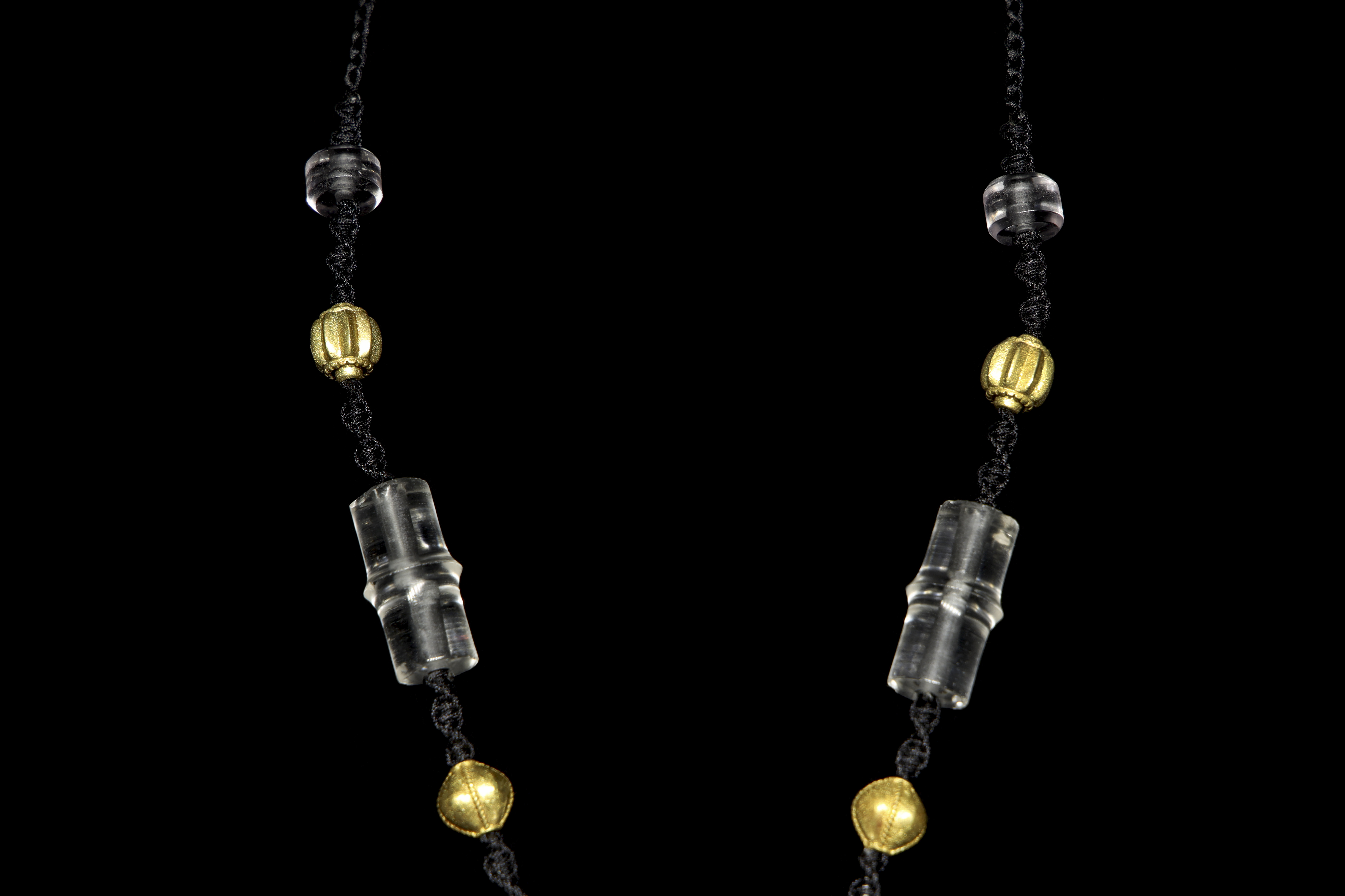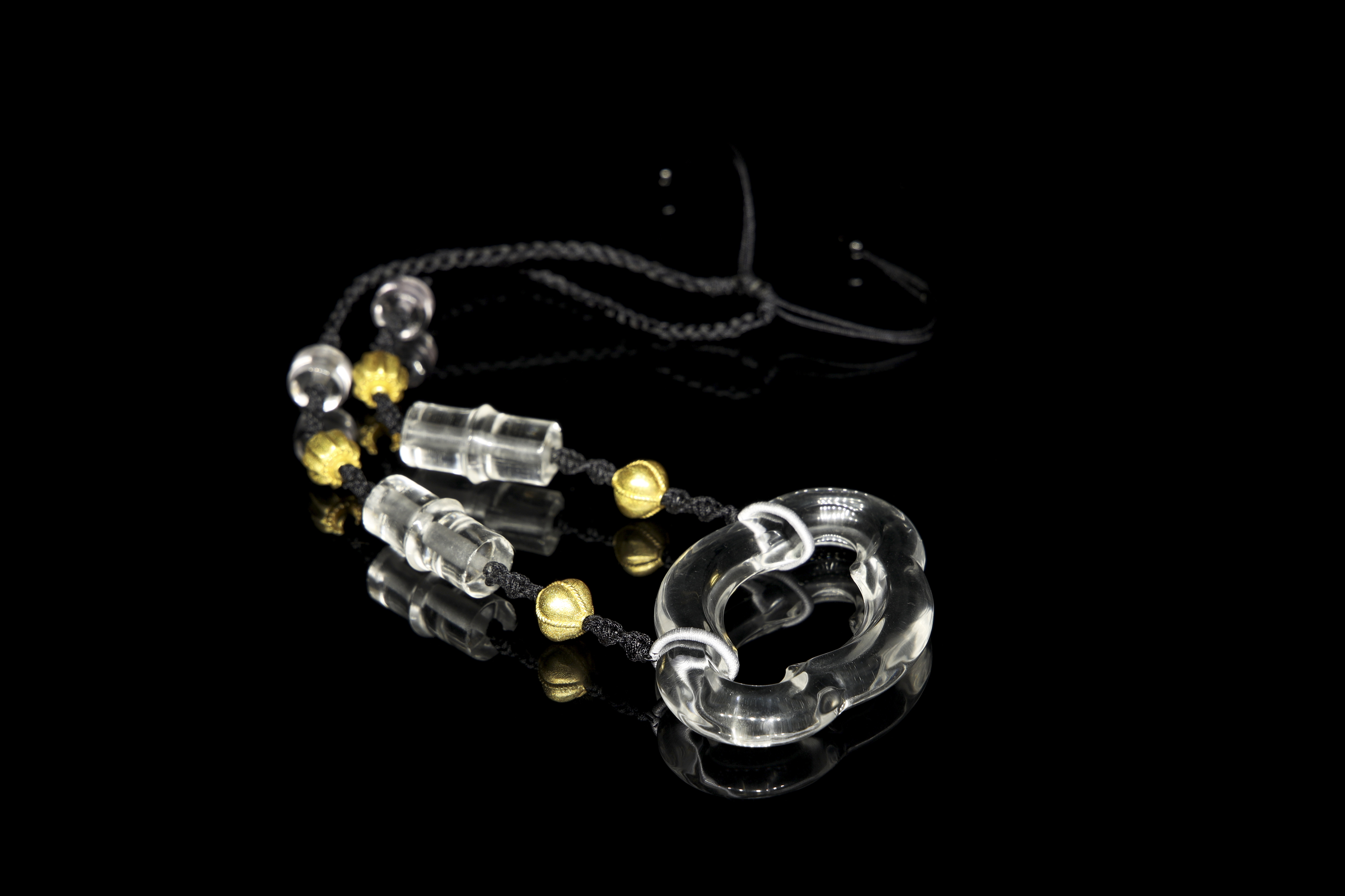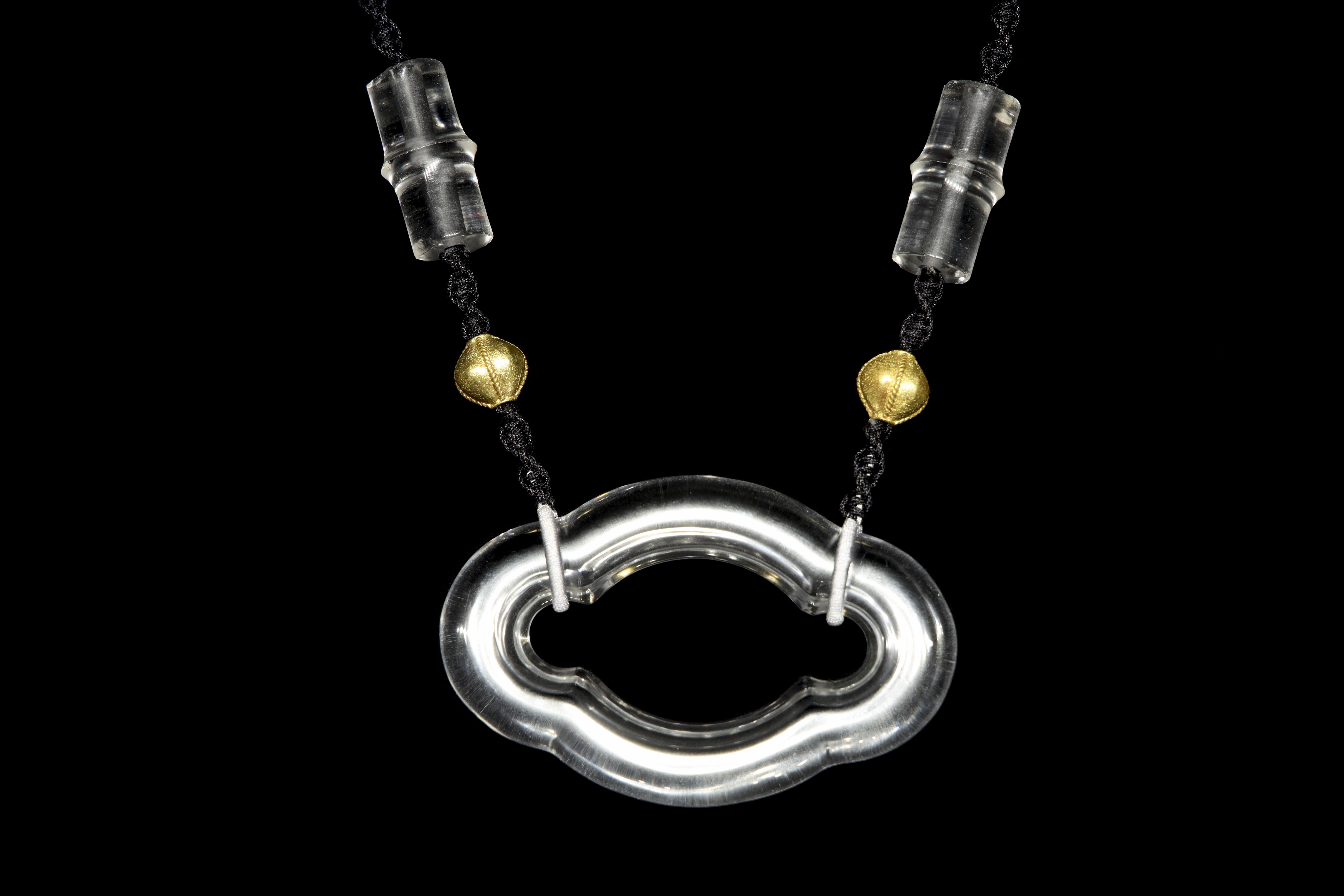 Collar montado sobre un cordón negro trenzado. Se compone de cuatro cuentas de cristal de cuarzo hialino de formas tubulares y esféricas, alternadas con esferas texturizadas de bronce dorado. Como pieza central, presenta un gran colgante del mismo material y alta transparencia, tallado en una forma lobulada que evoca una nube estilizada.