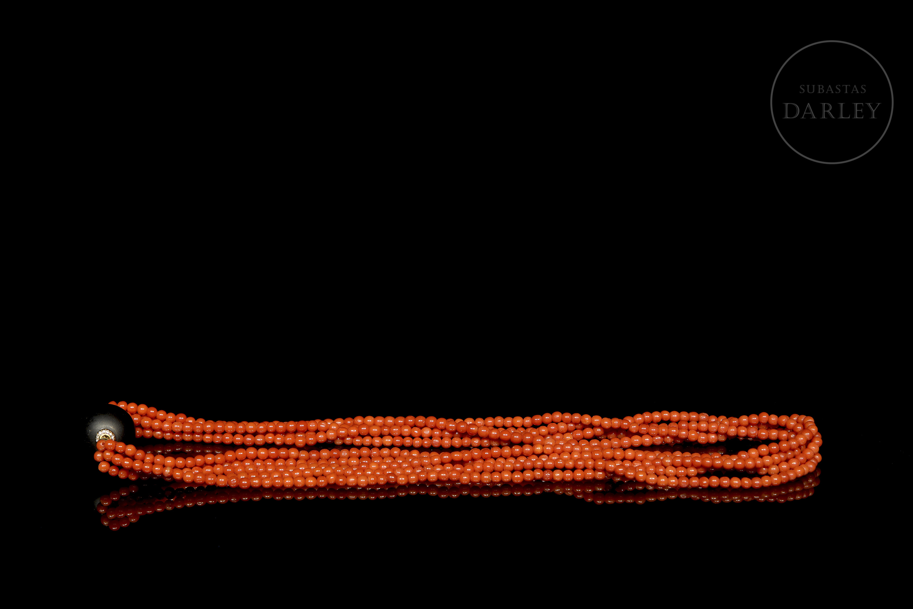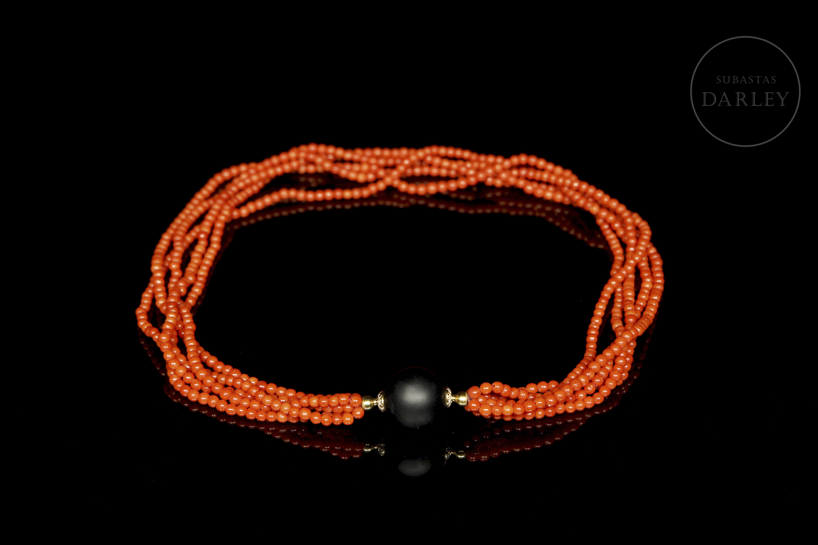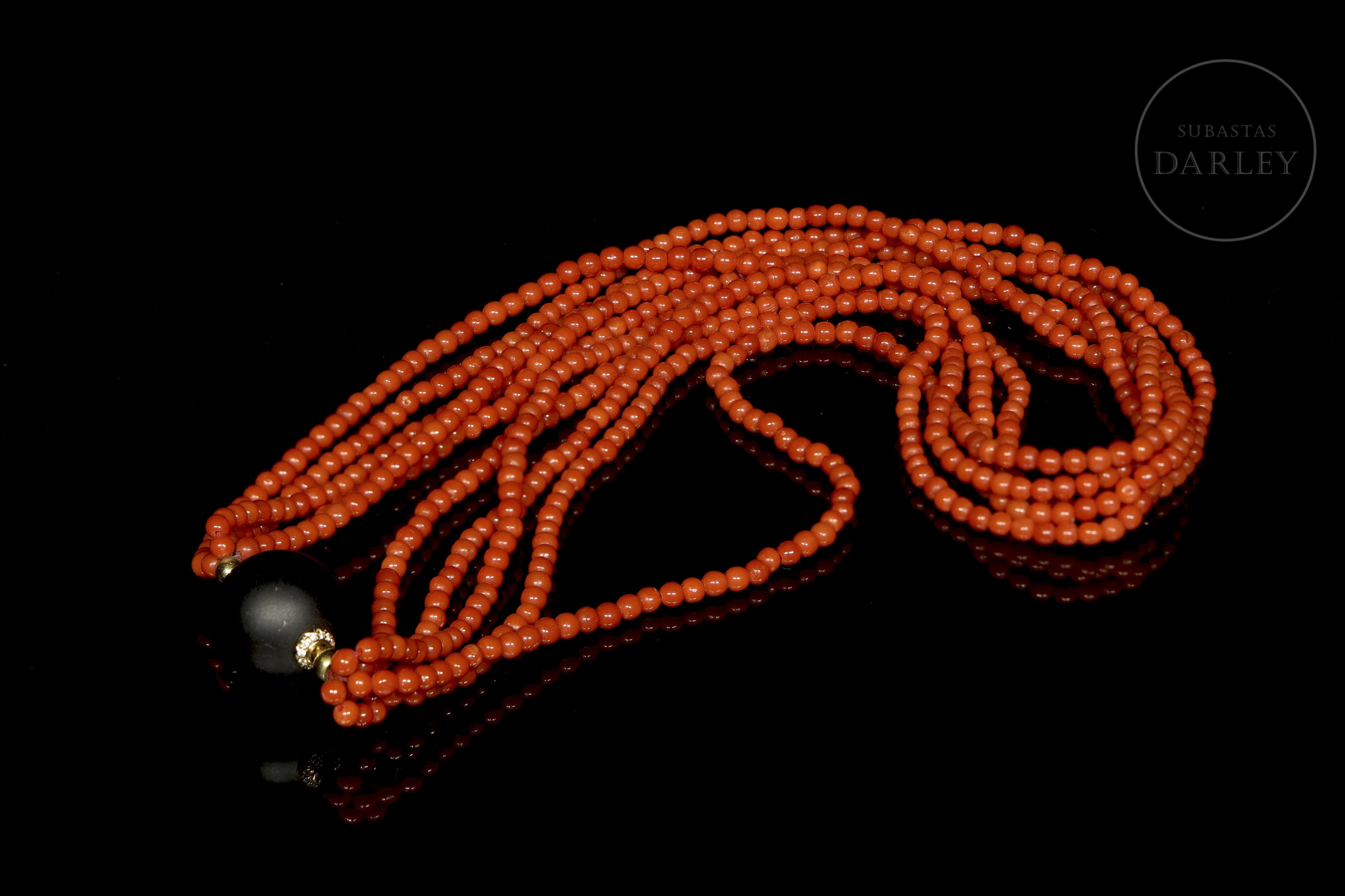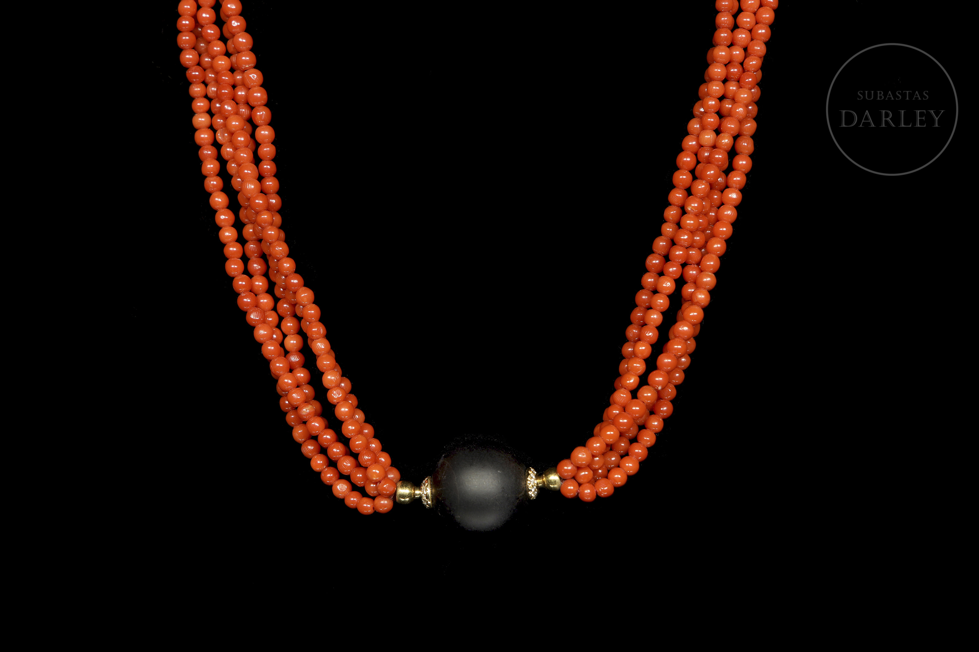 Collar de oro, cuentas de coral y brillantes. Compuesto por cinco sartales de pequeñas cuentas esféricas de coral de color rojo anaranjado intenso. El elemento central y distintivo es una gran cuenta central esférica de color negro. Los herrajes y pasadores que sujetan la cuenta central son de oro amarillo y están engastados con brillantes.