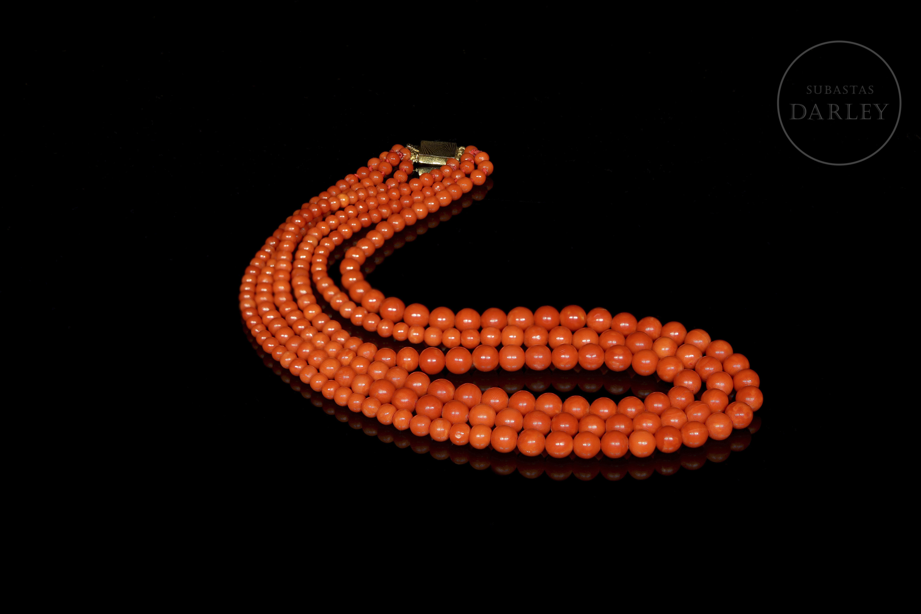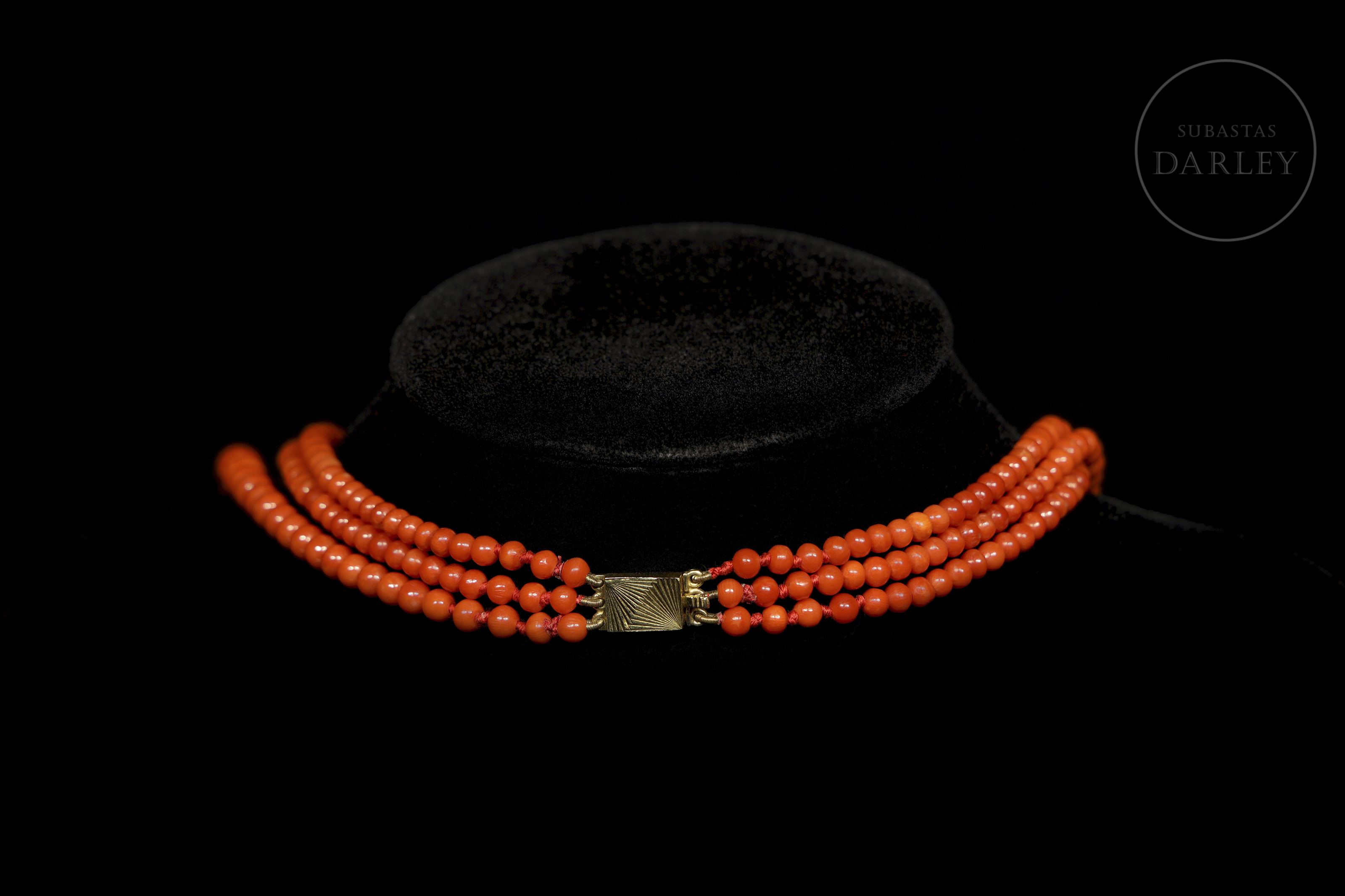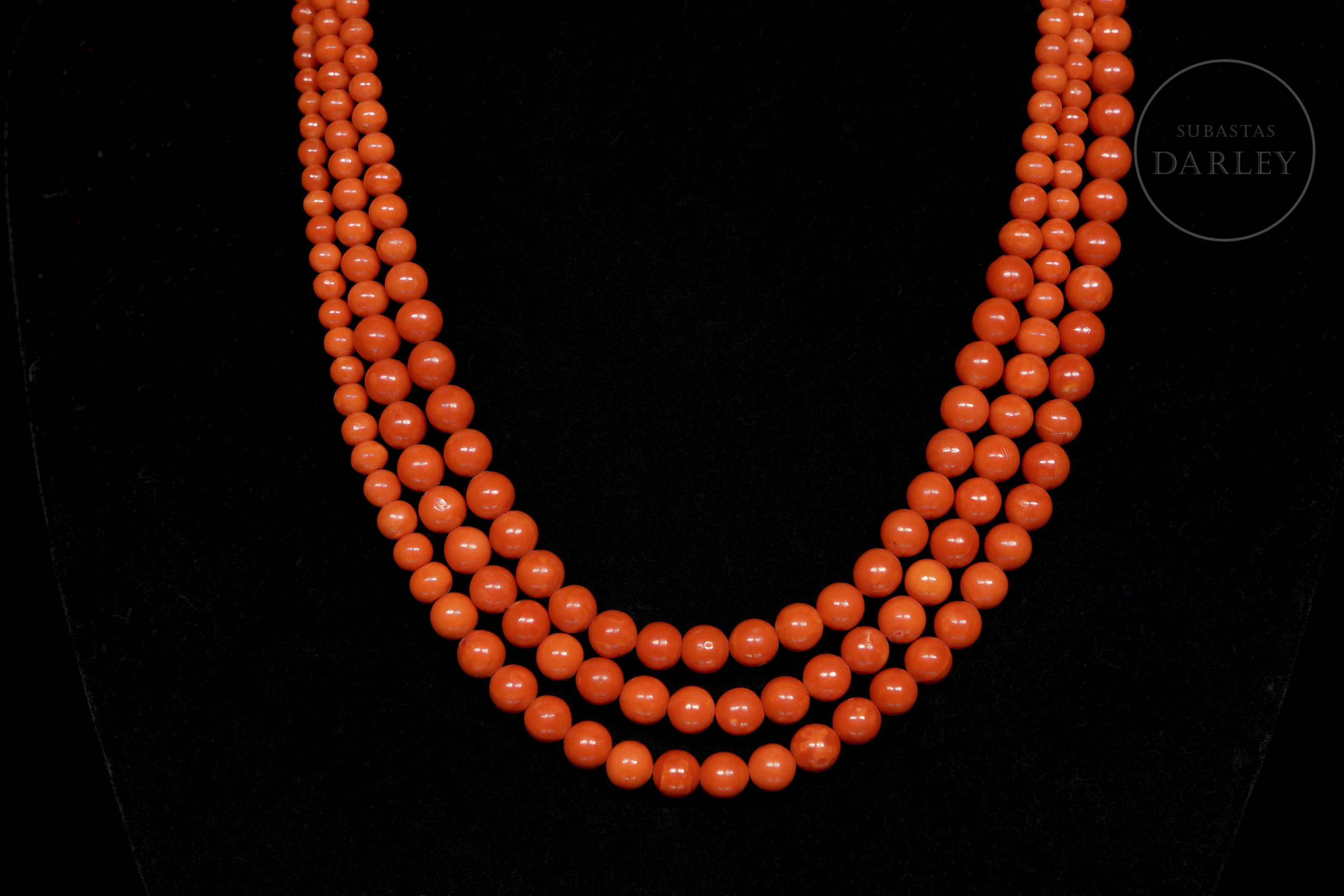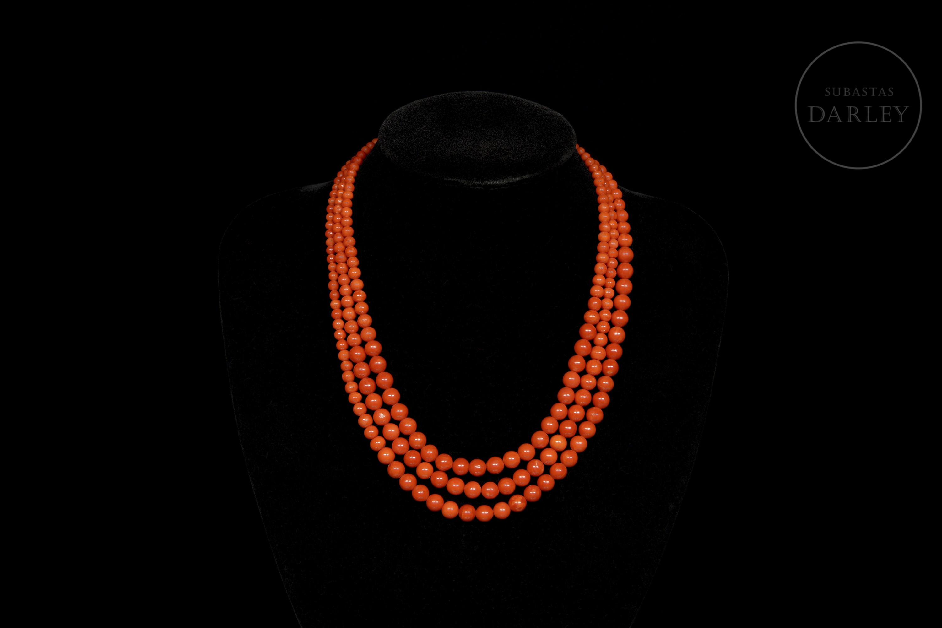 Collar de triple sartal de cuentas esféricas de coral de color rojo anaranjado intenso, que se gradúan en tamaño de menor a mayor hacia el centro. Cierre de oro amarillo de 9k tipo lengüeta invisible, con decoración geométrica en relieve.