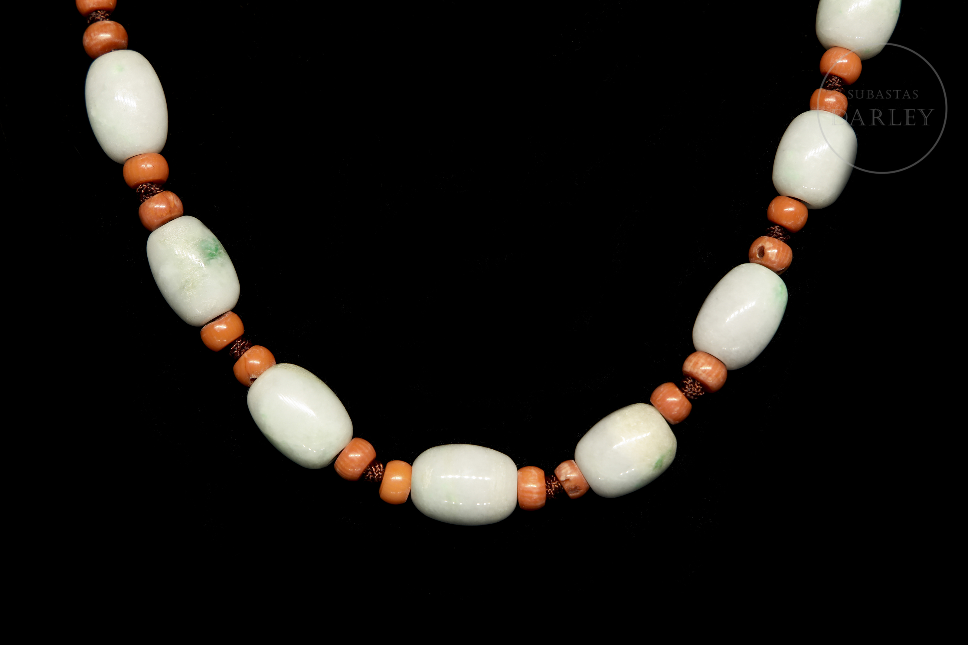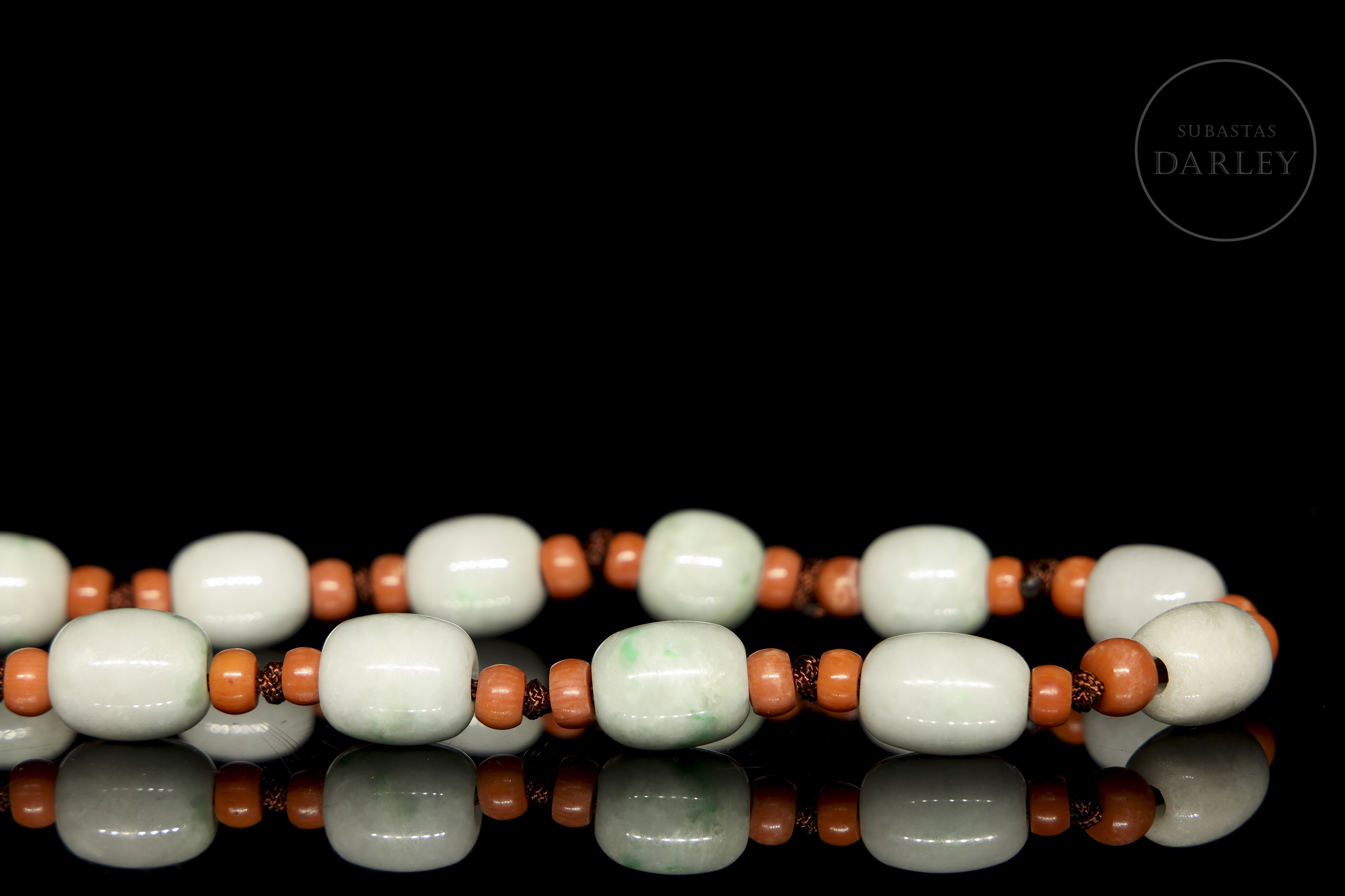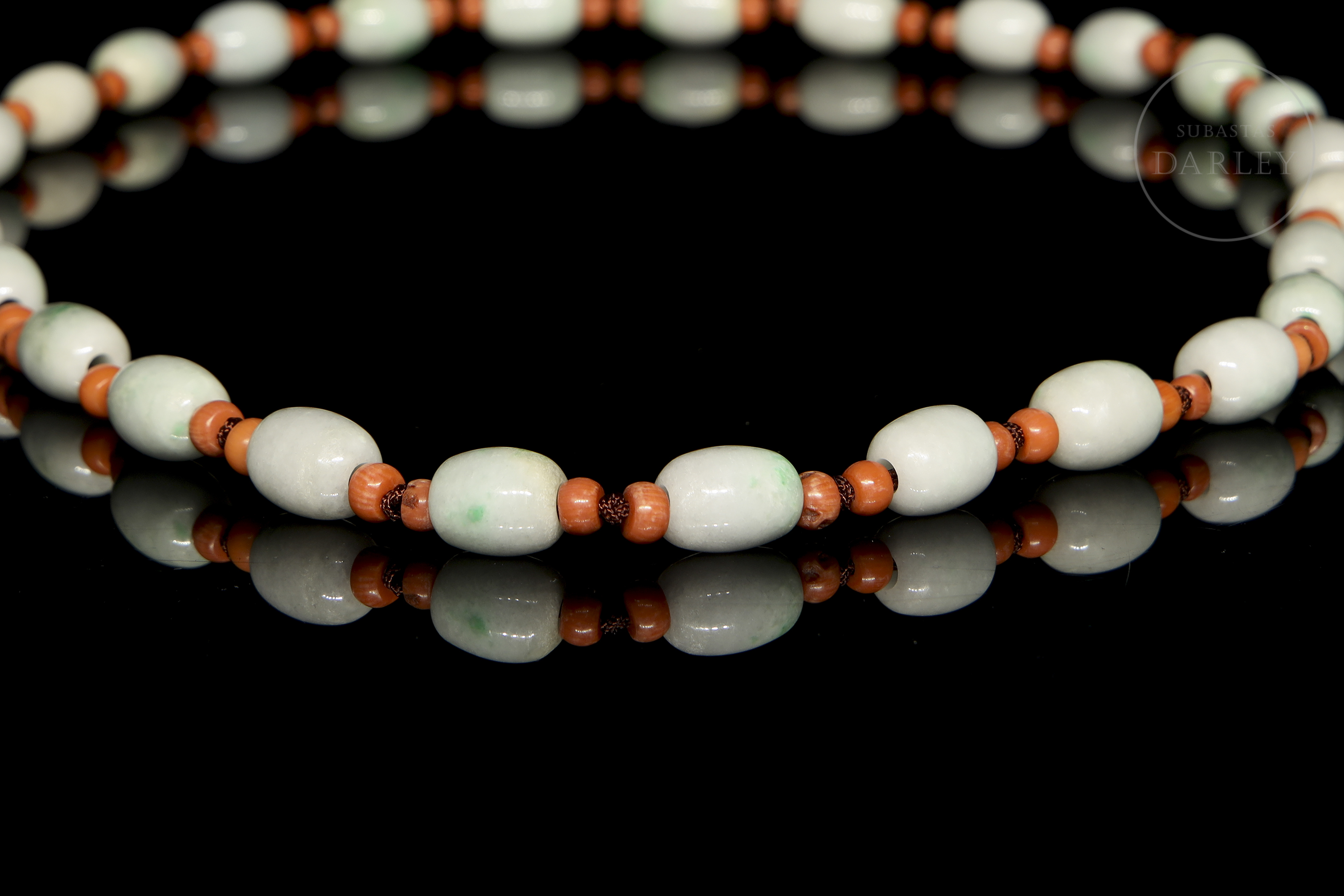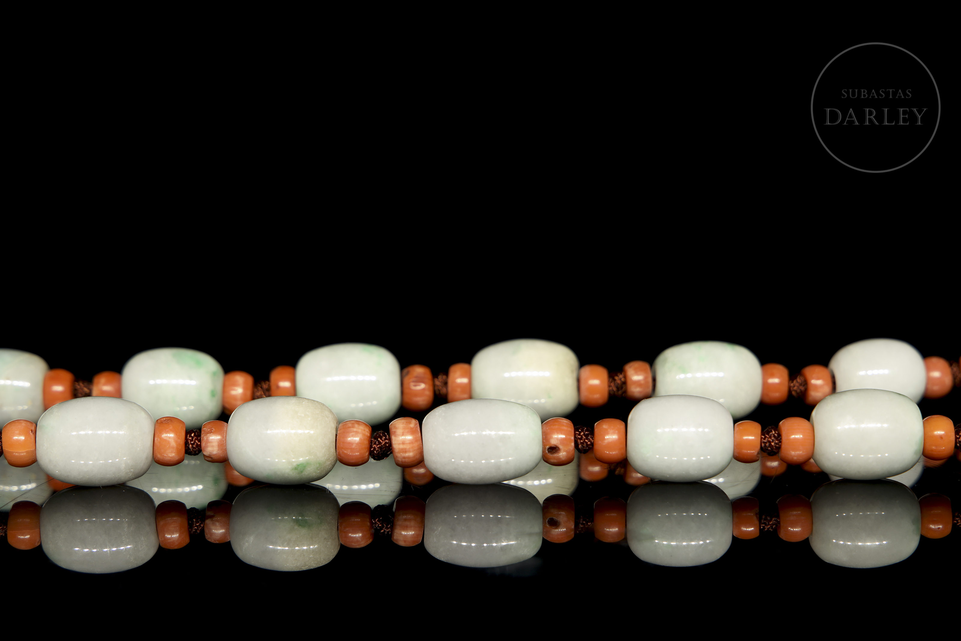 Compuesto por un total de 27 cuentas de jadeíta tallada en forma ovalada, de color lechoso con sutiles manchas verdes, que se alternan con 54 pequeñas cuentas de piedra tallada de tonalidad coral, dispuestas por parejas. Todo ello atravesado por un cordón anudado añadido posteriormente.